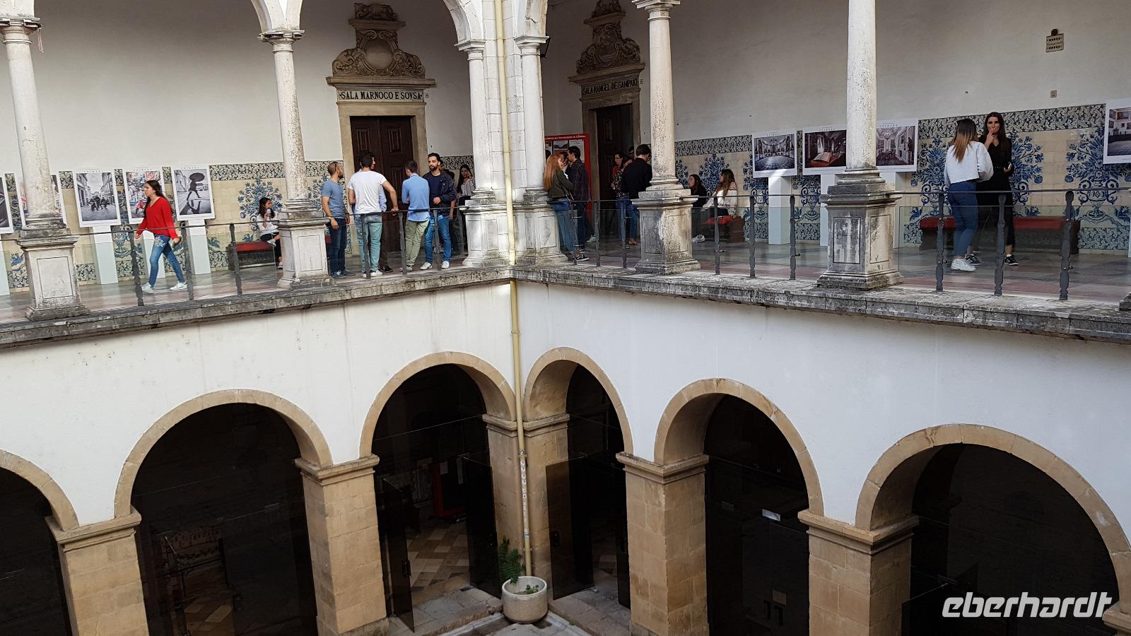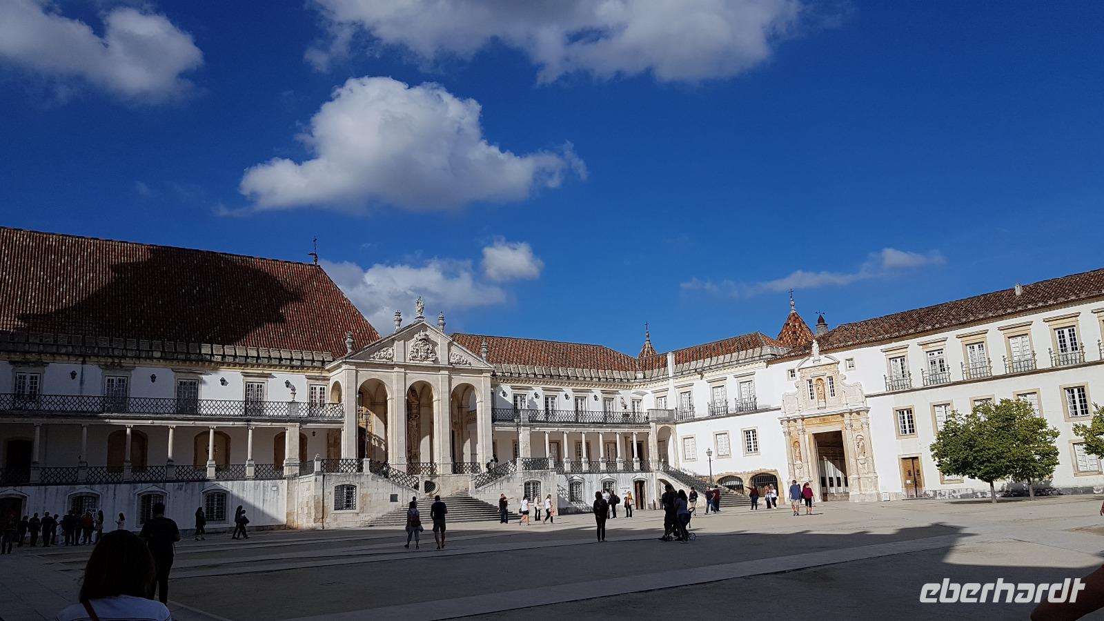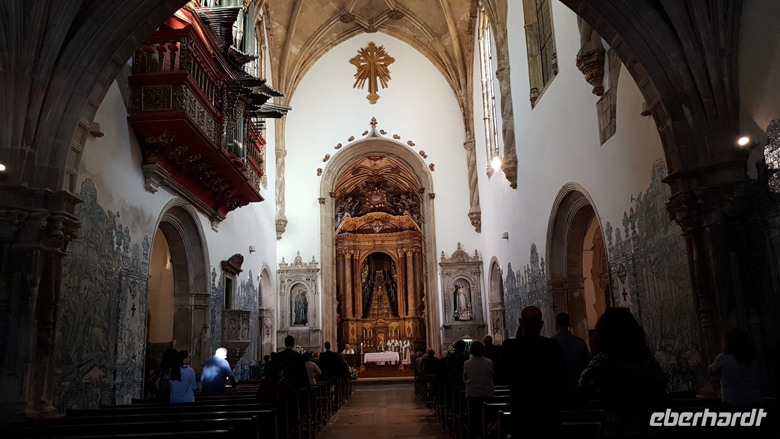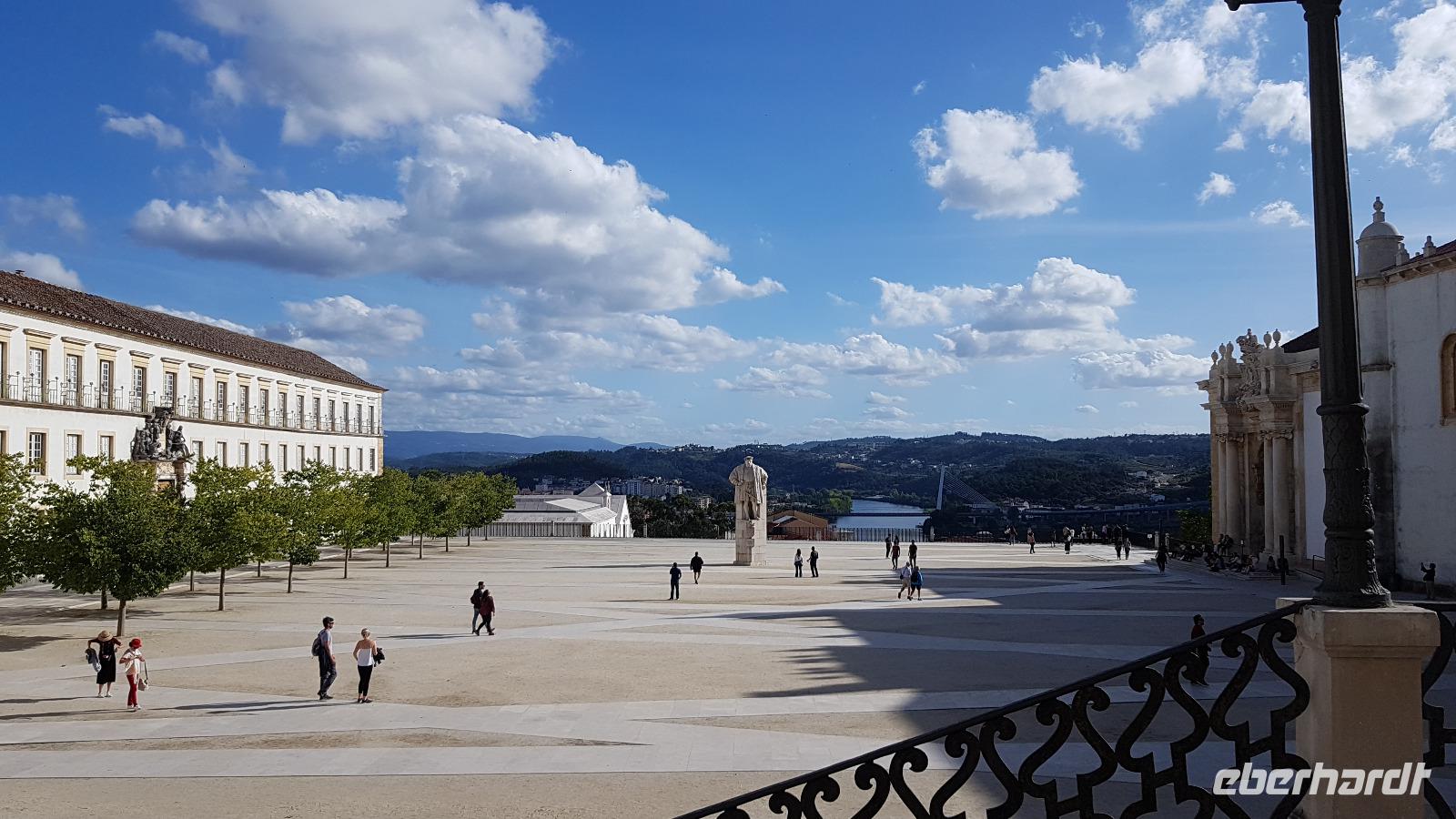 Natürlich wollen wir die berühmte Bibliothek der Universität besuchen, doch vorher ist Zeit für einen späten Mittagsimbiss. Wir staunen über riesige Baisser in den Auslagen, entscheiden uns dann aber doch lieber für eine kleine Mittagsmahlzeit. Punkt 16 Uhr sind wir dann überpünktlich auf dem Universitätsgelände und an der Bibliothek. Maria erzählt uns, warum der Turm hier die "Ziege" genannt wird: er regelte das Leben der Studenten. Sie wohnten außerhalb der Universitätsgebäude und der Turm kündete den Lernbeginn an und nach dem Läuten abends hatten Studenten nichts mehr auf den Straßen zu suchen...Unser Ziel ist aber die berühmte Bibliothek. Mehr als 50.000 Bände lagern hier in Räumen, ausgekleidet mit von Gold überzogenem Ebenholz, vergoldeten Wappen und Kronen über jedem Portal. Wir sind beeindruckt und folgen Maria auf einem Rundgang durch die Hallen und Gänge, die der König D. João III. der Universität überlassen hatte. Den Prunksaal können wir leider nicht besichtigen, hier findet gerade die Verteidigung einer Doktorarbeit statt. Fotos vom Universitätsplatz folgen und dann spazieren wir zur Kathedrale. Sie stammt tatsächlich aus der Gründungszeit Portugals und wir staunen, dass diese Größe und Höhe im romanischen Baustil möglich waren. Dann spazieren wir weiter durch die Gassen und "Studentenrepubliken", bewundern eine "portugiesische Gitarre" am Stadttor und erreichen schließlich die Kirche de Santa Cruz. Hier befinden sich im Inneren wunderschöne Azulejos, da aber gerade eine Messe gelesen wird bleiben wir nur kurz und stören nicht weiter. Mit unserem Bus geht es dann ins Hotel "Dona Ines" und hier verabschieden wir uns mit einem Applaus von Alvaro, unserem Busfahrer. Am Abend wartet ein gutes Buffett auf uns und mit einem Gläschen Wein klingt der Abend aus.