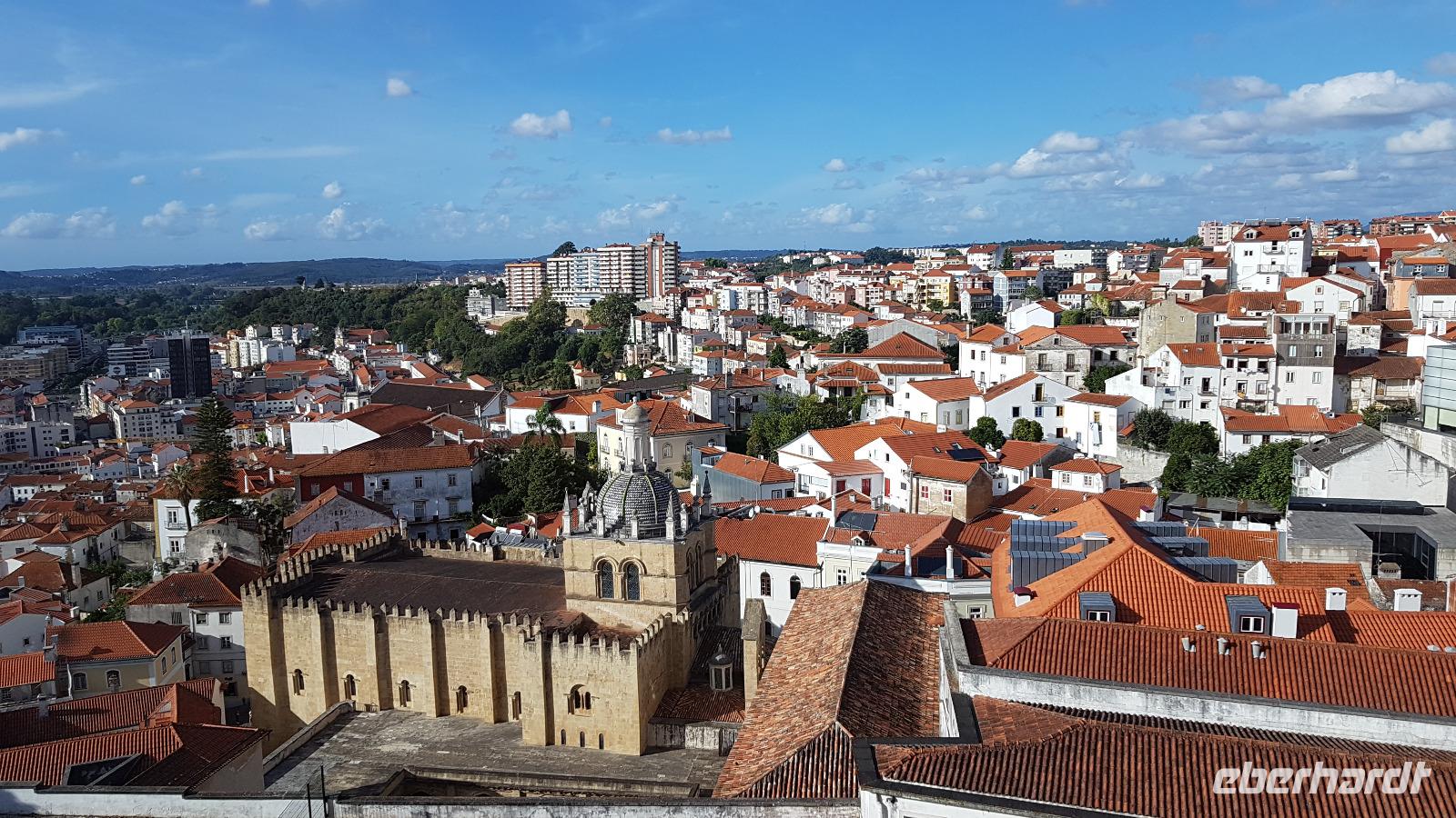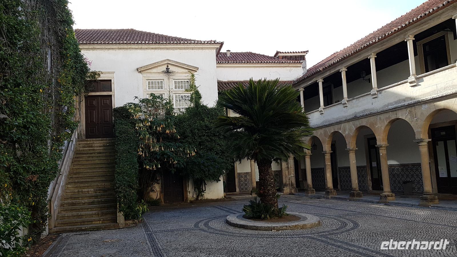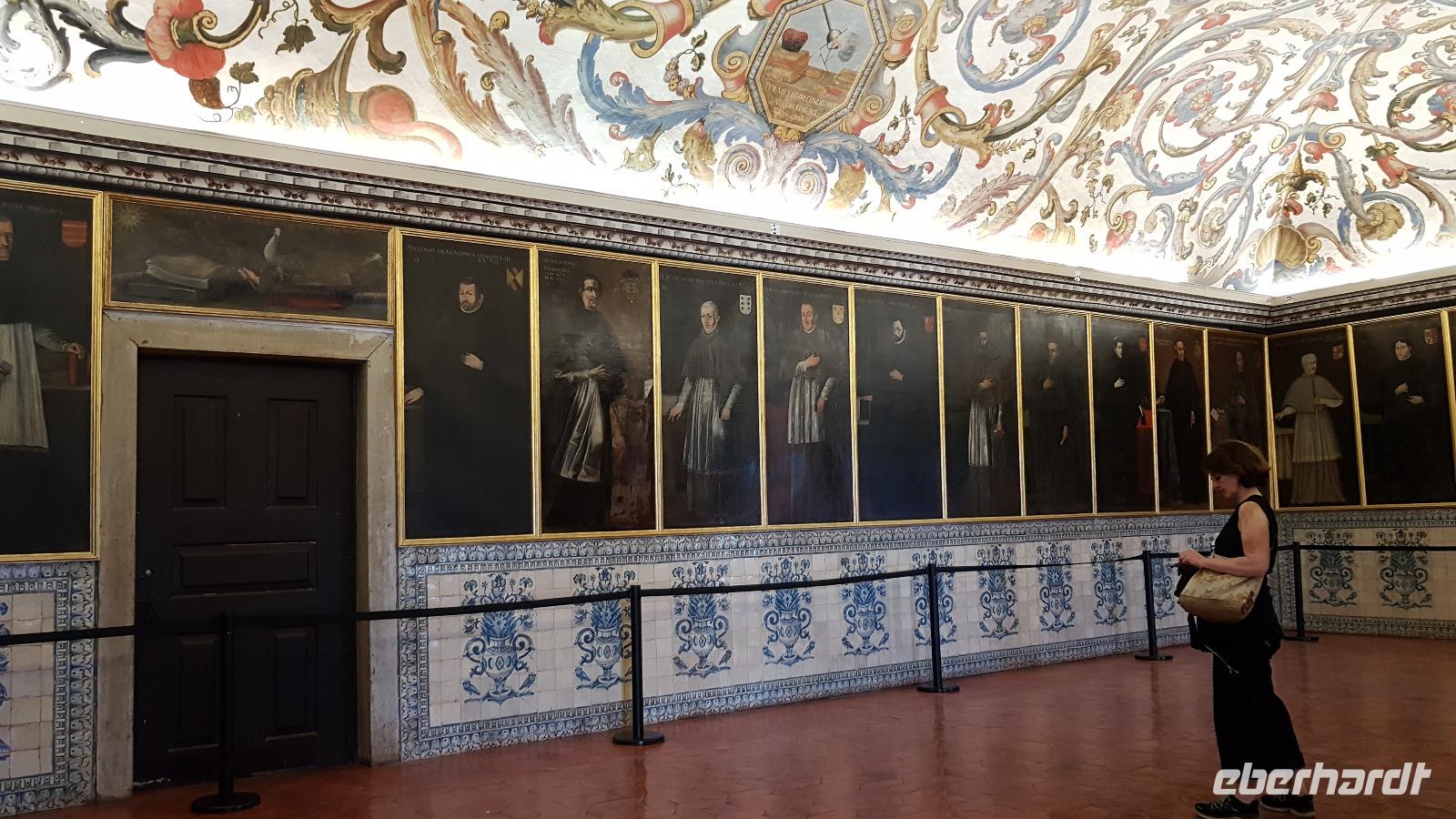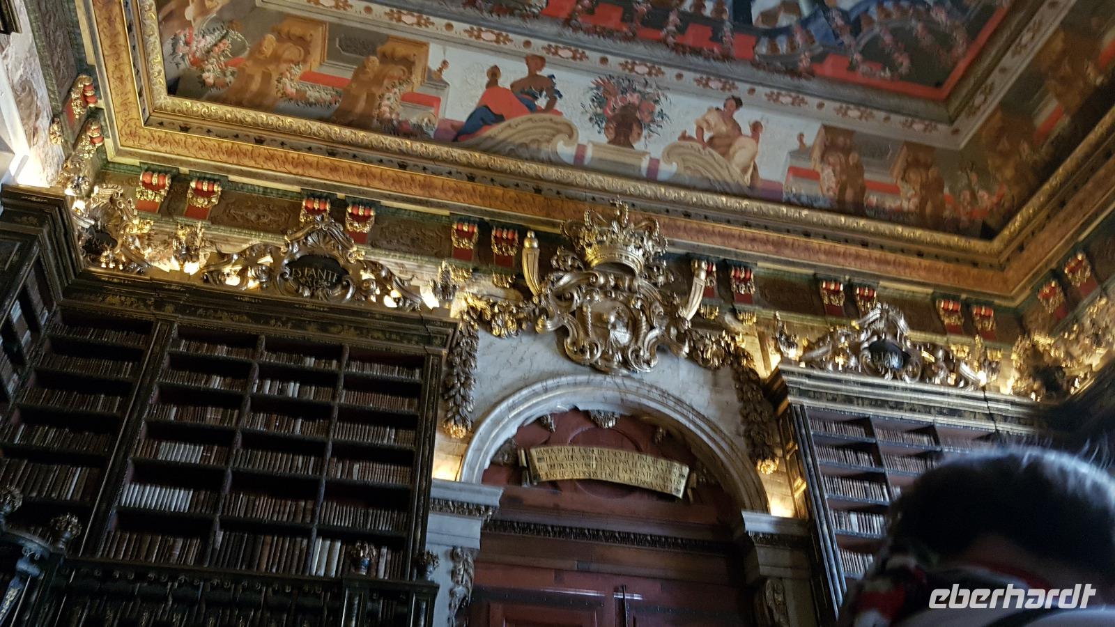 Natürlich wollen wir die berühmte Bibliothek der Universität besuchen, doch vorher ist Zeit für einen späten Mittagsimbiss. Wir staunen über riesige Baisser in den Auslagen, entscheiden uns dann aber doch lieber für eine kleine Mittagsmahlzeit. Punkt 16 Uhr sind wir dann überpünktlich auf dem Universitätsgelände und an der Bibliothek. Maria erzählt uns, warum der Turm hier die "Ziege" genannt wird: er regelte das Leben der Studenten. Sie wohnten außerhalb der Universitätsgebäude und der Turm kündete den Lernbeginn an und nach dem Läuten abends hatten Studenten nichts mehr auf den Straßen zu suchen...Unser Ziel ist aber die berühmte Bibliothek. Mehr als 50.000 Bände lagern hier in Räumen, ausgekleidet mit von Gold überzogenem Ebenholz, vergoldeten Wappen und Kronen über jedem Portal. Wir sind beeindruckt und folgen Maria auf einem Rundgang durch die Hallen und Gänge, die der König D. João III. der Universität überlassen hatte. Den Prunksaal können wir leider nicht besichtigen, hier findet gerade die Verteidigung einer Doktorarbeit statt. Fotos vom Universitätsplatz folgen und dann spazieren wir zur Kathedrale. Sie stammt tatsächlich aus der Gründungszeit Portugals und wir staunen, dass diese Größe und Höhe im romanischen Baustil möglich waren. Dann spazieren wir weiter durch die Gassen und "Studentenrepubliken", bewundern eine "portugiesische Gitarre" am Stadttor und erreichen schließlich die Kirche de Santa Cruz. Hier befinden sich im Inneren wunderschöne Azulejos, da aber gerade eine Messe gelesen wird bleiben wir nur kurz und stören nicht weiter. Mit unserem Bus geht es dann ins Hotel "Dona Ines" und hier verabschieden wir uns mit einem Applaus von Alvaro, unserem Busfahrer. Am Abend wartet ein gutes Buffett auf uns und mit einem Gläschen Wein klingt der Abend aus.