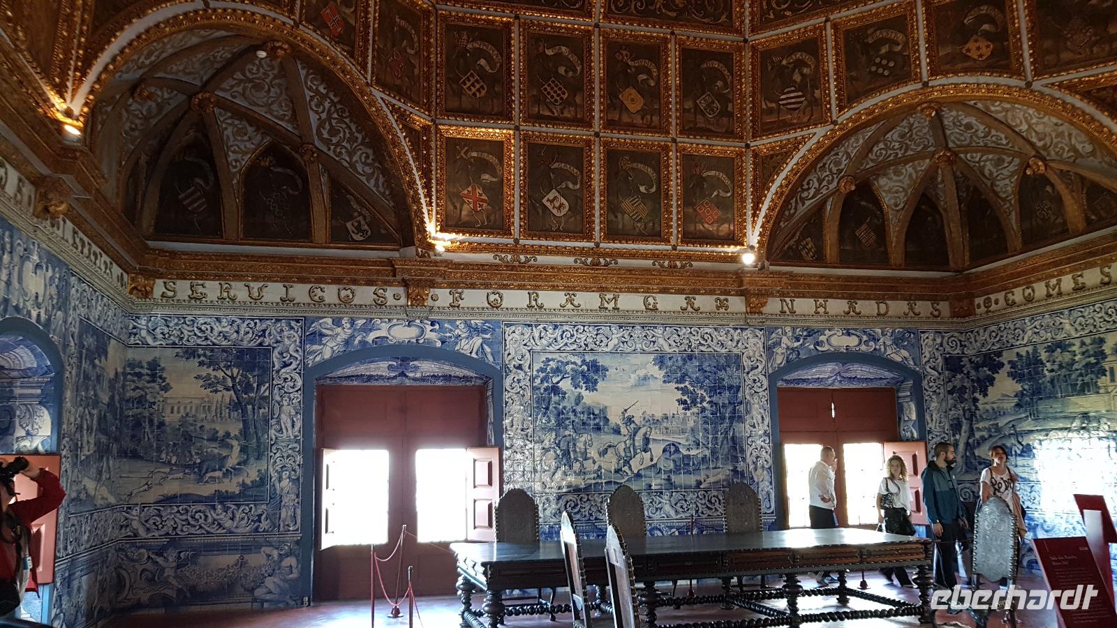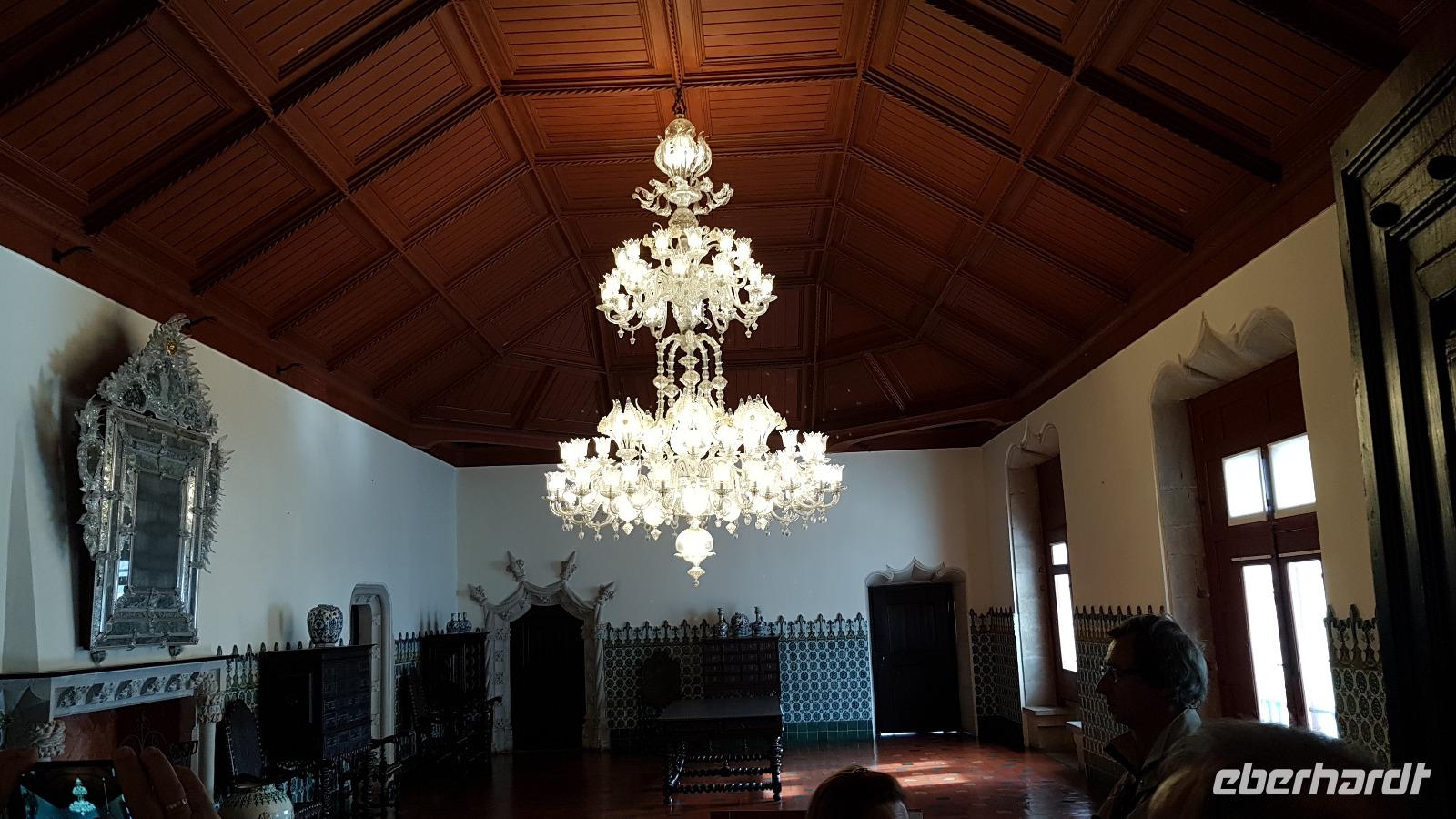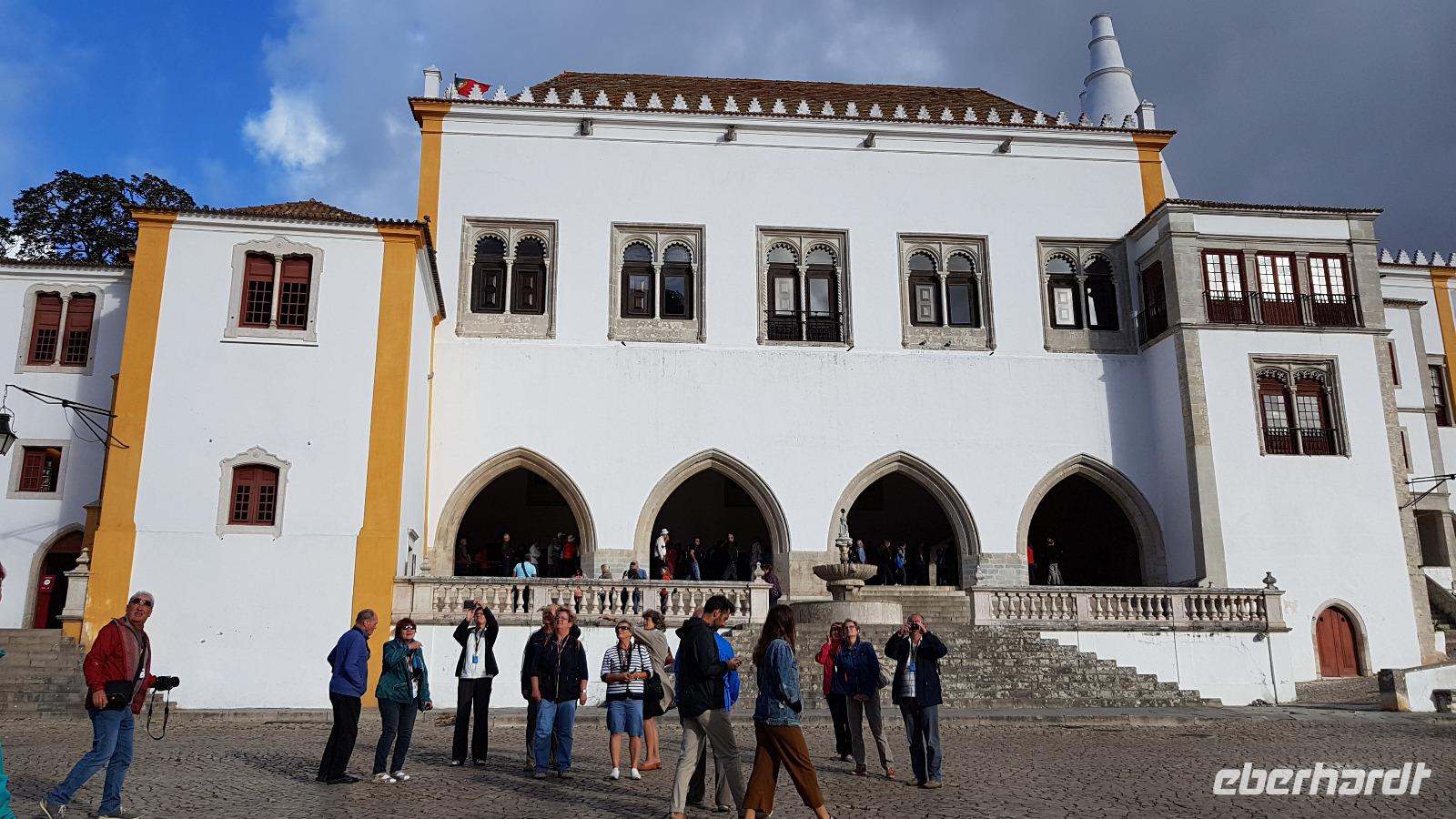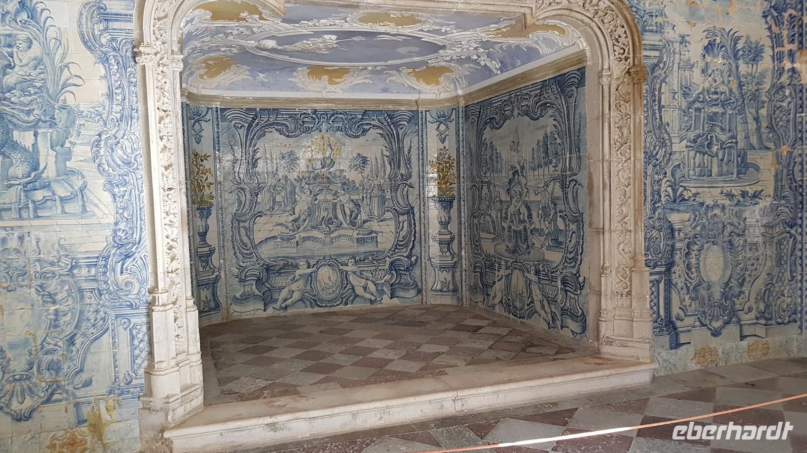 Nach einem ausgiebigen Sonntagsfrühstück starten wir heute Richtung Nordwesten. Sintra ist unser Ziel, die Sommerresidenz der Könige. Bis zum 11. Jahrhundert waren die Mauren hier- ihre Festung thront heute noch hoch über der Stadt. König Alfonso Henriques eroberte Sintra 1147, verlieh dem Ort Stadtrechte und mit den Klöstern des 12. und 13. Jahrhunderts wuchs auch die Stadt und wurde von den portugiesischen Königen wegen des kühleren Klimas hier geliebt und geschätzt. Der Adel zog mit und errichtete hier wundervolle Anwesen und Herrenhäuser, doch die konnten wir später bewundern. Zunächst wollten wir den Nationalpalast besichtigen. König João I. ließ ihn nach den Zerstörungen durch das Erdbeben 1755 wiederaufbauen und unter Manuel I. erhielt der Palast einen weiteren Flügel und sein heutiges Gesicht. Uns bot sich heute Morgen ein phantastisches Bild: dunkle Gewitterwolken hingen über dem Palast und hoben seine weißen Mauern noch mehr hervor. Maria besorgte unsere Tickets und dann konnten wir unsere Entdeckungsreise starten. Und es gab tatsächlich so viel zu entdecken, Möbel aus der Handelszeit mit Indien, eine Pagode aus Elfenbein, manuelinische Gestaltungselemente, den Elster- und den Schwanensaal, und überall die wunderschönen Azulejos. Maria erzählte uns die Geschichten zu den Elstern, dem Prunksaal und erläuterte uns die verschiedenen Azulejos, aus maurischer Zeit und danach. Auch die Küche war von unten bis oben mit weißen Azulejos verkleidet, hier erheben sich die riesigen, 33 Meter hohen Schlote, so konnte an allen Feuerstellen gleichzeitig gekocht und gebrutzelt werden und es blieb doch relativ kühl. Beeindruckend auch die Innenhöfe, der Badegarten...Mit vielen Fotos und Eindrücken ging es weiter in das Stadtzentrum von Sintra. Hier konnten wir uns nach Herzenslust umsehen, dem bunten Treiben zusehen und einen Kaffee genießen. Am Bus trafen wir uns wieder und hinunter ging die Fahrt durch den Nationalpark von Sintra. Hier gab es vor kurzem schwere Waldbrände, die zum Glück relativ rasch unter Kontrolle waren. Trotzdem sind große Waldbestände schwer gezeichnet, Asche überall und verkohlte Stämme der Bäume, die noch stehen. Da wird die Dimension des vorbeugenden Brandschutzes besonders deutlich. Schließlich kommen wir zum
