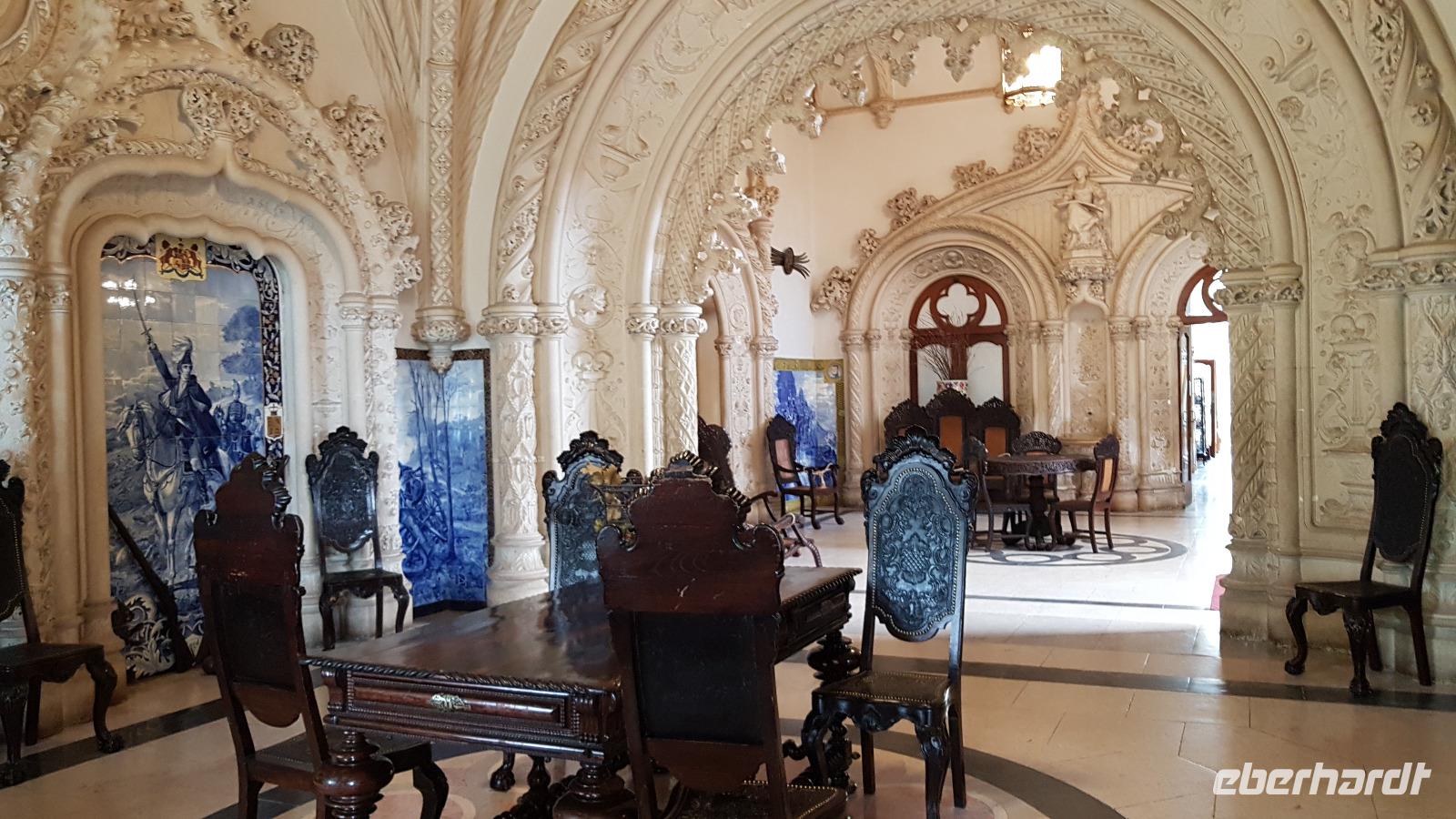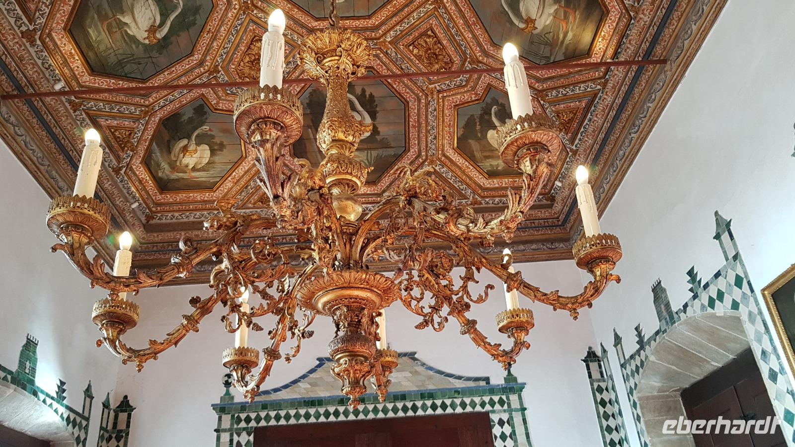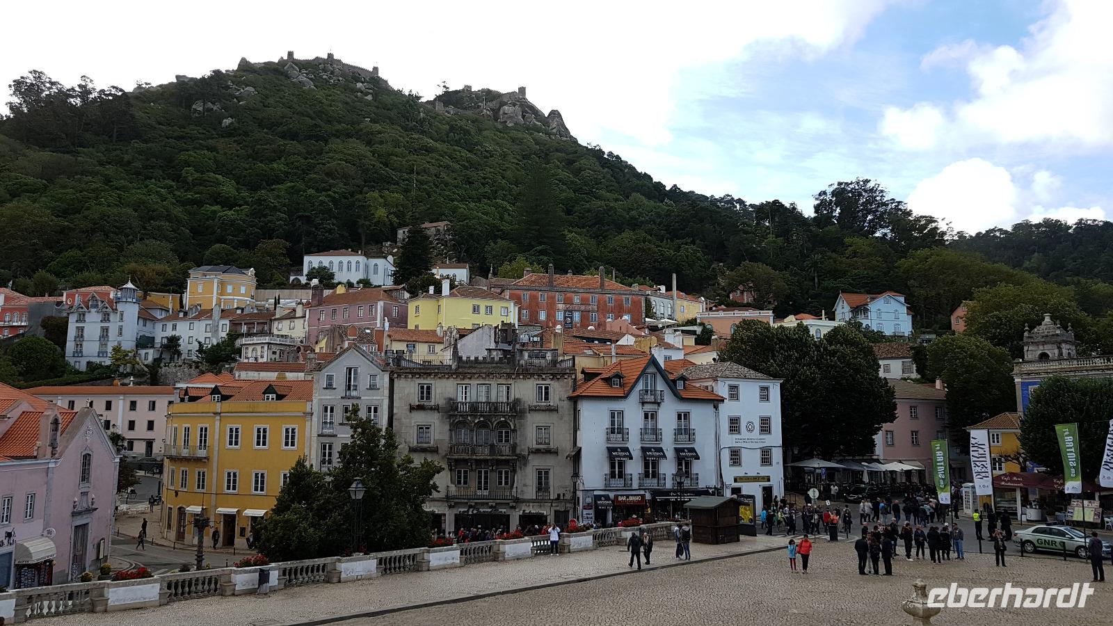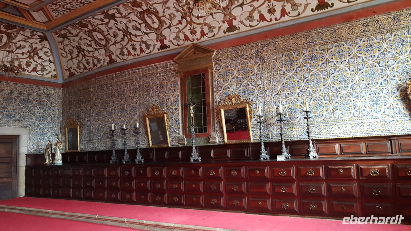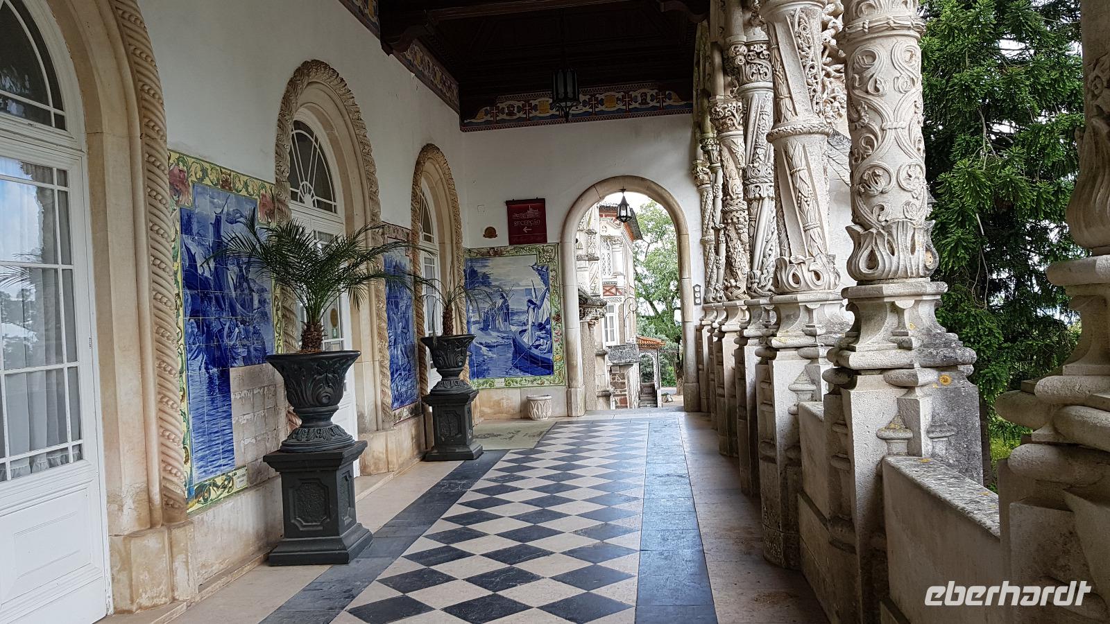 Nach einem ausgiebigen Sonntagsfrühstück starten wir heute Richtung Nordwesten. Sintra ist unser Ziel, die Sommerresidenz der Könige. Bis zum 11. Jahrhundert waren die Mauren hier- ihre Festung thront heute noch hoch über der Stadt. König Alfonso Henriques eroberte Sintra 1147, verlieh dem Ort Stadtrechte und mit den Klöstern des 12. und 13. Jahrhunderts wuchs auch die Stadt und wurde von den portugiesischen Königen wegen des kühleren Klimas hier geliebt und geschätzt. Der Adel zog mit und errichtete hier wundervolle Anwesen und Herrenhäuser, doch die konnten wir später bewundern. Zunächst wollten wir den Nationalpalast besichtigen. König João I. ließ ihn nach den Zerstörungen durch das Erdbeben 1755 wiederaufbauen und unter Manuel I. erhielt der Palast einen weiteren Flügel und sein heutiges Gesicht. Uns bot sich heute Morgen ein phantastisches Bild: dunkle Gewitterwolken hingen über dem Palast und hoben seine weißen Mauern noch mehr hervor. Maria besorgte unsere Tickets und dann konnten wir unsere Entdeckungsreise starten. Und es gab tatsächlich so viel zu entdecken, Möbel aus der Handelszeit mit Indien, eine Pagode aus Elfenbein, manuelinische Gestaltungselemente, den Elster- und den Schwanensaal, und überall die wunderschönen Azulejos. Maria erzählte uns die Geschichten zu den Elstern, dem Prunksaal und erläuterte uns die verschiedenen Azulejos, aus maurischer Zeit und danach. Auch die Küche war von unten bis oben mit weißen Azulejos verkleidet, hier erheben sich die riesigen, 33 Meter hohen Schlote, so konnte an allen Feuerstellen gleichzeitig gekocht und gebrutzelt werden und es blieb doch relativ kühl. Beeindruckend auch die Innenhöfe, der Badegarten...Mit vielen Fotos und Eindrücken ging es weiter in das Stadtzentrum von Sintra. Hier konnten wir uns nach Herzenslust umsehen, dem bunten Treiben zusehen und einen Kaffee genießen. Am Bus trafen wir uns wieder und hinunter ging die Fahrt durch den Nationalpark von Sintra. Hier gab es vor kurzem schwere Waldbrände, die zum Glück relativ rasch unter Kontrolle waren. Trotzdem sind große Waldbestände schwer gezeichnet, Asche überall und verkohlte Stämme der Bäume, die noch stehen. Da wird die Dimension des vorbeugenden Brandschutzes besonders deutlich. Schließlich kommen wir zum