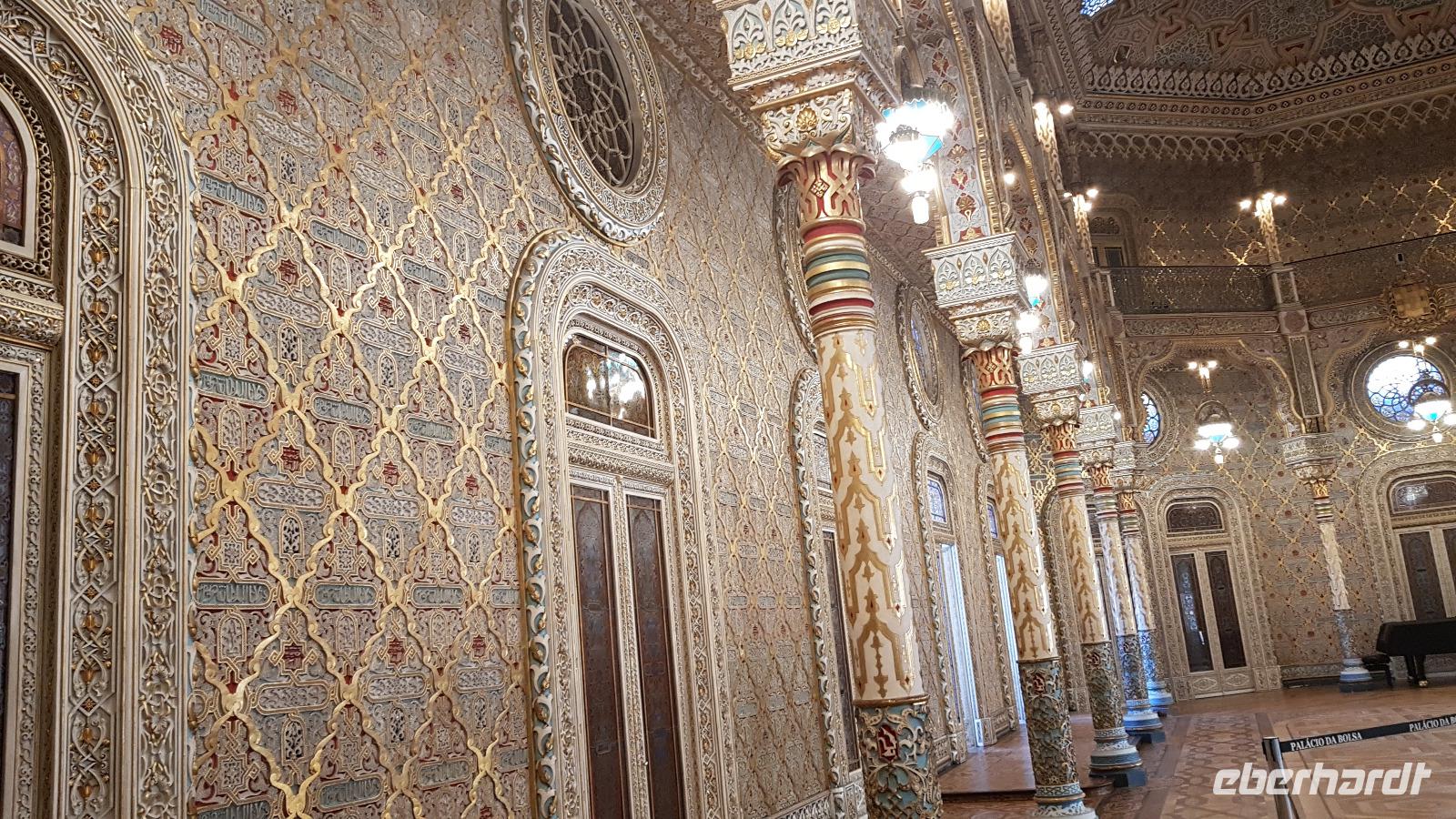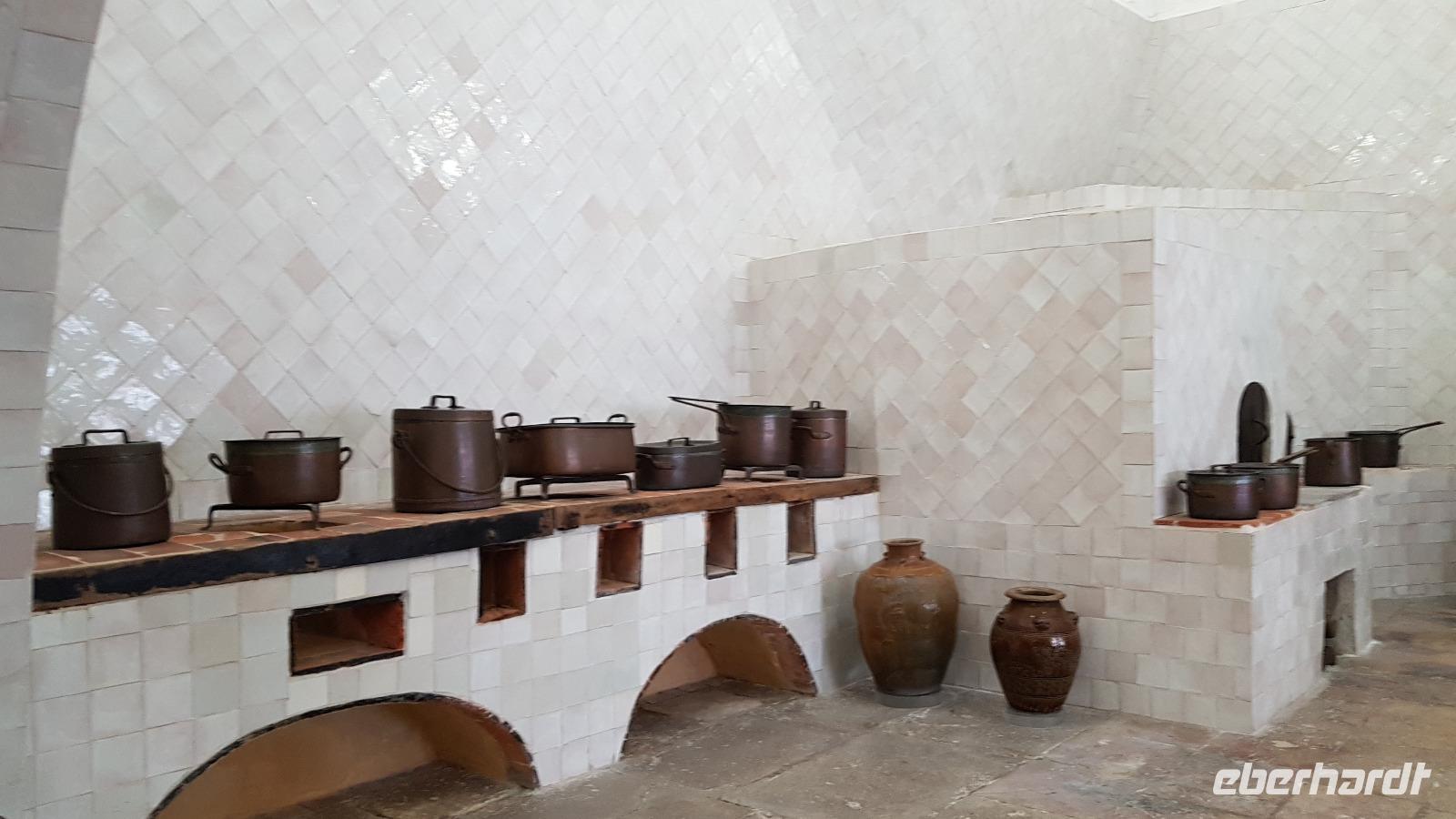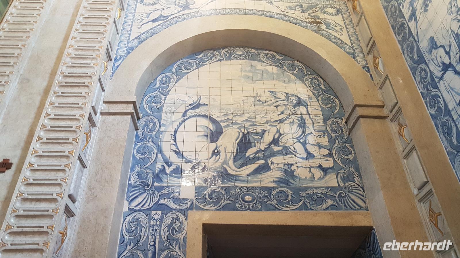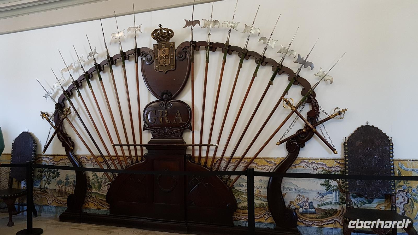 Nach einem ausgiebigen Sonntagsfrühstück starten wir heute Richtung Nordwesten. Sintra ist unser Ziel, die Sommerresidenz der Könige. Bis zum 11. Jahrhundert waren die Mauren hier- ihre Festung thront heute noch hoch über der Stadt. König Alfonso Henriques eroberte Sintra 1147, verlieh dem Ort Stadtrechte und mit den Klöstern des 12. und 13. Jahrhunderts wuchs auch die Stadt und wurde von den portugiesischen Königen wegen des kühleren Klimas hier geliebt und geschätzt. Der Adel zog mit und errichtete hier wundervolle Anwesen und Herrenhäuser, doch die konnten wir später bewundern. Zunächst wollten wir den Nationalpalast besichtigen. König João I. ließ ihn nach den Zerstörungen durch das Erdbeben 1755 wiederaufbauen und unter Manuel I. erhielt der Palast einen weiteren Flügel und sein heutiges Gesicht. Uns bot sich heute Morgen ein phantastisches Bild: dunkle Gewitterwolken hingen über dem Palast und hoben seine weißen Mauern noch mehr hervor. Maria besorgte unsere Tickets und dann konnten wir unsere Entdeckungsreise starten. Und es gab tatsächlich so viel zu entdecken, Möbel aus der Handelszeit mit Indien, eine Pagode aus Elfenbein, manuelinische Gestaltungselemente, den Elster- und den Schwanensaal, und überall die wunderschönen Azulejos. Maria erzählte uns die Geschichten zu den Elstern, dem Prunksaal und erläuterte uns die verschiedenen Azulejos, aus maurischer Zeit und danach. Auch die Küche war von unten bis oben mit weißen Azulejos verkleidet, hier erheben sich die riesigen, 33 Meter hohen Schlote, so konnte an allen Feuerstellen gleichzeitig gekocht und gebrutzelt werden und es blieb doch relativ kühl. Beeindruckend auch die Innenhöfe, der Badegarten...Mit vielen Fotos und Eindrücken ging es weiter in das Stadtzentrum von Sintra. Hier konnten wir uns nach Herzenslust umsehen, dem bunten Treiben zusehen und einen Kaffee genießen. Am Bus trafen wir uns wieder und hinunter ging die Fahrt durch den Nationalpark von Sintra. Hier gab es vor kurzem schwere Waldbrände, die zum Glück relativ rasch unter Kontrolle waren. Trotzdem sind große Waldbestände schwer gezeichnet, Asche überall und verkohlte Stämme der Bäume, die noch stehen. Da wird die Dimension des vorbeugenden Brandschutzes besonders deutlich. Schließlich kommen wir zum