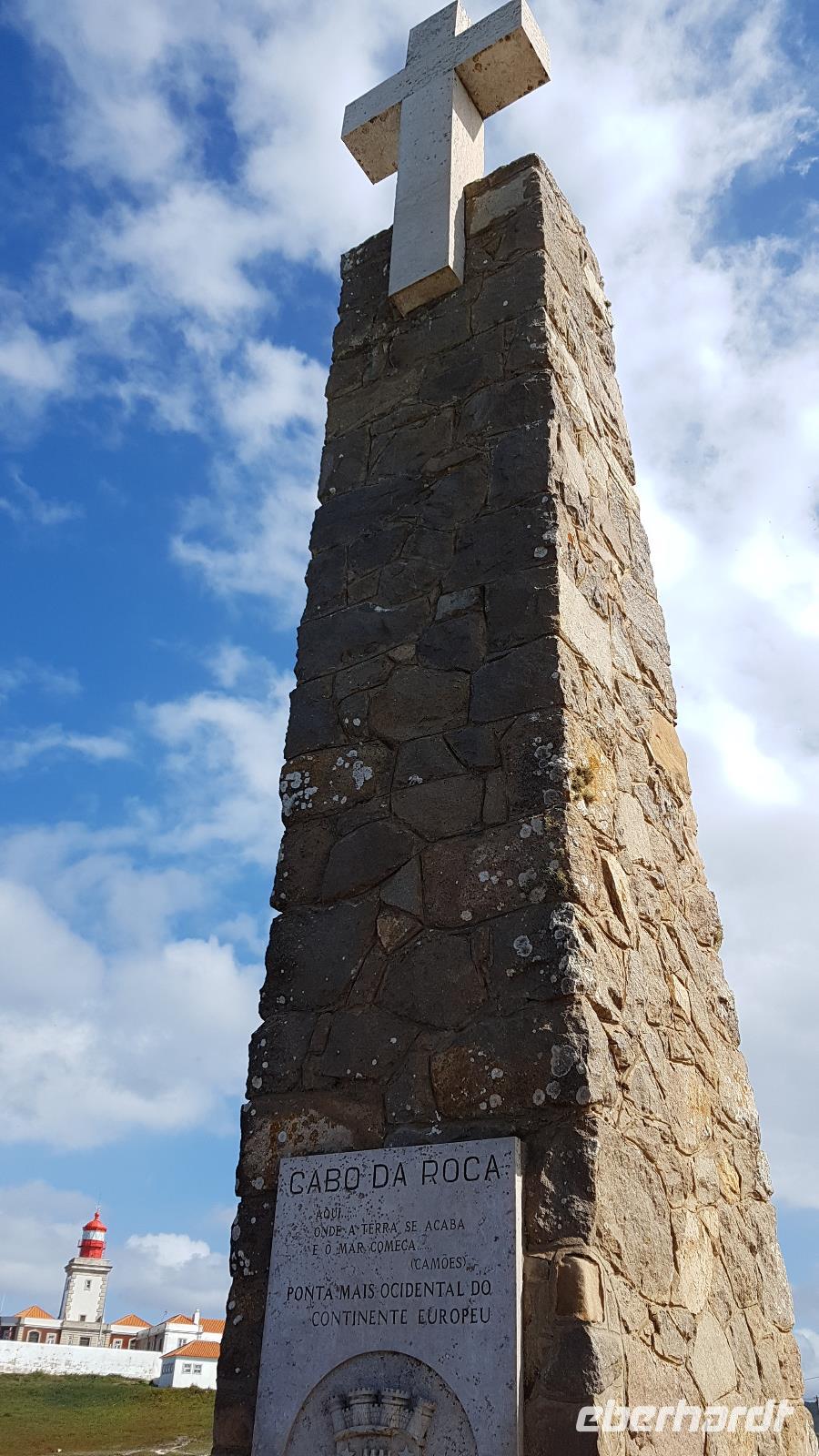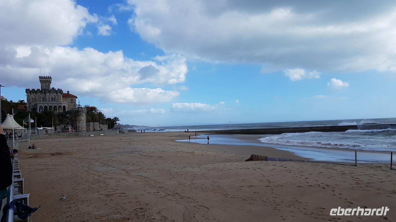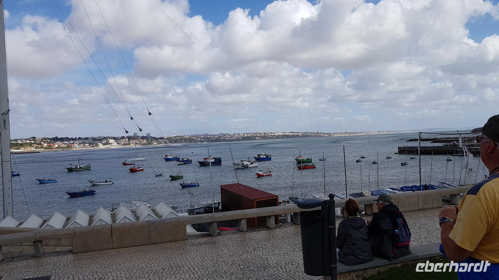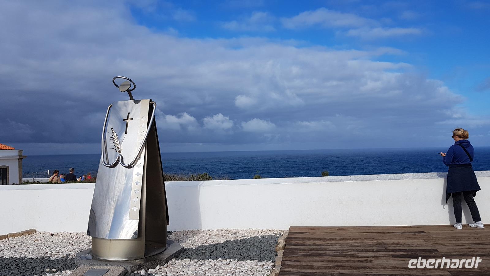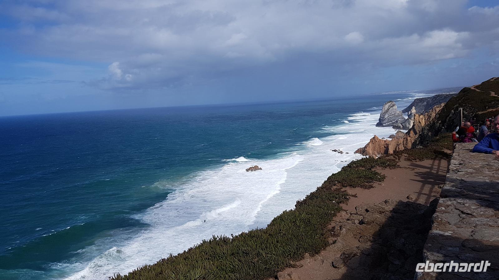 zum westlichsten Punkt des europäischen Festlandes. Schon von weitem war der Leuchtturm zu sehen und eine Stele mit einem Kreuz stand an den Klippen, "wo die Erde endet und das Meer beginnt" (Luís de Camões, 1524-1580). Wir genossen den traumhaften Anblick und das Tosen der Wellen unter uns. Wer wollte ließ es sich dann schriftlich geben mit einer Urkunde, dass er am Ende der Welt gewesen war und dann ging die Fahrt auch schon weiter. Wir folgen der Küstenstraße, natürlich müssen wir einen Fotostopp einlegen, am Fortaleza do Guincho, einem Hotel, das wie eine Festung aussieht. Noch spürt man deutlich die Ausläufer des Wirbelsturmes, der über das Land hinweggefegt war, hohe Wellen brechen sich am Strand und das ergibt ein wunderbares Naturschauspiel. Stundelang könnte man dem zusehen, doch unsere Fahrt geht weiter: Am Nordufer der Mündung des Tejo in den Atlantik liegt