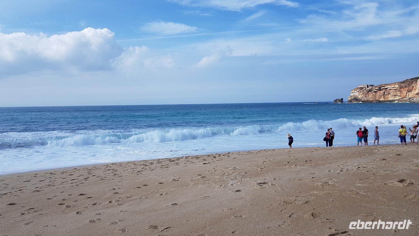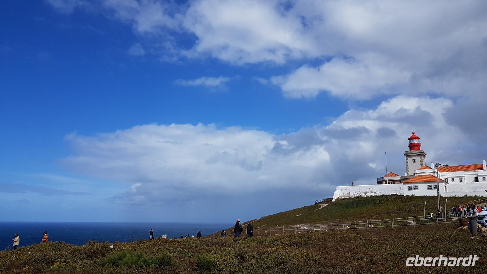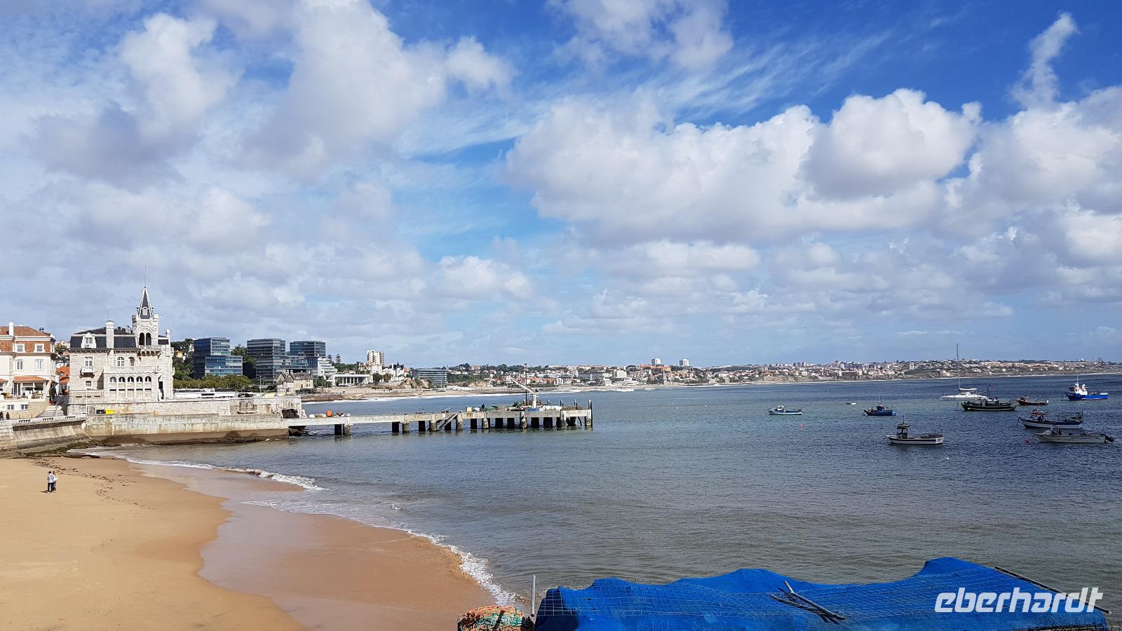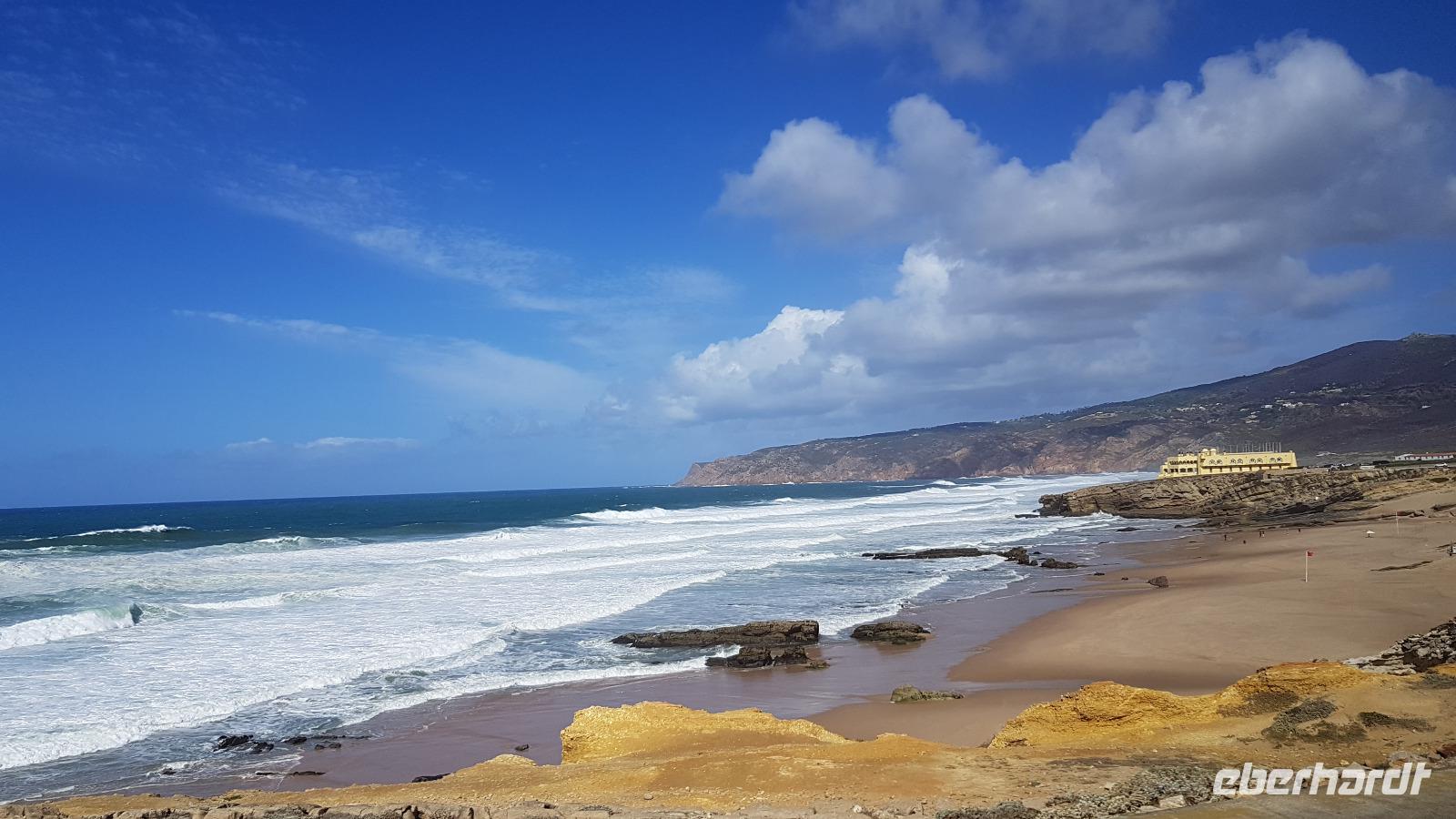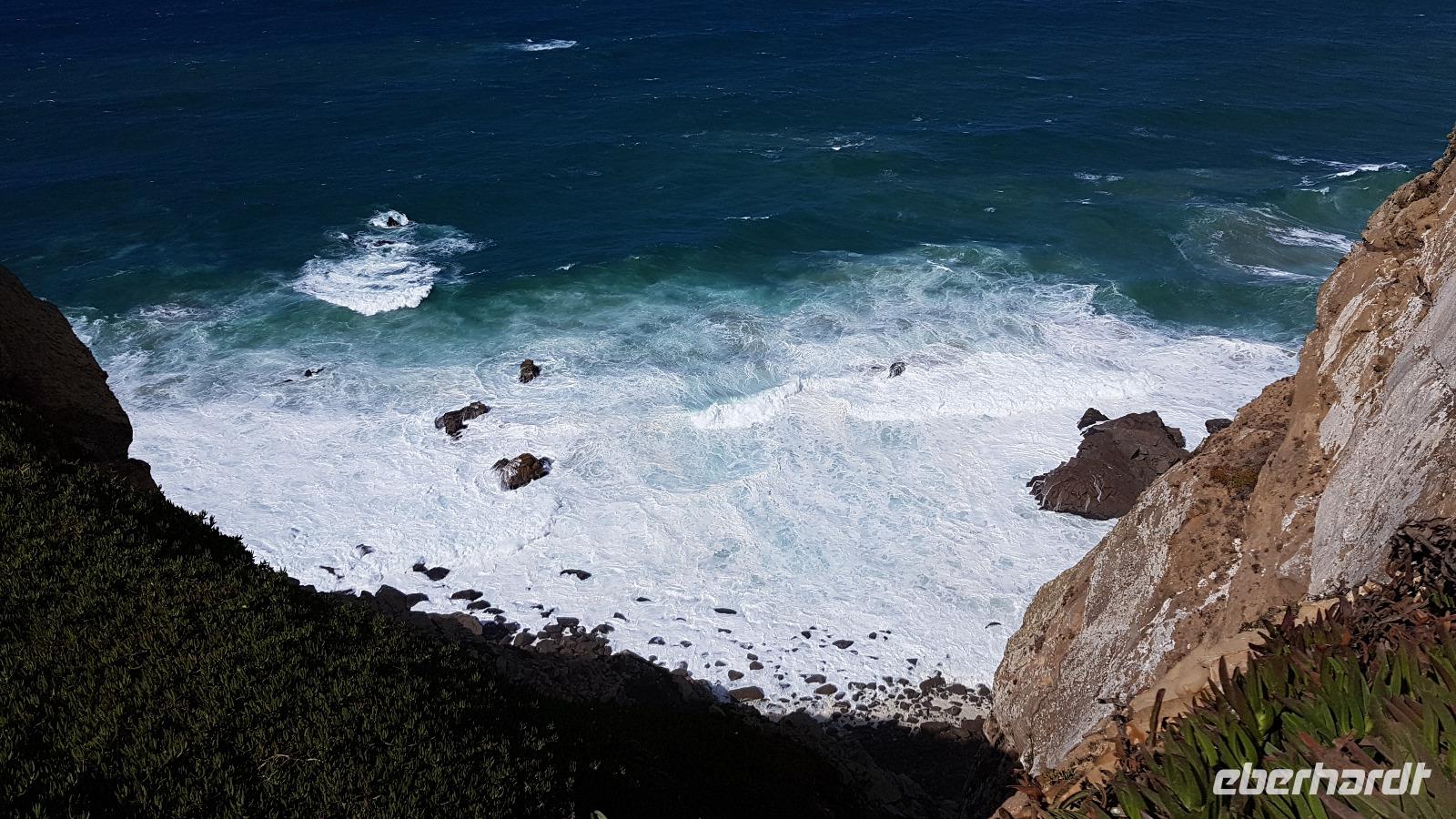 zum westlichsten Punkt des europäischen Festlandes. Schon von weitem war der Leuchtturm zu sehen und eine Stele mit einem Kreuz stand an den Klippen, "wo die Erde endet und das Meer beginnt" (Luís de Camões, 1524-1580). Wir genossen den traumhaften Anblick und das Tosen der Wellen unter uns. Wer wollte ließ es sich dann schriftlich geben mit einer Urkunde, dass er am Ende der Welt gewesen war und dann ging die Fahrt auch schon weiter. Wir folgen der Küstenstraße, natürlich müssen wir einen Fotostopp einlegen, am Fortaleza do Guincho, einem Hotel, das wie eine Festung aussieht. Noch spürt man deutlich die Ausläufer des Wirbelsturmes, der über das Land hinweggefegt war, hohe Wellen brechen sich am Strand und das ergibt ein wunderbares Naturschauspiel. Stundelang könnte man dem zusehen, doch unsere Fahrt geht weiter: Am Nordufer der Mündung des Tejo in den Atlantik liegt