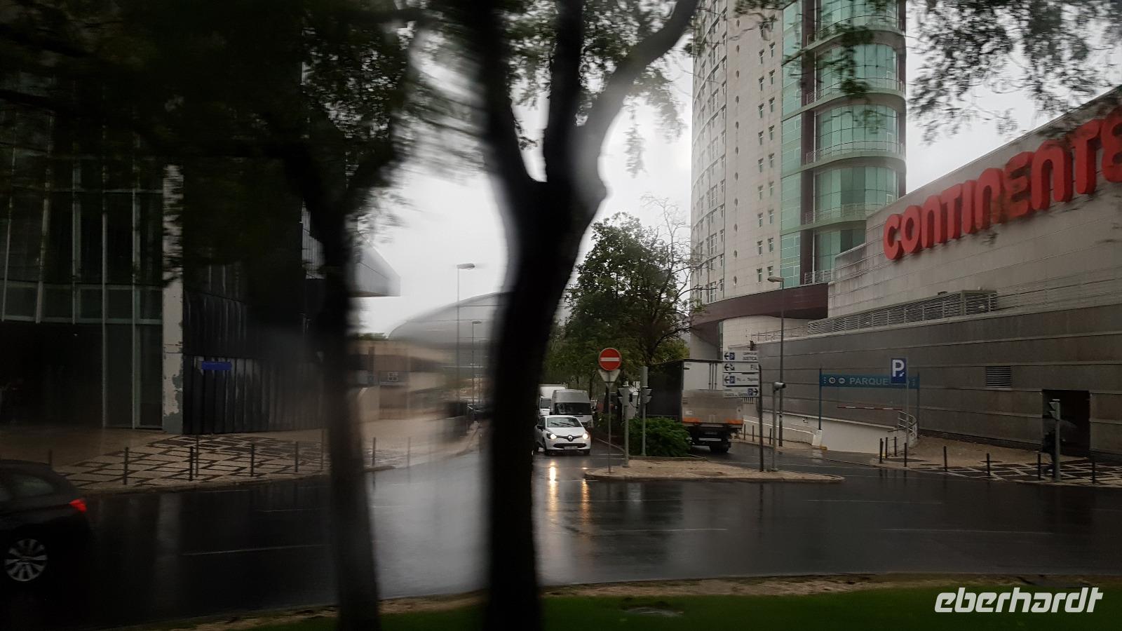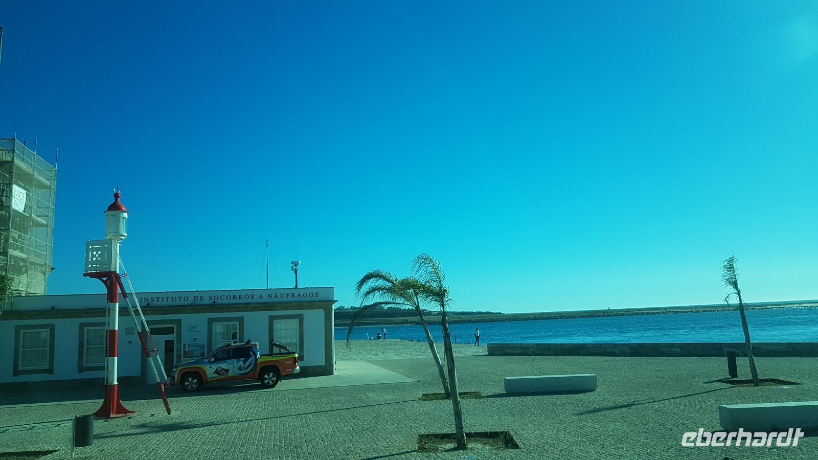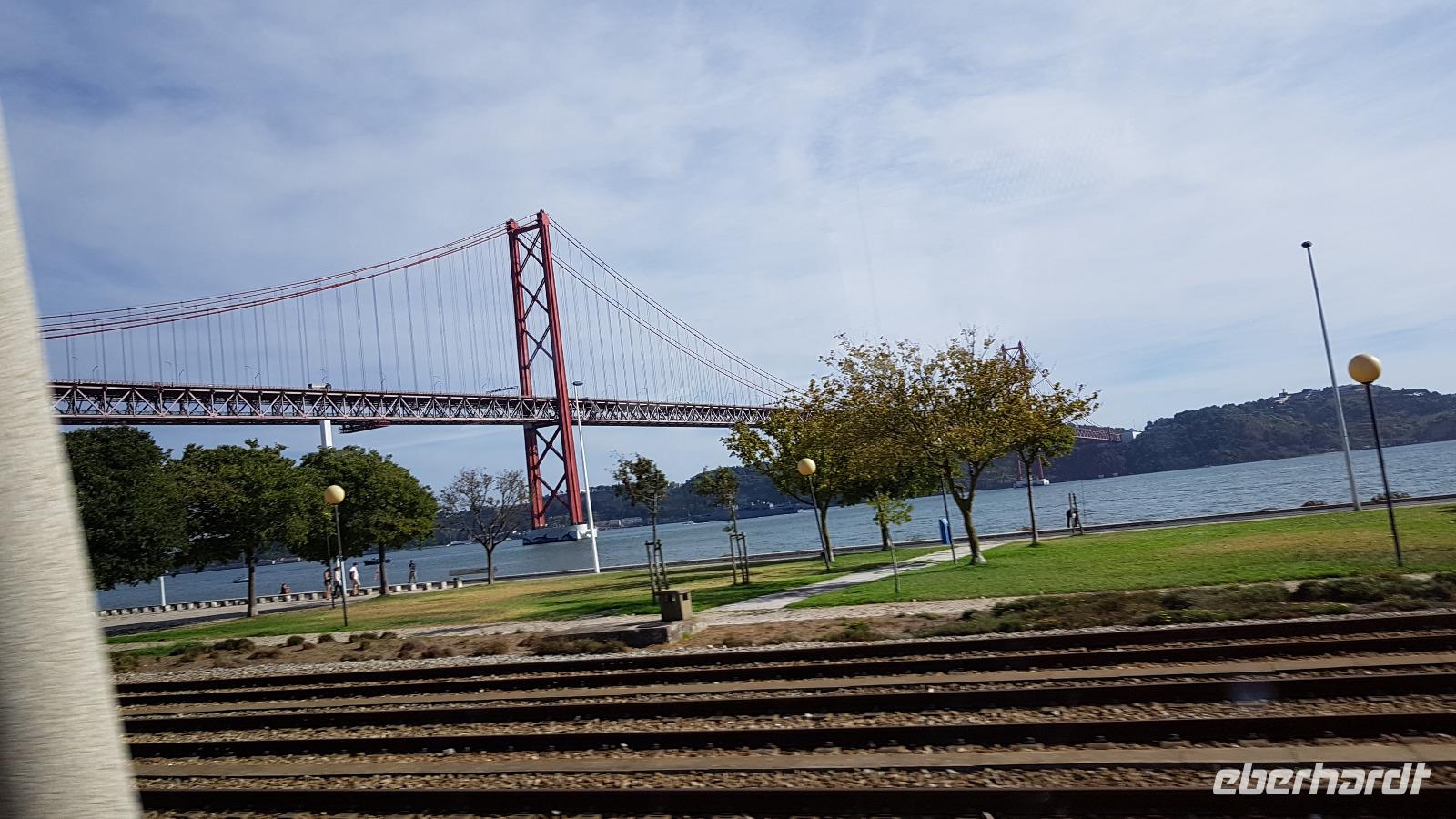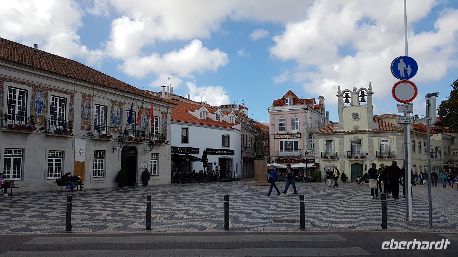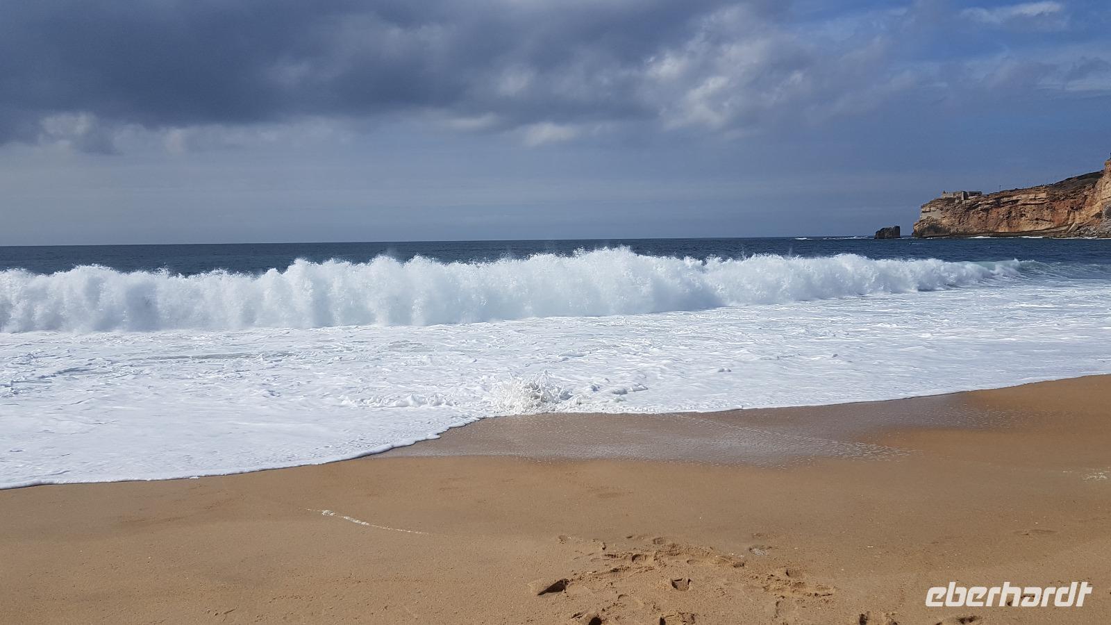 zum westlichsten Punkt des europäischen Festlandes. Schon von weitem war der Leuchtturm zu sehen und eine Stele mit einem Kreuz stand an den Klippen, "wo die Erde endet und das Meer beginnt" (Luís de Camões, 1524-1580). Wir genossen den traumhaften Anblick und das Tosen der Wellen unter uns. Wer wollte ließ es sich dann schriftlich geben mit einer Urkunde, dass er am Ende der Welt gewesen war und dann ging die Fahrt auch schon weiter. Wir folgen der Küstenstraße, natürlich müssen wir einen Fotostopp einlegen, am Fortaleza do Guincho, einem Hotel, das wie eine Festung aussieht. Noch spürt man deutlich die Ausläufer des Wirbelsturmes, der über das Land hinweggefegt war, hohe Wellen brechen sich am Strand und das ergibt ein wunderbares Naturschauspiel. Stundelang könnte man dem zusehen, doch unsere Fahrt geht weiter: Am Nordufer der Mündung des Tejo in den Atlantik liegt