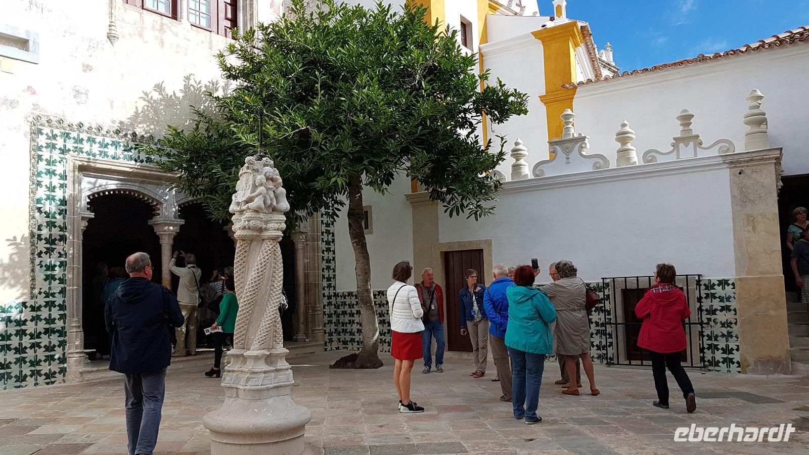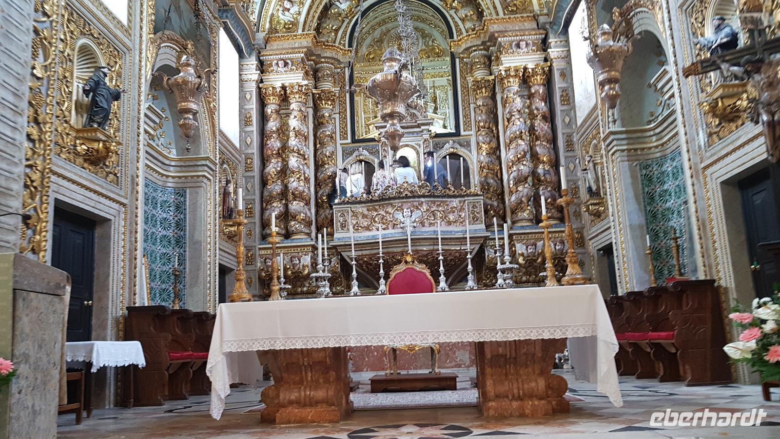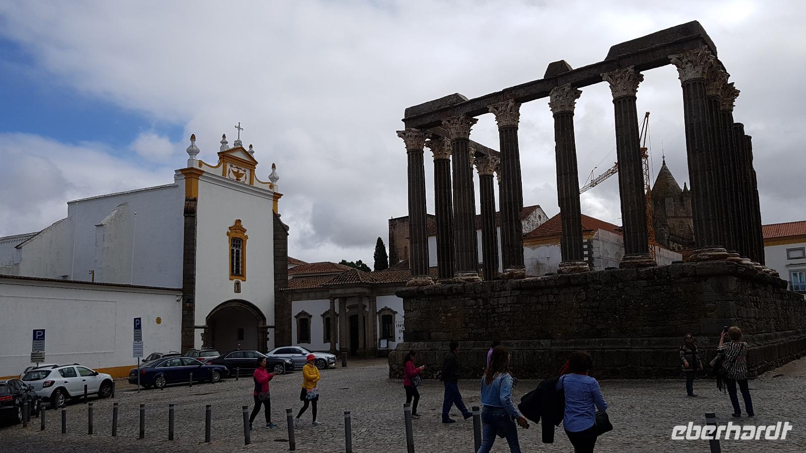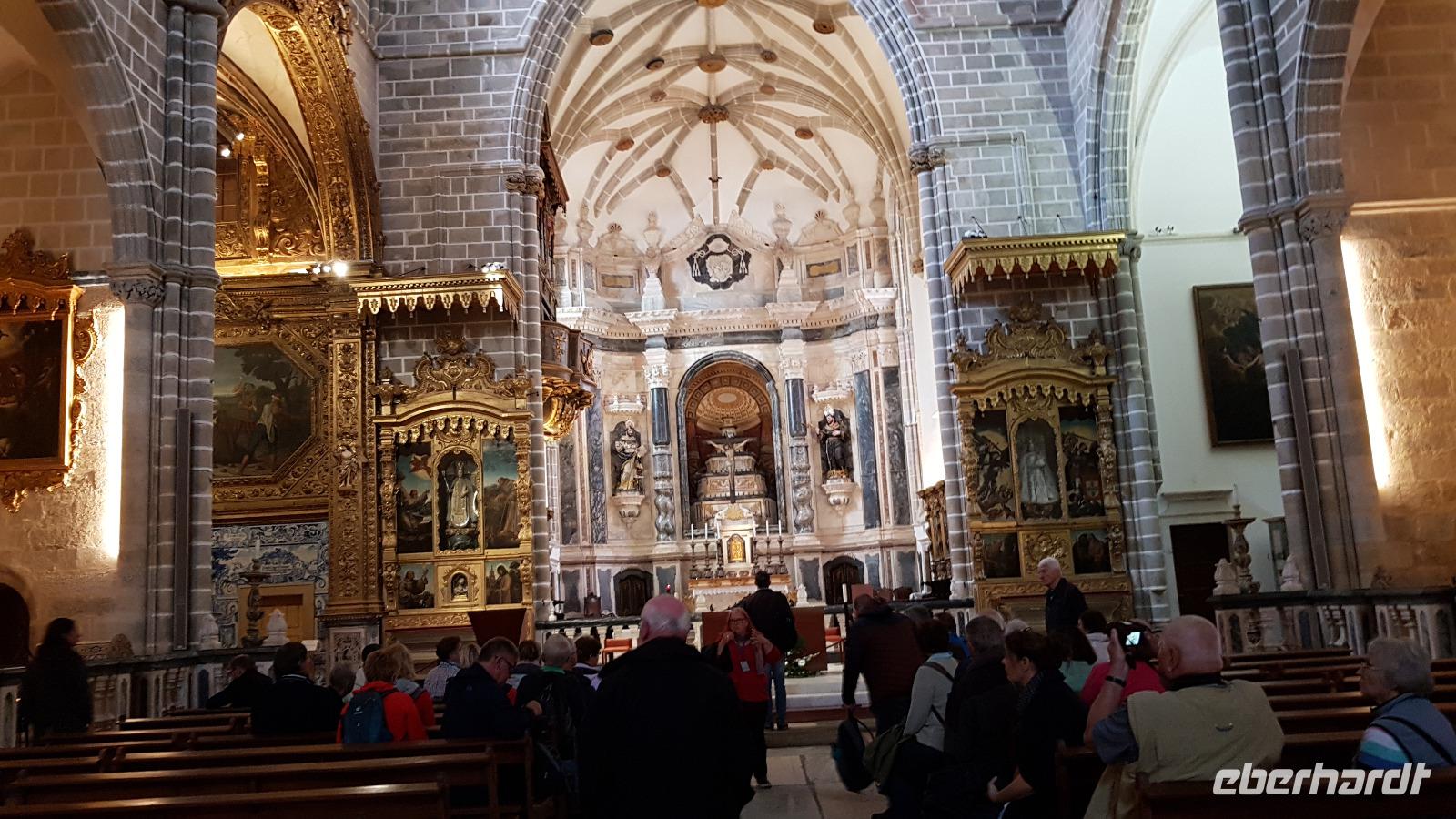 hatten wir bald erreicht und hier treffen wir auf römische Zeitzeugen- den Diana-Tempel. Es ist Zufall, dass er erhalten blieb. Er war nämlich quasi eingemauert in dem Schlachthof, der hier einmal stand. Jetzt sind die Säulen wieder freigelegt und eine der Sehenswürdigkeiten von Evora, der Hauptstadt des Alentejo. Eine weitere ist ihre Kathedrale. Sie empfängt uns mit einem wunderschönen gotischen Portal. Im Inneren dann eine der seltenen Darstellungen der schwangeren Jungfrau Maria. Die barocke Ausgestaltung der Kirche ist überwältigend und man könnte stundenlang hier verweilen und doch immer wieder etwas Neues entdecken. Wir spazieren weiter durch die Gassen der Stadt, die schon immer bedeutender Handelspunkt war und auf dem Marktplatz schließlich trennen wir uns kurz, jeder hat individuell Zeit, die Stadt weiter zu erkunden oder einen Mittagsimbiss zu sich zu nehmen. Dann ist noch Zeit, um der Igreja de São Vicente einen Besuch abzustatten. Eine schöne gotische Kirche mit vielen verschiedenen Altären in den Seitenschiffen. Dann verabschieden wir uns von Evora und fahren Richtung Süden. Am späten Nachmittag erreichen wir