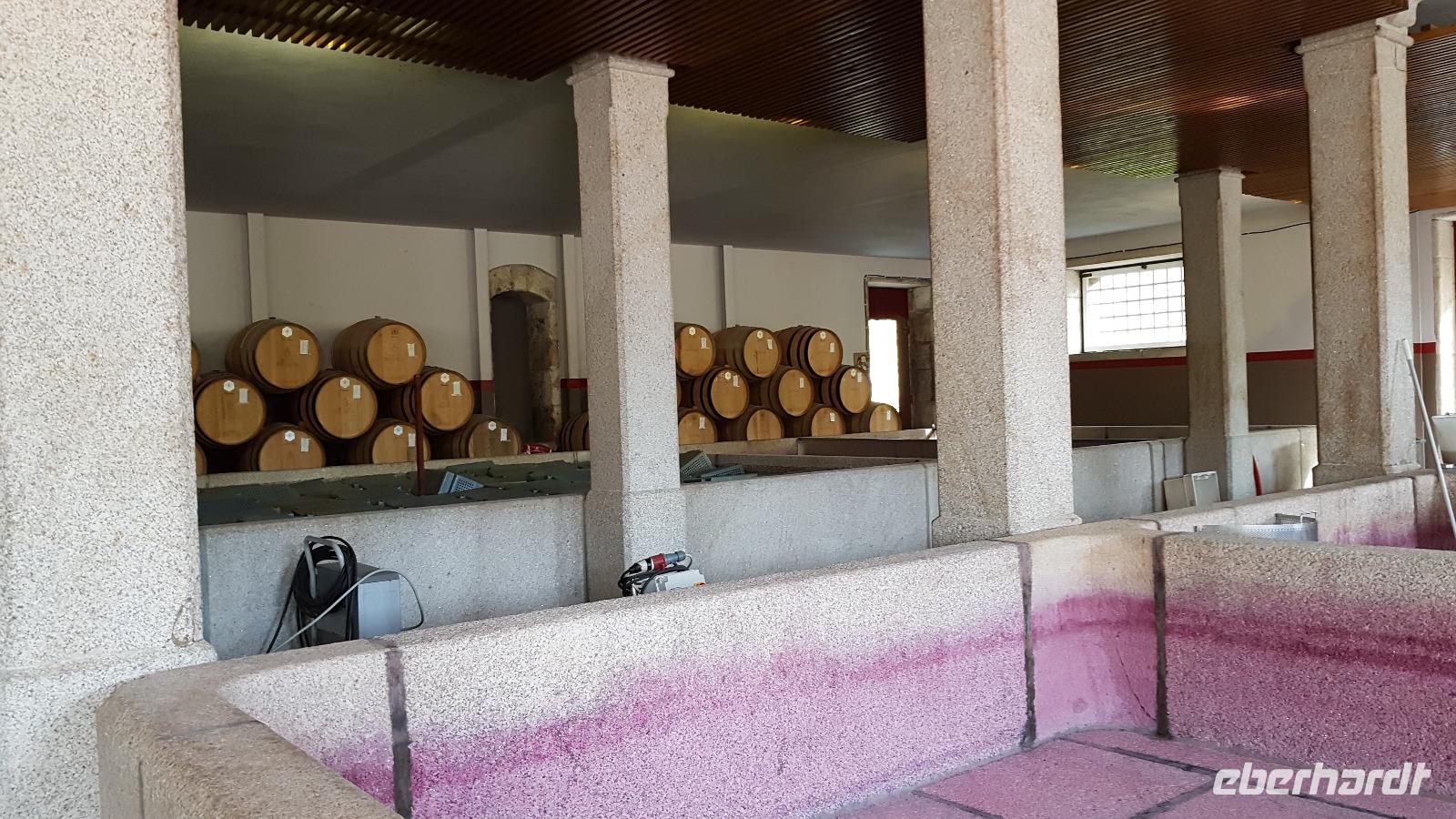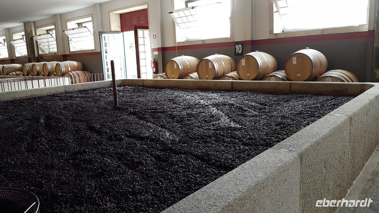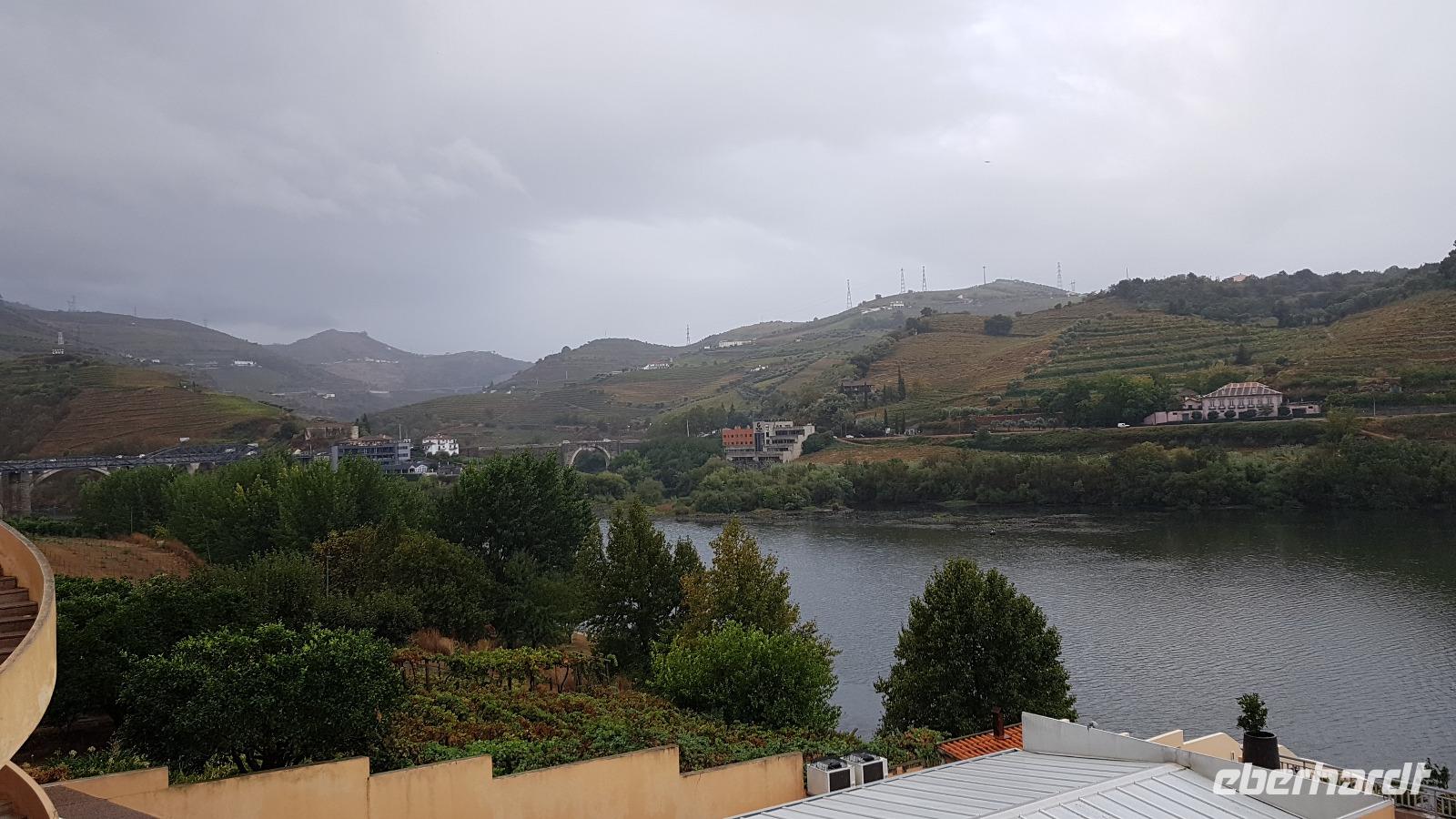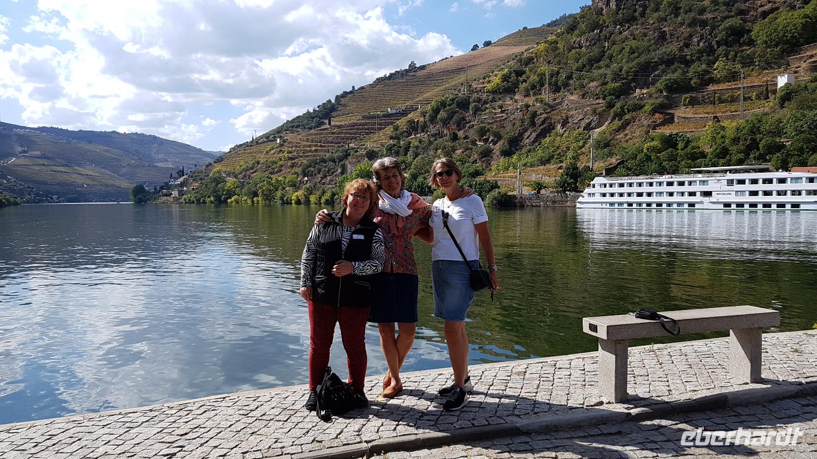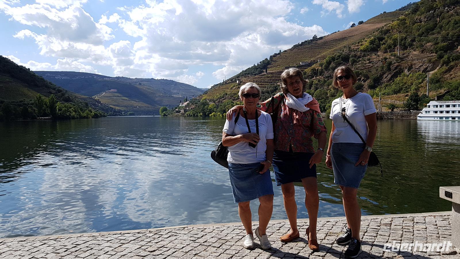 Es liegt direkt neben einem Gut von Sandemann, dessen Werbefigur hat uns überlebensgroß schon eine ganze Weile auf dem Hügel begleitet. Unser Weingut jedoch ist ein Familienbetrieb, es zählt mit ca. 700.000 abgefüllten Flaschen pro Jahr eher zu den mittleren Gütern. (Sandemann produziert 7 Millionen Flaschen.) Carlos zeigt uns das Anwesen und wir kommen gerade noch rechtzeitig. Die Ernte ist nämlich abgeschlossen und die letzten Trauben werden vergoren. Das passiert hier tatsächlich noch traditionell mit dem Füssen- die Trauben werden gestampft. Carlos erzählt, dass nur der Mensch es schafft, dass beim Stampfen nicht die Kerne und Schalen zerstört werden, wie es eine automatische Presse unweigerlich tun würde. So vermeiden sie Bitterstoffe der Kerne und können einen exzellenten Wein herstellen. Von den Traubenbecken geht es zu den Fasslagern- nur ein Teil lagert hier vor Ort, der Platz wird für die touristischen Veranstaltungen benötigt, das Weingut lebt zum Großteil von Hochzeiten, Konzerten, Fado oder auch Übernachtungen vor Ort, das gutseigene Hotel hat 15 Zimmer, weitere Zimmer sind in Fassform dieses Jahr entstanden und bis 2019 soll es auch einen Pool außen geben. Doch bleiben wir beim Wein- sie erzeugen hier verschiedene Tafelweine und auch Portwein. Als er uns fragt, ob wir schon einmal von Tawny gehört haben wissen alle: ja- aber was war das nochmal? Nur 1 Gast wußte noch, was uns Ruben bei Burmester dazu erzählt hat- es ist die Farbe- wie Bernstein. Sie entsteht, weil der Wein in kleineren Fässern lagert und so mehr Kontakt mit dem Holz hat- daher die Farbe. Auch sind die kleinen Fässer luftdurchlässig, daher ist er bereits oxidiert und hält sich angebrochen noch längere Zeit, im Gegensatz zu den Portweinen, die als besonders guter Jahrgang in Flaschen abgefüllt werden und dort mindestens 10 Jahre reifen. Sie sind empfindlich gegenüber Sauerstoff und verlieren rasch ihren Geschmack, wenn sie längere Zeit offenbleiben. Nun möchten wir natürlich auch verkosten und so folgen wir gern Carlos Einladung dazu. Wir starten mit einer Rarität: einem Rose- hmmm. Dem folgt ein Rotwein- wow. Nun kommen die Portweine: ein 10-jähriger und ein Vintage...Wir sind begeistert von der Vielfalt und verbringen noch einige Zeit hier bis wir aufbrechen. Unser Hotel in Peso da Regua wartet auf uns und nach dem problemlosen Einchecken haben wir noch etwas Zeit bis zum Abendessen. Das Hotel liegt direkt am Fluss und was liegt näher, als hier noch am Ufer spazieren zu gehen. Zum Abendessen werden wir mit einem guten Menü verwöhnt und dann heisst es: Bis morgen!