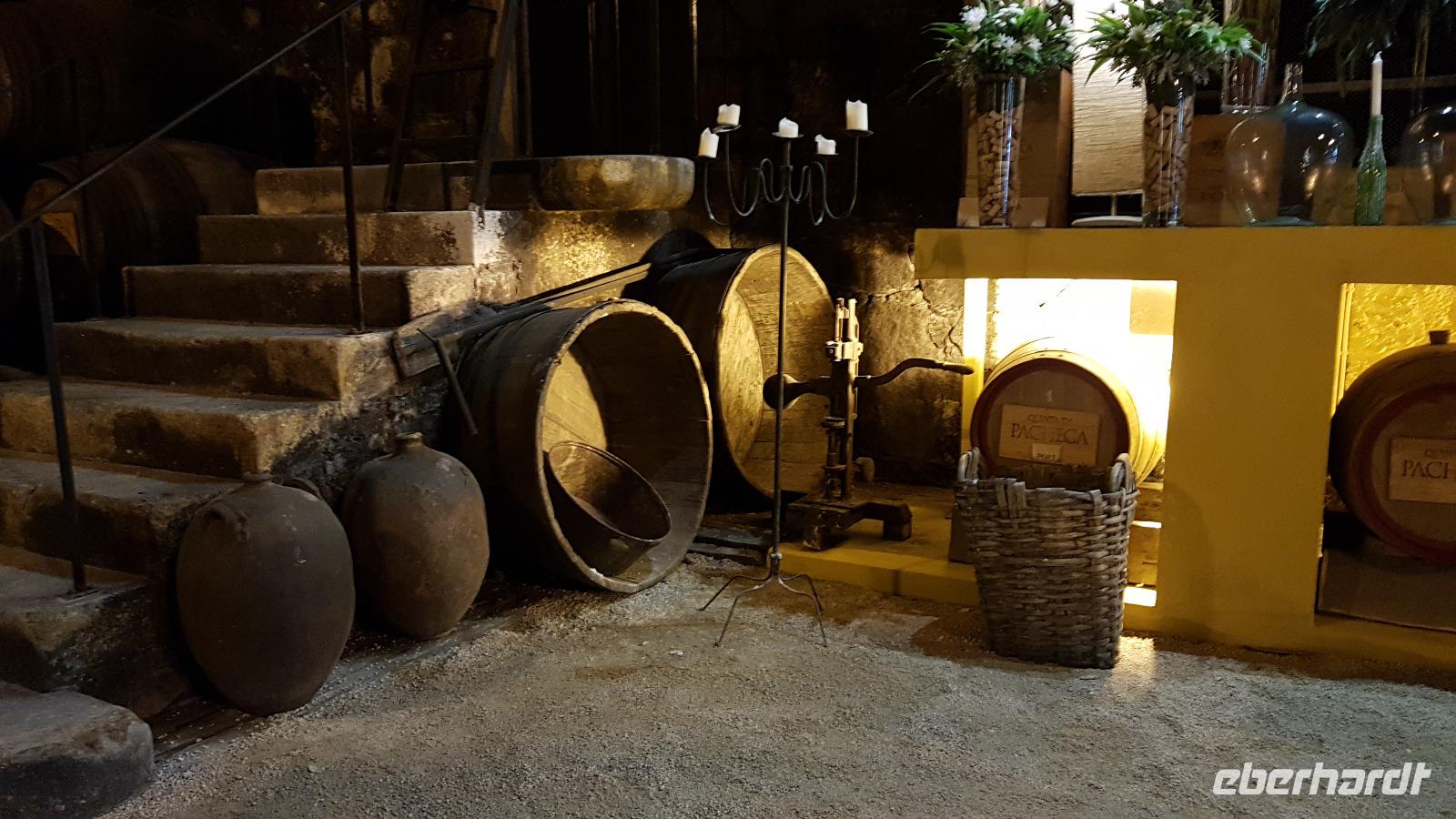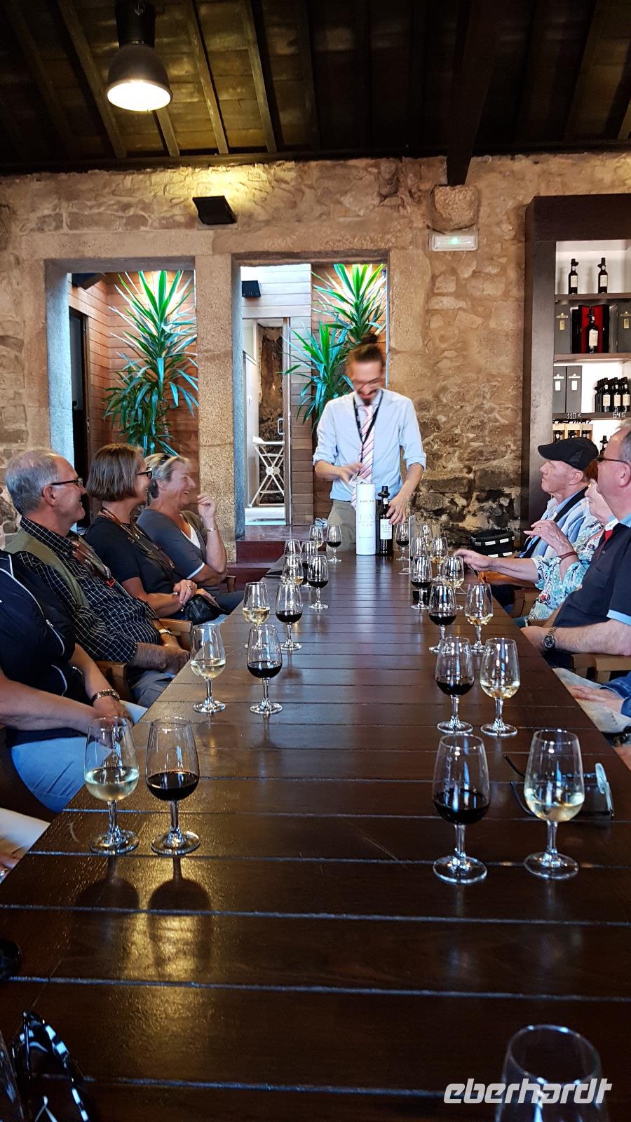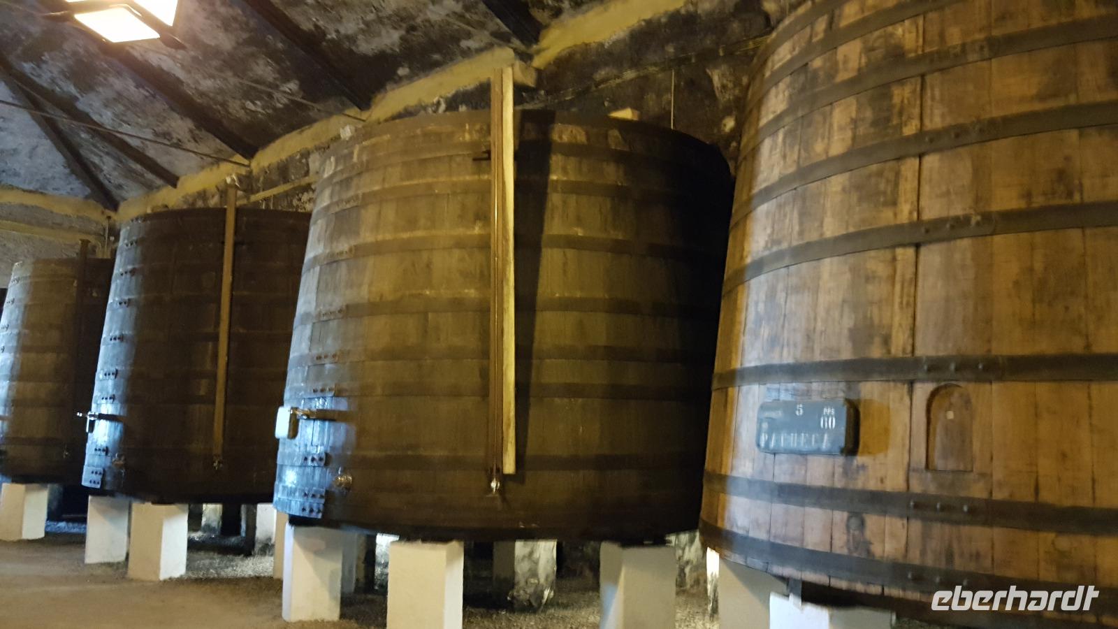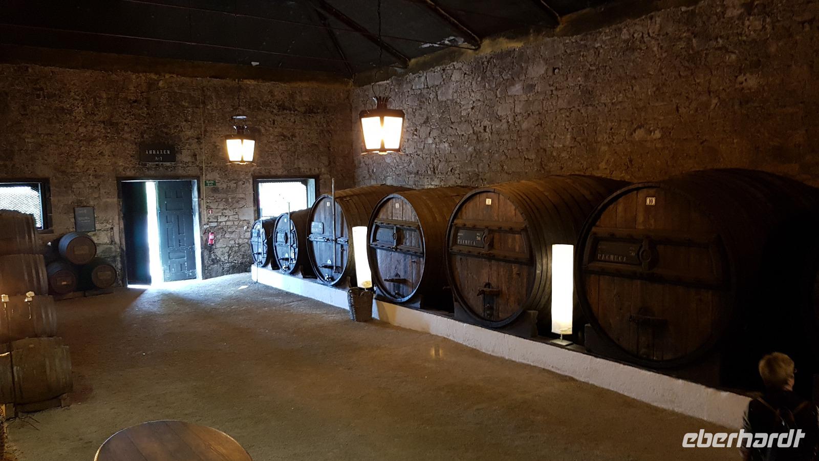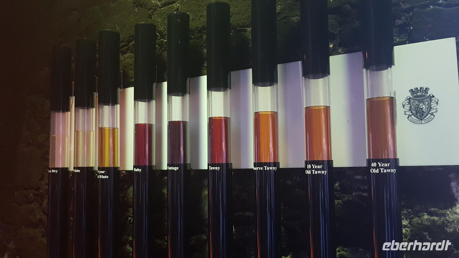 Es liegt direkt neben einem Gut von Sandemann, dessen Werbefigur hat uns überlebensgroß schon eine ganze Weile auf dem Hügel begleitet. Unser Weingut jedoch ist ein Familienbetrieb, es zählt mit ca. 700.000 abgefüllten Flaschen pro Jahr eher zu den mittleren Gütern. (Sandemann produziert 7 Millionen Flaschen.) Carlos zeigt uns das Anwesen und wir kommen gerade noch rechtzeitig. Die Ernte ist nämlich abgeschlossen und die letzten Trauben werden vergoren. Das passiert hier tatsächlich noch traditionell mit dem Füssen- die Trauben werden gestampft. Carlos erzählt, dass nur der Mensch es schafft, dass beim Stampfen nicht die Kerne und Schalen zerstört werden, wie es eine automatische Presse unweigerlich tun würde. So vermeiden sie Bitterstoffe der Kerne und können einen exzellenten Wein herstellen. Von den Traubenbecken geht es zu den Fasslagern- nur ein Teil lagert hier vor Ort, der Platz wird für die touristischen Veranstaltungen benötigt, das Weingut lebt zum Großteil von Hochzeiten, Konzerten, Fado oder auch Übernachtungen vor Ort, das gutseigene Hotel hat 15 Zimmer, weitere Zimmer sind in Fassform dieses Jahr entstanden und bis 2019 soll es auch einen Pool außen geben. Doch bleiben wir beim Wein- sie erzeugen hier verschiedene Tafelweine und auch Portwein. Als er uns fragt, ob wir schon einmal von Tawny gehört haben wissen alle: ja- aber was war das nochmal? Nur 1 Gast wußte noch, was uns Ruben bei Burmester dazu erzählt hat- es ist die Farbe- wie Bernstein. Sie entsteht, weil der Wein in kleineren Fässern lagert und so mehr Kontakt mit dem Holz hat- daher die Farbe. Auch sind die kleinen Fässer luftdurchlässig, daher ist er bereits oxidiert und hält sich angebrochen noch längere Zeit, im Gegensatz zu den Portweinen, die als besonders guter Jahrgang in Flaschen abgefüllt werden und dort mindestens 10 Jahre reifen. Sie sind empfindlich gegenüber Sauerstoff und verlieren rasch ihren Geschmack, wenn sie längere Zeit offenbleiben. Nun möchten wir natürlich auch verkosten und so folgen wir gern Carlos Einladung dazu. Wir starten mit einer Rarität: einem Rose- hmmm. Dem folgt ein Rotwein- wow. Nun kommen die Portweine: ein 10-jähriger und ein Vintage...Wir sind begeistert von der Vielfalt und verbringen noch einige Zeit hier bis wir aufbrechen. Unser Hotel in Peso da Regua wartet auf uns und nach dem problemlosen Einchecken haben wir noch etwas Zeit bis zum Abendessen. Das Hotel liegt direkt am Fluss und was liegt näher, als hier noch am Ufer spazieren zu gehen. Zum Abendessen werden wir mit einem guten Menü verwöhnt und dann heisst es: Bis morgen!