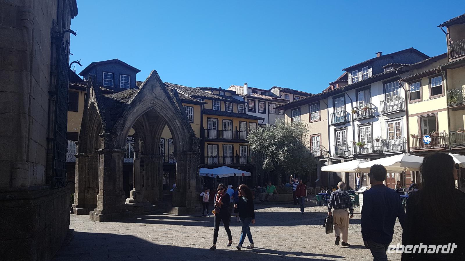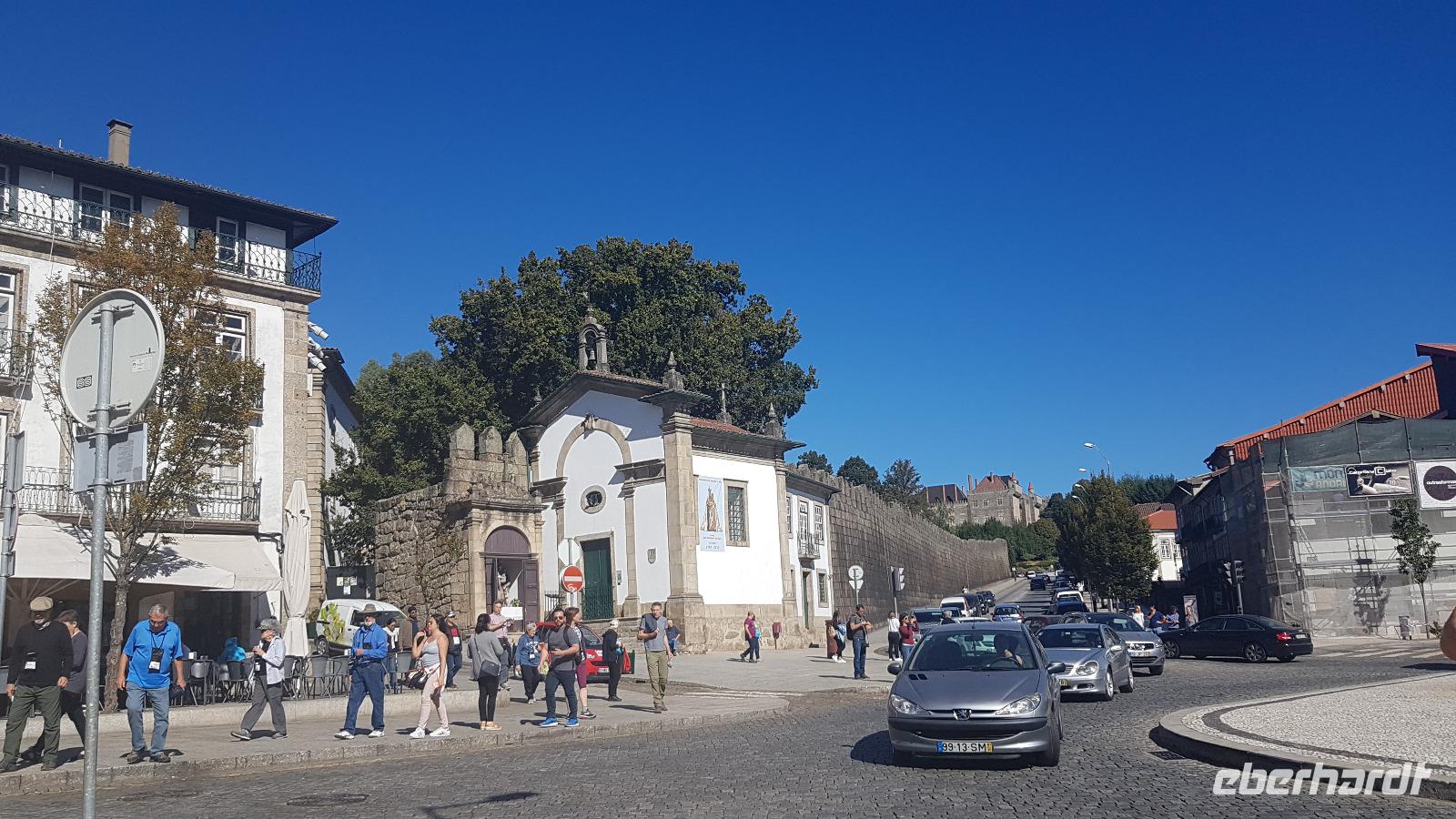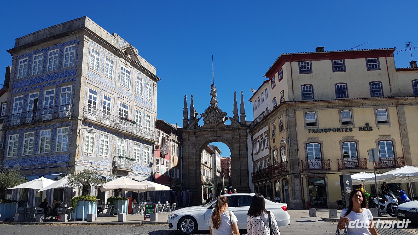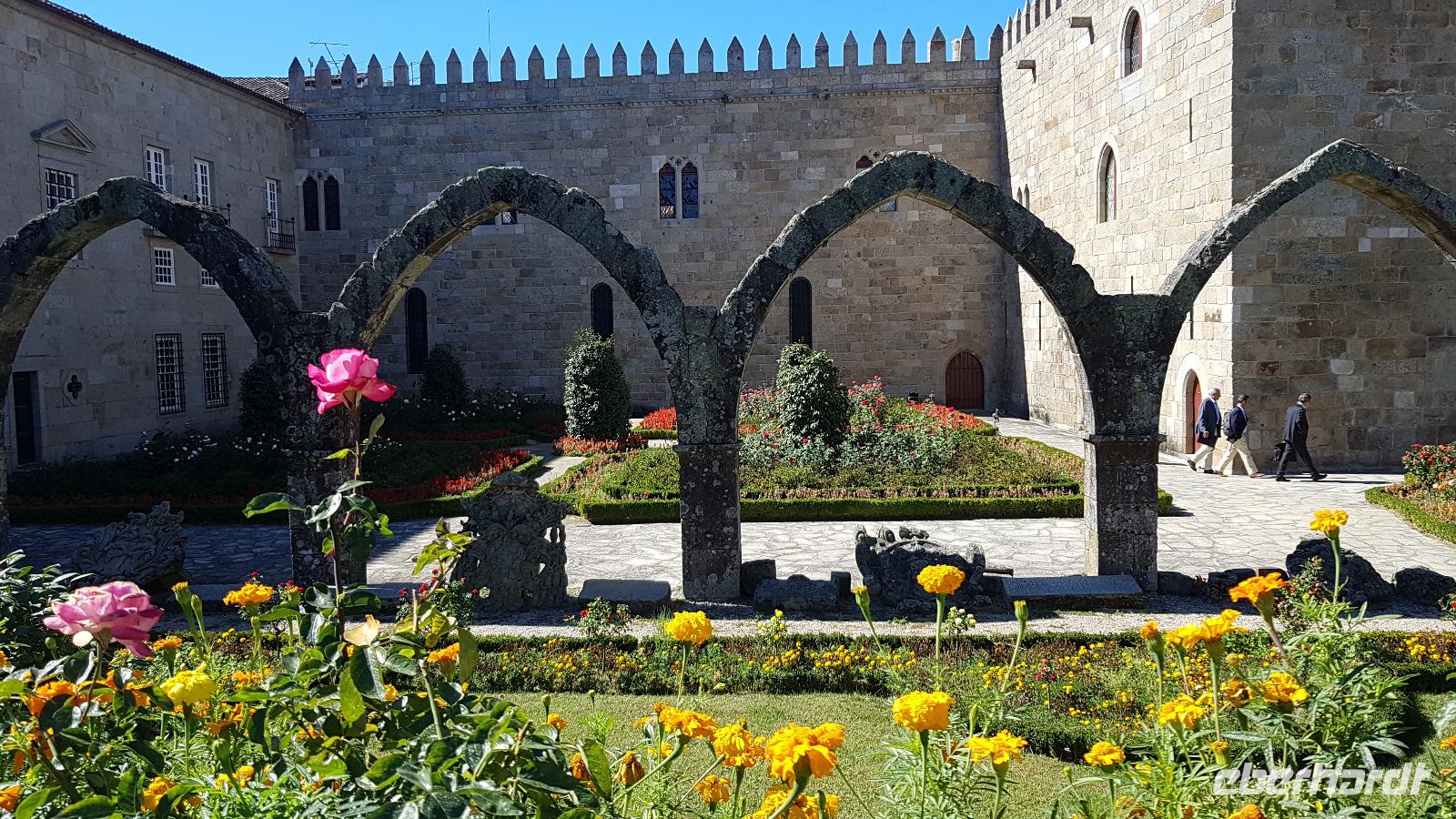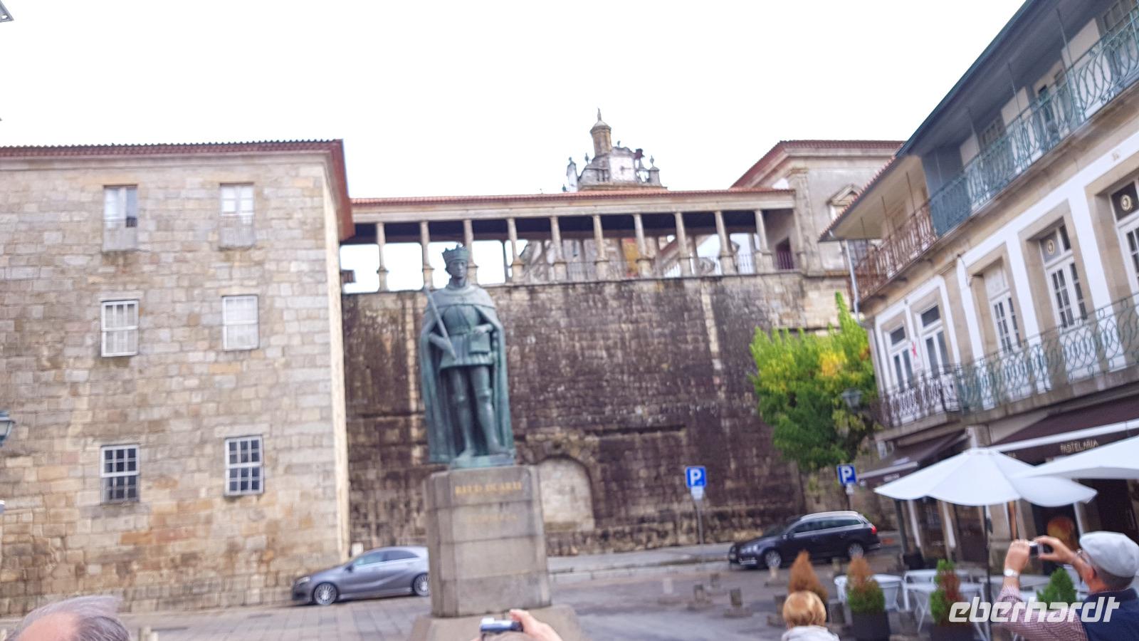 Heute fahren wir zur Wiege Portugals. Nach einem guten Frühstück starten wir Richtung Norden. Uns fallen die vielen Eukalyptusbäume auf und Maria erzählt, dass hier die Holzwirtschaft eine große Rolle spielt. Eukalyptusbäume wachsen sehr schnell, schon nach ca. 9 Jahren können sie "geerntet" und an die Papierindustrie verkauft werden. Das weckt Begehrlichkeiten, alle anderen Hölzer brauchen z.T. Generationen, bis sie Geld erwirtschaften. Aber Eukalyptus saugt den Boden aus, bei Waldbränden sorgen das Öl des Baumes und das dichte Unterholz für ein stetiges Wiederaufflammen der Feuer. Deshalb gibt es jetzt Vorgaben, wo diese Bäume noch wachsen dürfen. Dann erreichen wir Guimarães. Wir besuchen die alte romanische Burg. Sie sollte das Kloster beschützen, das die Gräfin Mumadona im 10. Jahrhundert hier errichten ließ. Hier wurde Alfonso Henriques geboren, der erste König Portugals. Deshalb gilt der Ort auch als Wiege Portugals und war seine erste Hauptstadt. Wir werfen noch einen Blick in die nahegelegene Kapelle in der Alfonso I. getauft wurde und spazieren dann hinunter in den Ort, teilweise auch auf dem Pilgerweg, die Jakobsmuschel weist im Boden darauf hin. Wir genießen den Spaziergang durch die Altstadt, übrigens auch Teil des Weltkulturerbes der UNESCO, die berühmte Rua de Santa Maria entlang bis zum Olivenbaumplatz. Hier trennen sich für kurze Zeit unsere Wege, wir nutzen die Zeit für individuelle Erkundungen, die Kirche mit dem Alpendre vor dem Westportal in ihrem manuelinischen Stil (ein besonderer Baustil benannt nach König Manuel I., erkennbar an den Schiffstauen und den runden statt spitzen Bögen der Gotik), die Läden und Gassen ringsumher... und nach dem einen oder anderen Kaffee oder Espresso verlassen wir die Altstadt, bestaunen die wundervoll angelegte Avenue davor.