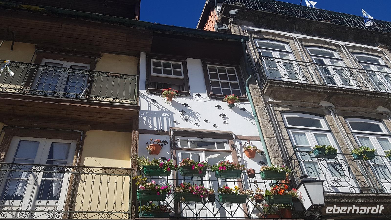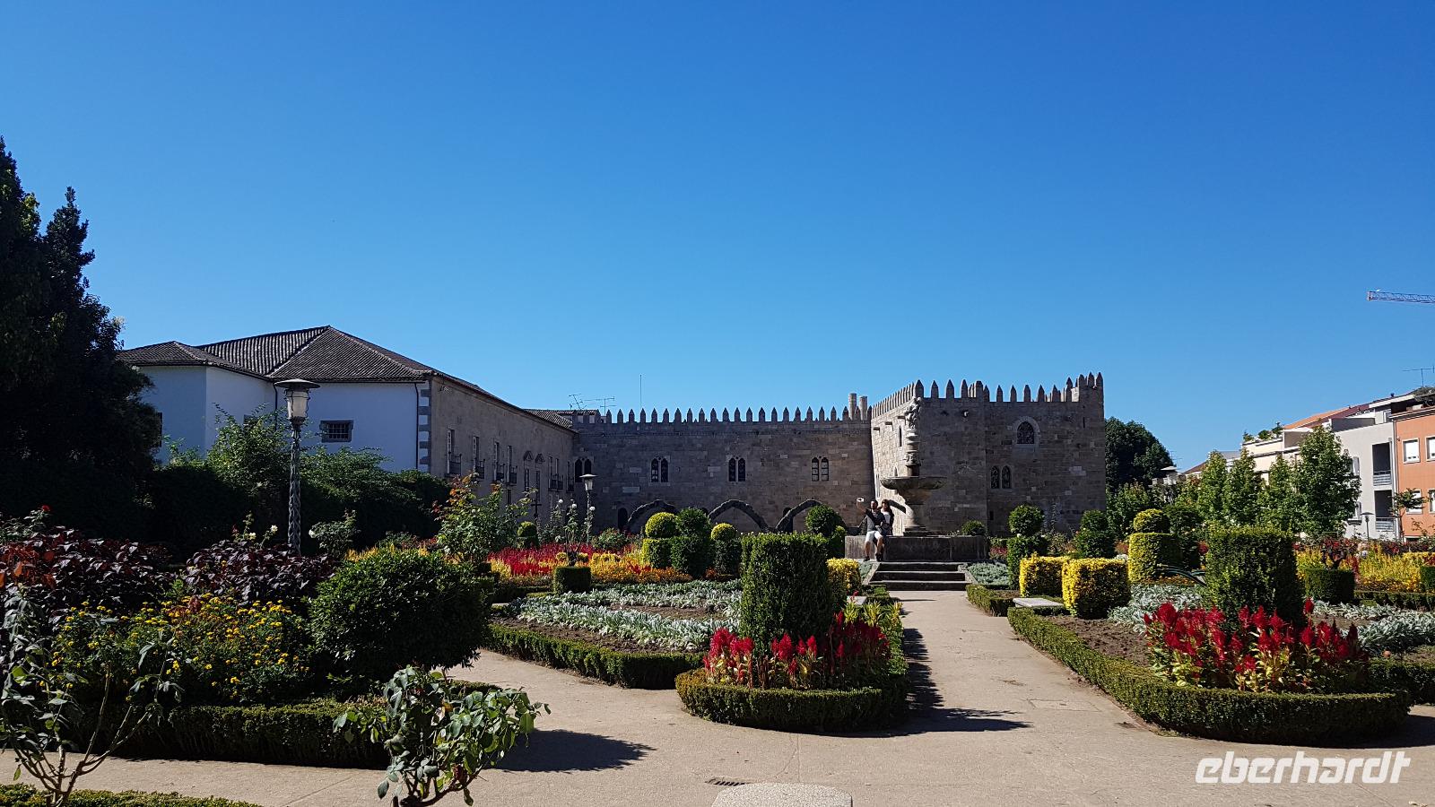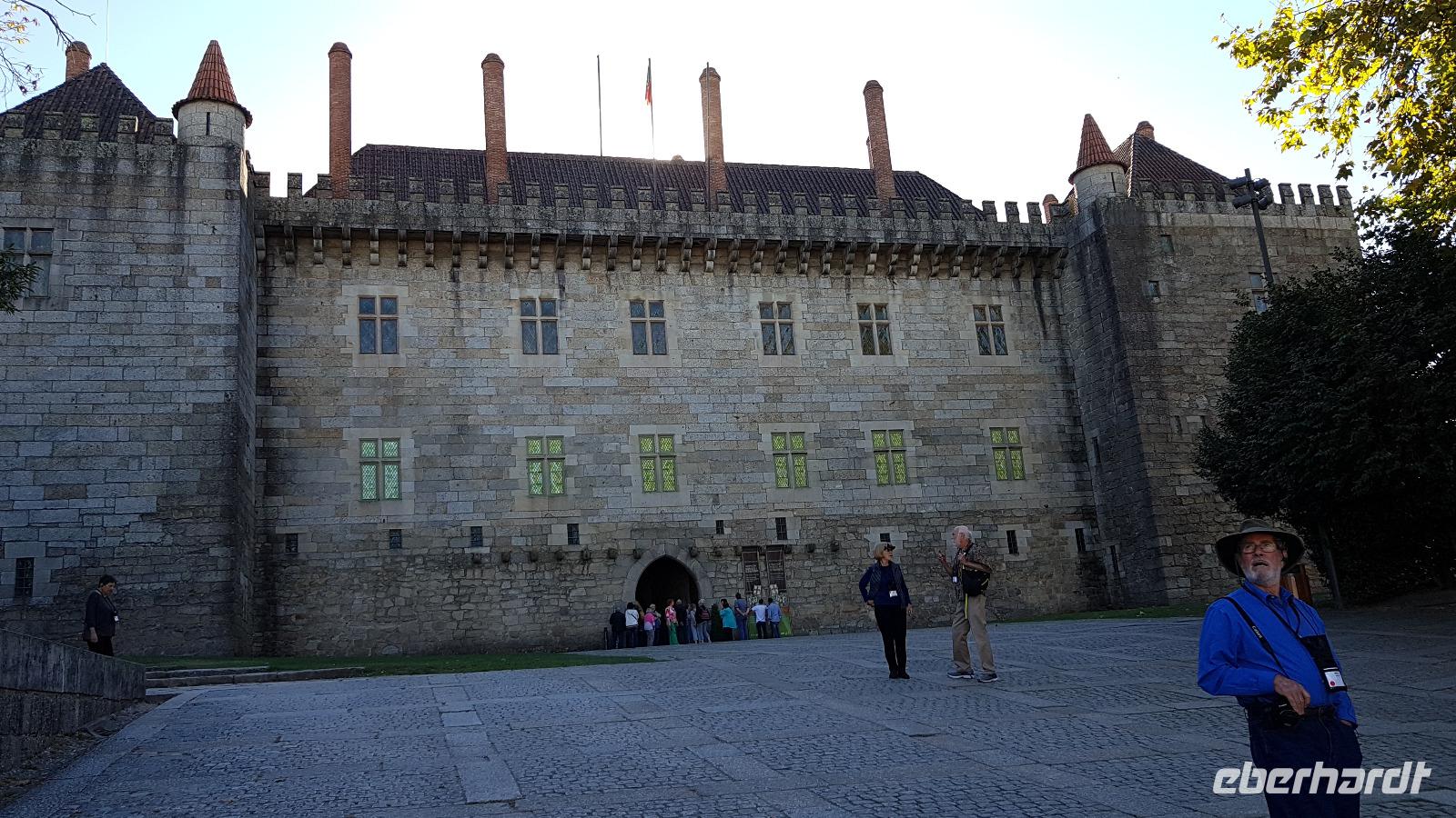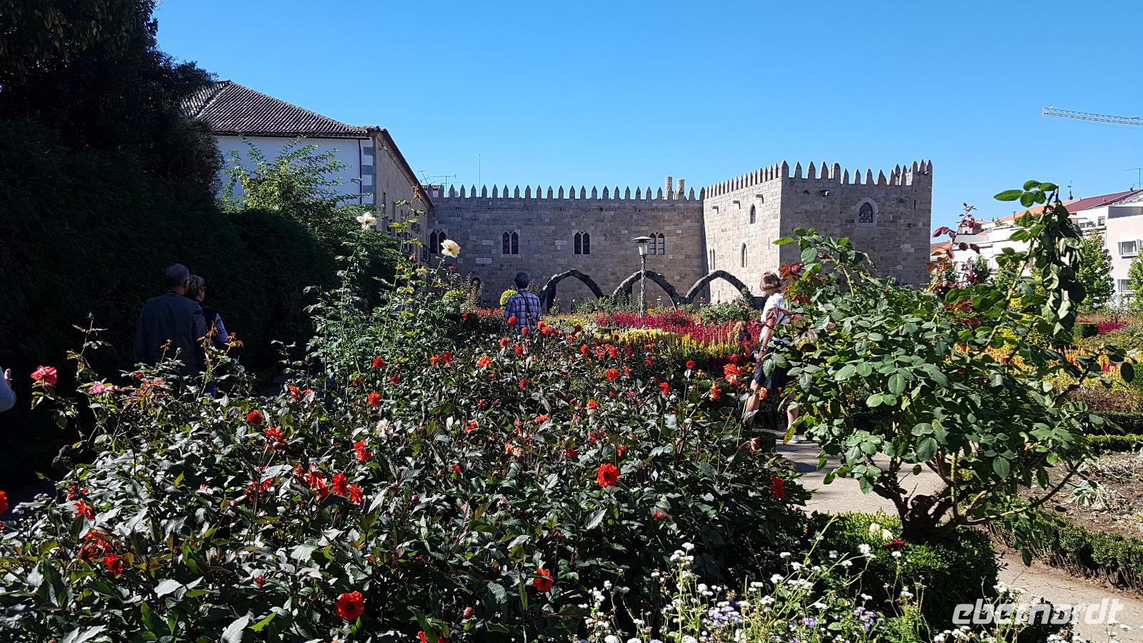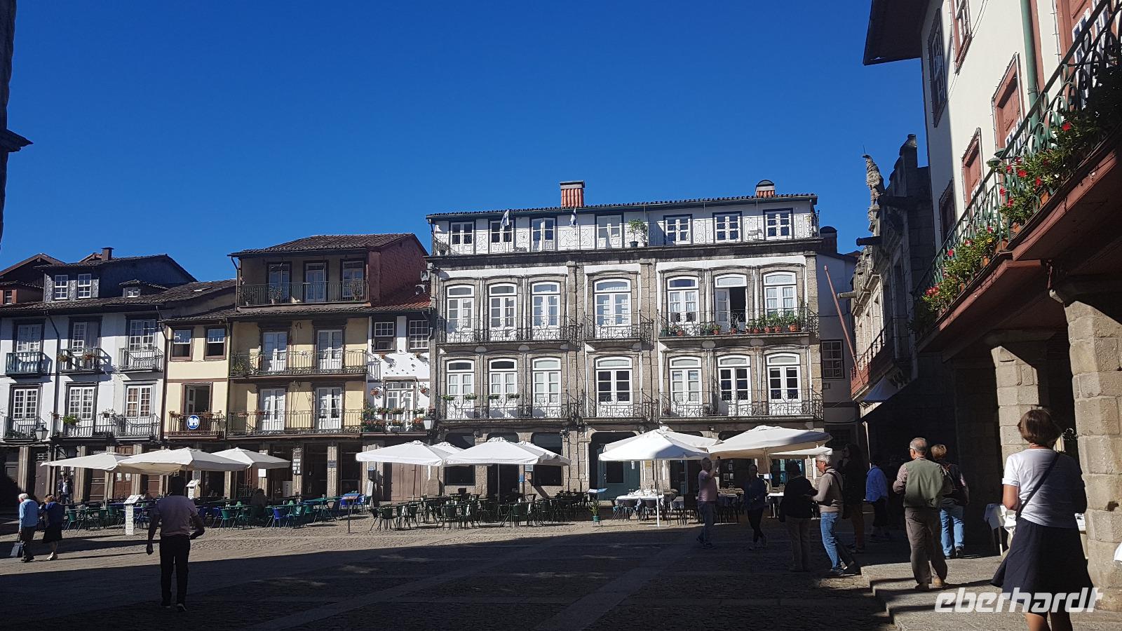 Heute fahren wir zur Wiege Portugals. Nach einem guten Frühstück starten wir Richtung Norden. Uns fallen die vielen Eukalyptusbäume auf und Maria erzählt, dass hier die Holzwirtschaft eine große Rolle spielt. Eukalyptusbäume wachsen sehr schnell, schon nach ca. 9 Jahren können sie "geerntet" und an die Papierindustrie verkauft werden. Das weckt Begehrlichkeiten, alle anderen Hölzer brauchen z.T. Generationen, bis sie Geld erwirtschaften. Aber Eukalyptus saugt den Boden aus, bei Waldbränden sorgen das Öl des Baumes und das dichte Unterholz für ein stetiges Wiederaufflammen der Feuer. Deshalb gibt es jetzt Vorgaben, wo diese Bäume noch wachsen dürfen. Dann erreichen wir Guimarães. Wir besuchen die alte romanische Burg. Sie sollte das Kloster beschützen, das die Gräfin Mumadona im 10. Jahrhundert hier errichten ließ. Hier wurde Alfonso Henriques geboren, der erste König Portugals. Deshalb gilt der Ort auch als Wiege Portugals und war seine erste Hauptstadt. Wir werfen noch einen Blick in die nahegelegene Kapelle in der Alfonso I. getauft wurde und spazieren dann hinunter in den Ort, teilweise auch auf dem Pilgerweg, die Jakobsmuschel weist im Boden darauf hin. Wir genießen den Spaziergang durch die Altstadt, übrigens auch Teil des Weltkulturerbes der UNESCO, die berühmte Rua de Santa Maria entlang bis zum Olivenbaumplatz. Hier trennen sich für kurze Zeit unsere Wege, wir nutzen die Zeit für individuelle Erkundungen, die Kirche mit dem Alpendre vor dem Westportal in ihrem manuelinischen Stil (ein besonderer Baustil benannt nach König Manuel I., erkennbar an den Schiffstauen und den runden statt spitzen Bögen der Gotik), die Läden und Gassen ringsumher... und nach dem einen oder anderen Kaffee oder Espresso verlassen wir die Altstadt, bestaunen die wundervoll angelegte Avenue davor.