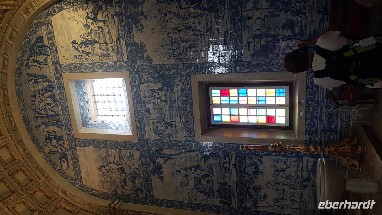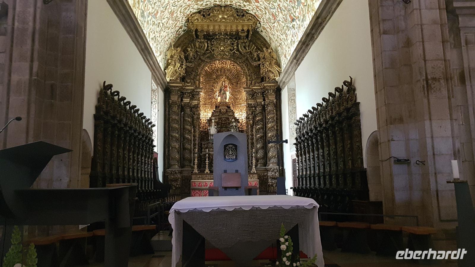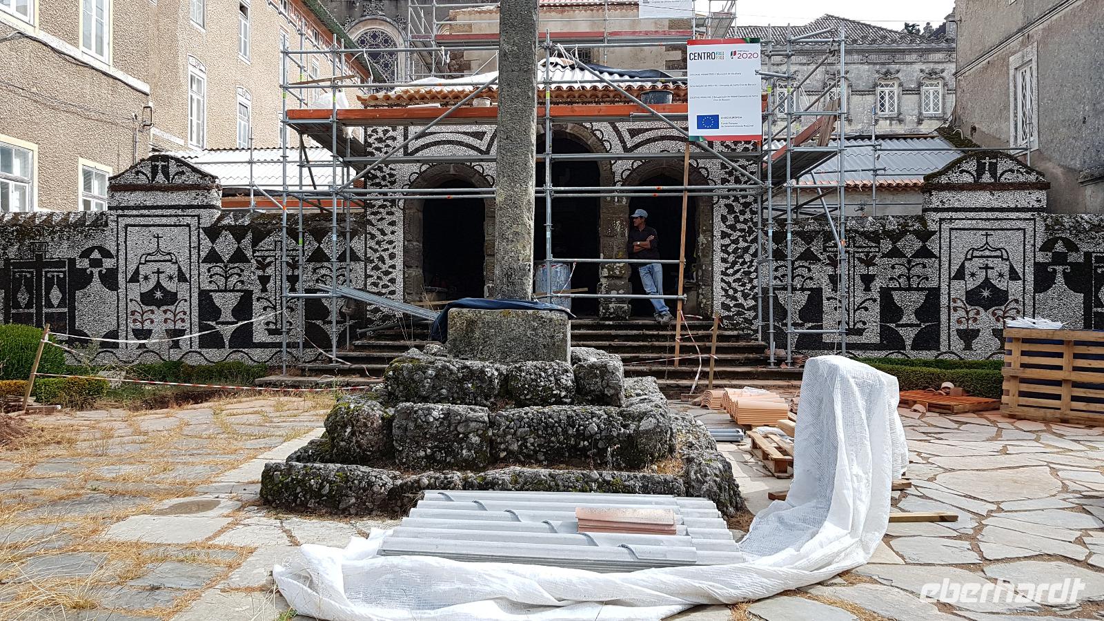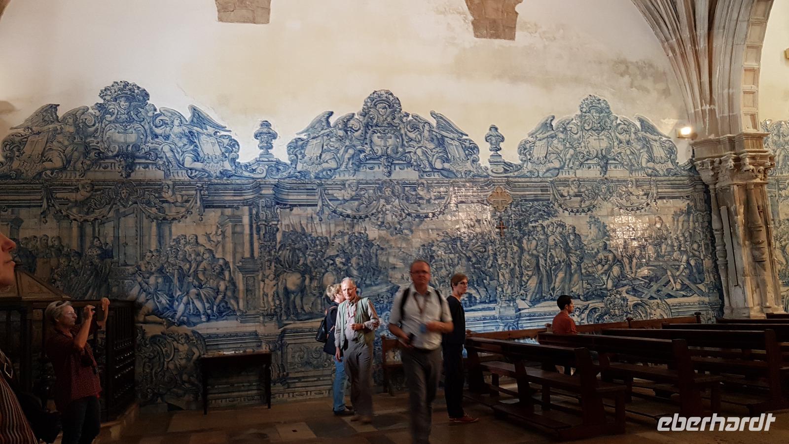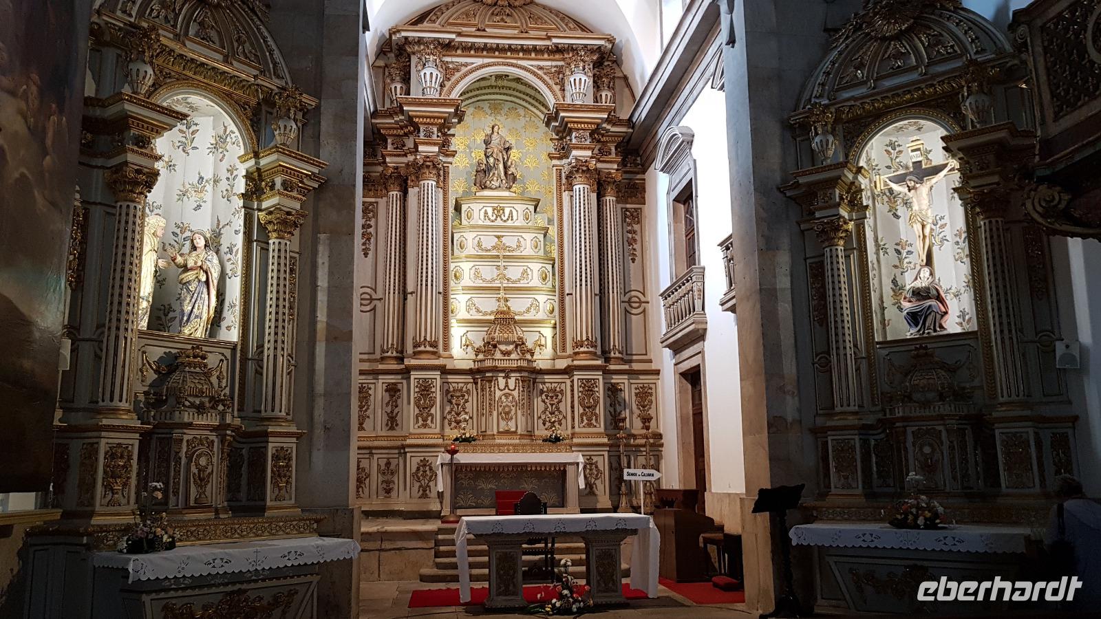 Die angekündigte Gewitterfront hat uns erreicht, auch heute Morgen regnet es munter weiter. Also frühstücken wir in Ruhe und bald schon klart es auf. Nur wenige Regenschauer begleiten unsere Fahrt nach Viseu und als wir ankommen kommt sogar schon einmal kurz die Sonne durch. Wir spazieren in die Altstadt, durch ein Stadttor, vorbei an der Marienkapelle zur Kathedrale. Stolz erhebt sich dieses mittelalterliche Bauwerk, unschwer zu erkennen die vielen An- und Umbauten. Trotzdem hat sie ihren romanischen Charakter bewahrt. Im Inneren empfängt uns ein Kreuzgang mit wunderschönen Azulejos, in der Kathedrale dann Gotik mit phantastischen Hochgewölben und teilweise auch manuelinischen Gestaltungen, bemerkenswert die riesigen Knoten der Schiffstaue an den Deckengewölben. Wer kann wirft einen Blick in die Sakristei, Azulejos an den Wänden weisen den Weg, er lohnt allemal, wundervoll bunt bemalte Decken und Wände voller Azulejos. Gleich gegenüber der Kathedrale steht die Kirche der Barmherzigkeit (Igreja da Misericordia), hier in Portugal eine gemeinnützige Einrichtung, die sich um Kranke, Alte und sozial Benachteiligte kümmert. Ihr Zeichen ist ein blaues Kreuz auf weißem Grund. Natürlich werfen wir auch hier einen Blick hinein- ein traumhaft schöner Altar! Dann spazieren wir durch die Gassen zurück und nach einer kleinen Espresso-Pause geht es weiter nach Bussaco. Unsere Fahrt führt uns an vielen Stellen vorbei, an denen deutlich Spuren vergangener Brände zu sehen waren und Maria erzählt uns, wie wichtig Brand-Vorsorge ist und wird.