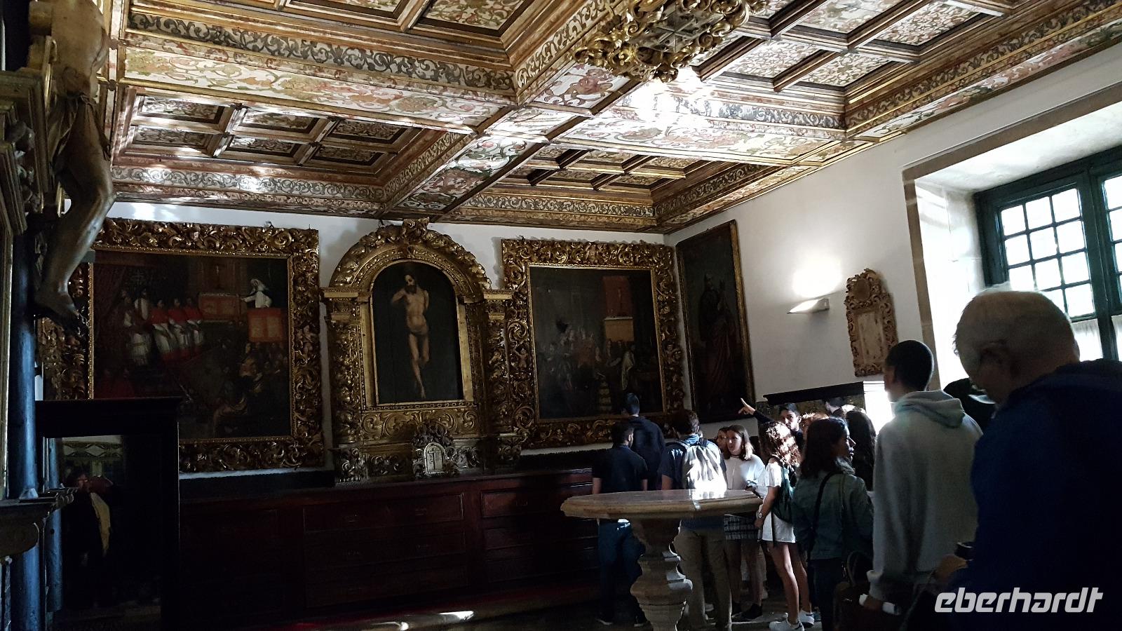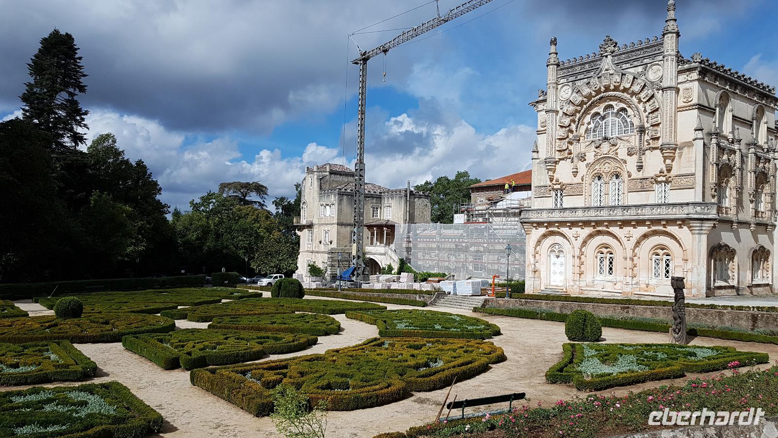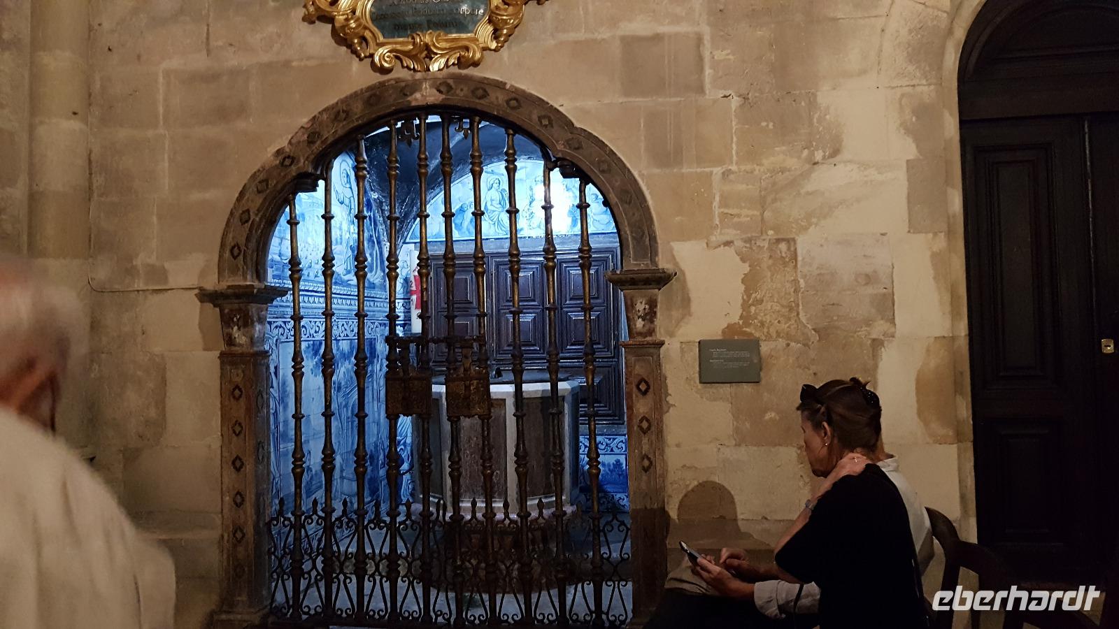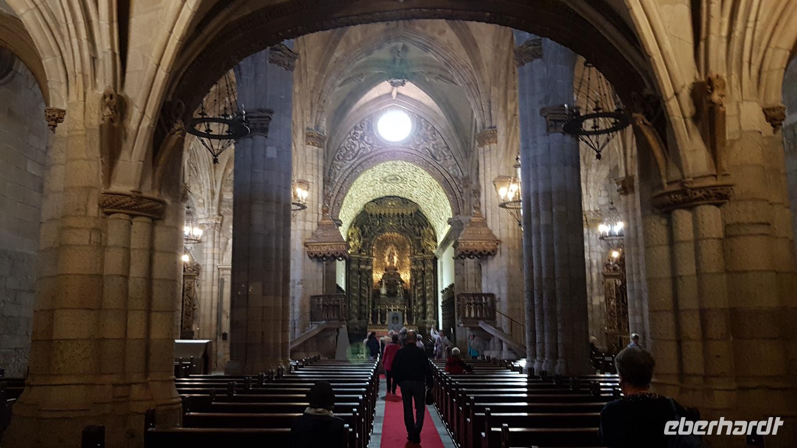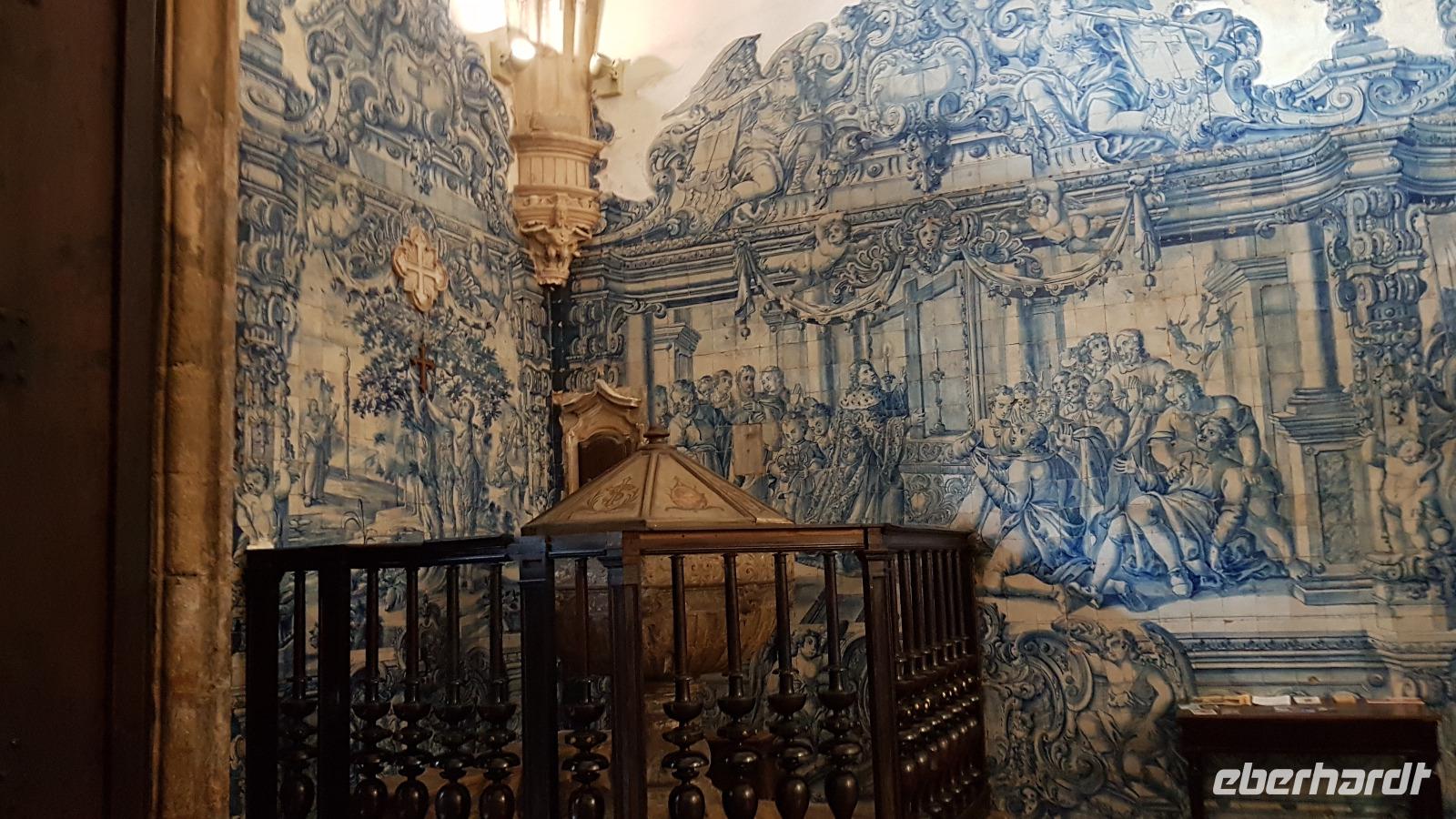 Die angekündigte Gewitterfront hat uns erreicht, auch heute Morgen regnet es munter weiter. Also frühstücken wir in Ruhe und bald schon klart es auf. Nur wenige Regenschauer begleiten unsere Fahrt nach Viseu und als wir ankommen kommt sogar schon einmal kurz die Sonne durch. Wir spazieren in die Altstadt, durch ein Stadttor, vorbei an der Marienkapelle zur Kathedrale. Stolz erhebt sich dieses mittelalterliche Bauwerk, unschwer zu erkennen die vielen An- und Umbauten. Trotzdem hat sie ihren romanischen Charakter bewahrt. Im Inneren empfängt uns ein Kreuzgang mit wunderschönen Azulejos, in der Kathedrale dann Gotik mit phantastischen Hochgewölben und teilweise auch manuelinischen Gestaltungen, bemerkenswert die riesigen Knoten der Schiffstaue an den Deckengewölben. Wer kann wirft einen Blick in die Sakristei, Azulejos an den Wänden weisen den Weg, er lohnt allemal, wundervoll bunt bemalte Decken und Wände voller Azulejos. Gleich gegenüber der Kathedrale steht die Kirche der Barmherzigkeit (Igreja da Misericordia), hier in Portugal eine gemeinnützige Einrichtung, die sich um Kranke, Alte und sozial Benachteiligte kümmert. Ihr Zeichen ist ein blaues Kreuz auf weißem Grund. Natürlich werfen wir auch hier einen Blick hinein- ein traumhaft schöner Altar! Dann spazieren wir durch die Gassen zurück und nach einer kleinen Espresso-Pause geht es weiter nach Bussaco. Unsere Fahrt führt uns an vielen Stellen vorbei, an denen deutlich Spuren vergangener Brände zu sehen waren und Maria erzählt uns, wie wichtig Brand-Vorsorge ist und wird.