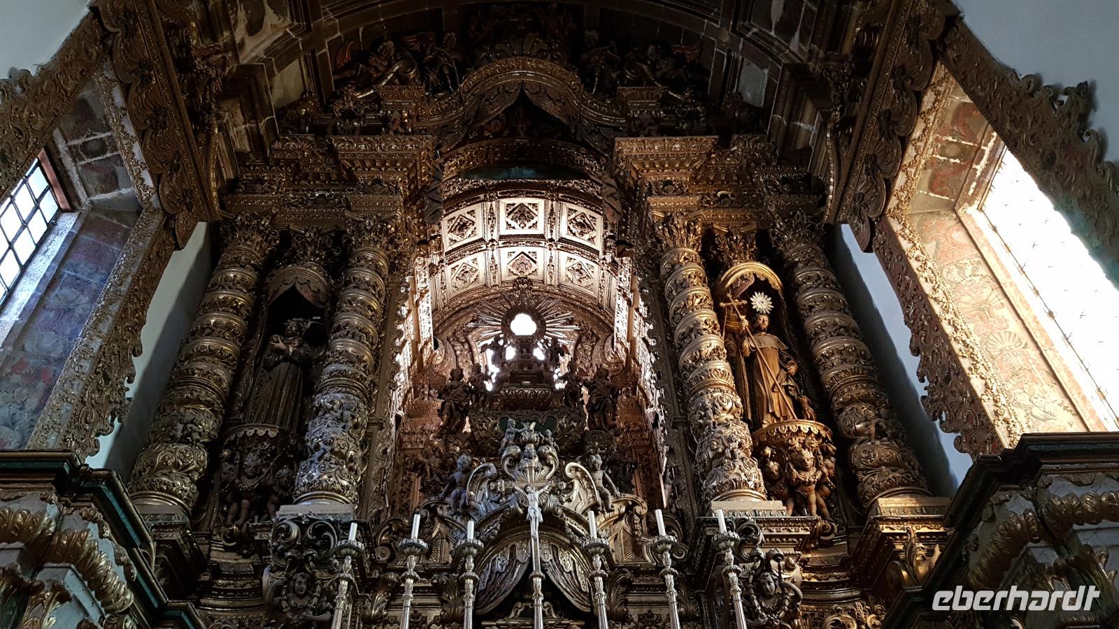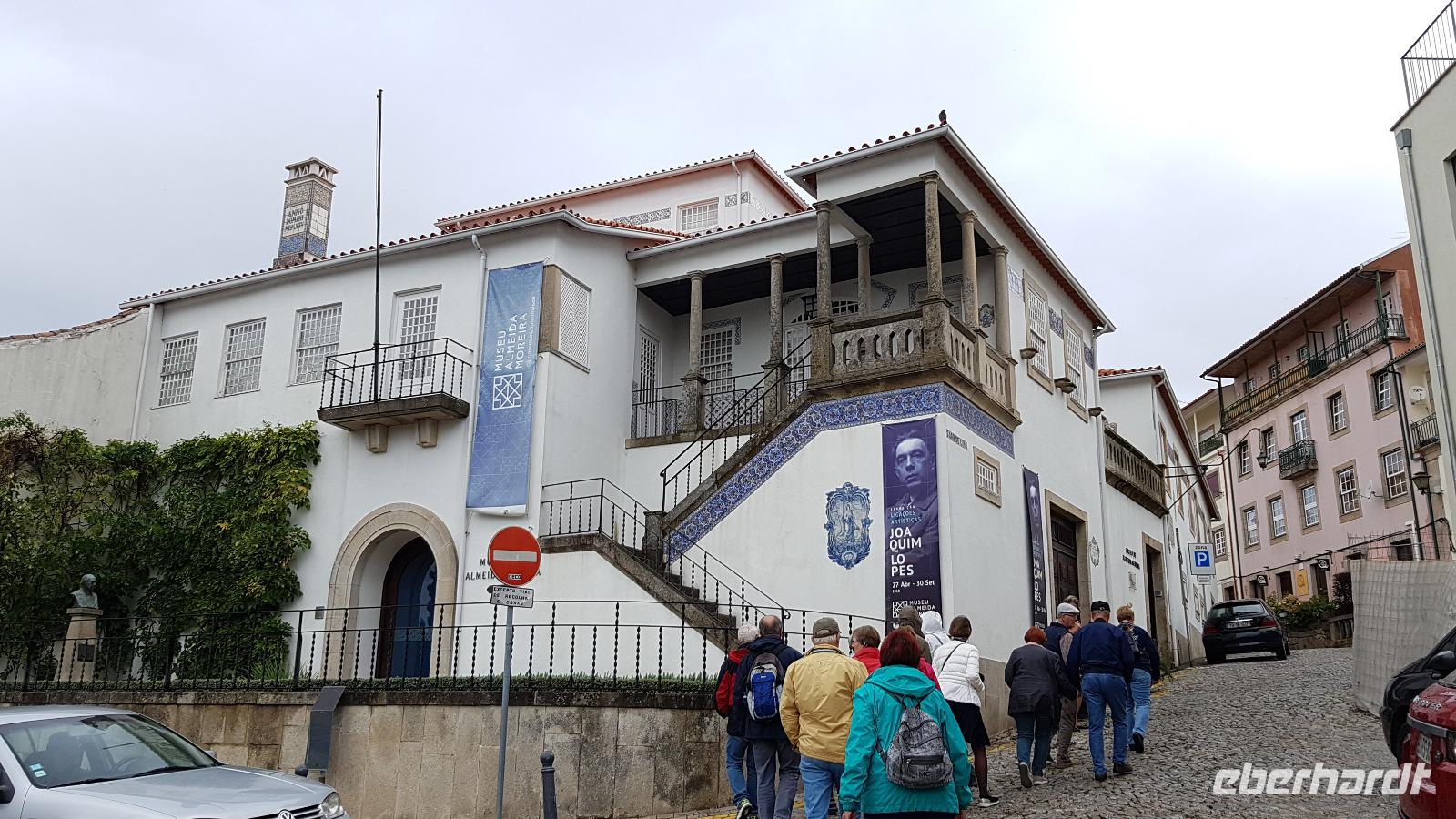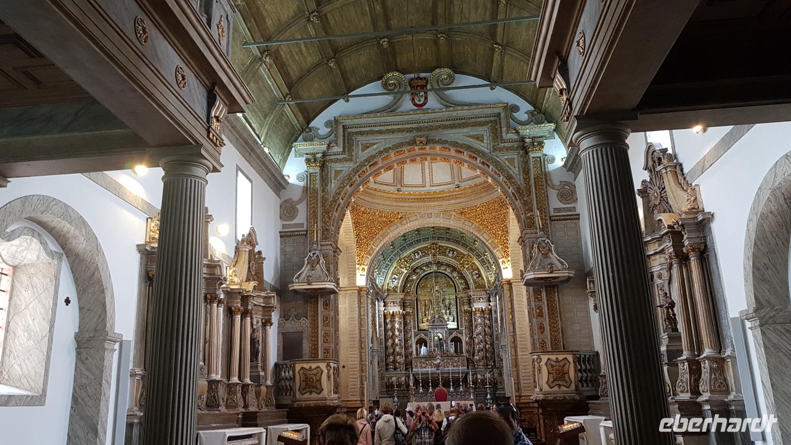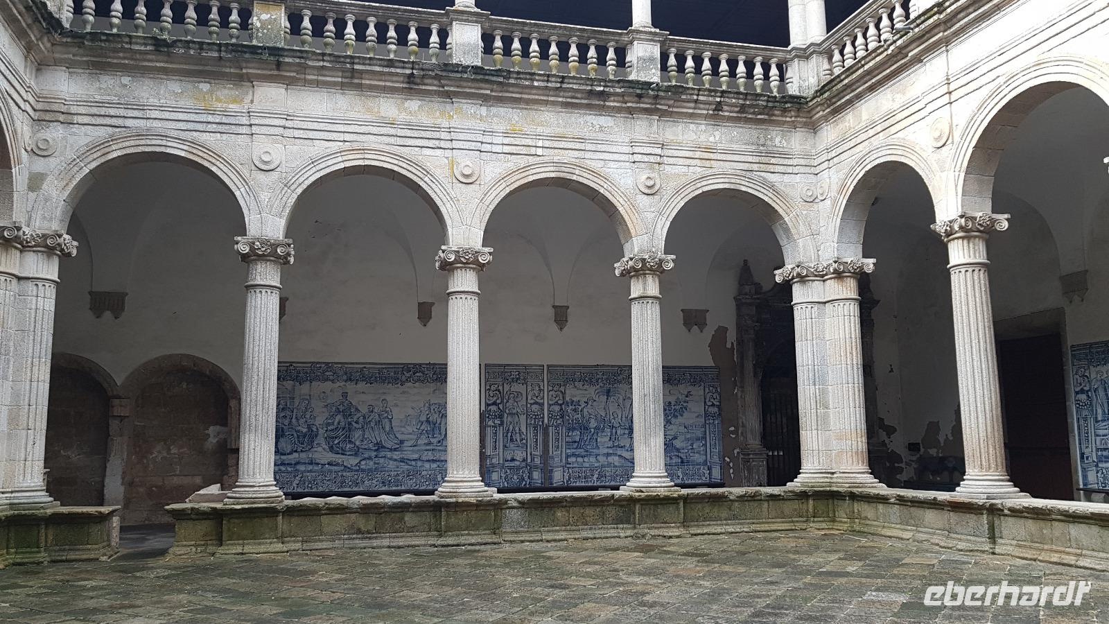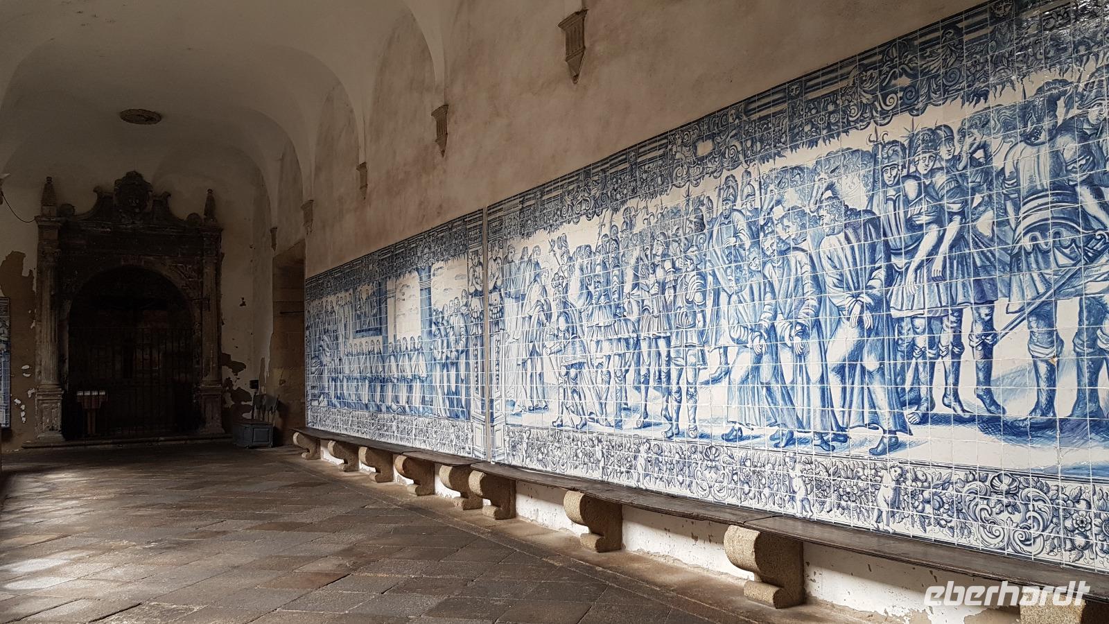 Die angekündigte Gewitterfront hat uns erreicht, auch heute Morgen regnet es munter weiter. Also frühstücken wir in Ruhe und bald schon klart es auf. Nur wenige Regenschauer begleiten unsere Fahrt nach Viseu und als wir ankommen kommt sogar schon einmal kurz die Sonne durch. Wir spazieren in die Altstadt, durch ein Stadttor, vorbei an der Marienkapelle zur Kathedrale. Stolz erhebt sich dieses mittelalterliche Bauwerk, unschwer zu erkennen die vielen An- und Umbauten. Trotzdem hat sie ihren romanischen Charakter bewahrt. Im Inneren empfängt uns ein Kreuzgang mit wunderschönen Azulejos, in der Kathedrale dann Gotik mit phantastischen Hochgewölben und teilweise auch manuelinischen Gestaltungen, bemerkenswert die riesigen Knoten der Schiffstaue an den Deckengewölben. Wer kann wirft einen Blick in die Sakristei, Azulejos an den Wänden weisen den Weg, er lohnt allemal, wundervoll bunt bemalte Decken und Wände voller Azulejos. Gleich gegenüber der Kathedrale steht die Kirche der Barmherzigkeit (Igreja da Misericordia), hier in Portugal eine gemeinnützige Einrichtung, die sich um Kranke, Alte und sozial Benachteiligte kümmert. Ihr Zeichen ist ein blaues Kreuz auf weißem Grund. Natürlich werfen wir auch hier einen Blick hinein- ein traumhaft schöner Altar! Dann spazieren wir durch die Gassen zurück und nach einer kleinen Espresso-Pause geht es weiter nach Bussaco. Unsere Fahrt führt uns an vielen Stellen vorbei, an denen deutlich Spuren vergangener Brände zu sehen waren und Maria erzählt uns, wie wichtig Brand-Vorsorge ist und wird.