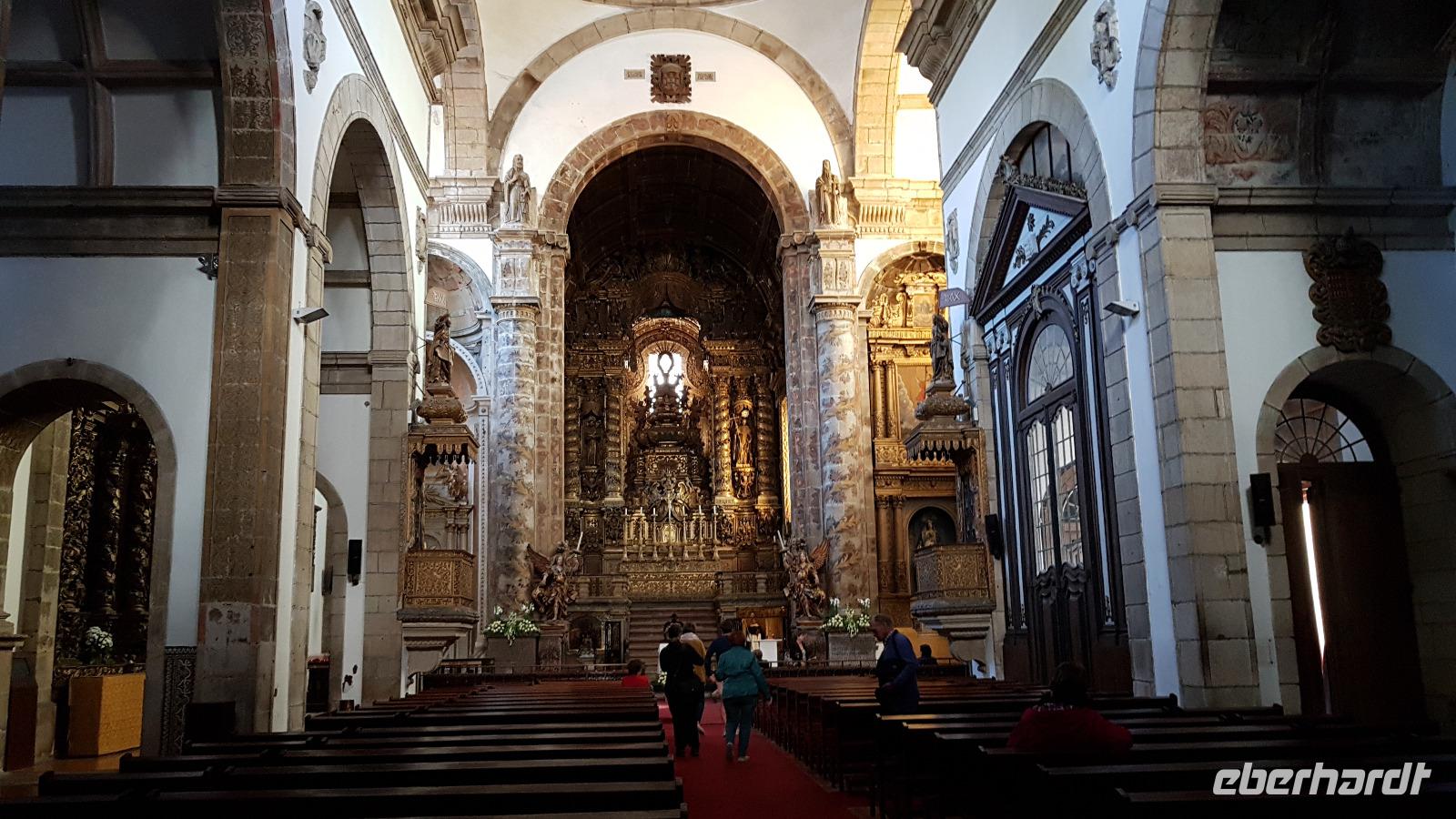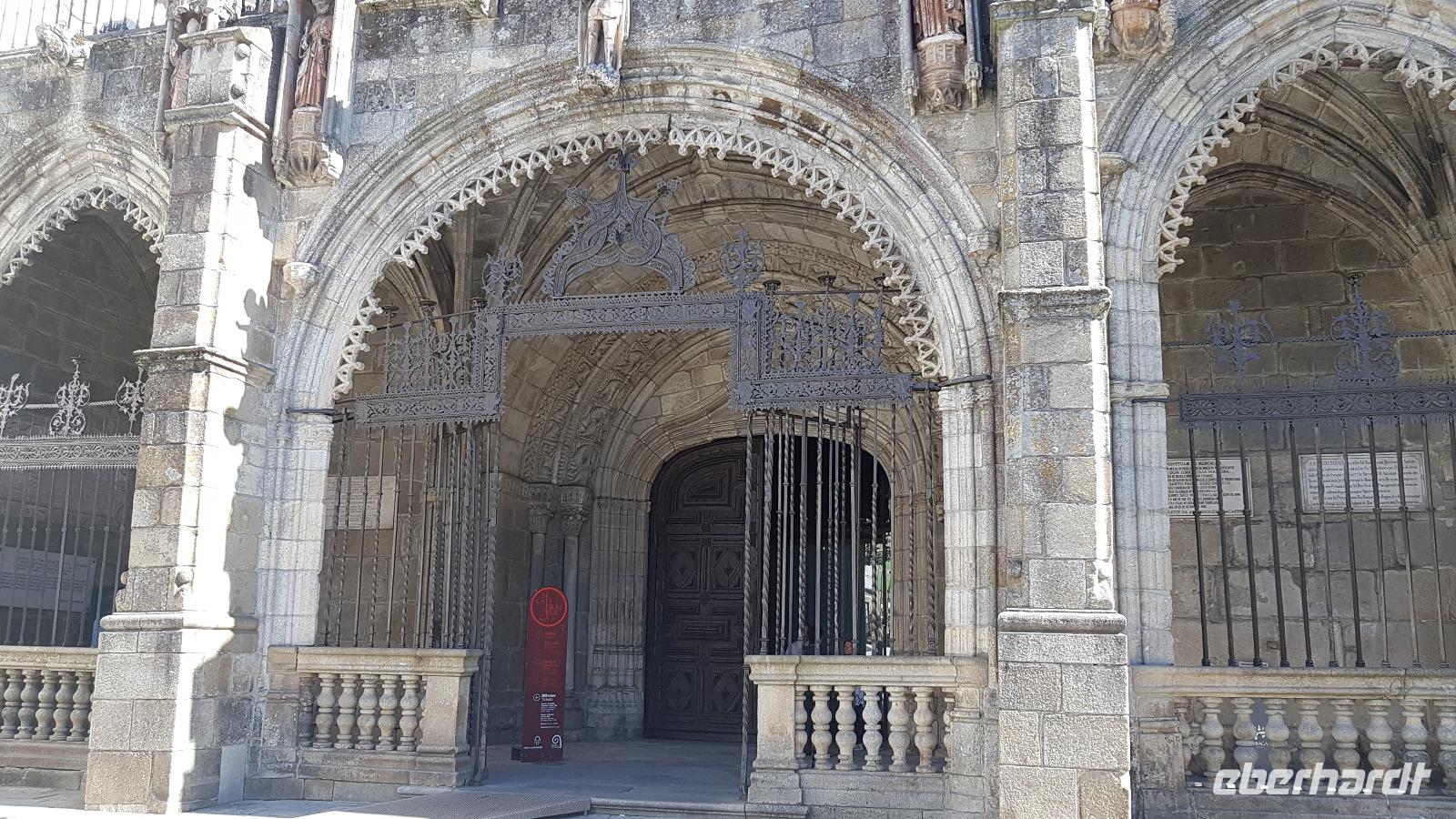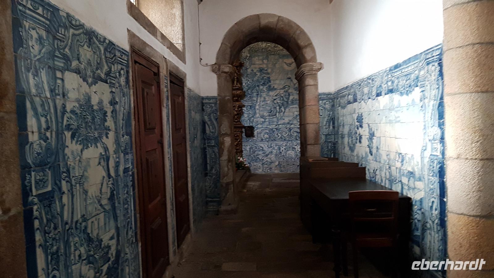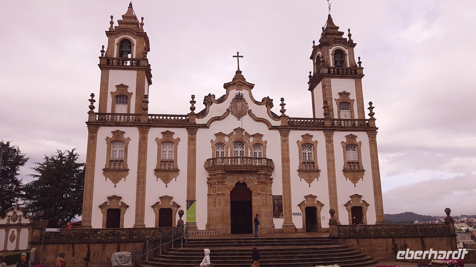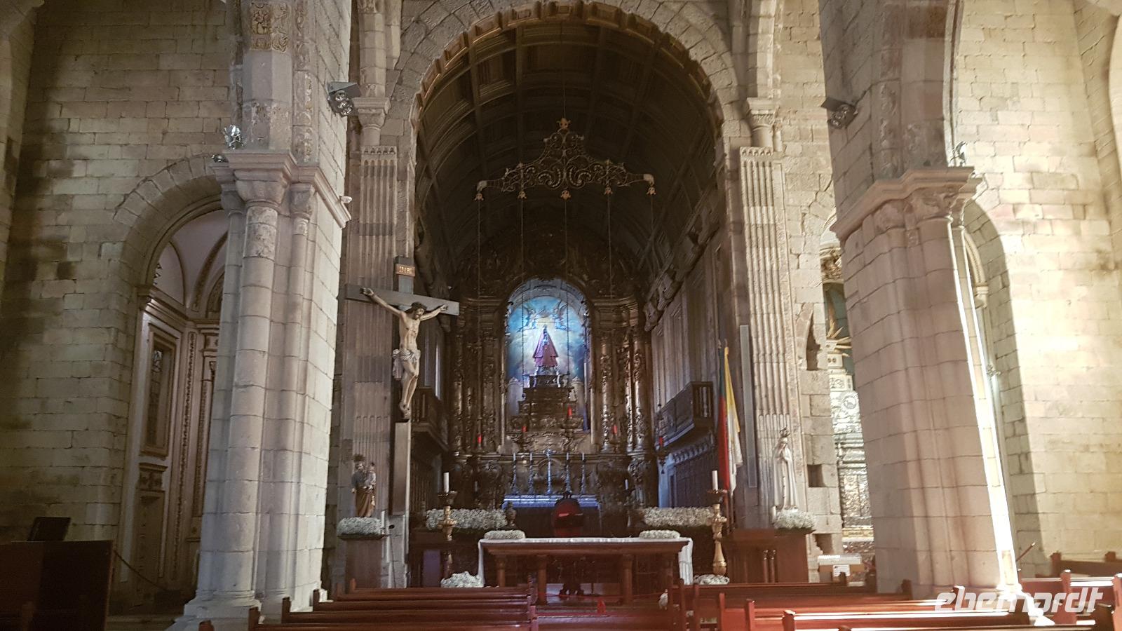 Die angekündigte Gewitterfront hat uns erreicht, auch heute Morgen regnet es munter weiter. Also frühstücken wir in Ruhe und bald schon klart es auf. Nur wenige Regenschauer begleiten unsere Fahrt nach Viseu und als wir ankommen kommt sogar schon einmal kurz die Sonne durch. Wir spazieren in die Altstadt, durch ein Stadttor, vorbei an der Marienkapelle zur Kathedrale. Stolz erhebt sich dieses mittelalterliche Bauwerk, unschwer zu erkennen die vielen An- und Umbauten. Trotzdem hat sie ihren romanischen Charakter bewahrt. Im Inneren empfängt uns ein Kreuzgang mit wunderschönen Azulejos, in der Kathedrale dann Gotik mit phantastischen Hochgewölben und teilweise auch manuelinischen Gestaltungen, bemerkenswert die riesigen Knoten der Schiffstaue an den Deckengewölben. Wer kann wirft einen Blick in die Sakristei, Azulejos an den Wänden weisen den Weg, er lohnt allemal, wundervoll bunt bemalte Decken und Wände voller Azulejos. Gleich gegenüber der Kathedrale steht die Kirche der Barmherzigkeit (Igreja da Misericordia), hier in Portugal eine gemeinnützige Einrichtung, die sich um Kranke, Alte und sozial Benachteiligte kümmert. Ihr Zeichen ist ein blaues Kreuz auf weißem Grund. Natürlich werfen wir auch hier einen Blick hinein- ein traumhaft schöner Altar! Dann spazieren wir durch die Gassen zurück und nach einer kleinen Espresso-Pause geht es weiter nach Bussaco. Unsere Fahrt führt uns an vielen Stellen vorbei, an denen deutlich Spuren vergangener Brände zu sehen waren und Maria erzählt uns, wie wichtig Brand-Vorsorge ist und wird.