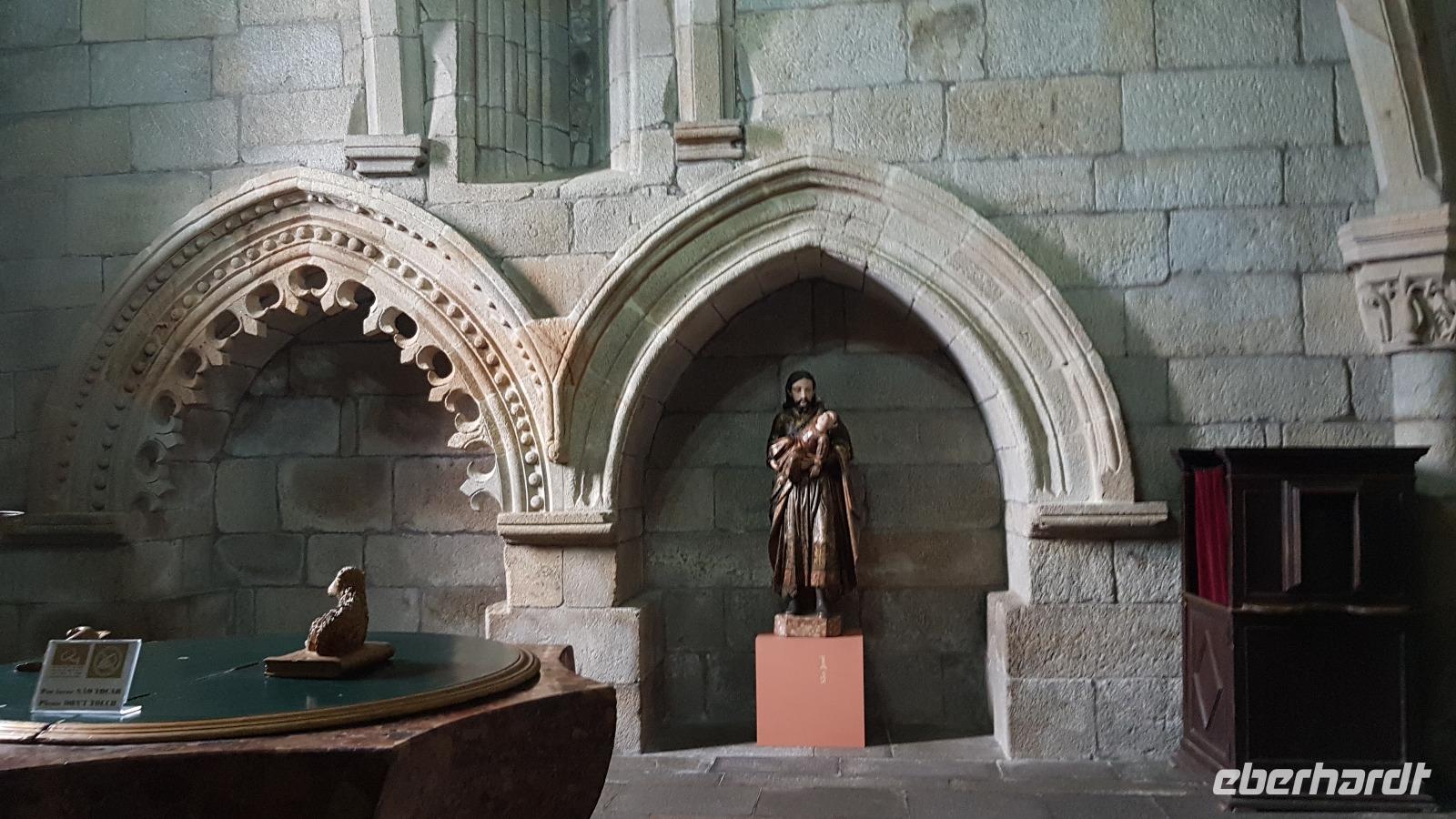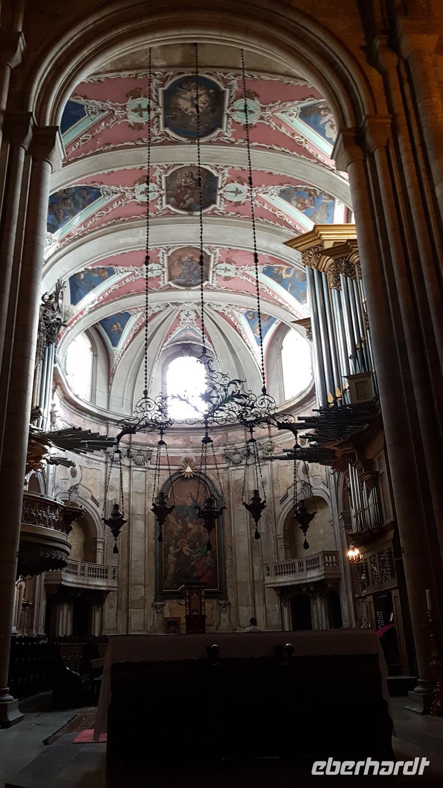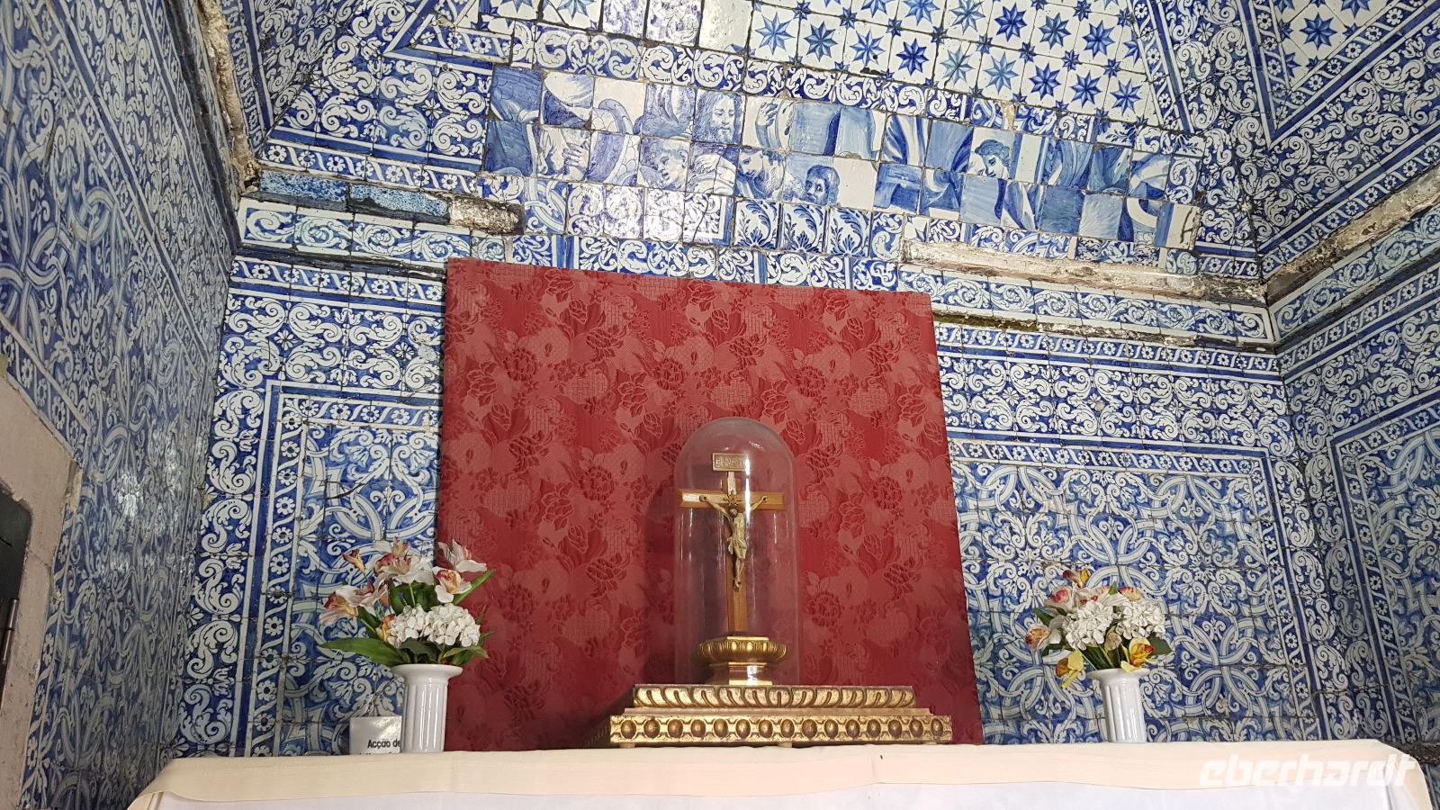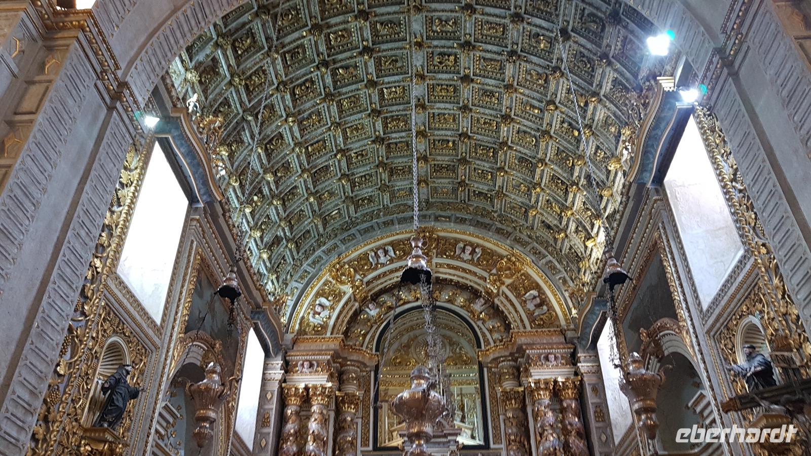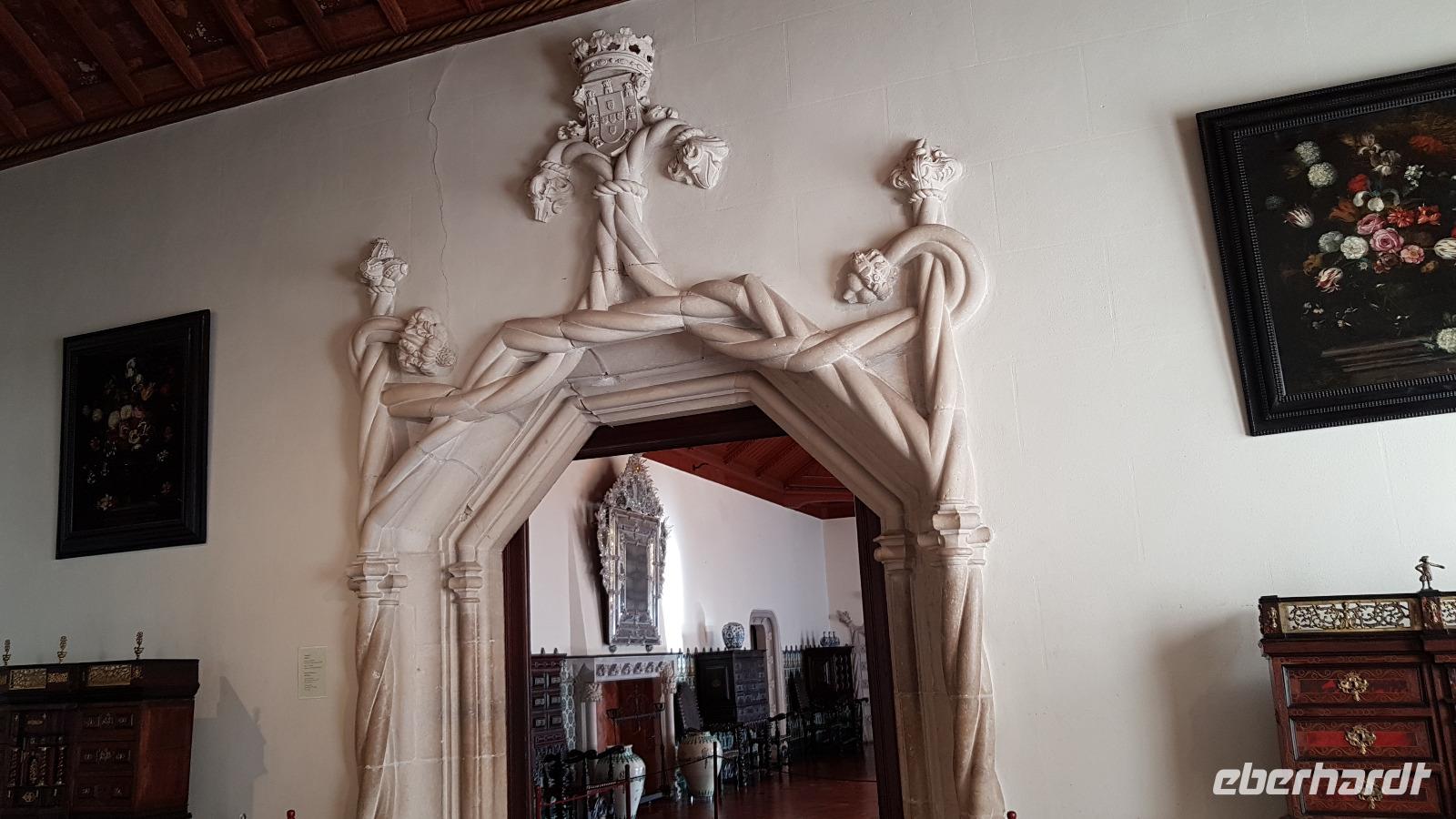 Die angekündigte Gewitterfront hat uns erreicht, auch heute Morgen regnet es munter weiter. Also frühstücken wir in Ruhe und bald schon klart es auf. Nur wenige Regenschauer begleiten unsere Fahrt nach Viseu und als wir ankommen kommt sogar schon einmal kurz die Sonne durch. Wir spazieren in die Altstadt, durch ein Stadttor, vorbei an der Marienkapelle zur Kathedrale. Stolz erhebt sich dieses mittelalterliche Bauwerk, unschwer zu erkennen die vielen An- und Umbauten. Trotzdem hat sie ihren romanischen Charakter bewahrt. Im Inneren empfängt uns ein Kreuzgang mit wunderschönen Azulejos, in der Kathedrale dann Gotik mit phantastischen Hochgewölben und teilweise auch manuelinischen Gestaltungen, bemerkenswert die riesigen Knoten der Schiffstaue an den Deckengewölben. Wer kann wirft einen Blick in die Sakristei, Azulejos an den Wänden weisen den Weg, er lohnt allemal, wundervoll bunt bemalte Decken und Wände voller Azulejos. Gleich gegenüber der Kathedrale steht die Kirche der Barmherzigkeit (Igreja da Misericordia), hier in Portugal eine gemeinnützige Einrichtung, die sich um Kranke, Alte und sozial Benachteiligte kümmert. Ihr Zeichen ist ein blaues Kreuz auf weißem Grund. Natürlich werfen wir auch hier einen Blick hinein- ein traumhaft schöner Altar! Dann spazieren wir durch die Gassen zurück und nach einer kleinen Espresso-Pause geht es weiter nach Bussaco. Unsere Fahrt führt uns an vielen Stellen vorbei, an denen deutlich Spuren vergangener Brände zu sehen waren und Maria erzählt uns, wie wichtig Brand-Vorsorge ist und wird.