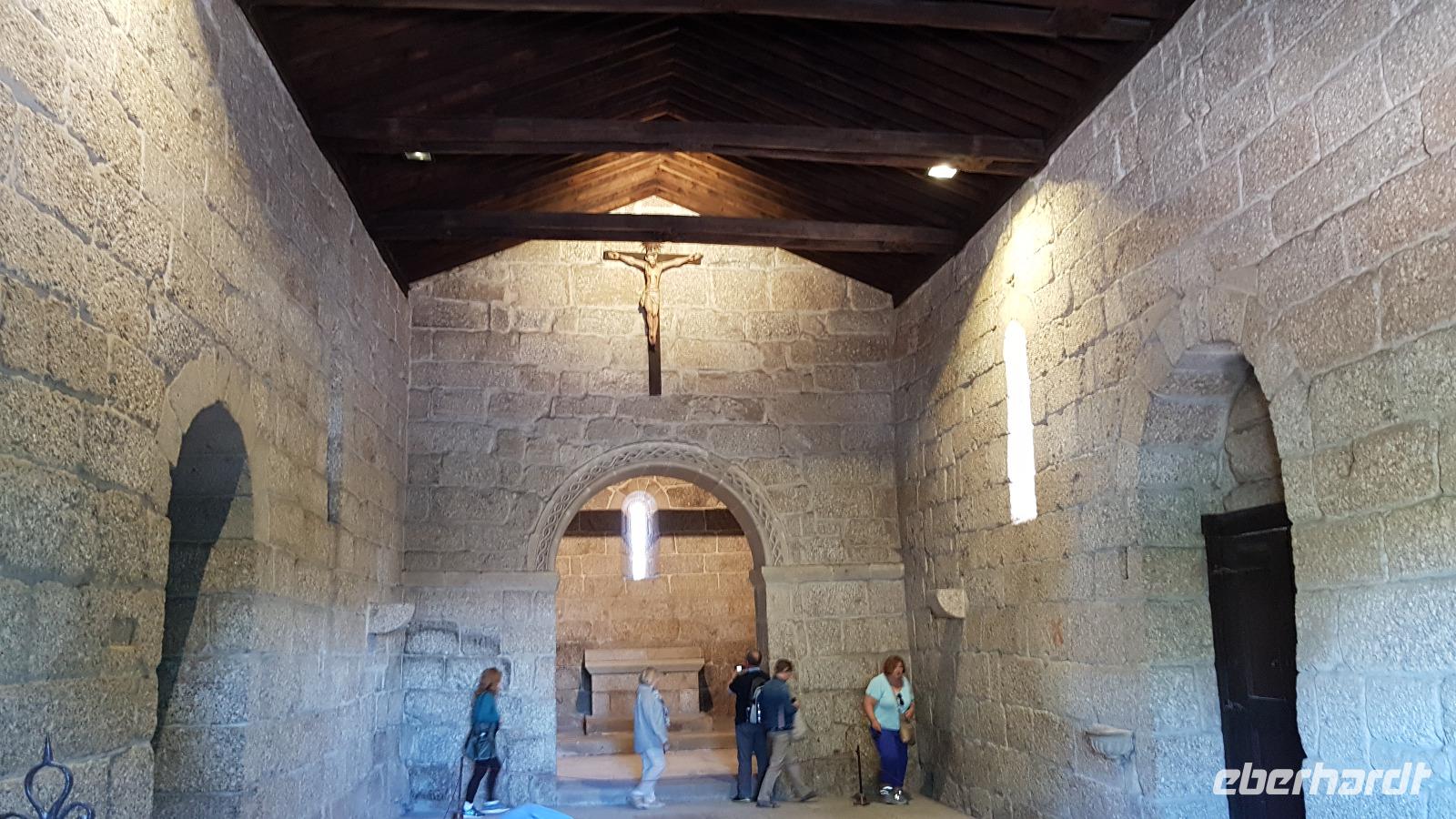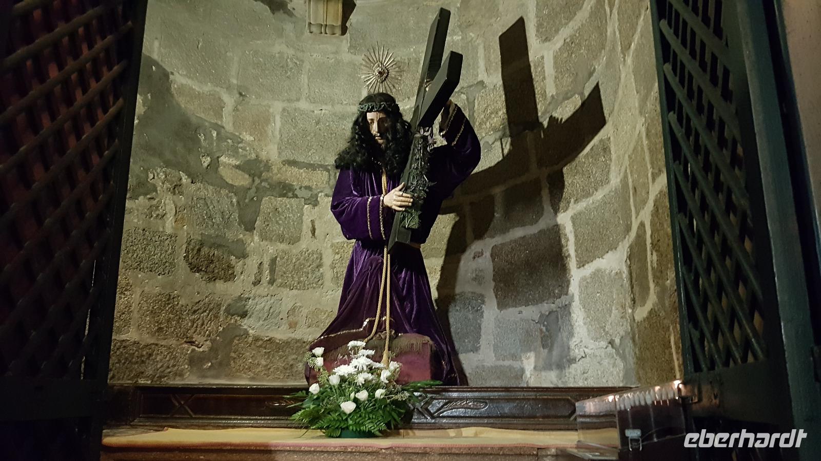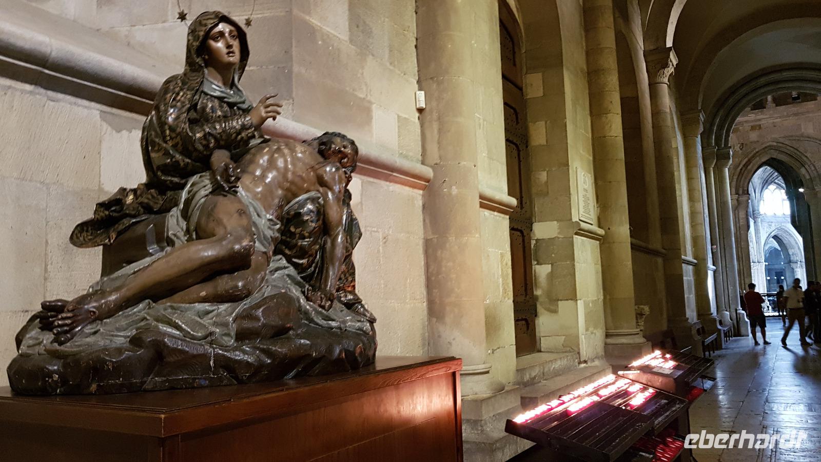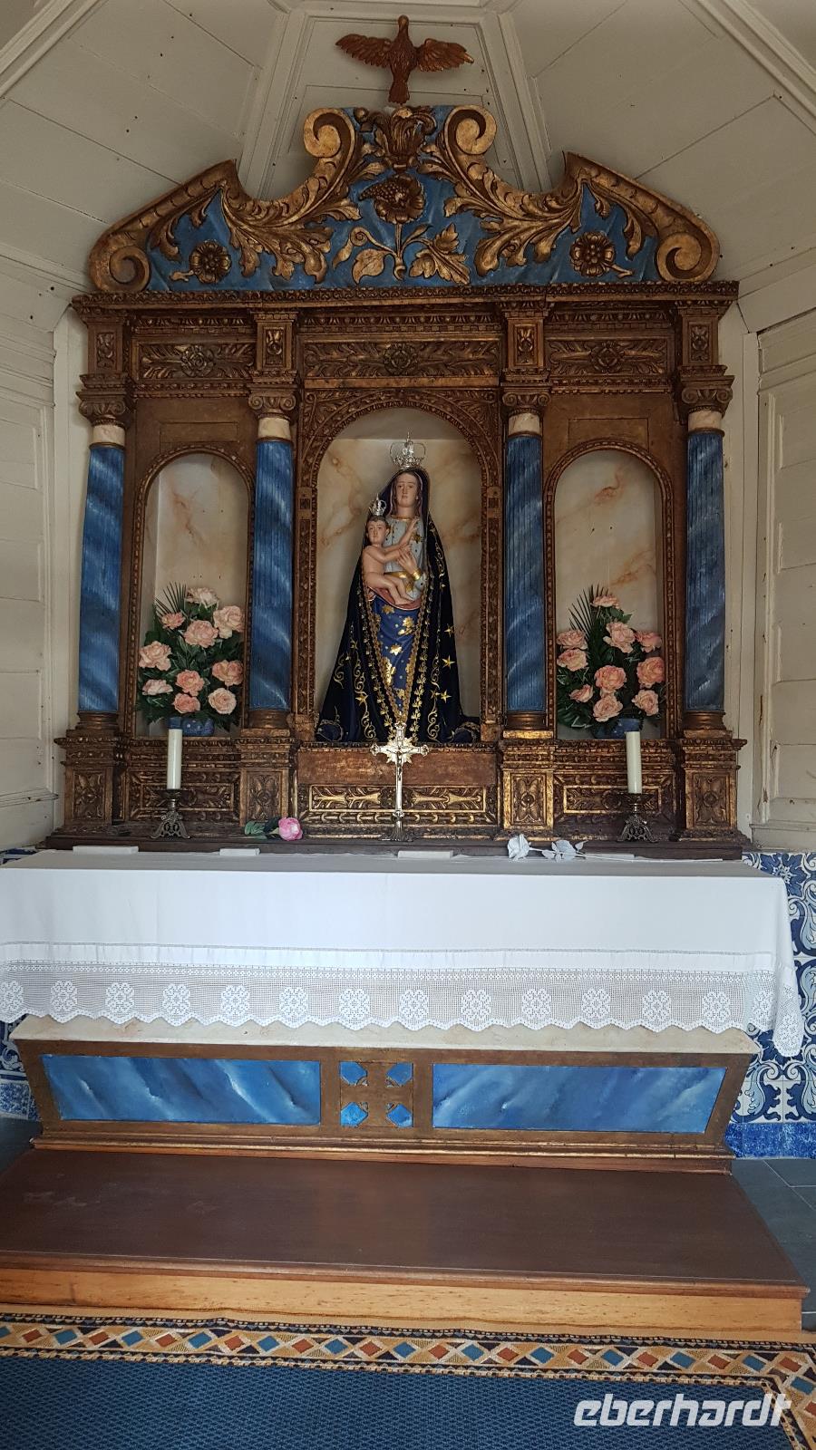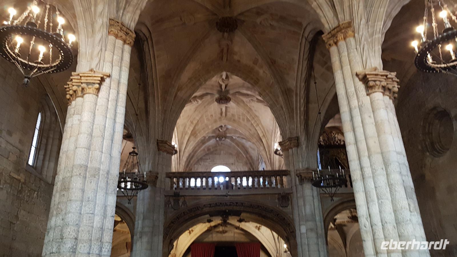Die angekündigte Gewitterfront hat uns erreicht, auch heute Morgen regnet es munter weiter. Also frühstücken wir in Ruhe und bald schon klart es auf. Nur wenige Regenschauer begleiten unsere Fahrt nach Viseu und als wir ankommen kommt sogar schon einmal kurz die Sonne durch. Wir spazieren in die Altstadt, durch ein Stadttor, vorbei an der Marienkapelle zur Kathedrale. Stolz erhebt sich dieses mittelalterliche Bauwerk, unschwer zu erkennen die vielen An- und Umbauten. Trotzdem hat sie ihren romanischen Charakter bewahrt. Im Inneren empfängt uns ein Kreuzgang mit wunderschönen Azulejos, in der Kathedrale dann Gotik mit phantastischen Hochgewölben und teilweise auch manuelinischen Gestaltungen, bemerkenswert die riesigen Knoten der Schiffstaue an den Deckengewölben. Wer kann wirft einen Blick in die Sakristei, Azulejos an den Wänden weisen den Weg, er lohnt allemal, wundervoll bunt bemalte Decken und Wände voller Azulejos. Gleich gegenüber der Kathedrale steht die Kirche der Barmherzigkeit (Igreja da Misericordia), hier in Portugal eine gemeinnützige Einrichtung, die sich um Kranke, Alte und sozial Benachteiligte kümmert. Ihr Zeichen ist ein blaues Kreuz auf weißem Grund. Natürlich werfen wir auch hier einen Blick hinein- ein traumhaft schöner Altar! Dann spazieren wir durch die Gassen zurück und nach einer kleinen Espresso-Pause geht es weiter nach Bussaco. Unsere Fahrt führt uns an vielen Stellen vorbei, an denen deutlich Spuren vergangener Brände zu sehen waren und Maria erzählt uns, wie wichtig Brand-Vorsorge ist und wird.