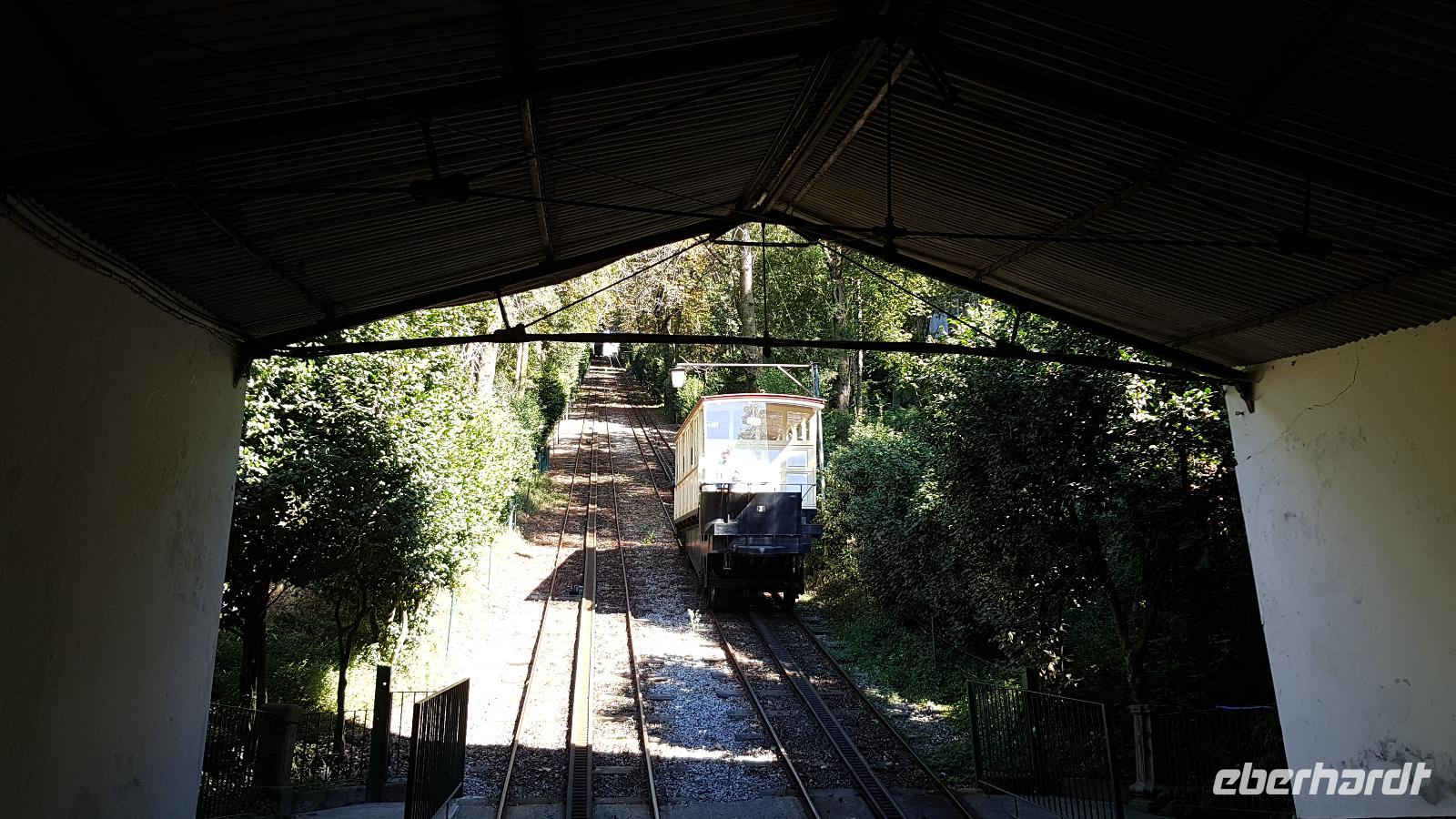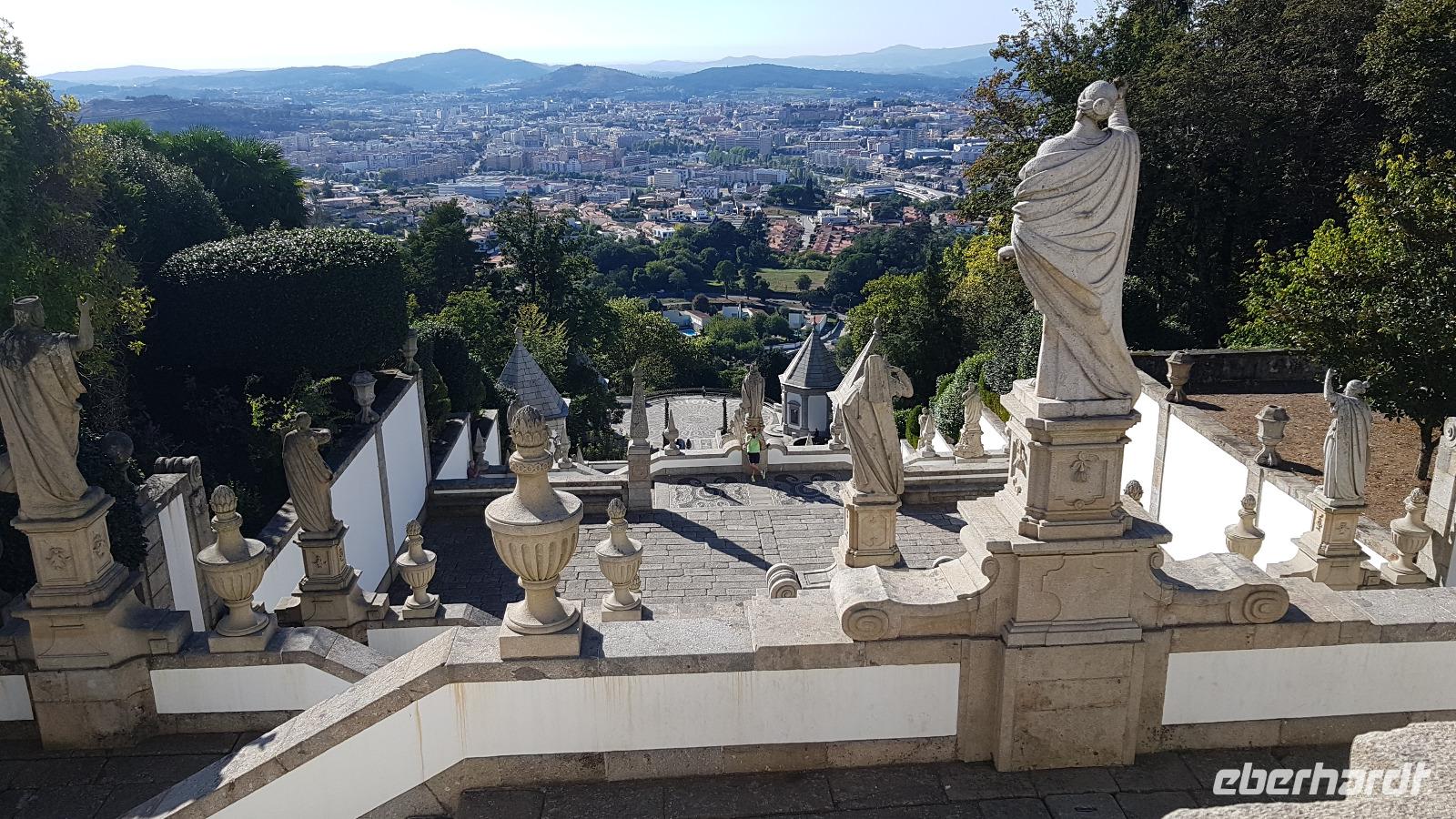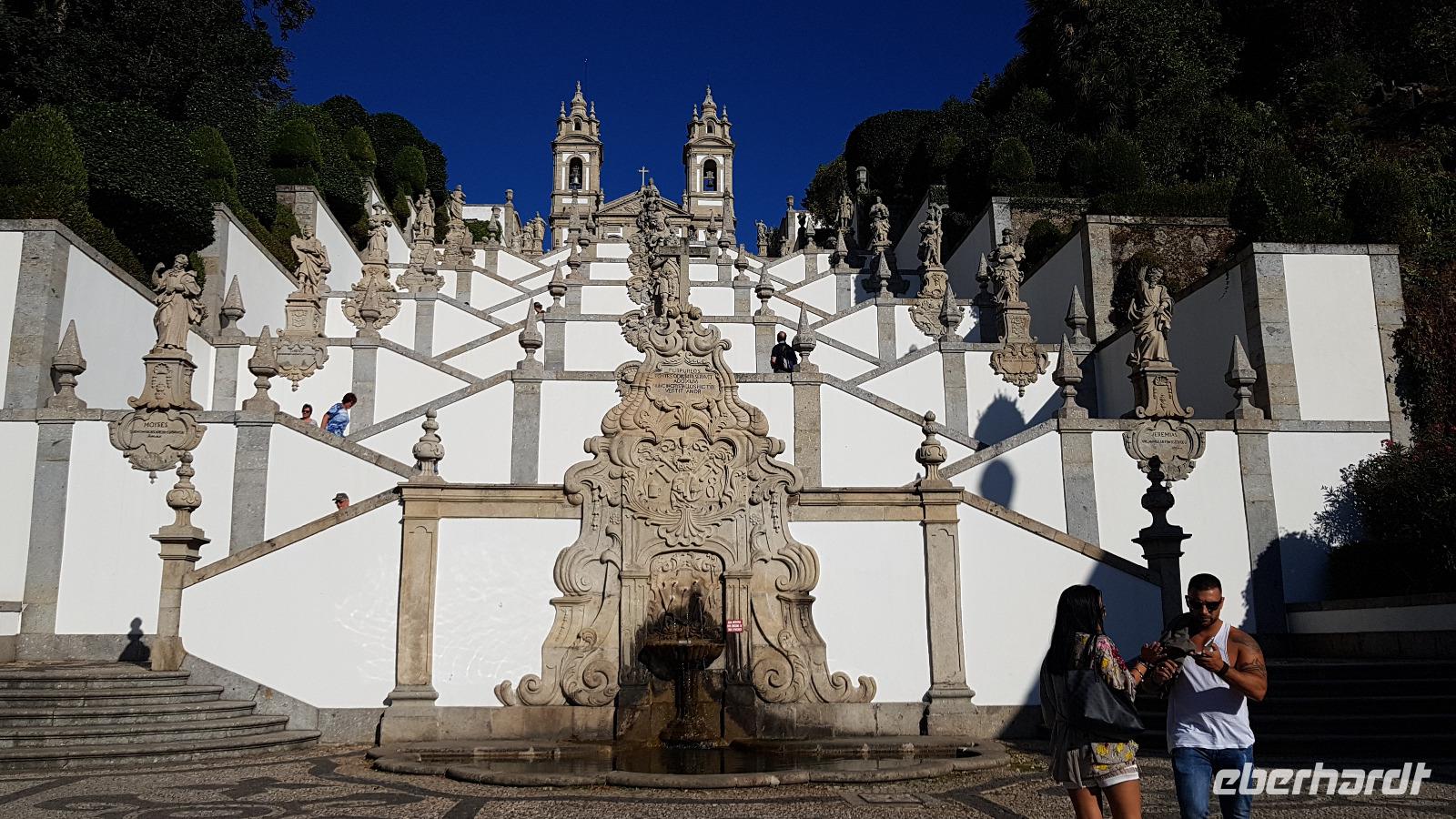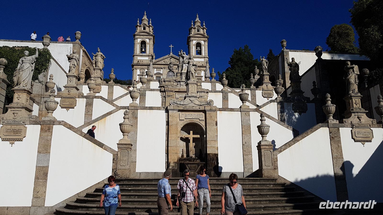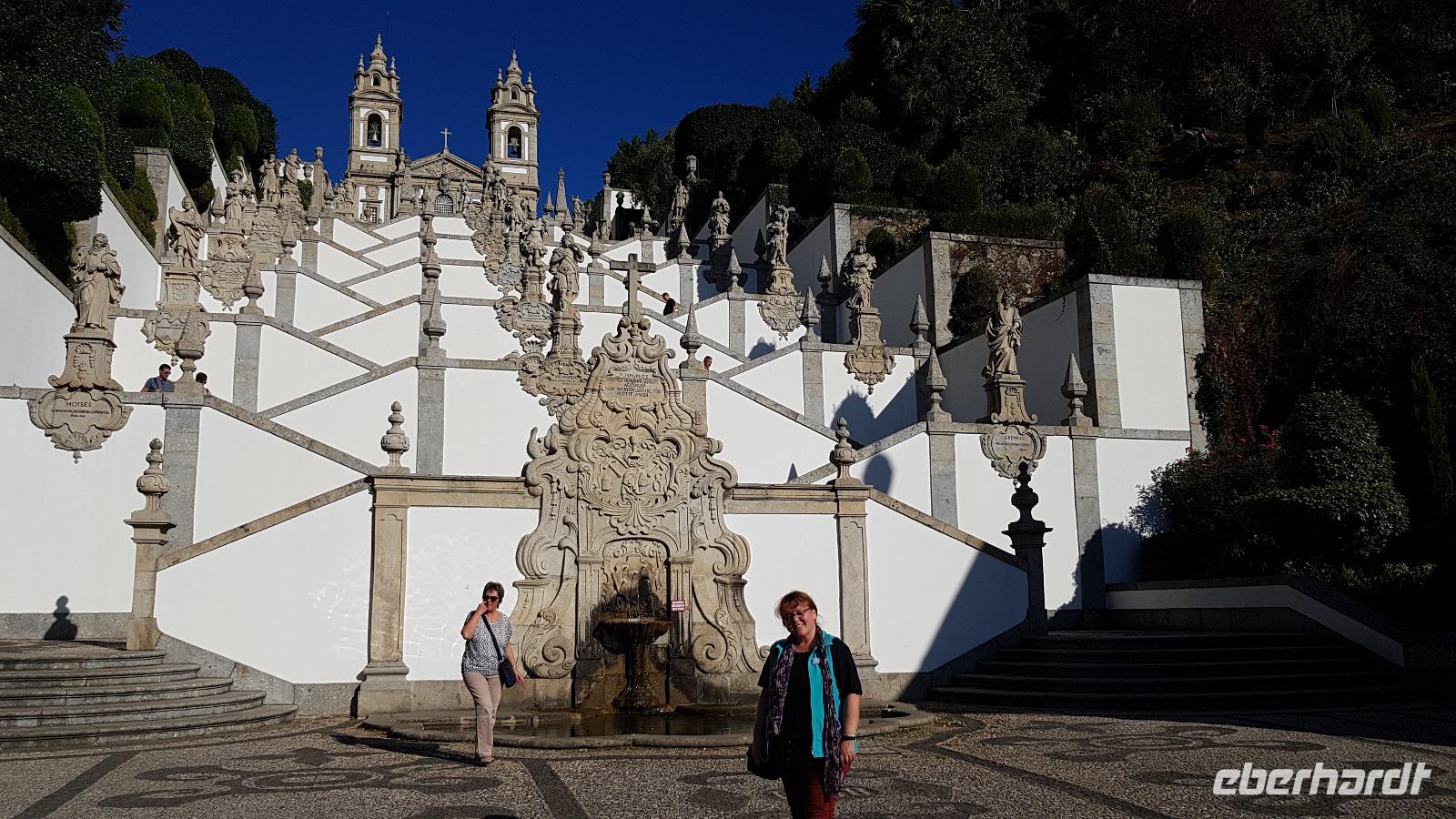 Hatten wir Braga bereits als religiöses Zentrum kennengelernt so fuhren wir nun zu seinem absoluten Höhepunkt: Bom Jesus, zum „Guten Jesus vom Berge". Alvaro fuhr uns bis zur Seilbahn, einer einzigartigen Wasserballastbahn. (die älteste funktionierende der Welt, die allein mit Wasserkraft läuft) Wer wollte fuhr mit ihr nach oben, alternativ liefen auch einige die 581 Stufen hinauf. Wir bewältigten mit der Bahn die 116 Meter Höhenunterschied in 3 Minuten, oben angekommen genossen wir eine phantastische Aussicht. Da kamen auch schon unsere Treppensteiger- das hatten sie super gemeistert. Maria erzählte uns, dass es ein Pilgerweg war, der von 17 Stationen unterbrochen wird, dem Leidensweg Christi, den fünf Sinnen und den christlichen Tugenden. Wasserspiele, Springbrunnen und Statuen begleiten den Pilger. Dann machten wir uns auf den Weg nach unten, liefen die ausschweifenden Barocktreppen hinab und hielten auf jeder Ebene um hinaufzuschauen. Auf der untersten vor der Waldebene bot sich uns ein überragender Blick hinauf zur Kirche. Den werden wir so schnell nicht vergessen. Auf der Rückfahrt zum Hotel dann ließ jeder für sich die Bilder dieses Tages Revue passieren und es war wieder ein einhelliger Tenor: was für ein wunderbarer Tag! Den beschlossen wir dann in unserem „Sei La!!" mit einem guten Abendessen und dann hieß es Koffer packen- morgen reisen wir ins Landesinnere.