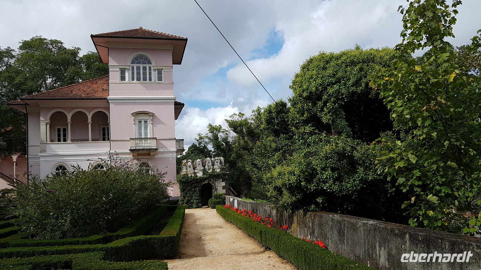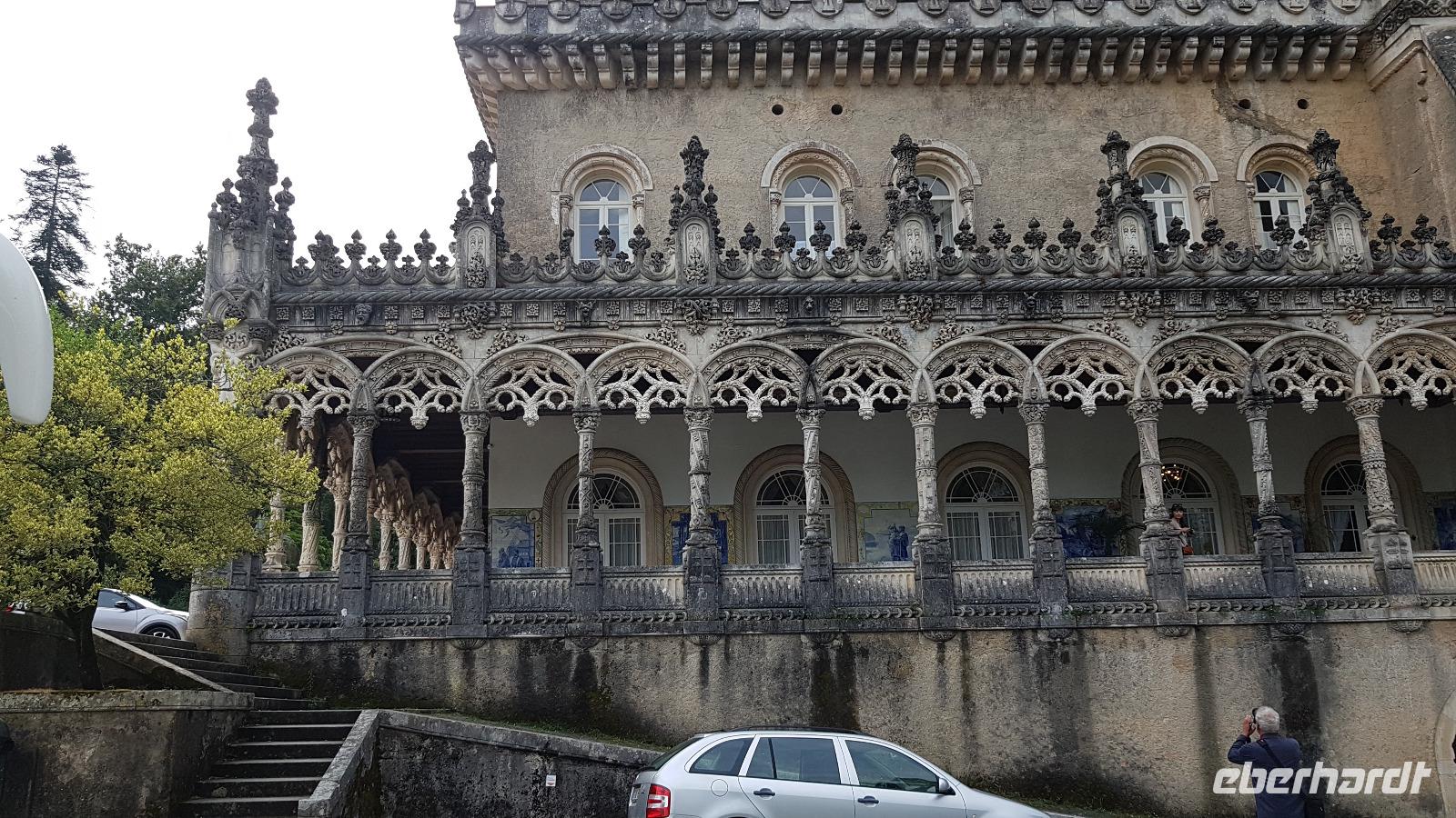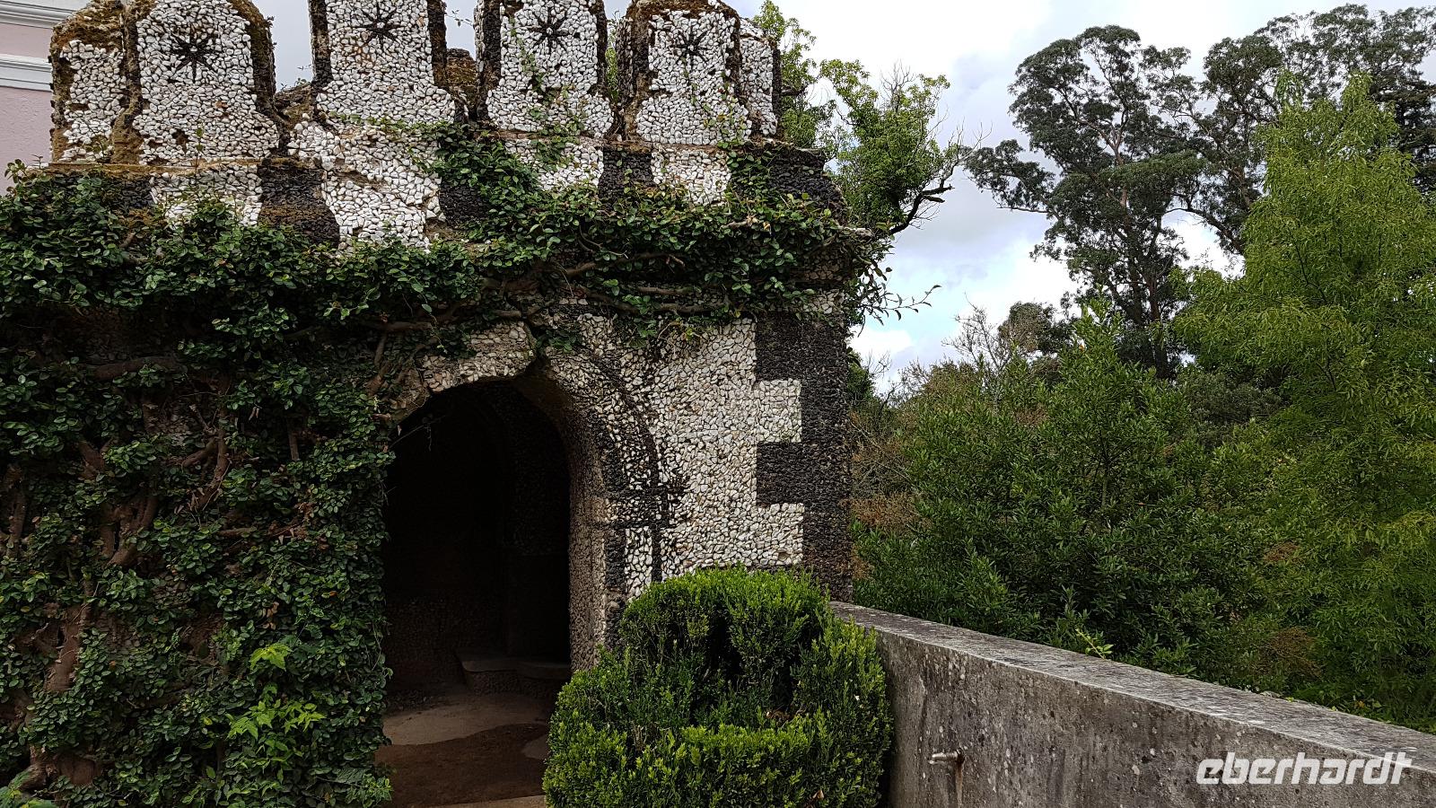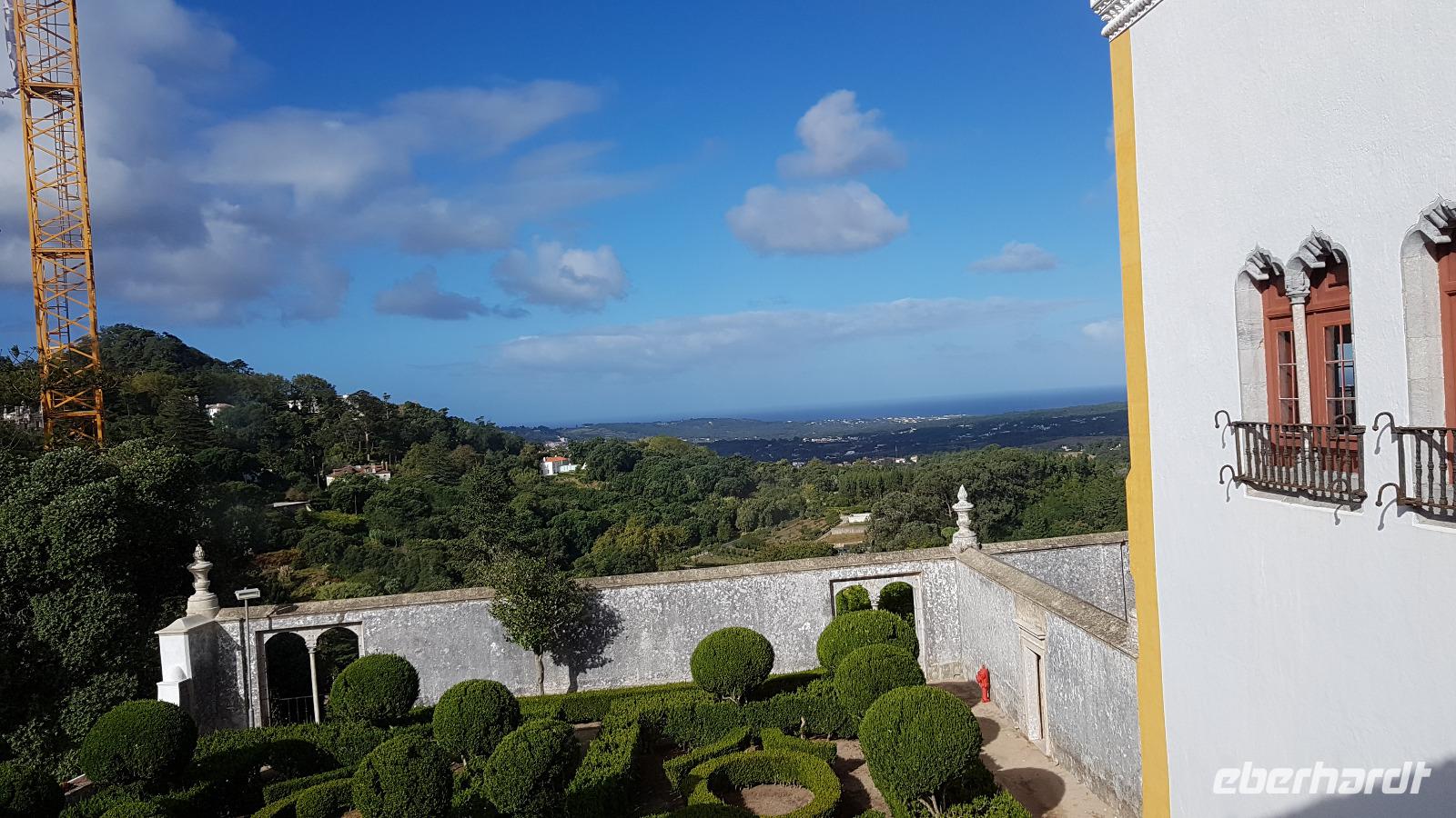 Heute einer der schönsten Parks Portugals- gegründet als "Wüste" der Karmeliter, die hier ihr Kloster bauten und den Garten mit Brunnen und Gebetsnischen anlegten. (Für Karmeliter war der irdische Weg die Wüste- ihre Oase würde erst im Himmel kommen- so erzählt uns Maria) Mit der Auflösung der religiösen Orden ab 1834 ziehen die Karmeliter aus, es entsteht zunächst ein Jagdschloß der königlichen Familie, später das heute noch existierende Hotel. Wir haben Zeit und schauen uns um, ein kleiner Park direkt an den Gebäuden lockt zum Spazierengehen, andere werfen einen Blick in die Empfangshallen des Hotels- Wow! Leider sind die Wege im Wald zu nass und unsere Zeit zu knapp, so fahren wir weiter Richtung