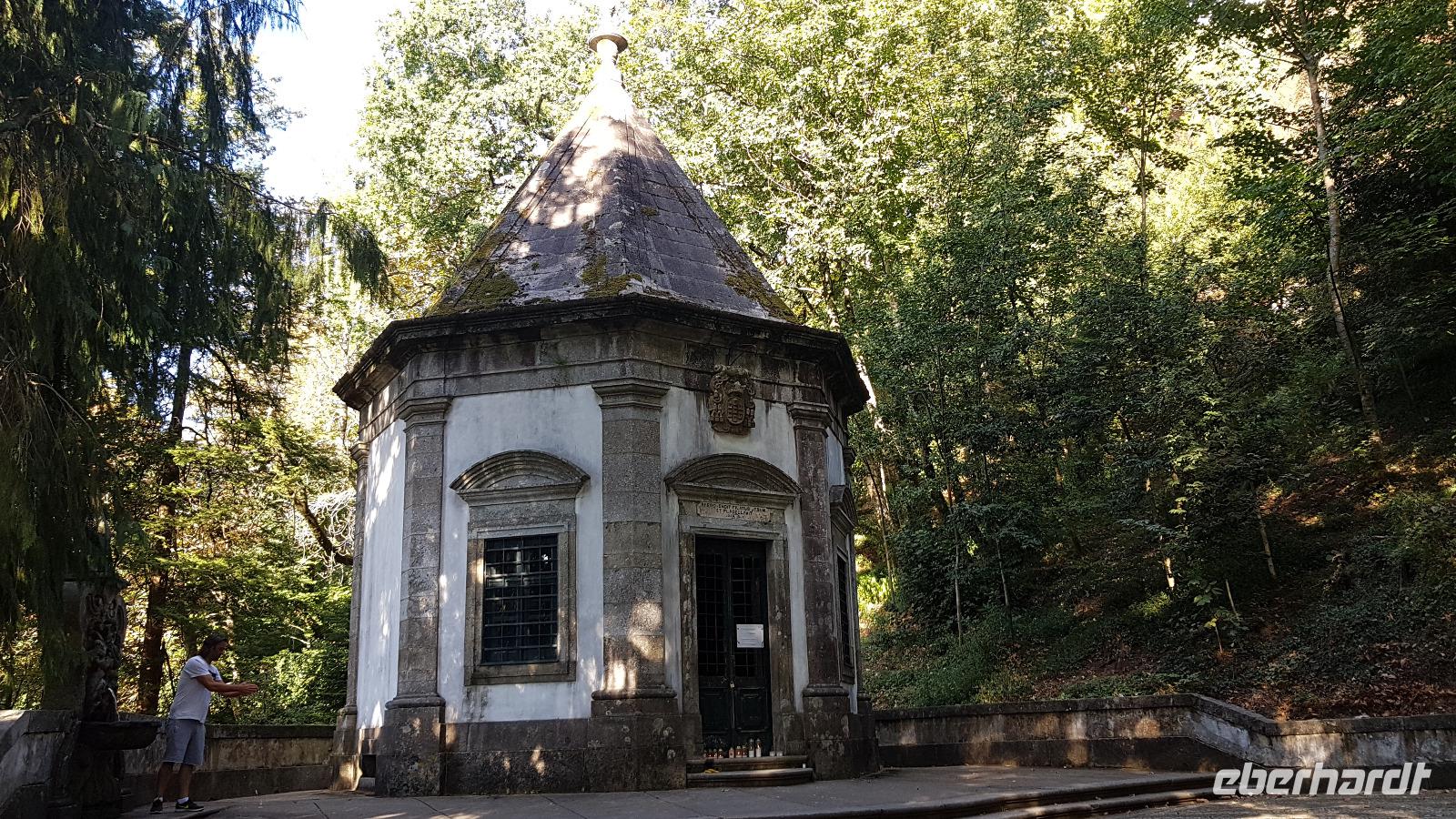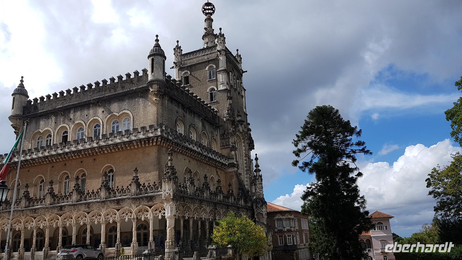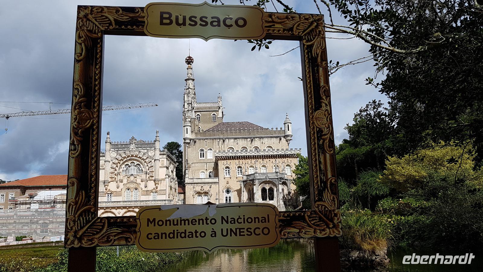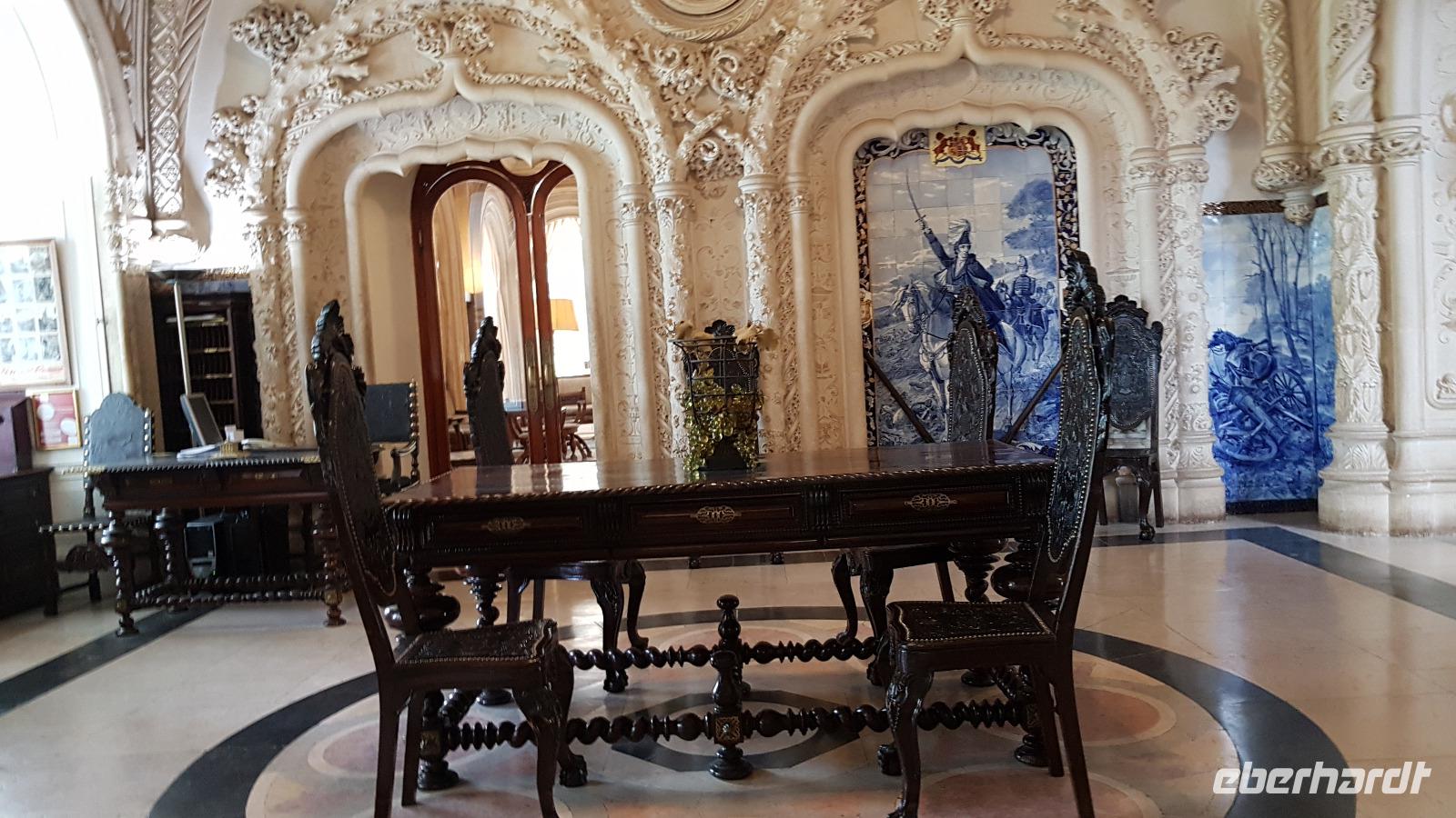 Heute einer der schönsten Parks Portugals- gegründet als "Wüste" der Karmeliter, die hier ihr Kloster bauten und den Garten mit Brunnen und Gebetsnischen anlegten. (Für Karmeliter war der irdische Weg die Wüste- ihre Oase würde erst im Himmel kommen- so erzählt uns Maria) Mit der Auflösung der religiösen Orden ab 1834 ziehen die Karmeliter aus, es entsteht zunächst ein Jagdschloß der königlichen Familie, später das heute noch existierende Hotel. Wir haben Zeit und schauen uns um, ein kleiner Park direkt an den Gebäuden lockt zum Spazierengehen, andere werfen einen Blick in die Empfangshallen des Hotels- Wow! Leider sind die Wege im Wald zu nass und unsere Zeit zu knapp, so fahren wir weiter Richtung