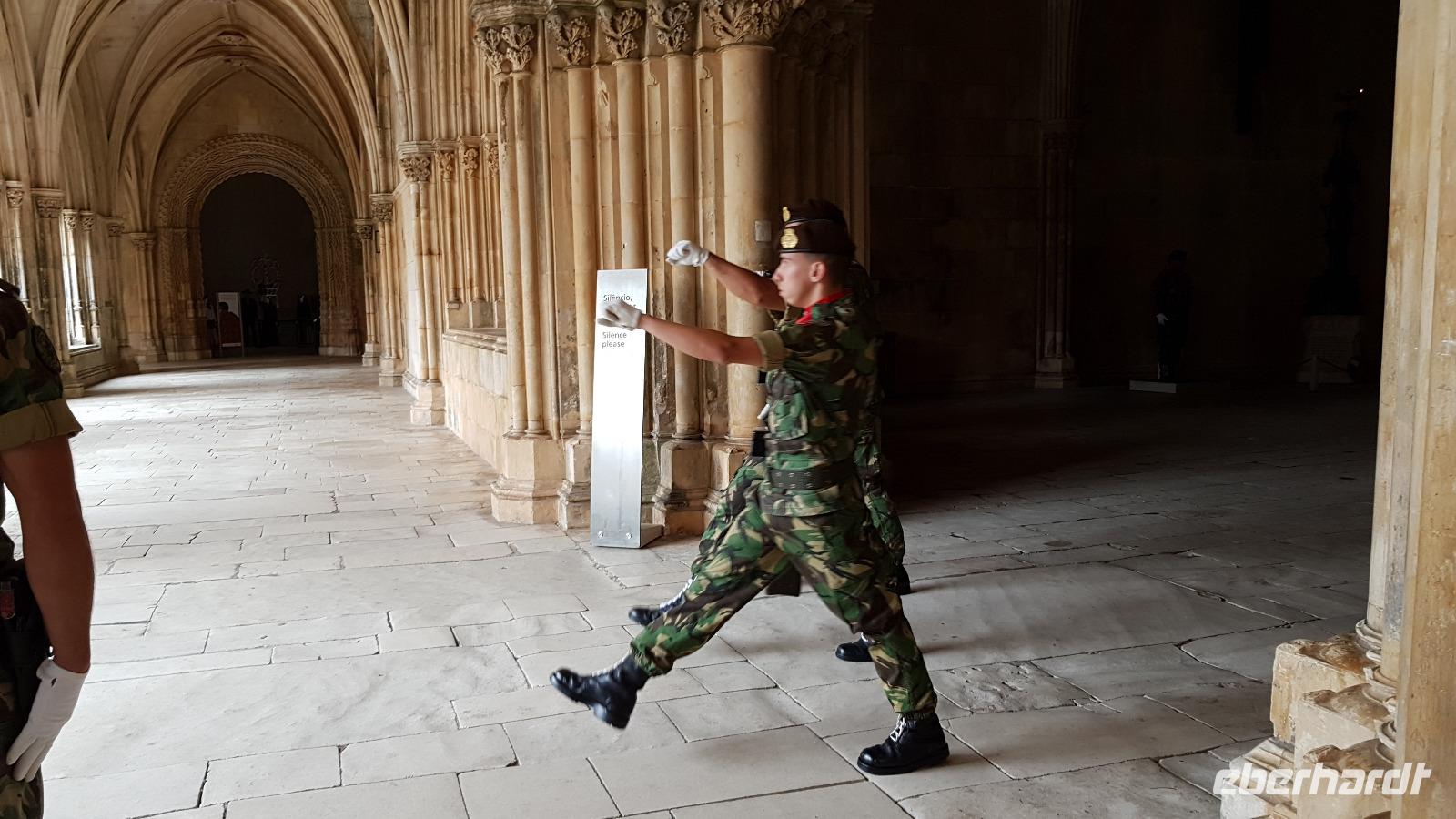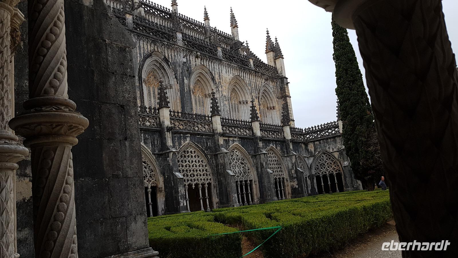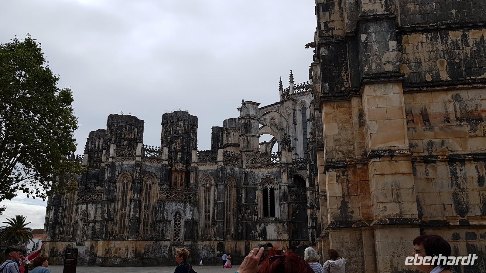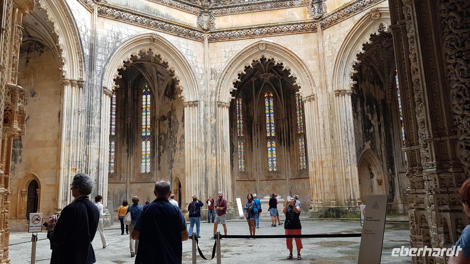 Es wurde gestiftet von Joao I. für seinen Sieg über Kastillien 1385. Das klingt simpel, was uns erwartet ist aber alles andere als das: Ein überragend schöner Gebäudekomplex der Hochgotik. Wir sind beeindruckt und schauen uns gemeinsam die Kirche, die Grabstätten der Könige, den Kreuzgang und natürlich den scheinbar unvollendeten Anbau an. Im Kreuzgang ist auch ein Denkmal für den unbekannten Soldaten, hier findet gerade eine Wachablösung statt. Bau und Ausstattung hier sind überragend und natürlich begegnet uns auch wieder der manuelinische Baustil mit seinen Schiffstauen. Dass die Kapelle mit Absicht nicht weiter gebaut wurde erklärt sich dann mit dem fehlenden Licht in der Kirche. Nun ist wieder Ziet für individuelle Entdeckungen und weiter geht unsere Reise nach