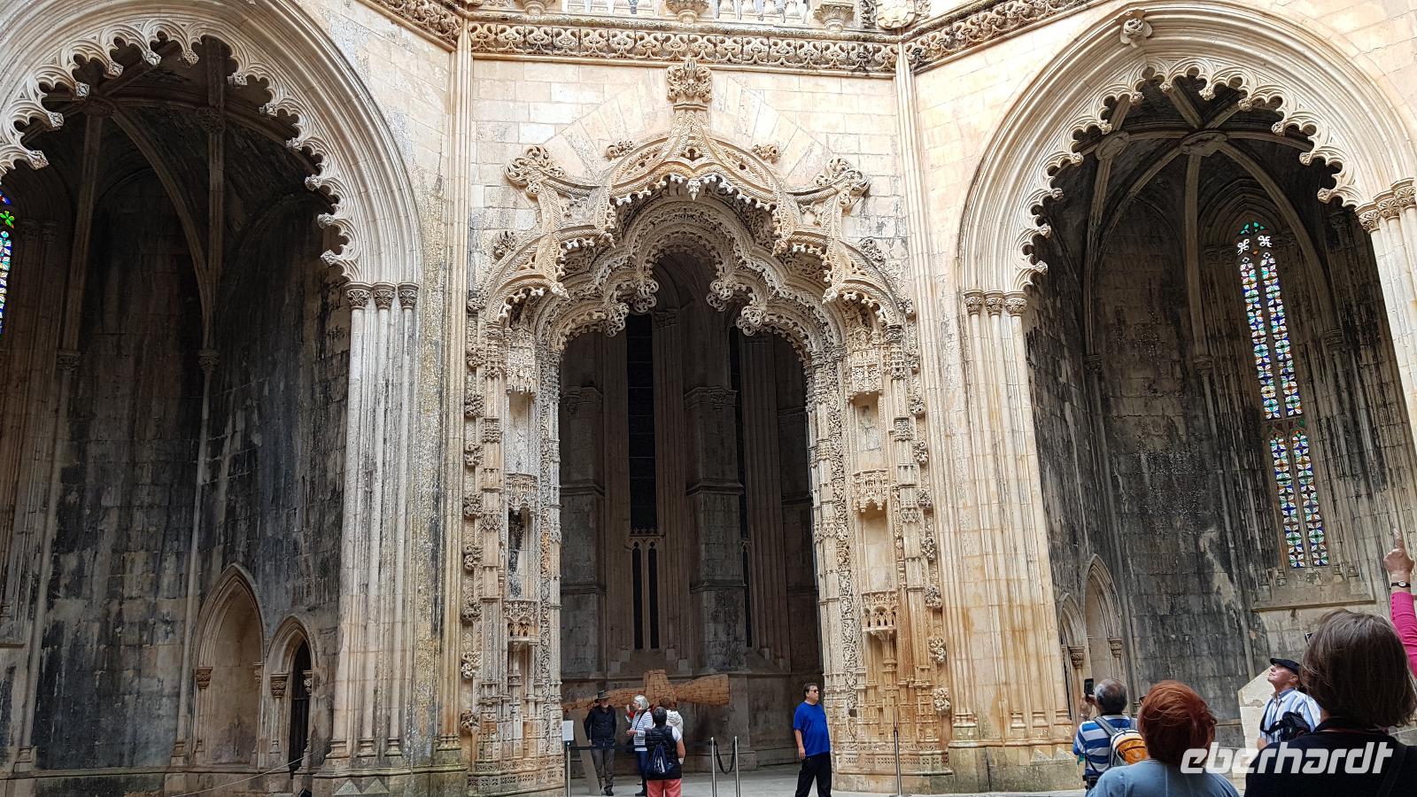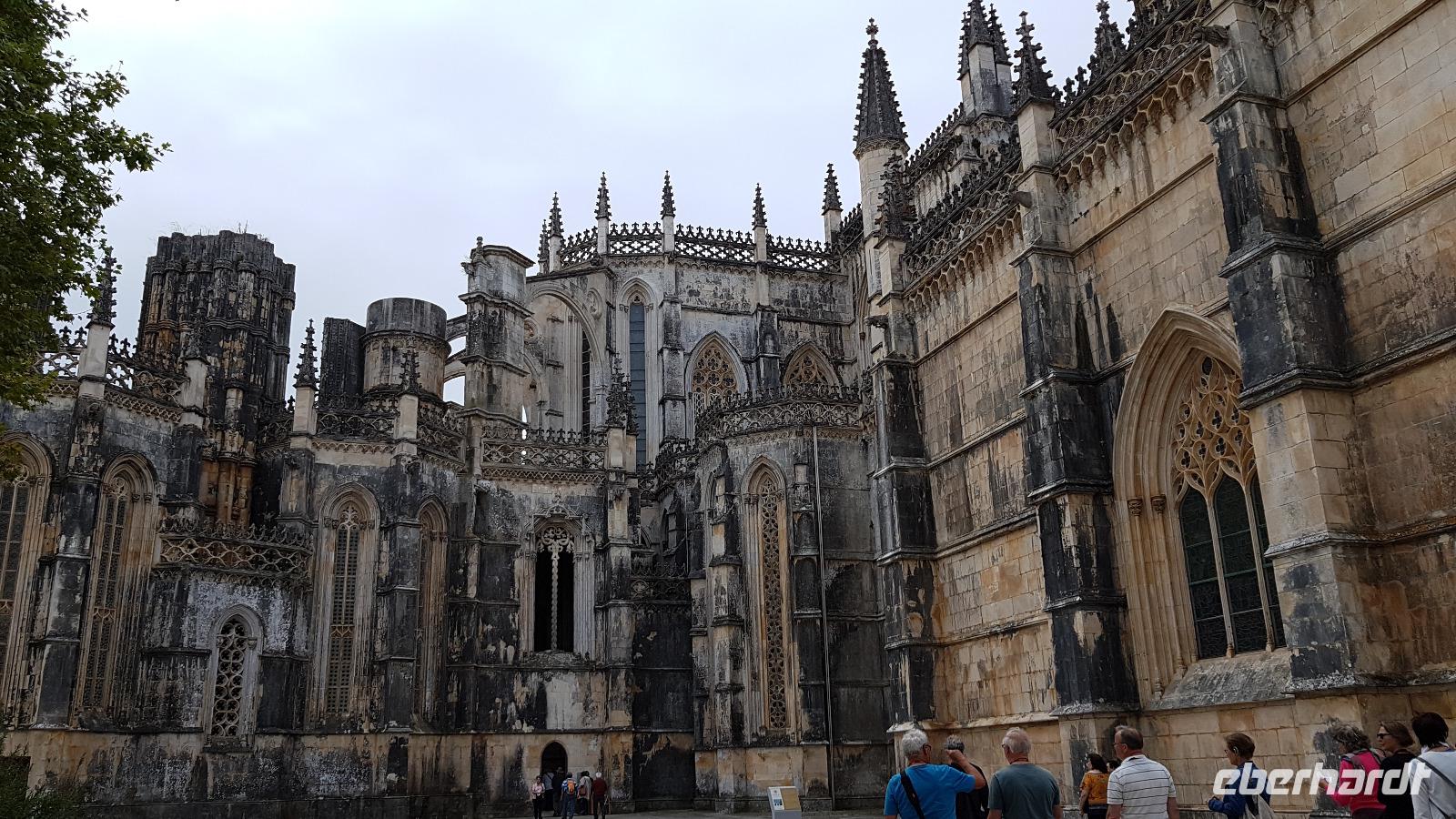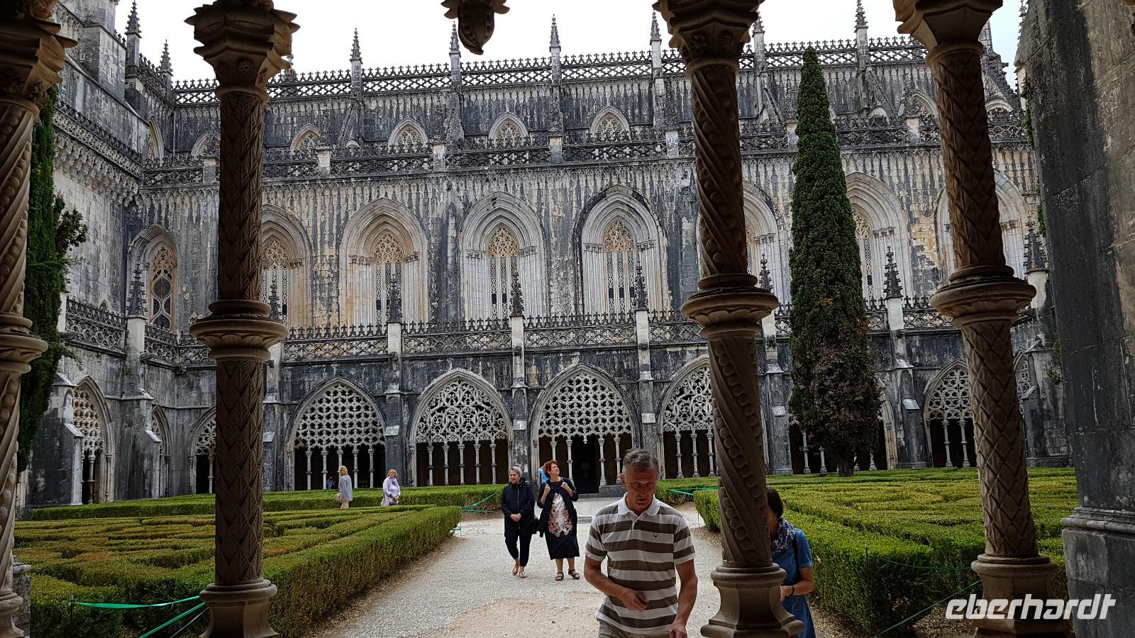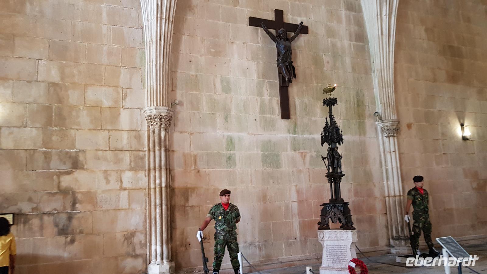 Es wurde gestiftet von Joao I. für seinen Sieg über Kastillien 1385. Das klingt simpel, was uns erwartet ist aber alles andere als das: Ein überragend schöner Gebäudekomplex der Hochgotik. Wir sind beeindruckt und schauen uns gemeinsam die Kirche, die Grabstätten der Könige, den Kreuzgang und natürlich den scheinbar unvollendeten Anbau an. Im Kreuzgang ist auch ein Denkmal für den unbekannten Soldaten, hier findet gerade eine Wachablösung statt. Bau und Ausstattung hier sind überragend und natürlich begegnet uns auch wieder der manuelinische Baustil mit seinen Schiffstauen. Dass die Kapelle mit Absicht nicht weiter gebaut wurde erklärt sich dann mit dem fehlenden Licht in der Kirche. Nun ist wieder Ziet für individuelle Entdeckungen und weiter geht unsere Reise nach