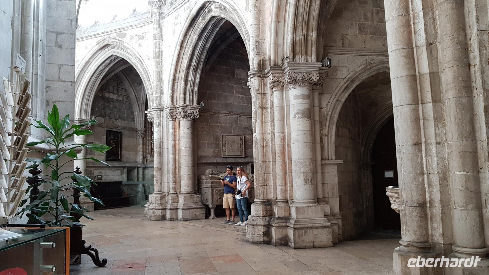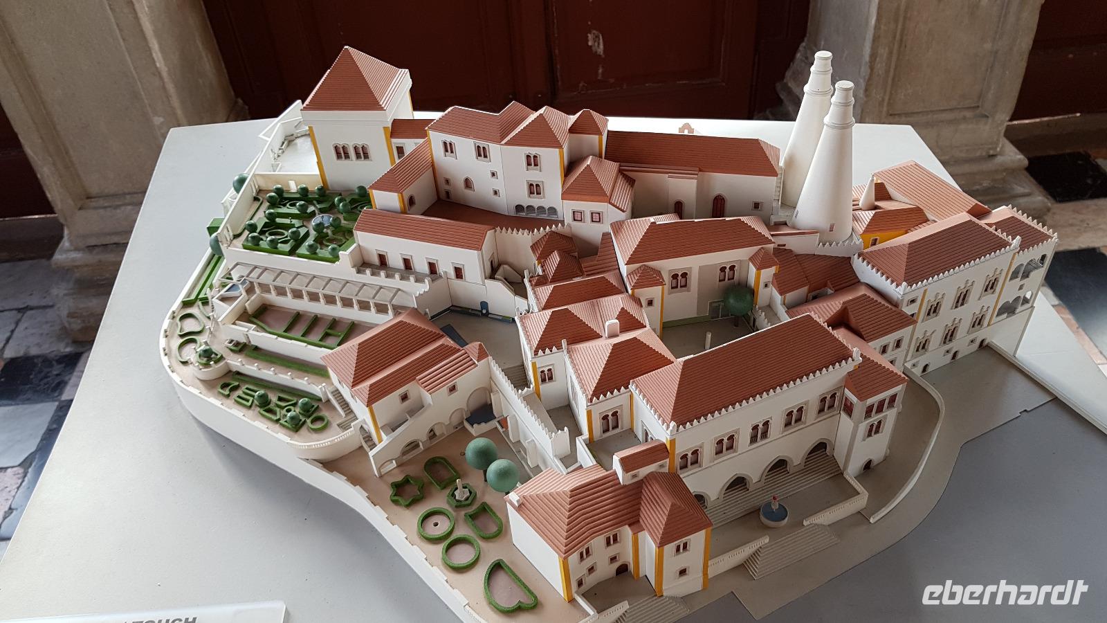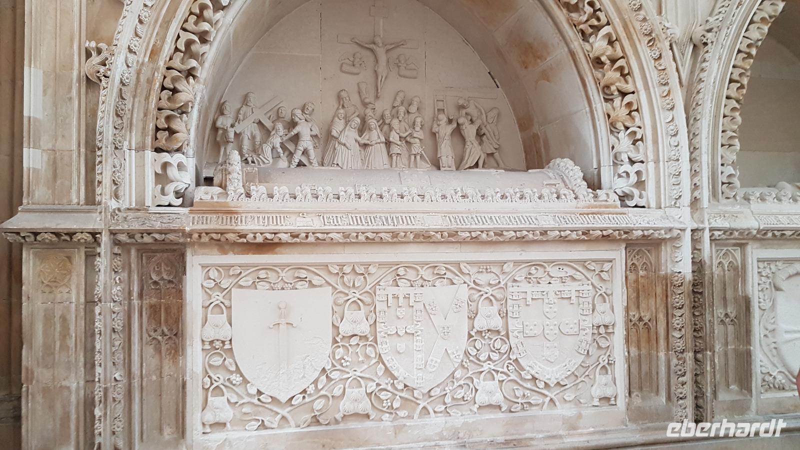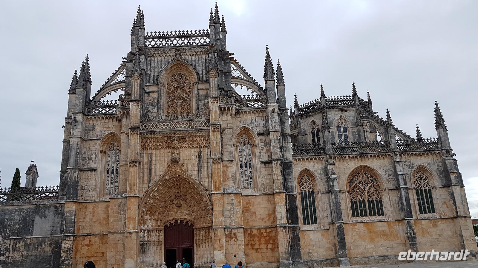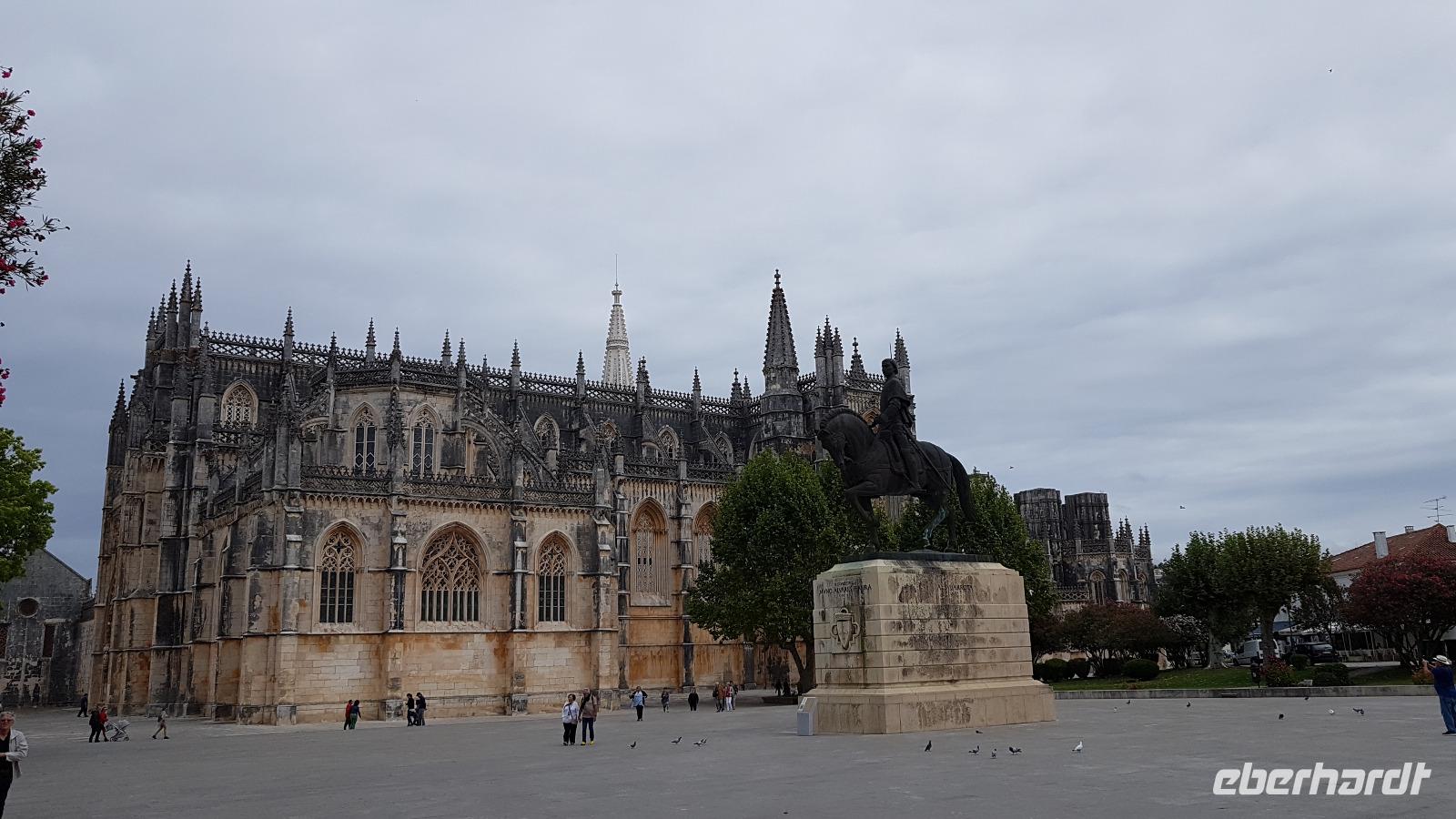 Es wurde gestiftet von Joao I. für seinen Sieg über Kastillien 1385. Das klingt simpel, was uns erwartet ist aber alles andere als das: Ein überragend schöner Gebäudekomplex der Hochgotik. Wir sind beeindruckt und schauen uns gemeinsam die Kirche, die Grabstätten der Könige, den Kreuzgang und natürlich den scheinbar unvollendeten Anbau an. Im Kreuzgang ist auch ein Denkmal für den unbekannten Soldaten, hier findet gerade eine Wachablösung statt. Bau und Ausstattung hier sind überragend und natürlich begegnet uns auch wieder der manuelinische Baustil mit seinen Schiffstauen. Dass die Kapelle mit Absicht nicht weiter gebaut wurde erklärt sich dann mit dem fehlenden Licht in der Kirche. Nun ist wieder Ziet für individuelle Entdeckungen und weiter geht unsere Reise nach