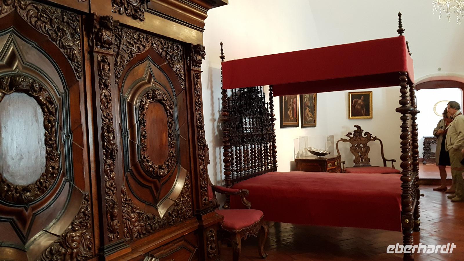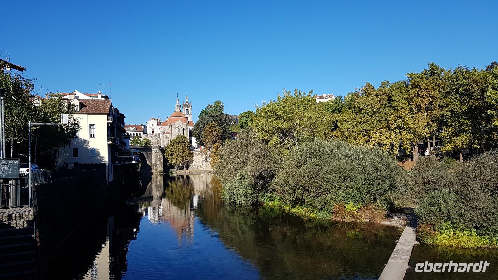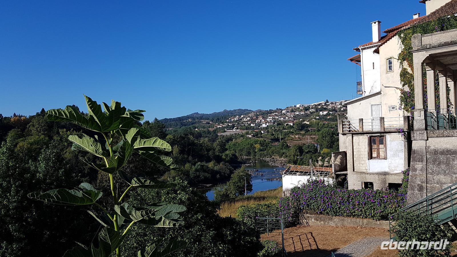 Ein letztes Mal frühstückten wir im Casa da Musica, dann hieß es Koffer laden und Abfahrt Richtung Osten. Alvaro wird uns noch die nächsten Tage begleiten, das ist auch gut so, er ist ein sehr sicherer und guter Fahrer, der auch unsere Foto-Stopp-Wünsche erfüllt und das sollte uns heute besonders zugutekommen. Nach einer reichlichen Stunde Fahrt erreichten wir unser erstes Etappenziel: Amarante. Hier erhebt sich das Marão-Gebirge und der Fluss Tâmega fließt durch das Herz der Stadt. Wir überqueren den Tamega über eine Brücke, die die Einwohner der Stadt einst erfolgreich gegen Napoleon verteidigt hatten, und erreichten die Kirche des heiligen Gonçalo. Er ist Schutzpatron der Liebenden und hier in der Kirche ist auch sein Grab. Wir sind überrascht von der prunkvollen Ausstattung der Kirche und erhaschen auch einen Blick in die Sakristei- originale Bemalungen der hölzernen Decken und Wände ziehen uns in ihren Bann. Dann nutzen wir die Zeit und bummeln durch das Städtchen- die Auslagen der Obst- und Gemüseläden haben es uns angetan und bei den riesigen Pfirsichen und Nektarinen greife ich zu und besorge für die Gruppe ein wenig Vitamine.