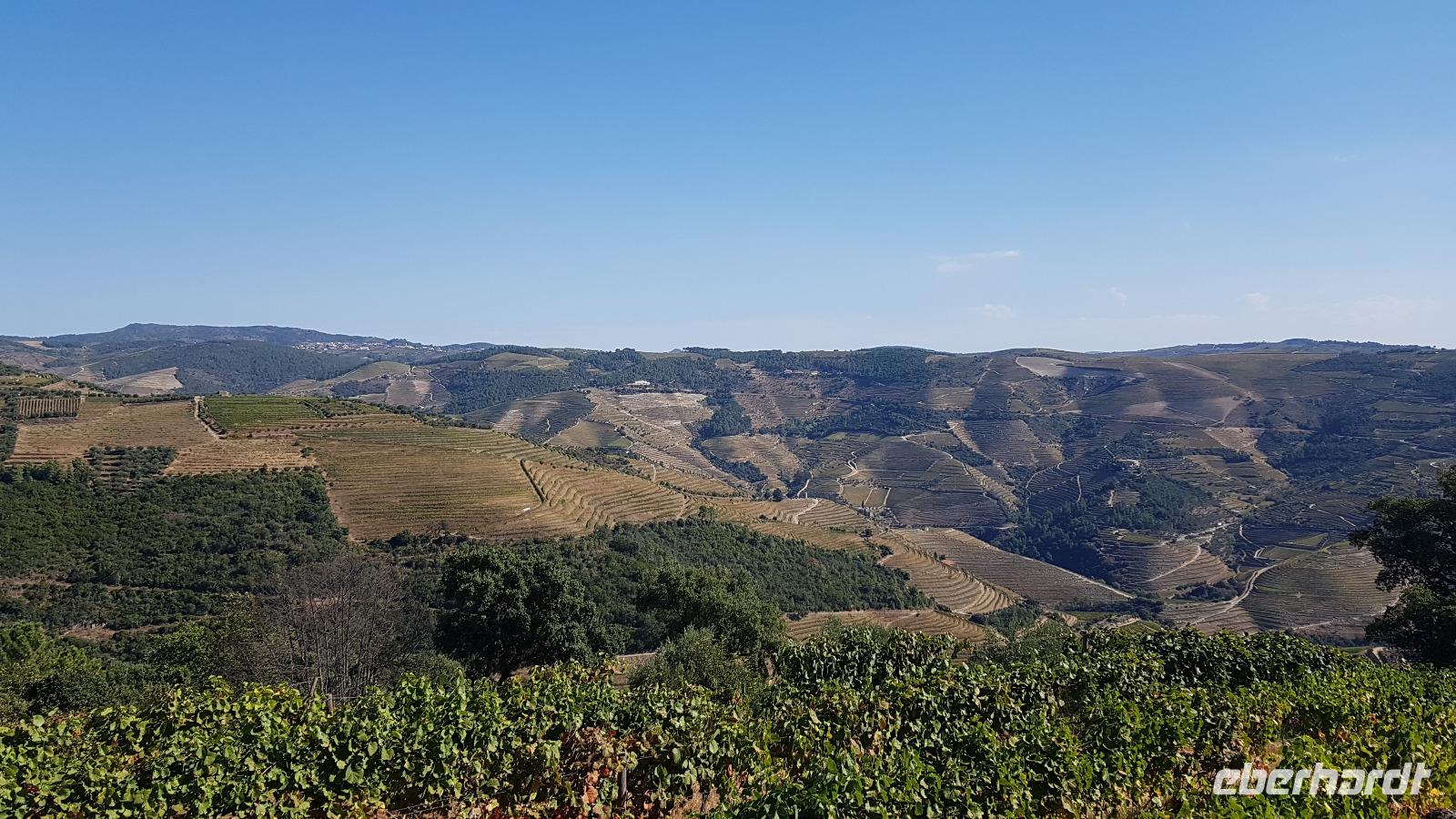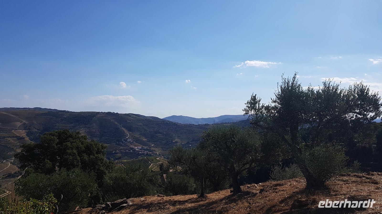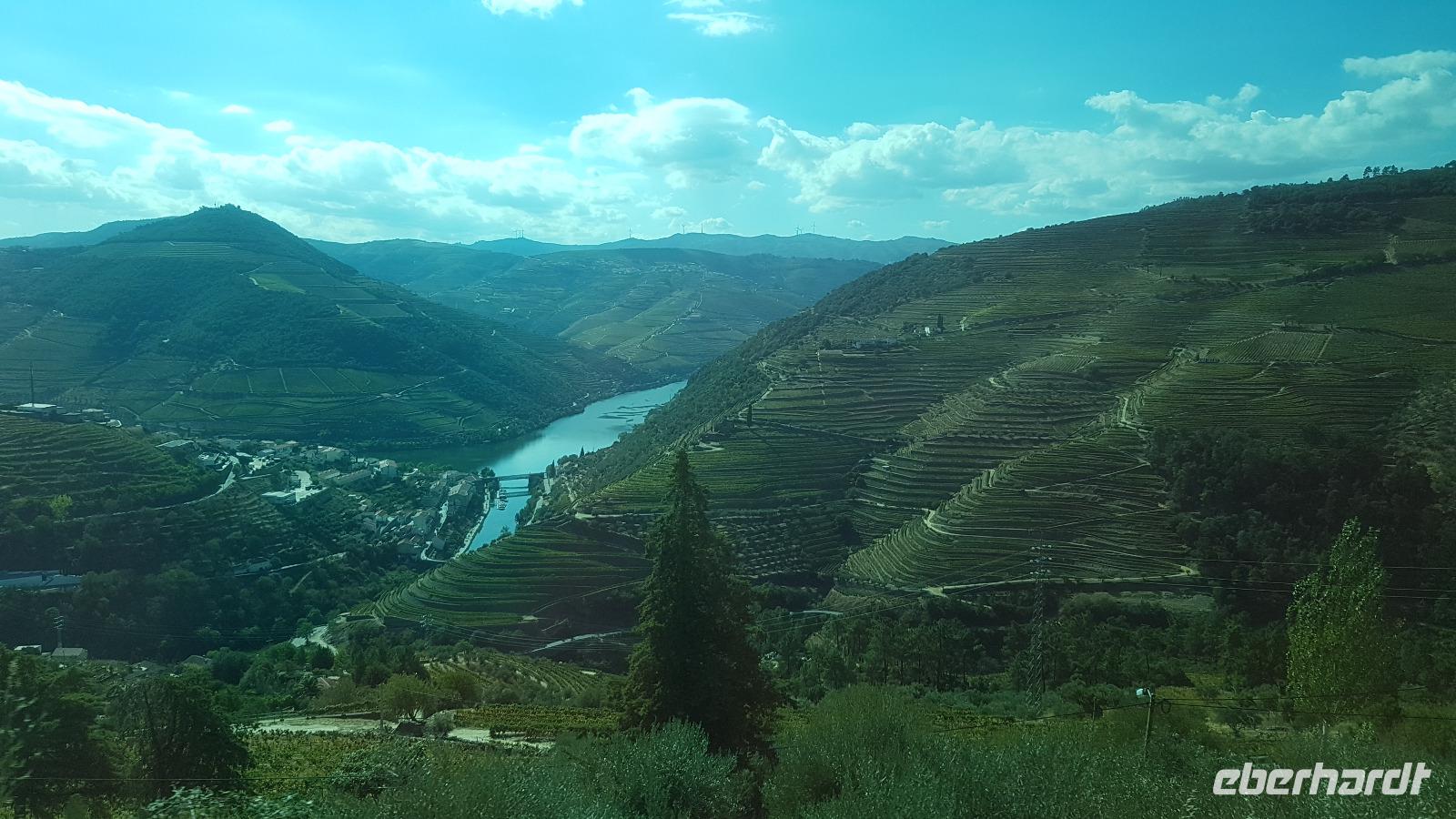 Weiter geht unsere Fahrt durch das wunderschöne Douro-Tal. In Serpentinen schließlich hinauf in die Weinterrassen. Nur ca. 30 % der Flächen sind mit Weinstöcken bepflanzt, erzählt uns Maria, das andere sind Pinienwälder, Kirsch- und Mandelbäume, und natürlich Olivenbäume. Heute zeigt sich, wie wichtig es war, diese Tradition zu erhalten und nicht auf intensive Bewirtschaftung nur mit Wein zu setzen: Es sind einzigartige Lebensräume hier, die Raubvögel wohnen in den Wäldern - sie halten die Reben von Ungeziefer und Insekten frei und so profitieren alle. Alvaro lenkt den Bus sicher durch die schmalsten Serpentinen und an bröckelnden Abhängen vorbei, dann stoppt er für einmalige Fotos. Super! Schließlich erreichen wir Pinhao.