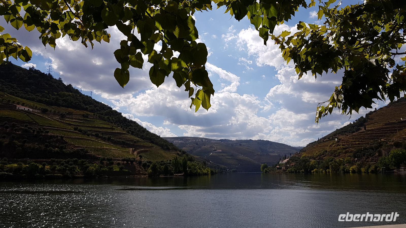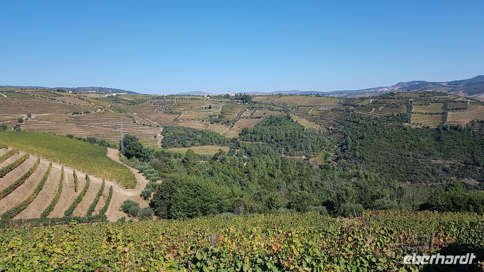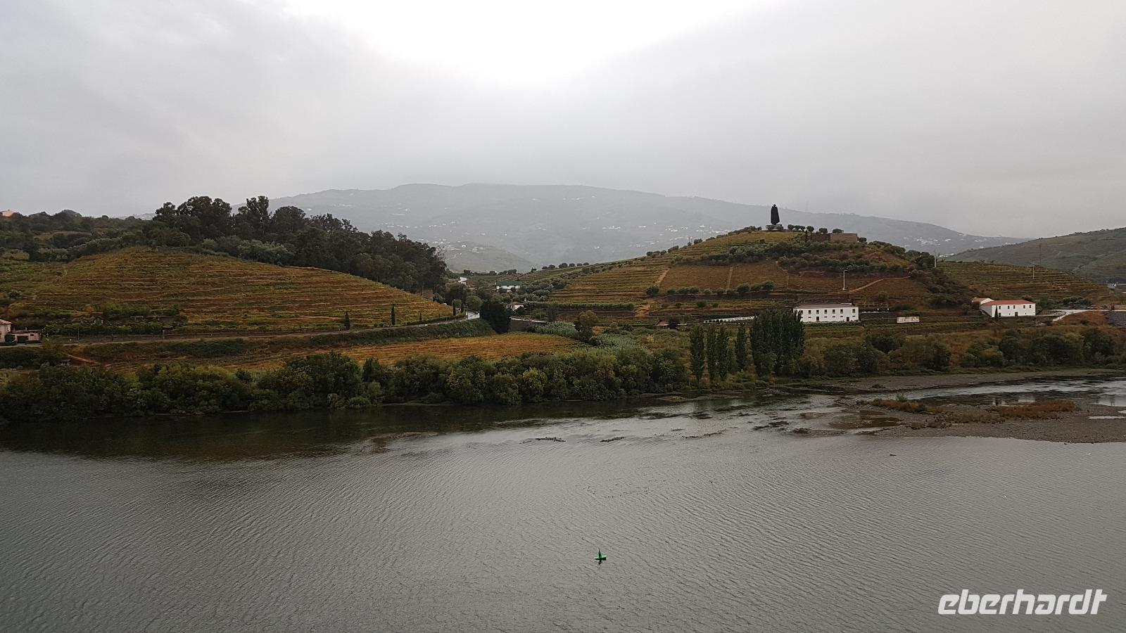 Weiter geht unsere Fahrt durch das wunderschöne Douro-Tal. In Serpentinen schließlich hinauf in die Weinterrassen. Nur ca. 30 % der Flächen sind mit Weinstöcken bepflanzt, erzählt uns Maria, das andere sind Pinienwälder, Kirsch- und Mandelbäume, und natürlich Olivenbäume. Heute zeigt sich, wie wichtig es war, diese Tradition zu erhalten und nicht auf intensive Bewirtschaftung nur mit Wein zu setzen: Es sind einzigartige Lebensräume hier, die Raubvögel wohnen in den Wäldern - sie halten die Reben von Ungeziefer und Insekten frei und so profitieren alle. Alvaro lenkt den Bus sicher durch die schmalsten Serpentinen und an bröckelnden Abhängen vorbei, dann stoppt er für einmalige Fotos. Super! Schließlich erreichen wir Pinhao.