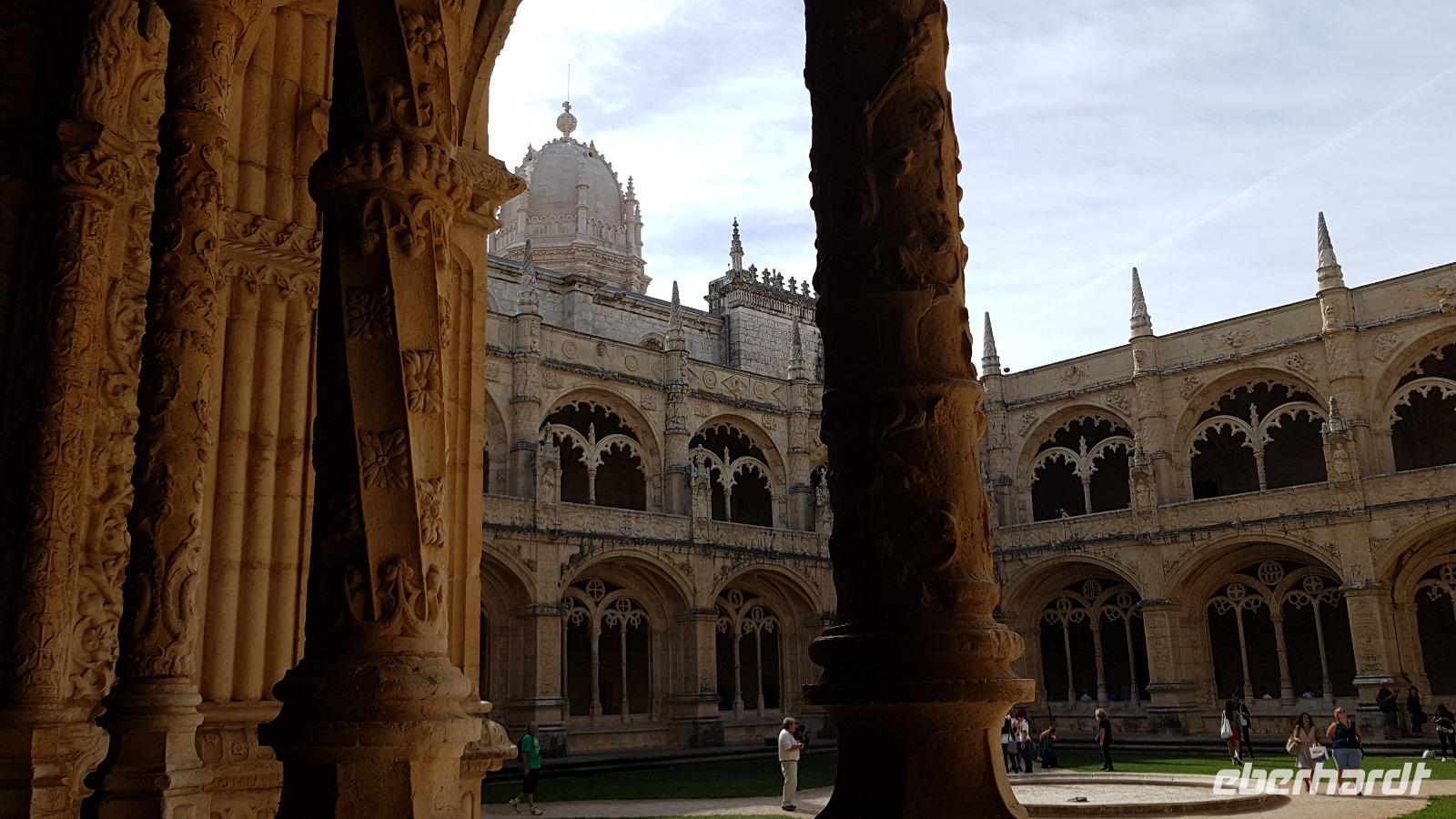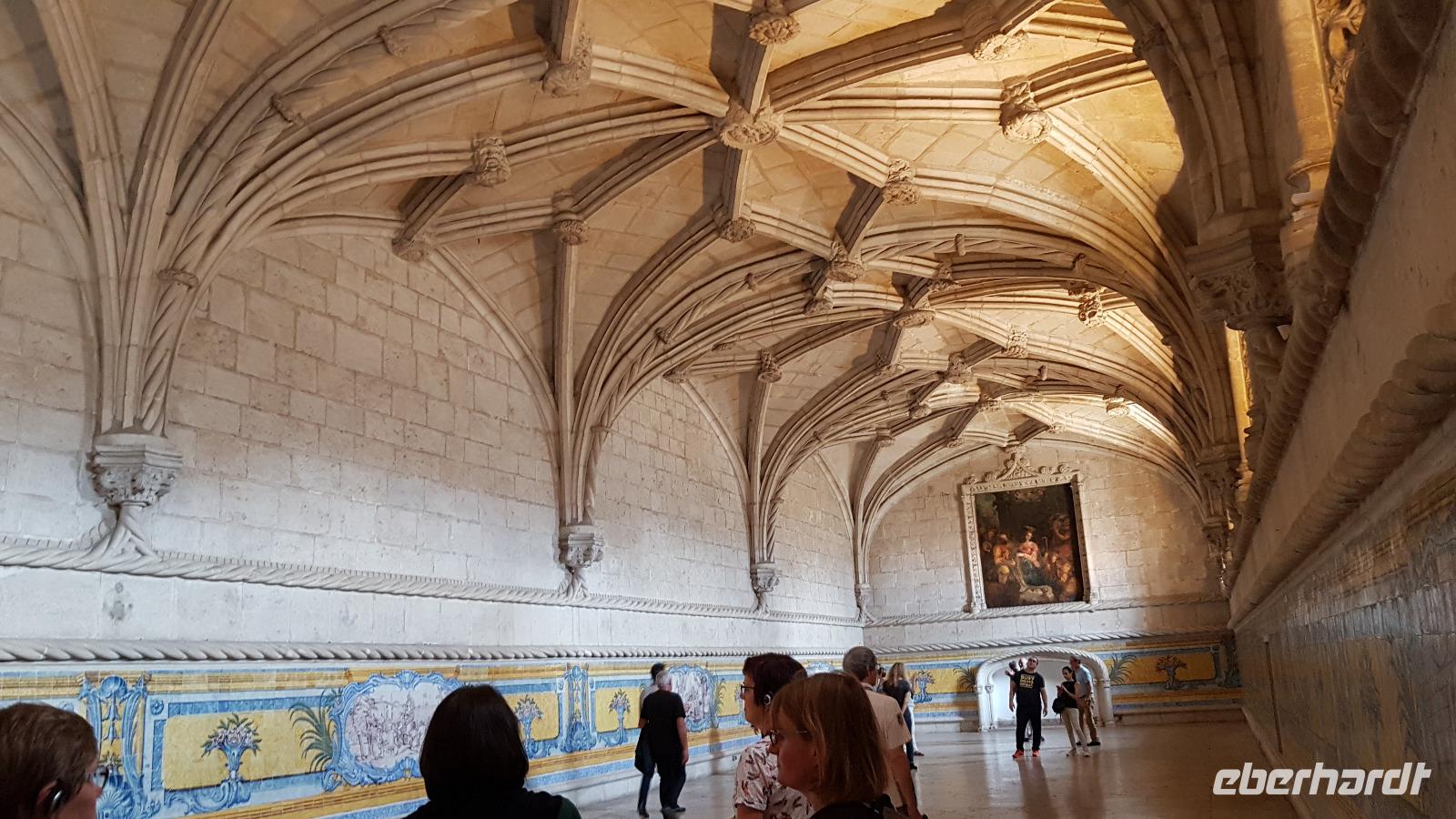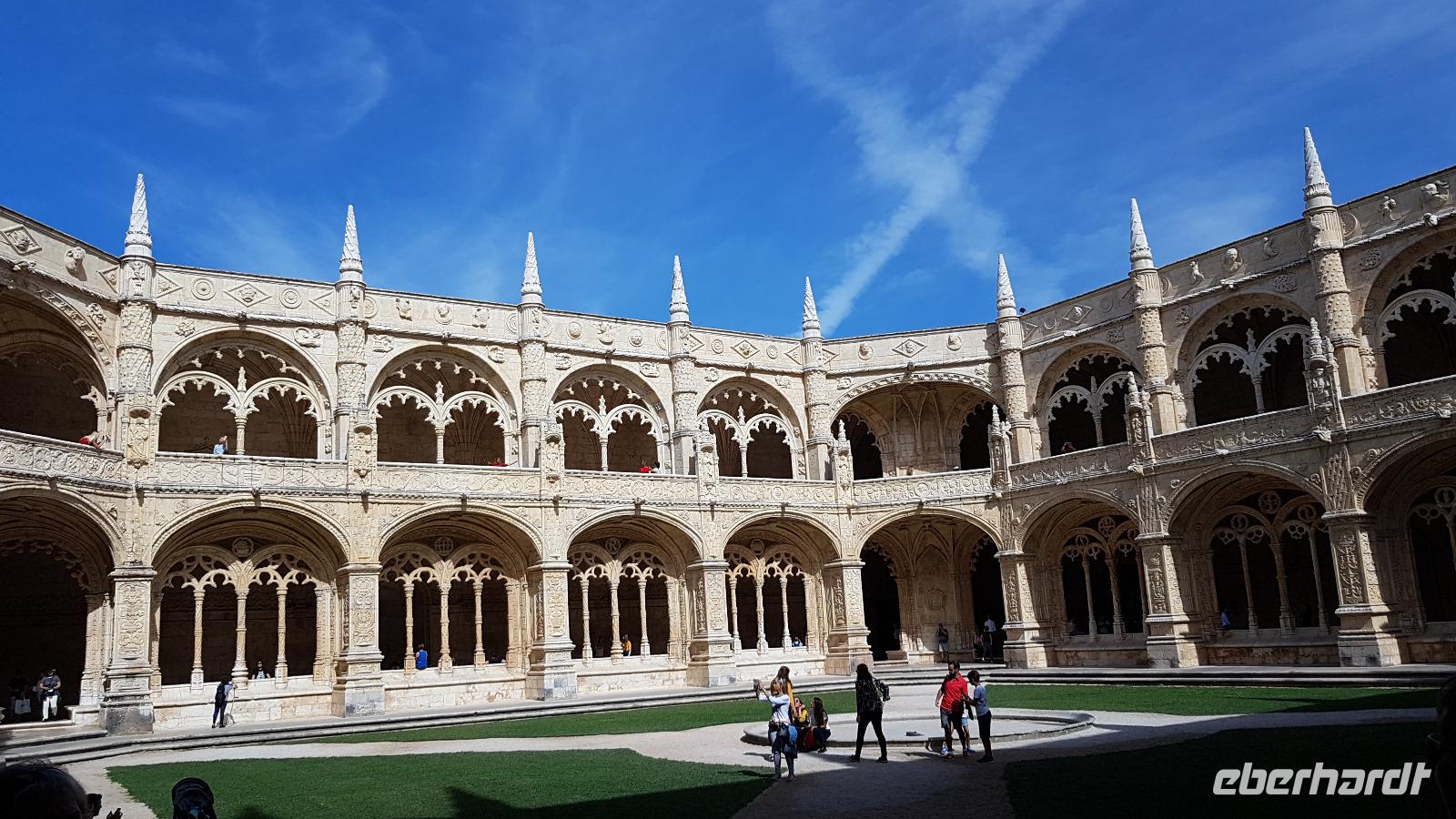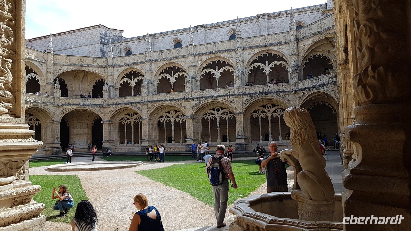 das wollen wir natürlich sehen. Am Park steigen wir aus und sofort nimmt uns dieser einzigartige Gebäudekomplex gefangen. Wir gehen hinein und da die Kirche für eine Hochzeitszeremonie momentan nicht öffentlich ist gehen wir gleich in den Kreuzgang. So vieles gab es zu entdecken, vieles hatten wir so oder ähnlich bereits gesehen, auch den manuelinischen Stil trafen wir wieder. Was für eine Pracht! Wir entdecken mit Maria tolle Details, neue Räume und können von der Empore einen Blick in die Kirche werfen. Die Braut traut sich offenbar noch nicht also haben wir Zeit für eigene Entdeckungen und eine Mittagspause. Als 1834 die religiösen Orden aufgelöst wurden mußten auch die Mönche hier das Kloster verlassen. Der Bäcker des Klosters eröffnete 3 Jahre später in Sichtweite des Klosters eine Konditorei, die heute noch existiert. Er kreierte hier die Pasteten, die nun zu Lissabon gehören wie die Kathedrale und der Tejo- die Pasteis de Nata. Natürlich haben alle unsere Gäste davon eine Kostprobe bekommen- einfach lecker! Dann ging unsere Fahrt weiter-