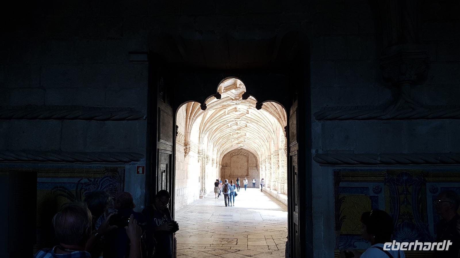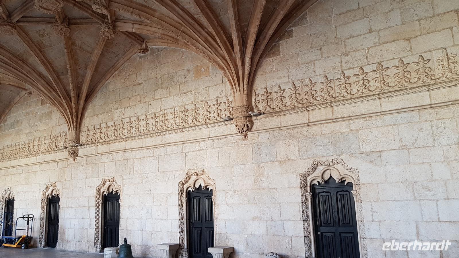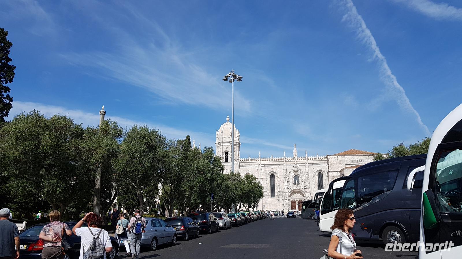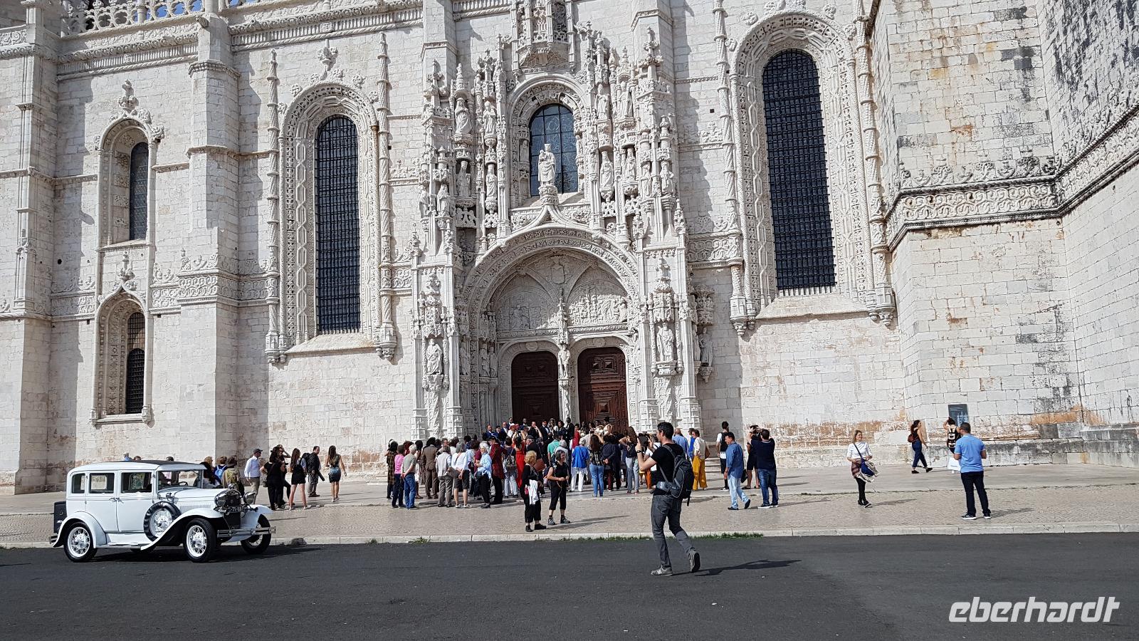 das wollen wir natürlich sehen. Am Park steigen wir aus und sofort nimmt uns dieser einzigartige Gebäudekomplex gefangen. Wir gehen hinein und da die Kirche für eine Hochzeitszeremonie momentan nicht öffentlich ist gehen wir gleich in den Kreuzgang. So vieles gab es zu entdecken, vieles hatten wir so oder ähnlich bereits gesehen, auch den manuelinischen Stil trafen wir wieder. Was für eine Pracht! Wir entdecken mit Maria tolle Details, neue Räume und können von der Empore einen Blick in die Kirche werfen. Die Braut traut sich offenbar noch nicht also haben wir Zeit für eigene Entdeckungen und eine Mittagspause. Als 1834 die religiösen Orden aufgelöst wurden mußten auch die Mönche hier das Kloster verlassen. Der Bäcker des Klosters eröffnete 3 Jahre später in Sichtweite des Klosters eine Konditorei, die heute noch existiert. Er kreierte hier die Pasteten, die nun zu Lissabon gehören wie die Kathedrale und der Tejo- die Pasteis de Nata. Natürlich haben alle unsere Gäste davon eine Kostprobe bekommen- einfach lecker! Dann ging unsere Fahrt weiter-