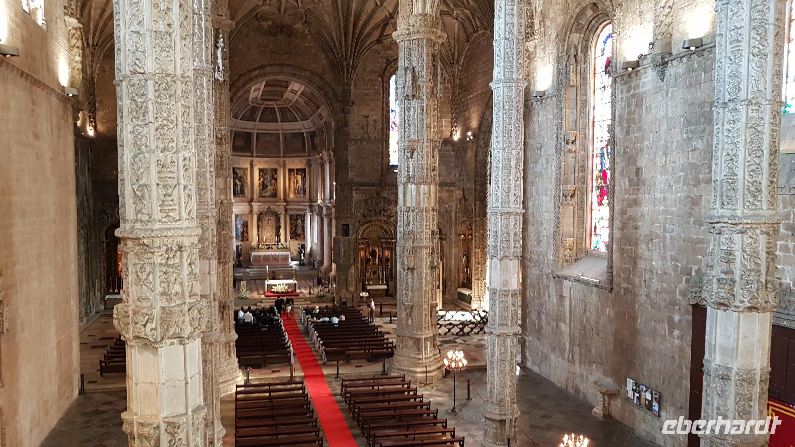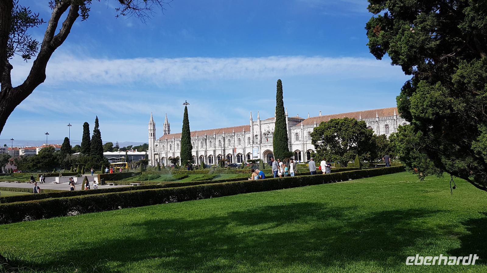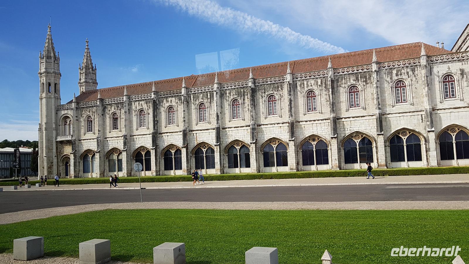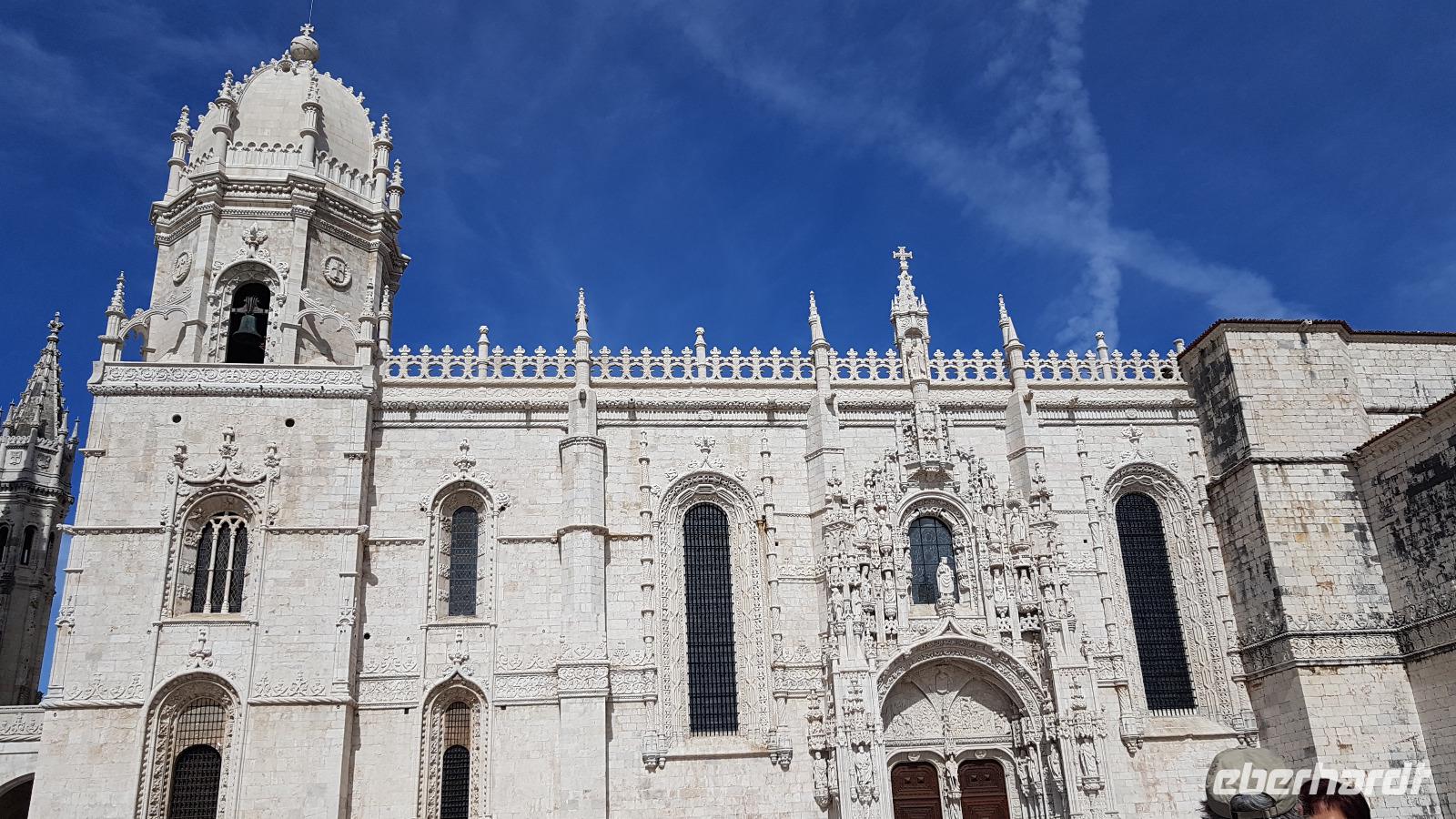 das wollen wir natürlich sehen. Am Park steigen wir aus und sofort nimmt uns dieser einzigartige Gebäudekomplex gefangen. Wir gehen hinein und da die Kirche für eine Hochzeitszeremonie momentan nicht öffentlich ist gehen wir gleich in den Kreuzgang. So vieles gab es zu entdecken, vieles hatten wir so oder ähnlich bereits gesehen, auch den manuelinischen Stil trafen wir wieder. Was für eine Pracht! Wir entdecken mit Maria tolle Details, neue Räume und können von der Empore einen Blick in die Kirche werfen. Die Braut traut sich offenbar noch nicht also haben wir Zeit für eigene Entdeckungen und eine Mittagspause. Als 1834 die religiösen Orden aufgelöst wurden mußten auch die Mönche hier das Kloster verlassen. Der Bäcker des Klosters eröffnete 3 Jahre später in Sichtweite des Klosters eine Konditorei, die heute noch existiert. Er kreierte hier die Pasteten, die nun zu Lissabon gehören wie die Kathedrale und der Tejo- die Pasteis de Nata. Natürlich haben alle unsere Gäste davon eine Kostprobe bekommen- einfach lecker! Dann ging unsere Fahrt weiter-