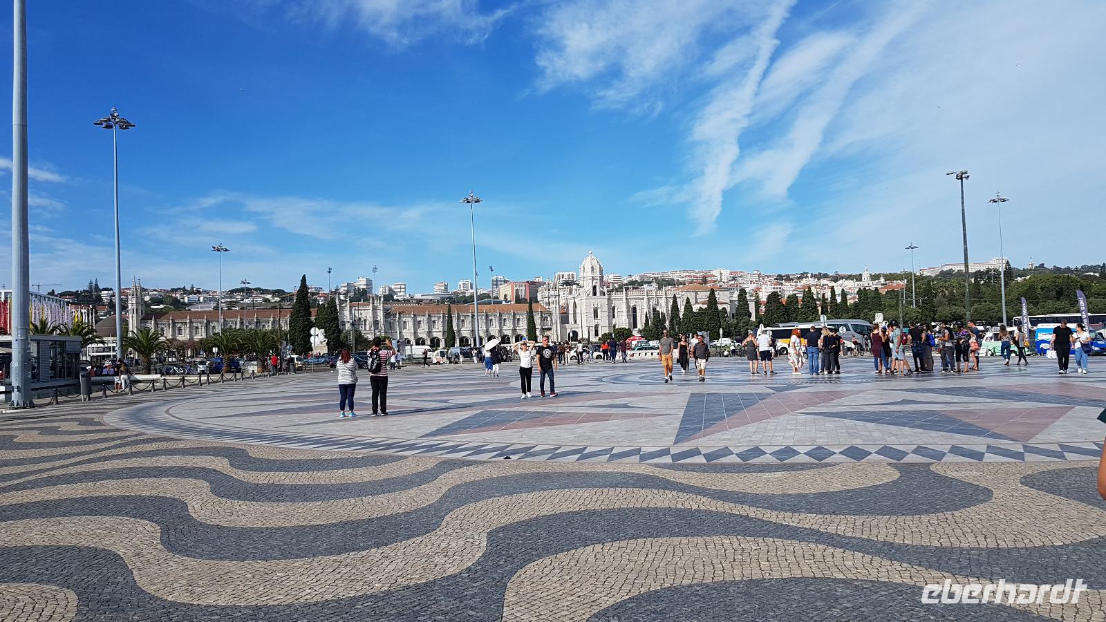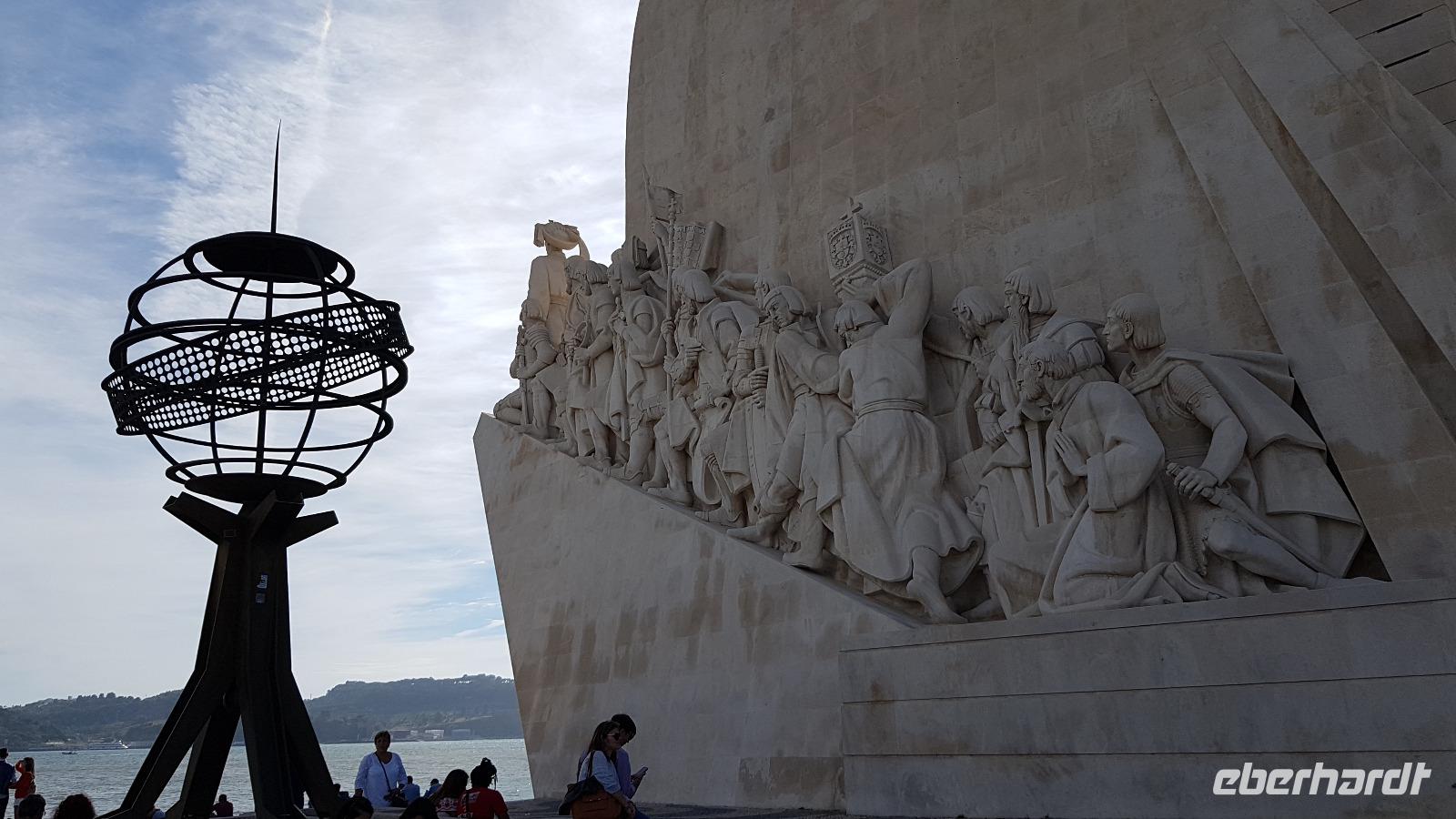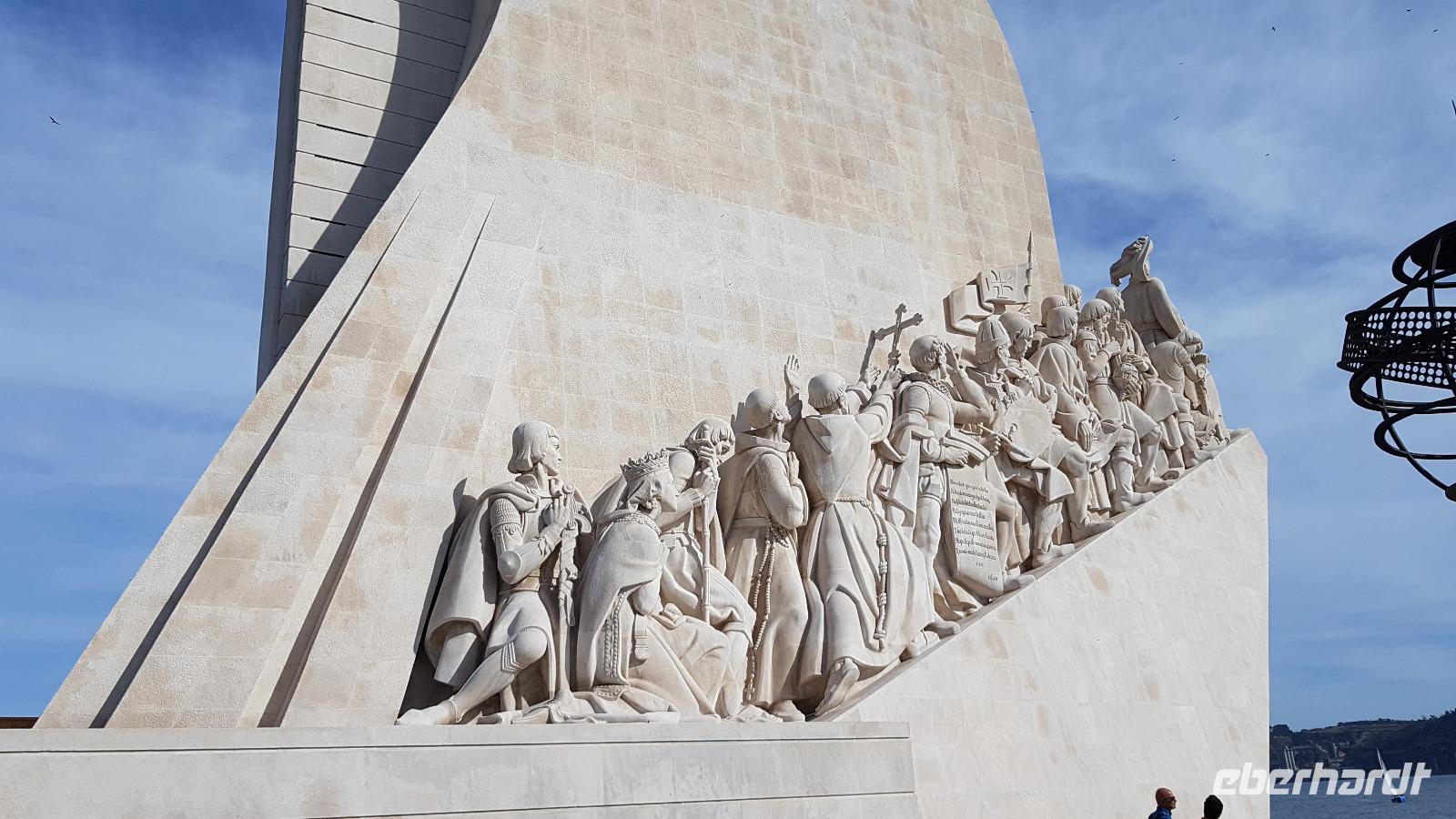 Zum 500. Todestag von Heinrich dem Seefahrer wurde es 1960 gebaut. Auf dem Platz vor dem Denkmal ist im Boden eine Windrose mit einer Weltkarte aus Mosaiksteinen eingelassen, sie zeigt die Entdecker-Routen der Portugiesen. Das riesige Denkmal zeigt neben Heinrich viele weitere wichtige Persönlichkeiten der Seefahrt und der Entdeckungen. Wir genossen bei strahlendem Sonnenschein dieses einmalige Ensemble bis wuchtige Donnerschläge zu hören waren. Ein Zerstörer der Marine lief auf dem Tejo in die Stadt ein und feuerte Salut-Schüsse ab. Die Kanonen am Belemturm antworteten. Da waren wir wieder in der Gegenwart und fuhren zurück ins Stadtzentrum. Einige von uns wollten es sich nicht nehmen lassen und einem "Fado in the Box" zusehen, einer Fadoveranstaltung im kleinen Klub. Wer das nicht wollte konnte zurück ins Hotel fahren oder im Zentrum bleiben. Alle anderen spazierten hinauf zum "Adega Machado" und wurden hier mit einem Glas Wein und kleinen Snacks begrüßt. Dann begann der
