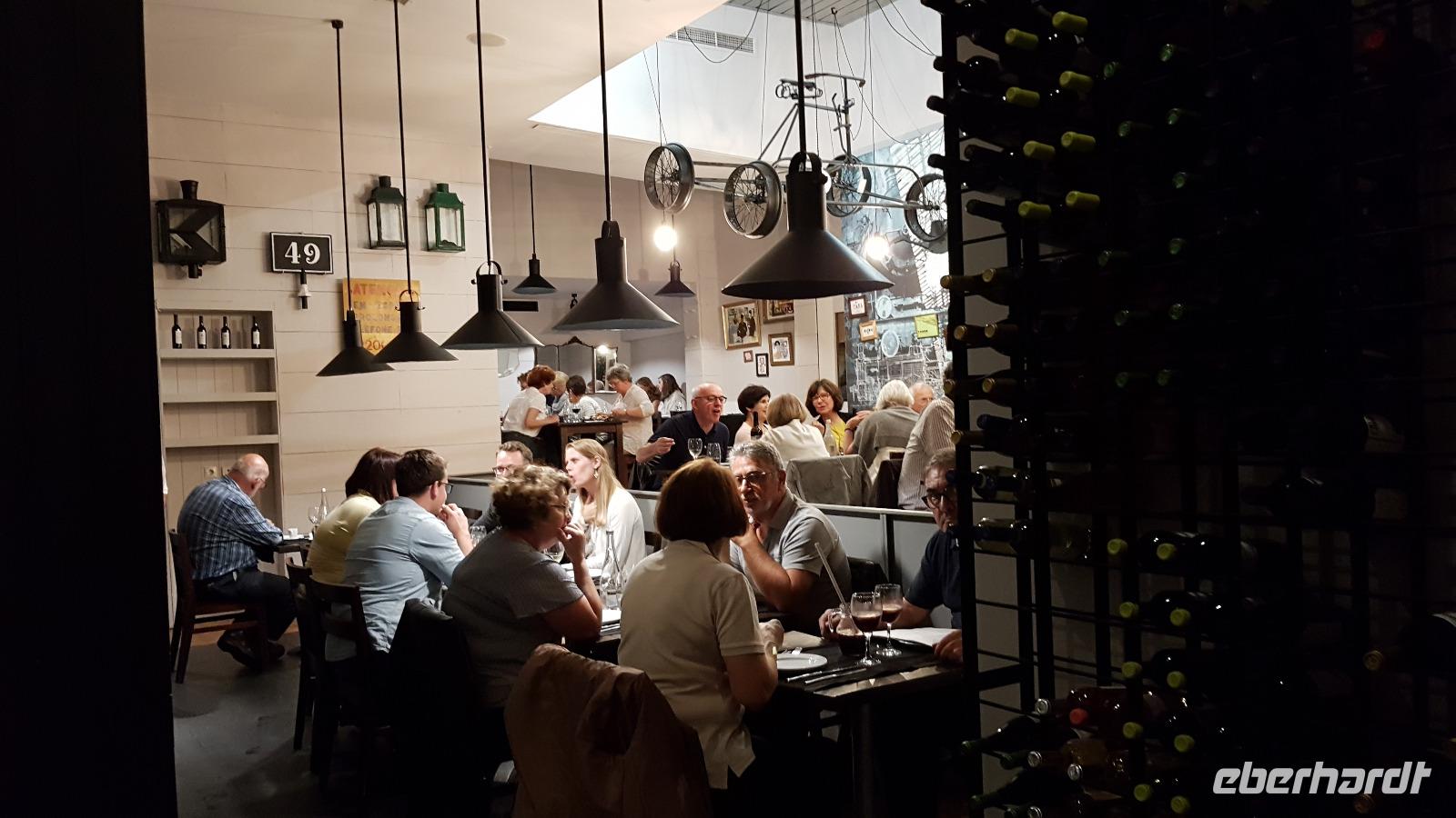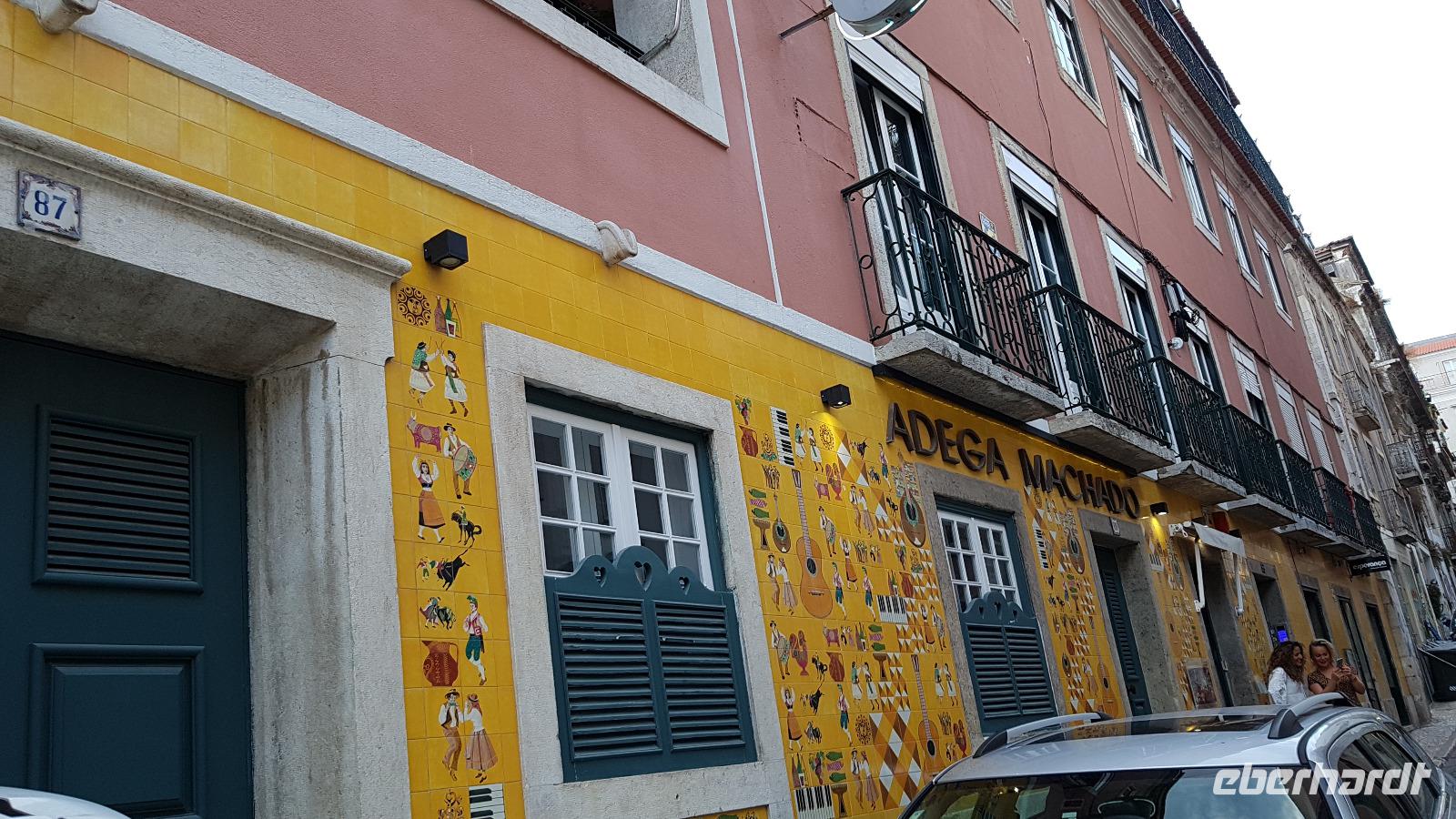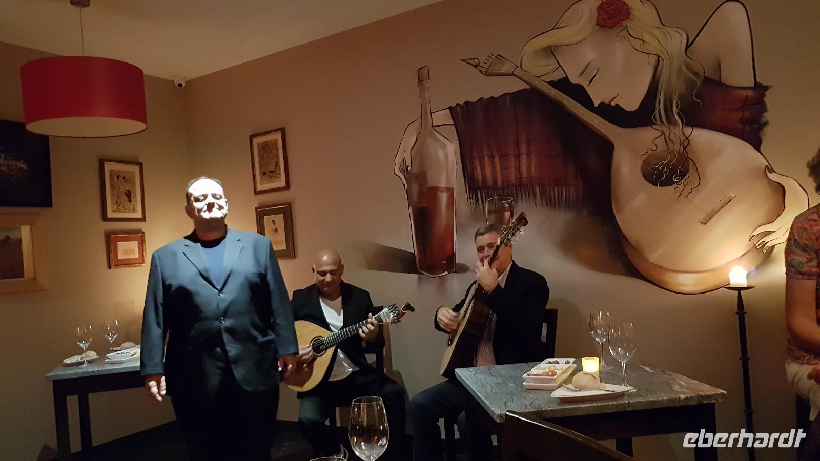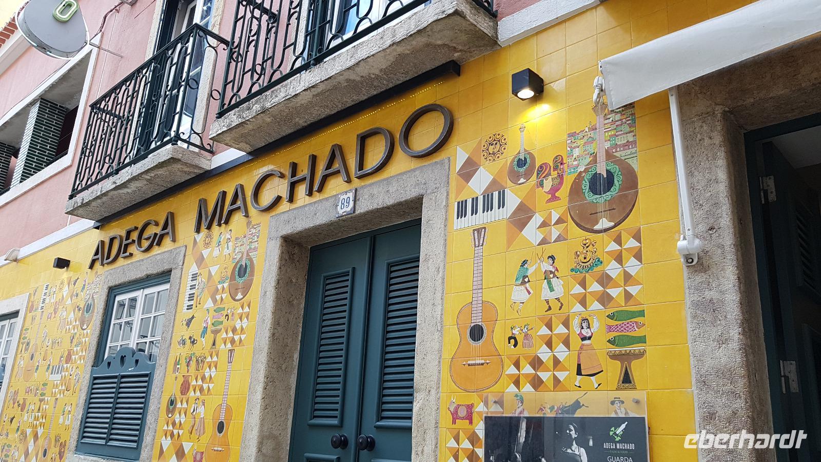 Zum 500. Todestag von Heinrich dem Seefahrer wurde es 1960 gebaut. Auf dem Platz vor dem Denkmal ist im Boden eine Windrose mit einer Weltkarte aus Mosaiksteinen eingelassen, sie zeigt die Entdecker-Routen der Portugiesen. Das riesige Denkmal zeigt neben Heinrich viele weitere wichtige Persönlichkeiten der Seefahrt und der Entdeckungen. Wir genossen bei strahlendem Sonnenschein dieses einmalige Ensemble bis wuchtige Donnerschläge zu hören waren. Ein Zerstörer der Marine lief auf dem Tejo in die Stadt ein und feuerte Salut-Schüsse ab. Die Kanonen am Belemturm antworteten. Da waren wir wieder in der Gegenwart und fuhren zurück ins Stadtzentrum. Einige von uns wollten es sich nicht nehmen lassen und einem "Fado in the Box" zusehen, einer Fadoveranstaltung im kleinen Klub. Wer das nicht wollte konnte zurück ins Hotel fahren oder im Zentrum bleiben. Alle anderen spazierten hinauf zum "Adega Machado" und wurden hier mit einem Glas Wein und kleinen Snacks begrüßt. Dann begann der