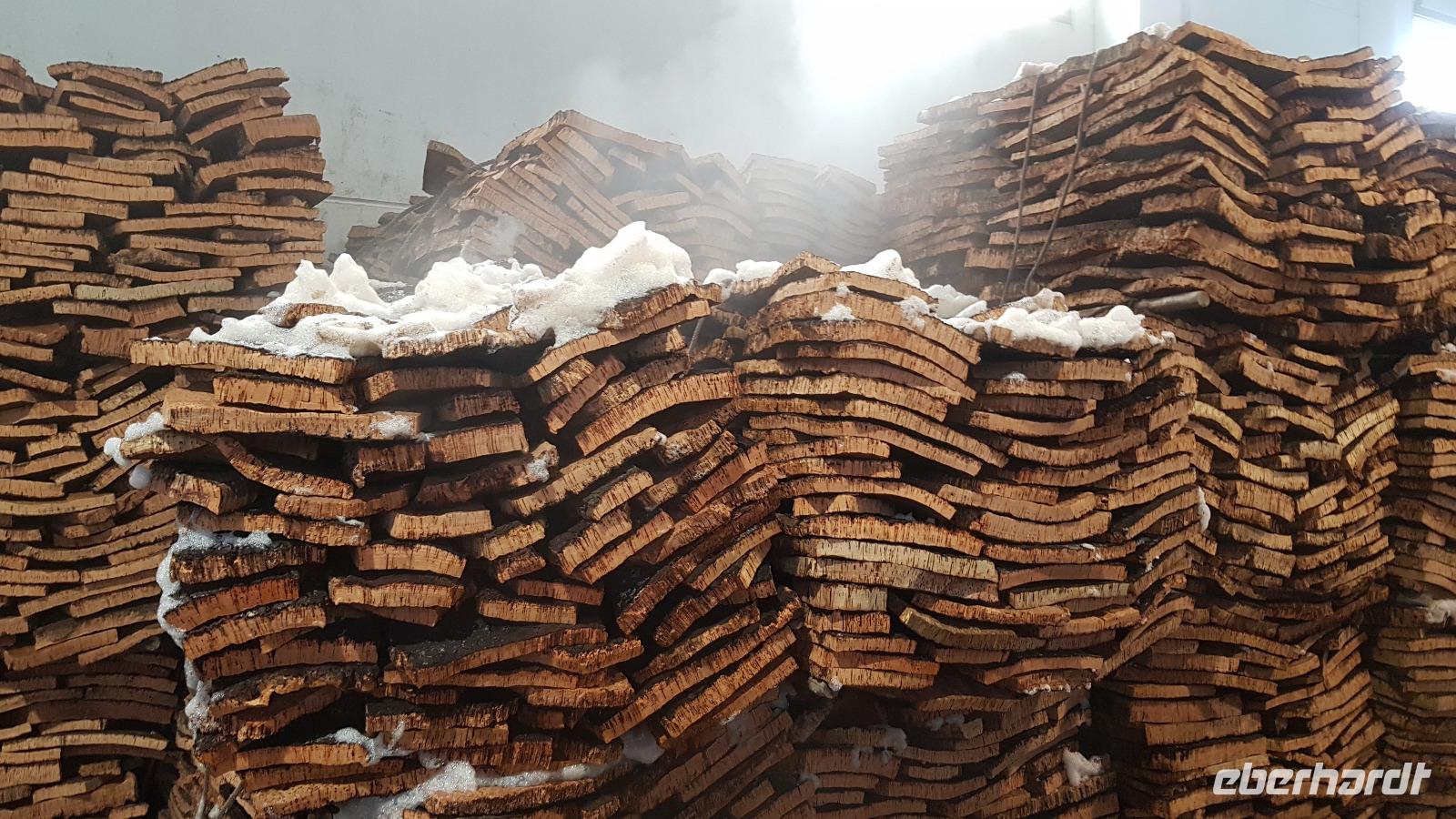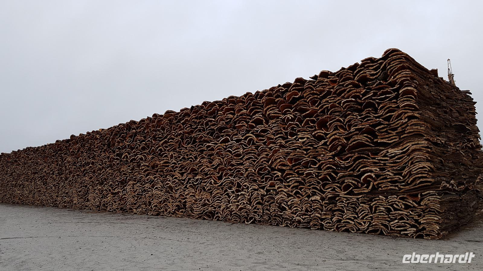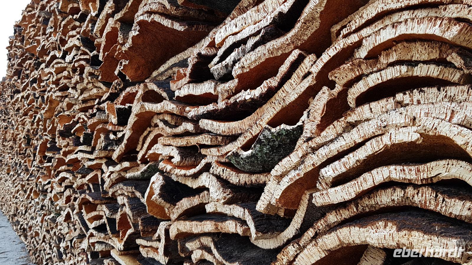 Der Regen hat kurz aufgehört und wir erreichen trockenen Fusses die Hallen, in denen Kork gesammelt, gekocht und nach Qualität sortiert wird. Wir sind erstaunt, wie die Arbeiter hier mit geübtem Blick die Beschaffenheit der Korkrinden prüfen und sortieren. Dann können wir uns im Showroom umsehen und sind überrascht, was man aus Kork alles herstellen kann, selbt Krawatten und Schirme. Natürlich mußten wir hier einige Erinnerungsstücke mitnehmen, waren froh, dass wir im Gebäude waren- draußen ging gerade wieder ein Wolkenbruch nieder. Die Radfahrer, die hier stoppten hatten da nicht so großes Glück wie wir. Dann hieß es einsteigen- perfektes Timing- der Regen hatte just in diesem Moment aufgehört. Wir fuhren weiter durch den Alentejo, das heißt etwa "nahe dem Tejo" und umfaßt ein riesiges Gebiet vom Tejo im Norden bis hinunter an die Algarve.