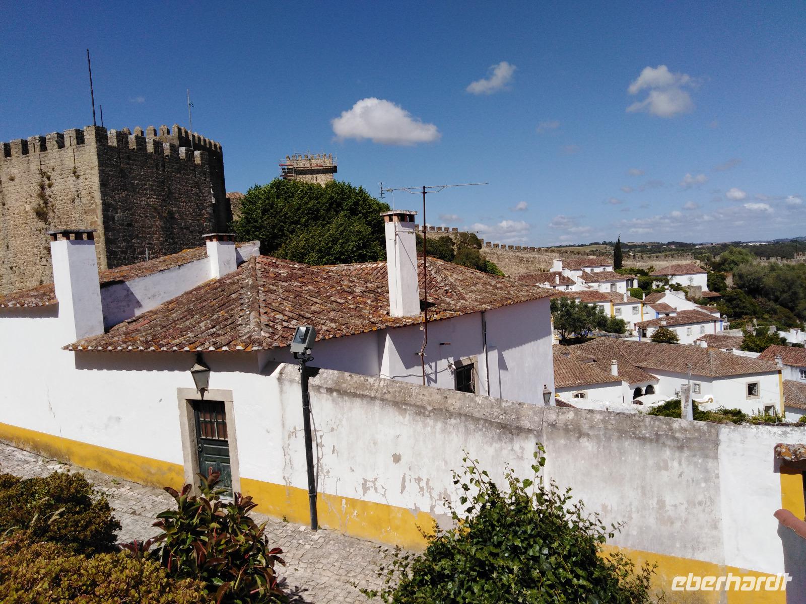 Unser letztes Ziel des Tages ist Obidos, ein kleines, sehenswertes Städtchen, dass man gut zu Fuß durchstreifen kann. Es gefällt mit seinen farbigen Häuserfassaden, Rundbögen in Patios und auch seinen mit Kopfsteinpflastern belegten Straßen. Wir besichtigten die Burg , deren Mauern sich dreiecksförmig um die Stadt schließen. Die Stadtmauer stammt aus der Zeit der Mauren dem 8.-11. Jh.