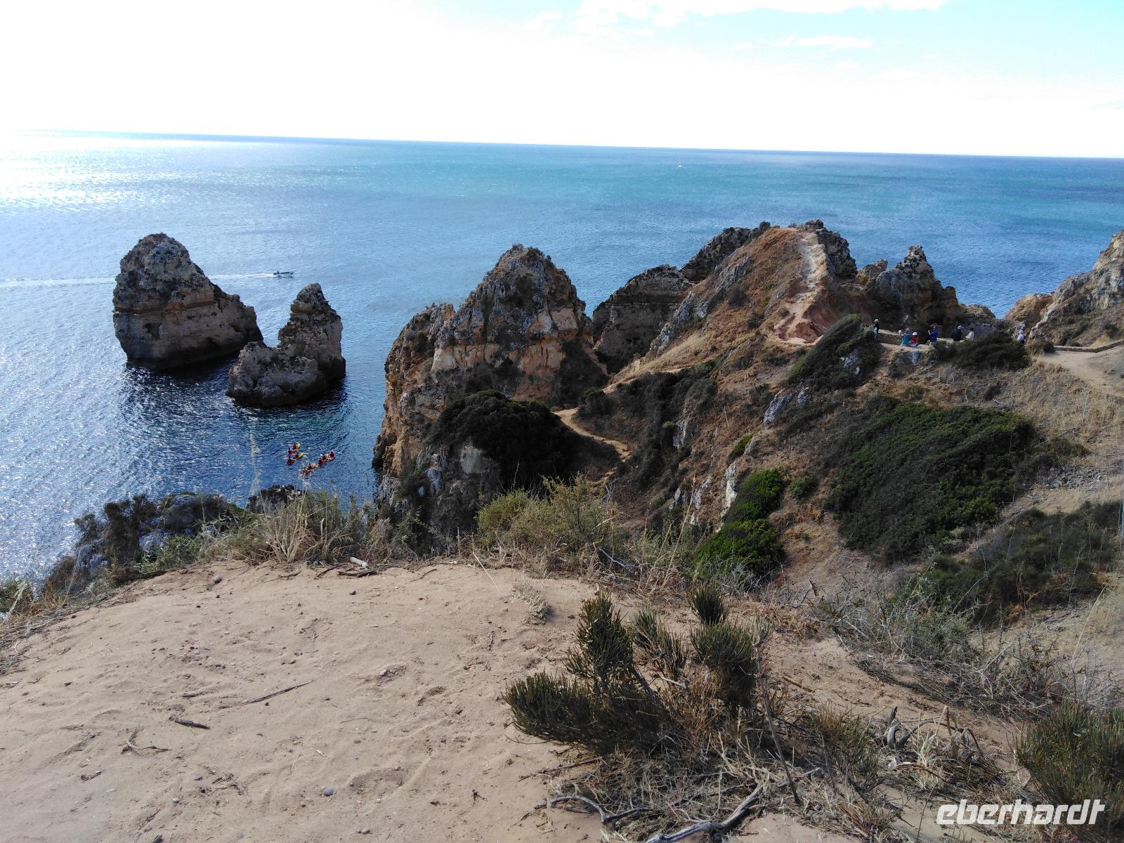 Über die Autobahn gelangten wir sehr schnell an einen markanten Küstenabschnitt, dem Praia da Rocha, der mit seinen scharfkantigen Felsformationen tief ins Meer abfällt und an den Felswänden viele Höhlen und Löcher aufweist.Angelangt am Cabo de Sao Vicente, beeindruckte uns die raue Felslandschaft,