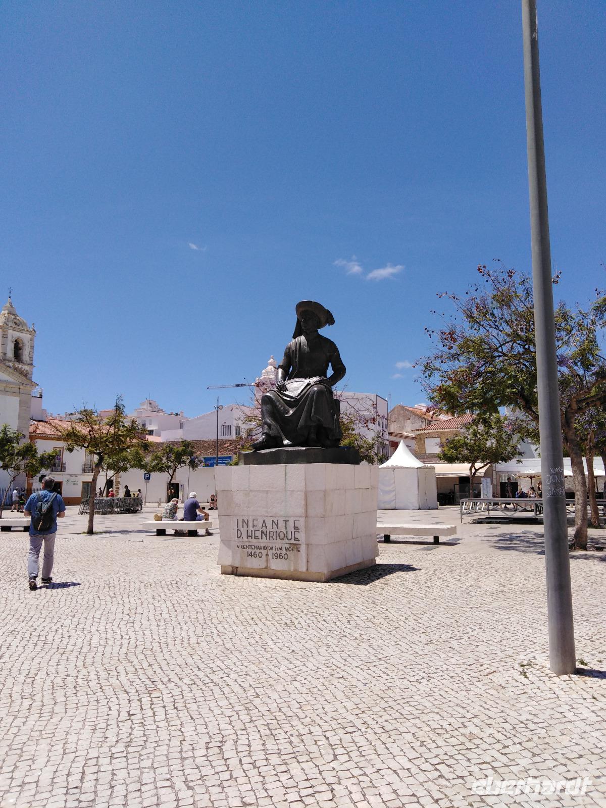 angenehmer Urlaubsort. Neben der Kirche Igreja de Santo Antonio sitzt an einem tief einschneidenden Kanalhafen, der an den Platz Mercado de Escravos endet, Heinrich der Seefahrer auf einem Stuhl und blickt in Erwartung seiner Schiffe über das Meer.