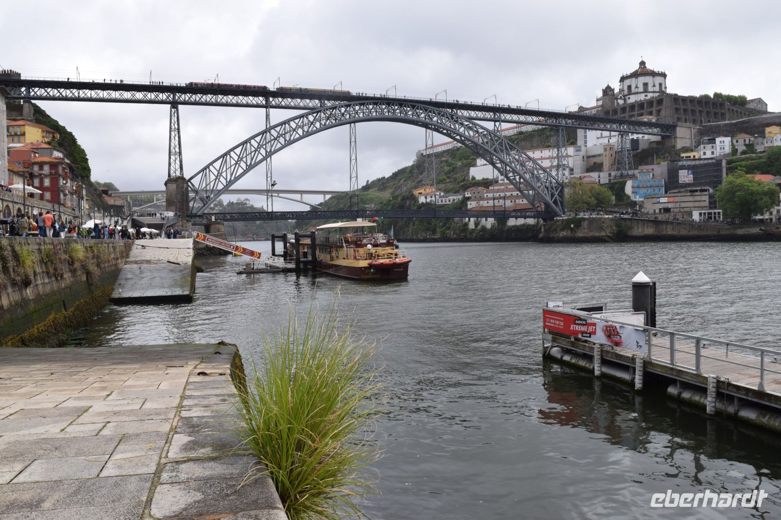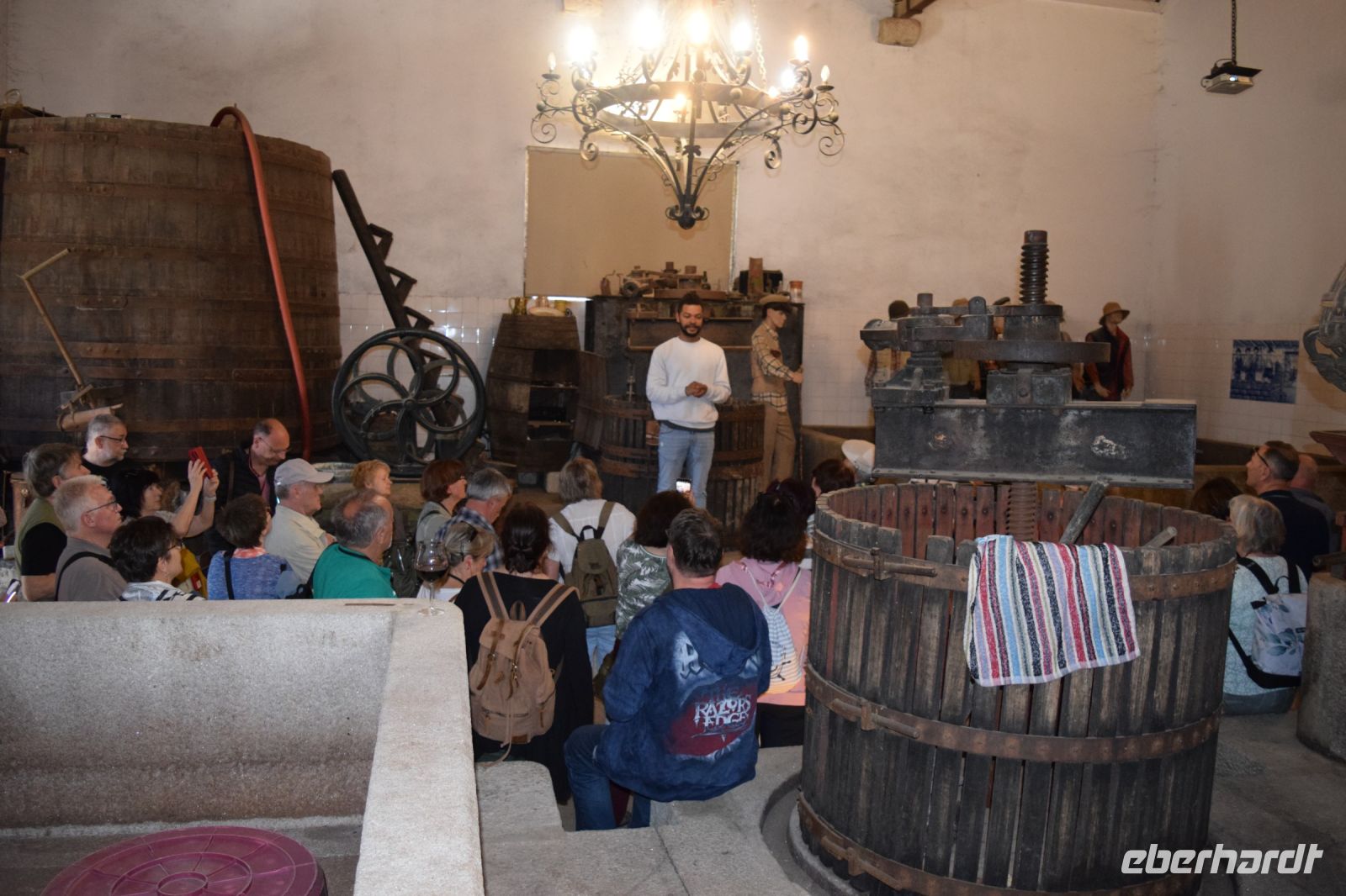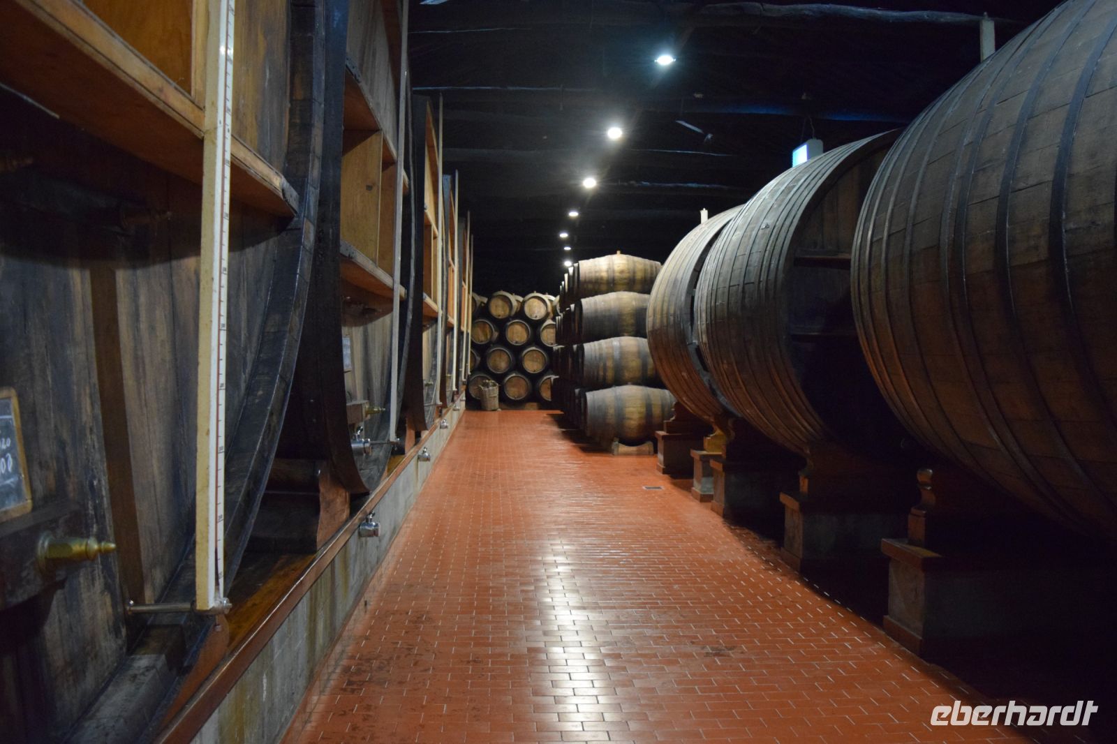 Anschließend verbringen wir unsere Mittagszeit am quirligen Ufer des Douro, ehe wir uns um 12:20 Uhr zu einer Schifffahrt auf dem Fluss wieder treffen. Das kleine Boot, dass in früheren Zeiten den Portwein aus dem Landesinneren nach Porto transportierte, bringt uns etwas stromaufwärts bis zur Eisenbahnbrücke "Ponte Maria Pia", die durch die Firma des berühmten Gustav Eifel geplant und errichtet wurde. Auf der Fahrt stromabwärts durchqueren wir erneut die "Ponte Dom Luis I.", die ebenfalls eine spektakuläre Bogenbrücke aus genieteten Stahlsegmenten des 19. Jahrhunderts ist und heute sogar von der Metro genutzt wird. Wir schippern fast bis zur Mündung und wenden dann erneut, um am gegenüberliegenden Ufer des Douro anzulegen. Dort befinden sich zahlreiche bekannte Portweinkellereien. Individuell besuchen wir die ehemalige Markthalle, die wegen der vielen Touristen zu einem Tempel für das "schnelle Essen auf die Hand" umfunktioniert wurde. Später treffen wir uns, um gemeinsam bergauf zu einer Portweinverkostung zu starten. Pünktlich 14 Uhr erreichen wir die Portweinkellerei "Rozés", wo uns eine Dame freundlich erwartet. Wir erhalten einen Einblick in die aufwändige und langwierige Zubereitung des so typischen Portweines, dessen Lagerung in Eichenfässern mindestens 4 Jahre betragen muss. Der so entstandene weiße Portwein hat einen markanten Geschmack. Der rote Portwein, der ebenfalls aus weißen Trauben gekeltert wird, benötigt mindestens 7 Jahre im Fass, ehe er die rote Farbe aus dem Eichenholz und dessen Aroma vollständig einverleibt. Nach der Verkostung der beiden Portwein-Varianten besteht die Möglichkeit, selbst Flaschen zu kaufen und als "Andenken" an dieses Erlebnis, zu Hause an kalten Wintertagen zu genießen.
