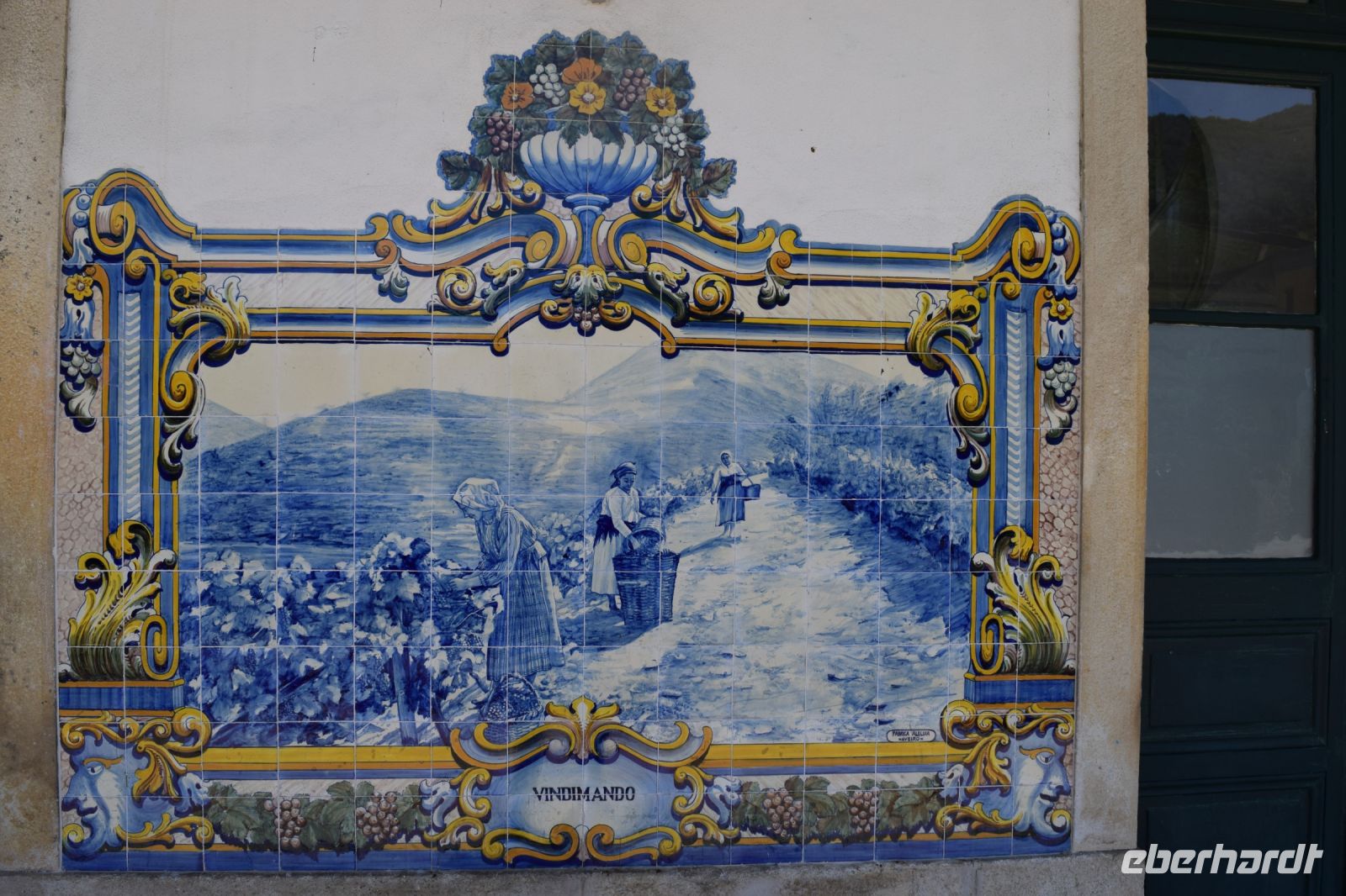 Am Fluss Douro angekommen, den wir schon von Porto kennen, haben wir in dem kleinen Städtchen Pinhao genügend Zeit für eine entspannte Mittagspause am Fluss. Sehenswert ist die Bahnstation des Ortes, an deren Außenmauern wieder mit blau-weißen Fliesen Motive des Weinanbaues dargestellt werden. Eigentlich war die letzte Etappe des heutigen Tages von hier mit einem Zug geplant, der aber wegen des Feiertages nicht fährt. So entschließen wir uns zu einer kleinen Bootsfahrt auf dem Douro und genießen an Bord des traditionellen Holzbootes, welches früher dem Transport des Portweines diente, das schöne Sonnenwetter und die herrliche Landschaft.