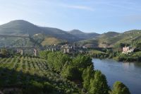 Nach dem Frühstück starten wir mit gepackten Koffern und verlassen Porto und die Atlantikküste. Es ist der "Tag der Freiheit", der in Portugal ein gesetzlicher Feiertag ist. Am 25.April 1974 beendete ein Militärputsch, die Nelkenrevolution, die seit 1929 andauernde Diktatur und machte den Weg für eine neue Demokratie frei. Der diesjährige Feiertag fällt auf einen Dienstag, der in Verbindung mit einem Brückentag von vielen Portugiesen für einen Kurzurlaub an der Algarve oder in den Bergen genutzt wird. Auch wir fahren in die Berge nach Westen. Auf dem Weg dahin stoppen wir in dem kleinen Städtchen Amarante, das sich an einem Nebenfluss des Douro befindet. Das kleine Flüsschen lädt Wassersportler zum Paddeln ein, wir sind wegen des Klosters São Gonçalo und der Geschichte um diesen heiligen Gonçalo hier, der 1260 gestorben ist. Vorher hat er, der Geschichte nach, vielen unglücklichen Frauen, die aus der ganzen Region zu ihm pilgerten, zu Kindersegen verholfen. Noch heute kommen viele Besucherinnen an seinen Sarkophag, der in einem Nebenschiff des ehemaligen Dominikanerklosters steht, um durch stille Andacht Heilung zu erhalten. Warum alle Bäcker und Konditoreien der Stadt ein üppiges Gebäck in Form eines überzuckerten Phallus anbieten, bleibt das Geheimnis der Geschichte. Nach einem kleinen Bummel durch das romantische Städtchen, welches ca. 12.000 Einwohner hat, starten wir um 10 Uhr mit unserem Reisebus in die Berge und schieben uns auf eine Höhe von 1.400 m. Diese Bergkette ist zugleich eine Klimascheide und beschert der Region längere Winter und heißere Sommer. Dadurch ist der Weinanbau sehr gut möglich und wir fahren durch die riesigen Weinfelder des höchst gelegenen Weinanbaugebietes. Immerhin rangiert Portugal auf Platz 9 der Weinproduzenten der Welt. Über schmale Straßen erreichen wir eine Kooperative der Winzer in der Nähe des Örtchens Aijol, wo wir zu einer Verkostung der dort angebauten Muskatweine eingeladen sind. Nach einer kurzen Wartezeit bei herrlichem Wetter im schönen Garten mit Fliederbüschen und verschiedenen Wasserspielen, werden wir an einer langen Tafel des neu errichteten Empfangsgebäudes mit Wein und Wasser versorgt, ehe wir dann zur eigentlichen Kellerführung abgeholt werden. Bei einer Erläuterung in englischer Sprache bringt uns der freundliche Winzer die Besonderheiten des Weinanbaus dieser Region näher, unsere Reiseleiterin übersetzt uns seine Ausführungen. Ein Video zeigt uns die Mühen der Winzer vergangener Epochen. Heute werden in dieser Kooperative 45 Mill. Liter Wein produziert, einen Bruchteil davon probieren wir im Anschluss der Führung und erhalten auch hier wieder die Möglichkeit zum Kauf der Weine. Gegen 13 Uhr starten wir fröhlich und beschwingt. Bei unserer Fahrt durch die Berge hinab zum Douro, bieten sich tolle Aussichten auf die Weinhänge und die dazu gehörigen Siedlungen.