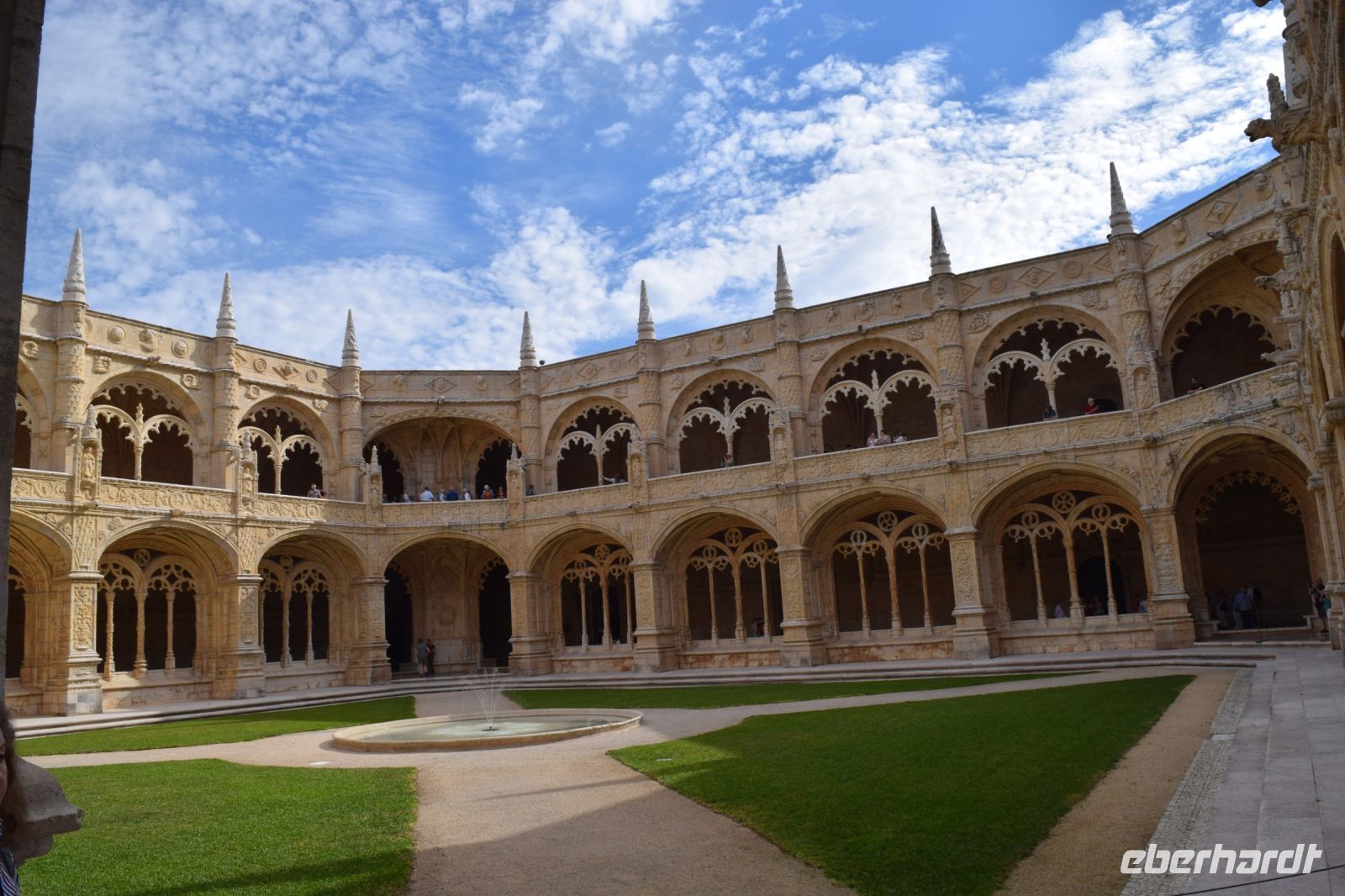 Wieder begrüßt uns ein Tag mit Sonnenschein und so steigen wir nach dem Frühstück in den Reisebus, der uns in das Zentrum Lissabons bringt. Schon auf der Fahrt zeigt uns Gunhild die Stierkampfarena und das Aquädukt, welches noch bis 1962 für die Wasserversorgung ganzer Stadtteile benötigt wurde. Im gleichen Jahr wurde die gewaltige Hängebrücke über den Tejo eingeweiht. Wir fahren zuerst in den Stadtteil Belém, der wohl nach der bekannten Stadt Bethlehem benannt wurde. Als erste Attraktion besuchen wir das Hieronymus-Kloster, ein Bauwerk der portugiesischen Spätgotik, Manuelinik genannt. Die kunstvolle Architektur der Kreuzgänge bietet immer wieder schöne Aussichten in den grünen Lichthof des Klosters, das ebenfalls zur Liste der UNESCO-Welterbe Stätten gehört. Anschließend besuchen wir die dazugehörige Kirche zur heiligen Jungfrau, die 1506 der damalige König Manuel I. errichten ließ. Dazu zog er die Bauleute von Bathala ab. Er wollte sich mit dem Kirchenbau dafür bedanken, dass der Seeweg nach und der Handel mit Indien fest in portugiesischer Hand war und er mit seinem Königreich Portugal eine Blütezeit erlebte. In der Kirche Santa Maria befindet sich unter anderem auch ein Ehrensakophag des großen portugiesischen Seefahrers Vasco da Gama, der im Jahre 1498 den Seeweg nach Indien fand und später auf See umkam.