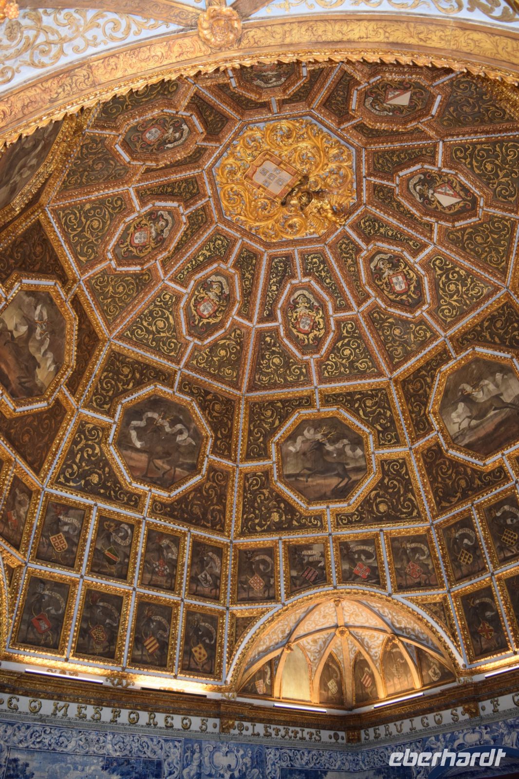 Bei trockenem Wetter "pilgern" wir anschließend auf dem legendären Jacobs Weg durch die engen Gassen bergab zum Hafenviertel Portos. Gunhild zeigt uns die schmalen Häuser der früheren Kaufleute, die Porto in früheren Zeiten zu Reichtum verholfen haben. Wir gelangen auf einen Platz, auf dem ein Denkmal von "Heinrich dem Seefahrer" steht. Wir besuchen da die ehemalige Börse. Ein Palast, der im 19. Jahrhundert auf den Resten des zerstörten Franziskaner-Klosters errichtet wurde. Besonders beeindruckend waren die Stuckarbeiten aus portugiesischem Granit und der "Arabische Saal" mit seinen filigranen Arbeiten an den Wänden und Decken. An der Decke des Lichthofes finden wir auch das sächsische Wappen, weil vormals gute Handelsbeziehungen zu den sächsischen Kaufleuten gepflegt wurden.