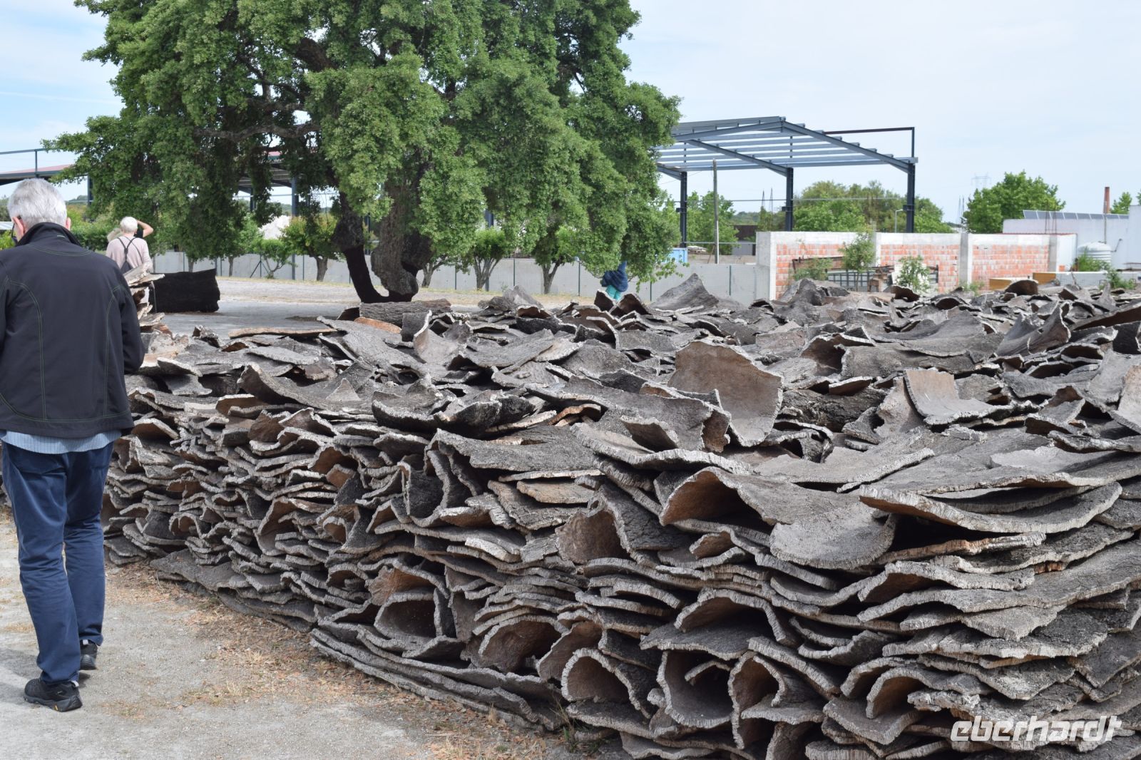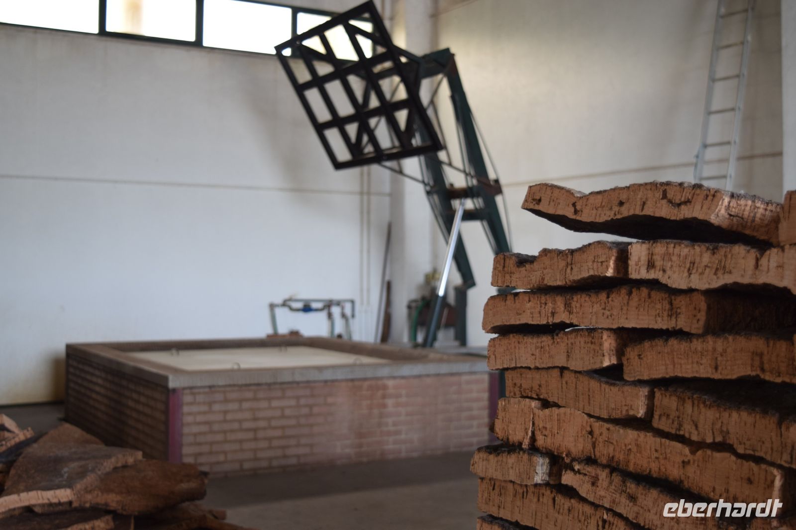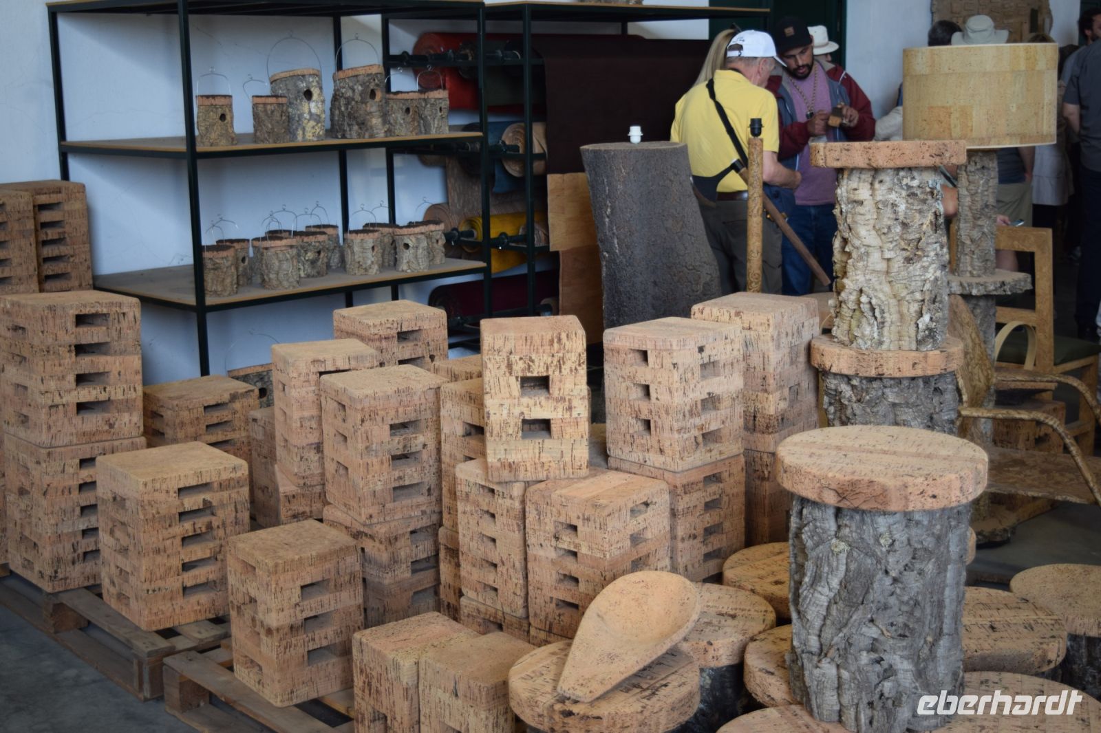 Unser nächster Stopp erfolgt an eine Korkfabrik, die natürlich sonntags nichts produziert. Von Gunhild erfahren wir, dass die Rindenstücke der Korkeiche hier mindestens drei Mal in ein Siede Bad gedrückt werden. Dabei wird der entstehende Schaum jedes Mal abgezogen. Steigt kein neuer Schaum mehr auf, wird jede Korkplatte begutachtet. Stimmt die Qualität, werden die Platten verkauft. So werden jährlich 800 t Rinde verarbeitet. Im Werk selbst werden die verschiedensten Produkte aus Kork in einem Shop zum Verkauf angeboten. Von Sitzmöbeln über Lampen, Taschen und Untersetzer, alles das kaufen die Besucher auf ihren Touren von Lissabon zur Algarve oder zurück.