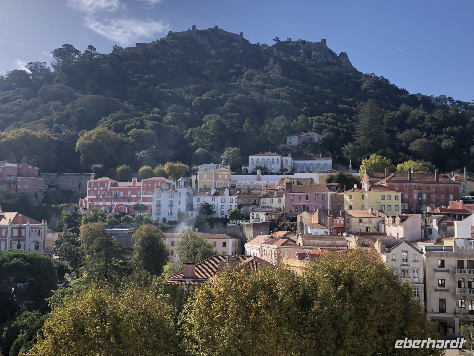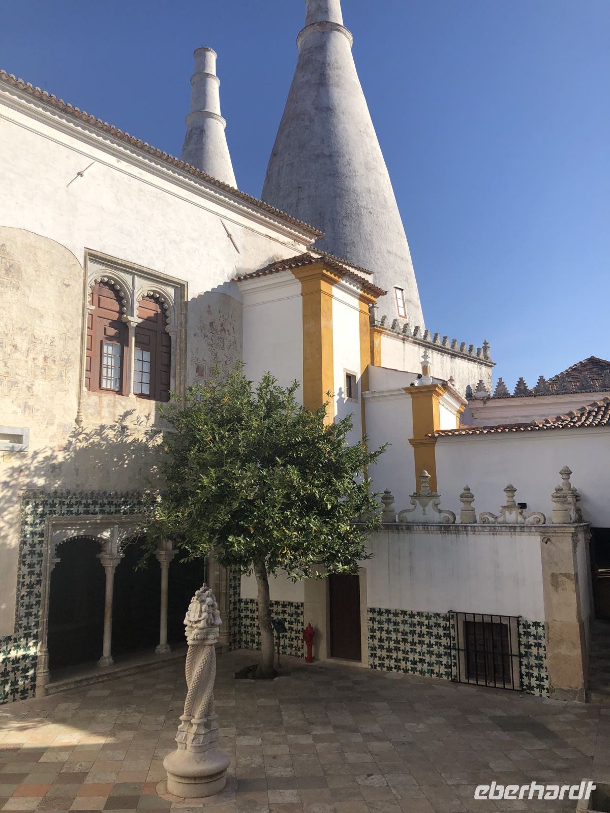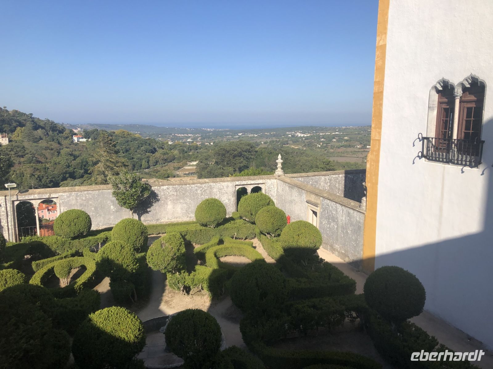 Sintra mit seinen zahlreichen herrschaftlichen Palästen und kunstvoll angelegten Gärten ist ebenso ein Muss jeder Portugal-Rundreise, und wir lassen uns von den vielen Tagestouristen auch nicht abschrecken. So besichtigen wir ausgiebig den Nationalpalast. Er diente schon im Mittelalter und für lange Zeit den Königen als Sommerresidenz, deren kostbar eingerichtete Räumlichkeiten jeweils nach den Vorlieben der Königsfamilien gestaltet wurden. Aus einigen Fenstern hat man auch einen schönen Blick auf das über Sintra thronende imposante Castelo dos Muros.