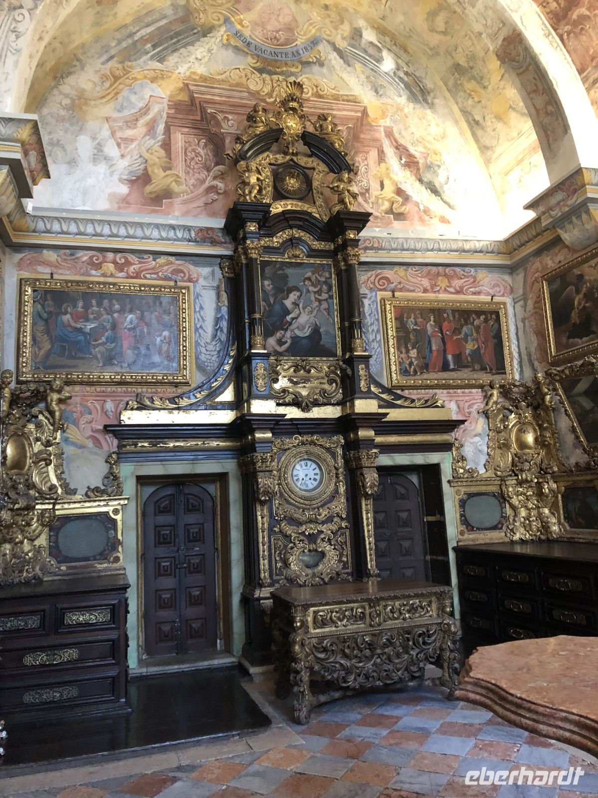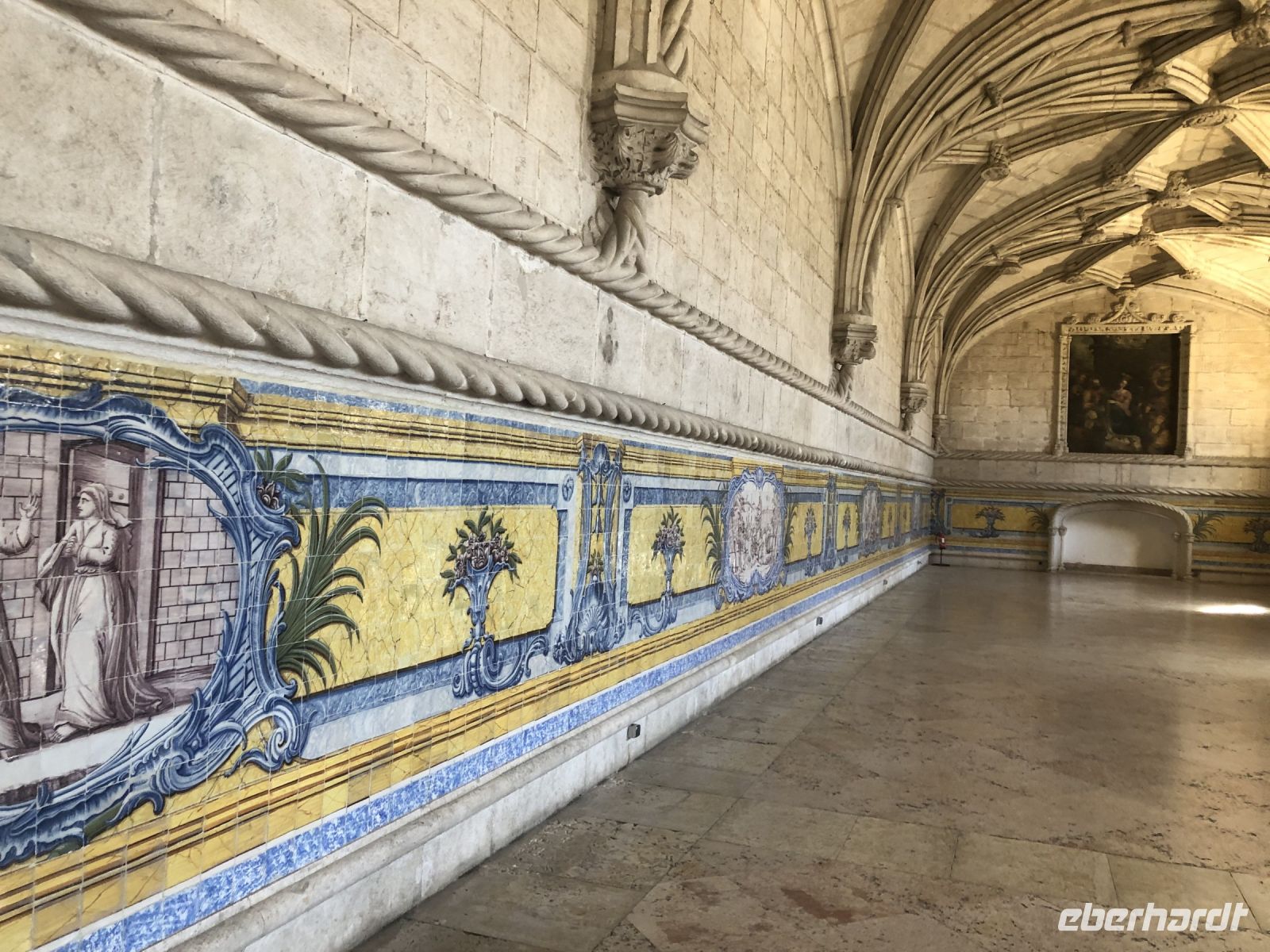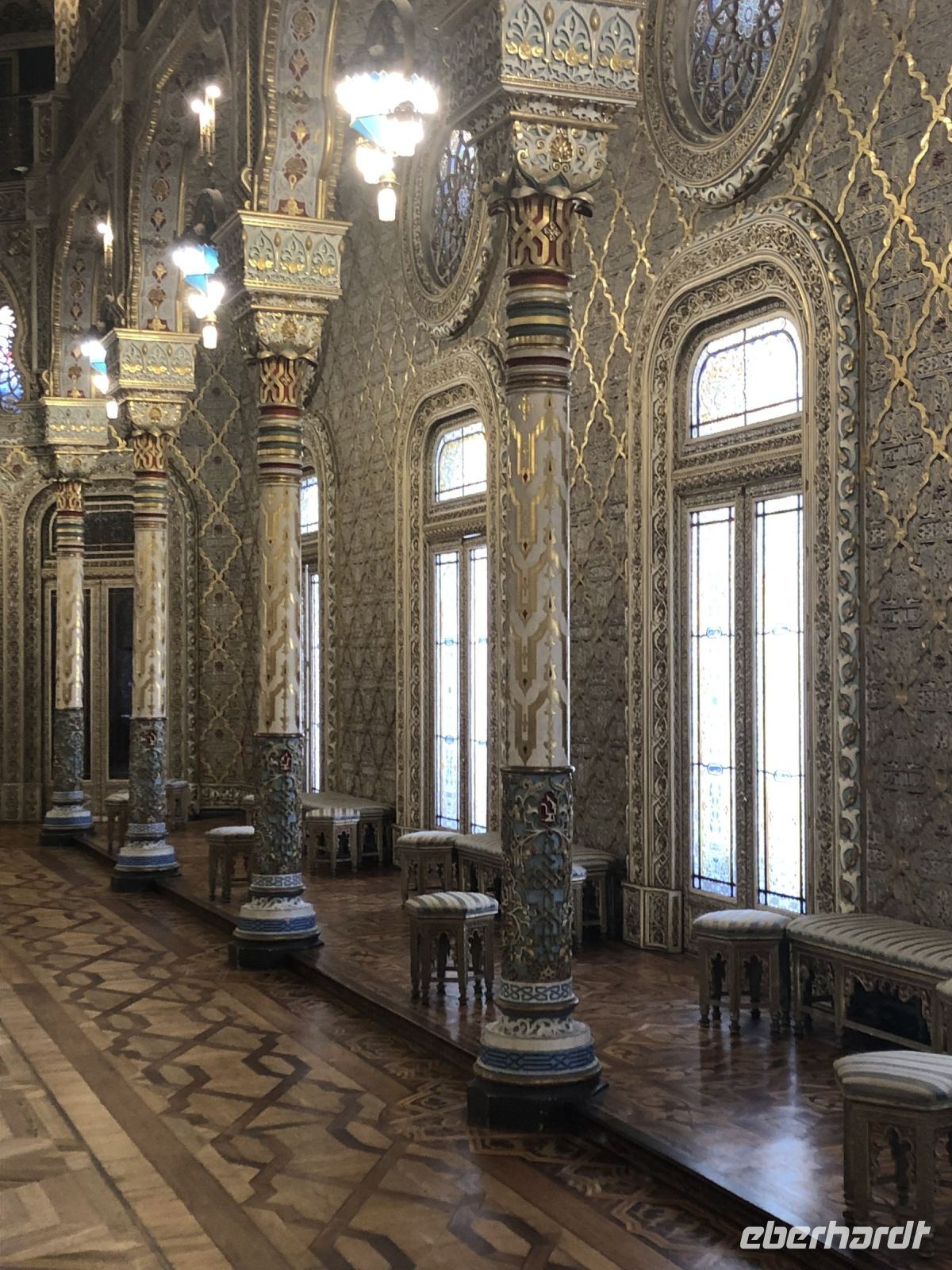 Sintra mit seinen zahlreichen herrschaftlichen Palästen und kunstvoll angelegten Gärten ist ebenso ein Muss jeder Portugal-Rundreise, und wir lassen uns von den vielen Tagestouristen auch nicht abschrecken. So besichtigen wir ausgiebig den Nationalpalast. Er diente schon im Mittelalter und für lange Zeit den Königen als Sommerresidenz, deren kostbar eingerichtete Räumlichkeiten jeweils nach den Vorlieben der Königsfamilien gestaltet wurden. Aus einigen Fenstern hat man auch einen schönen Blick auf das über Sintra thronende imposante Castelo dos Muros.