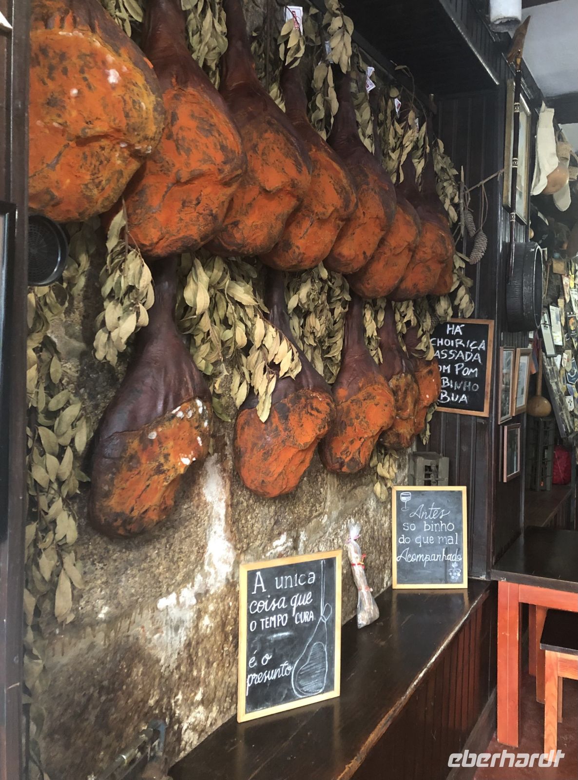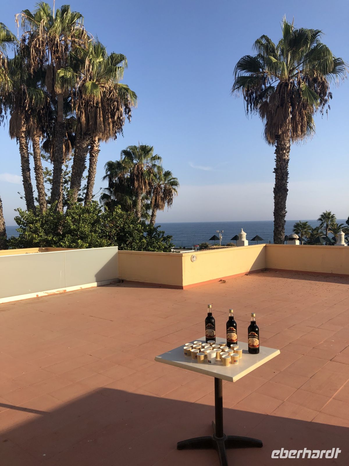 Bevor wir am Abend zum letzten Mahl das üppige Abendbuffet bestaunen, gibt es auf meiner im Verhältnis zur Zimmergröße größten Terrasse Portugals, auf der wir auch alle viel Platz haben, einen oder mehrere Pappbecher voll mit Ginja, dem bekannten portugiesischen Kirschlikör als Aperitif.