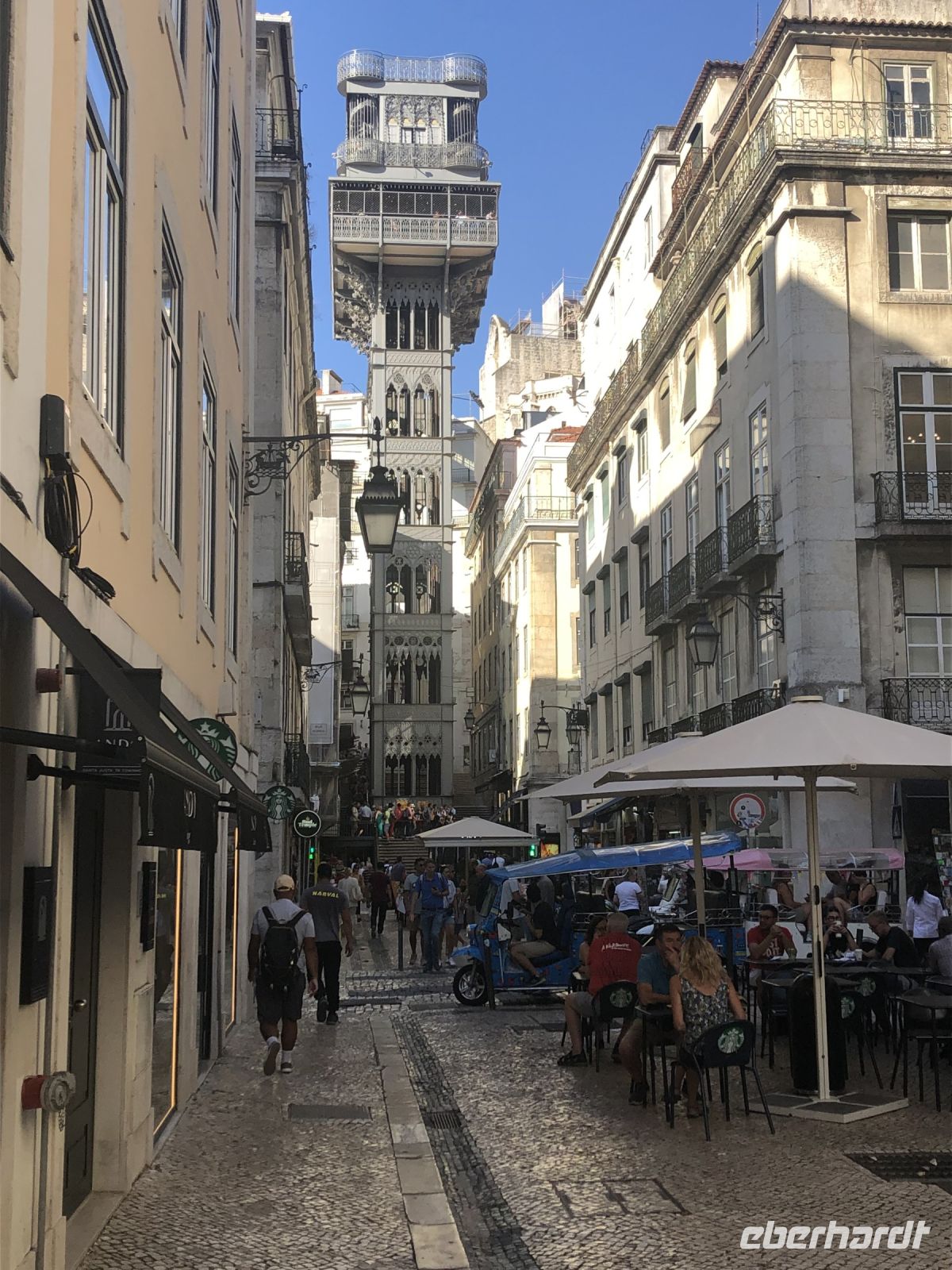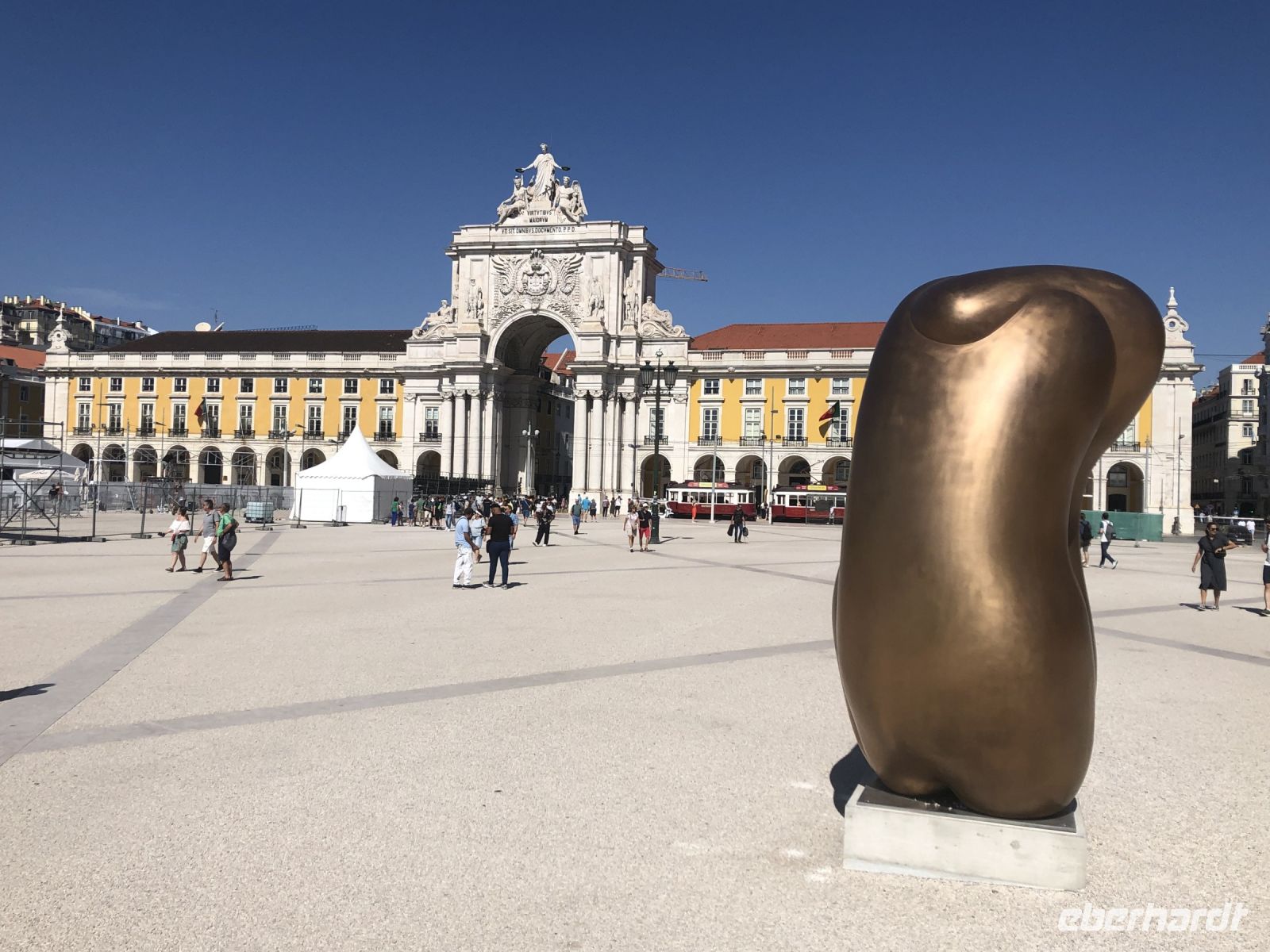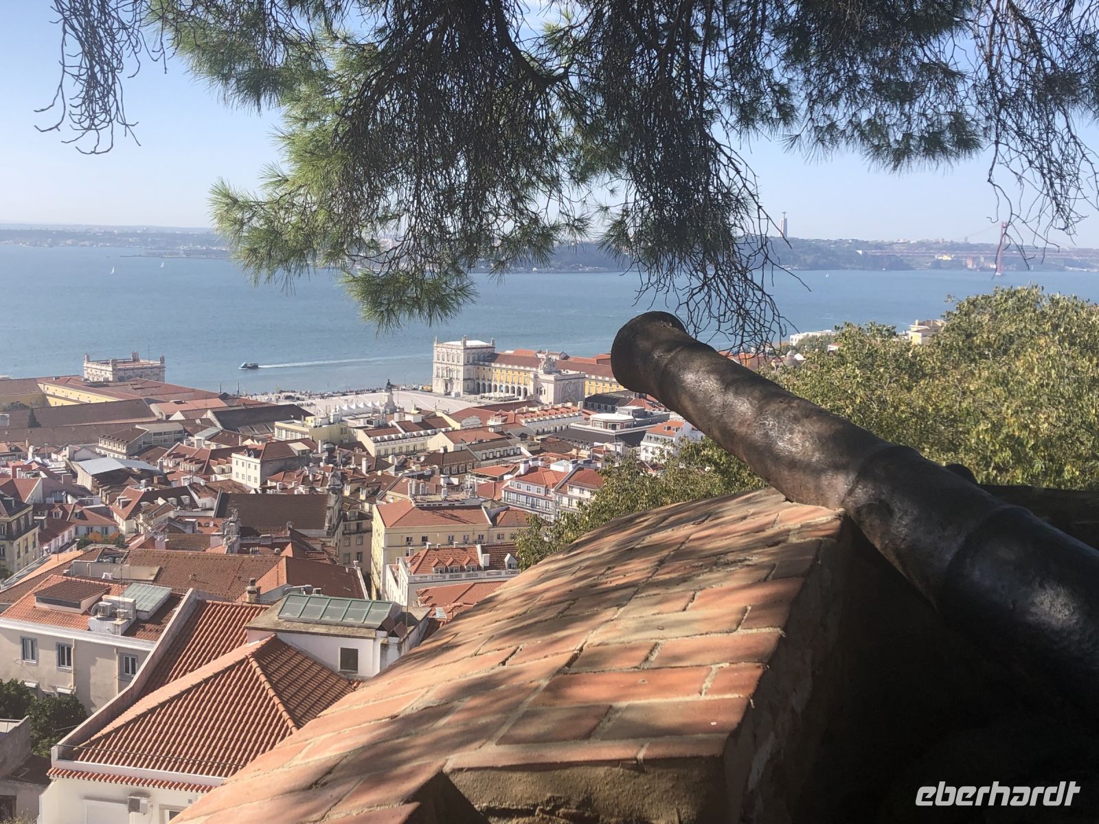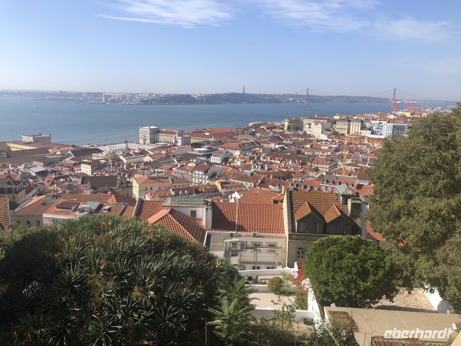 Unweit des Rossio-Bahnhofs ausgestiegen erklimmen wir zu Fuß unter Zuhilfenahme zweier Aufzüge die Steigung hinauf zum Castelo Sao Jorge, wo wir die lange Touristenwarteschlange einfach negierend gleich Einlass bekommen. So genießen wir die phantastischen Ausblicke auf die Stadt und schlendern durch die engen und verwinkelten Gassen der Alfama und mit vielen Informationen über diesen ältesten Stadtteil hinunter zunächst zum Miradouro de Santa Luzia. Weiter abwärts in die vom Erdbeben 1755 zerstörte und im Rechtecksgrundriss wiederaufgebaute geschäftige Baixa an der Kathedrale vorbei zur Praca de Comercio und die überfüllte Rua Augusta zurück zum Ausgangspunkt an der Praca dos Restauradores wird der Spaziergang bei 30 Grad dann eher zu einer anstrengenden Wanderung. Die einstündige Mittagspause haben wir uns so jedenfalls redlich verdient.