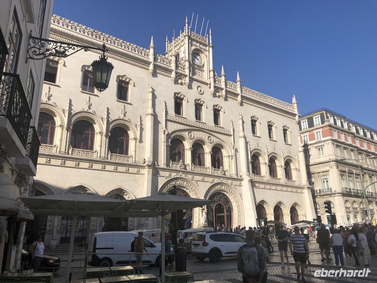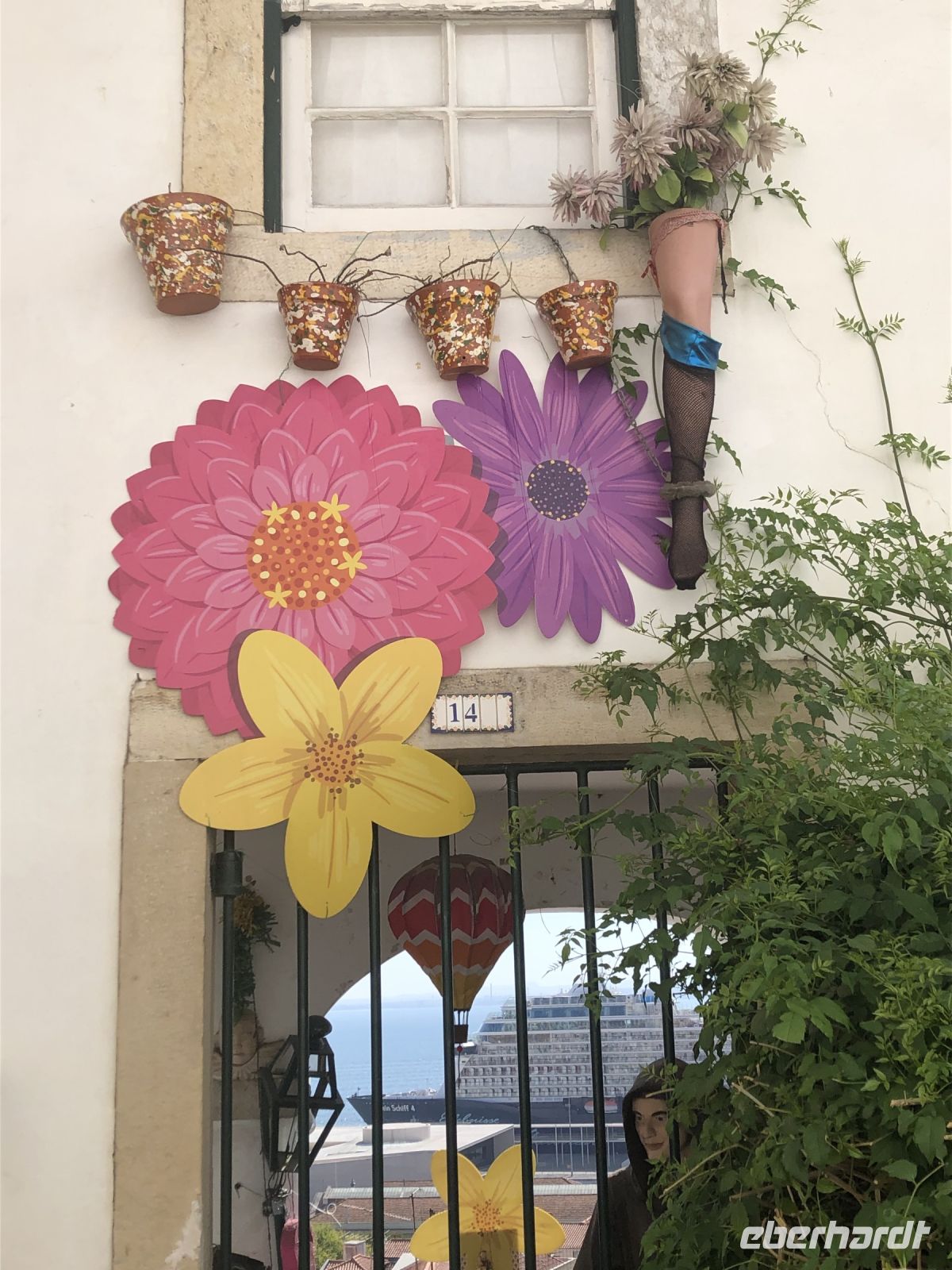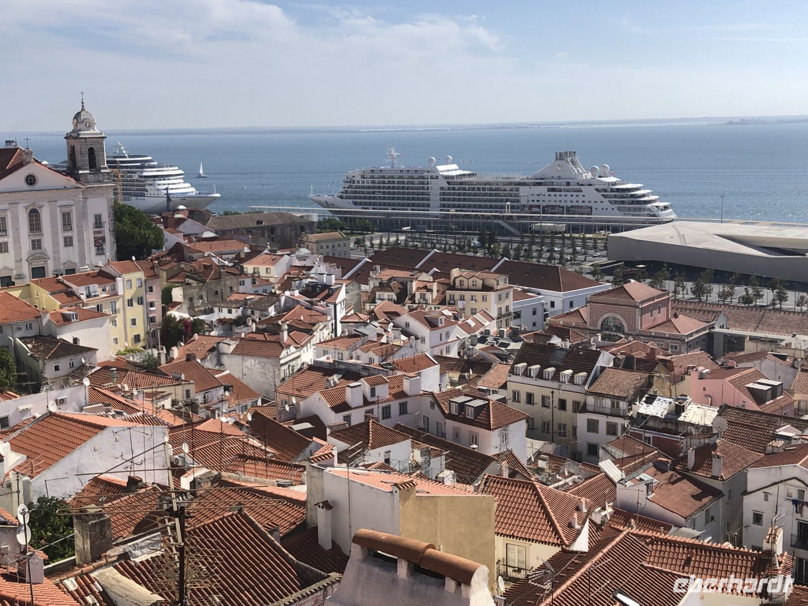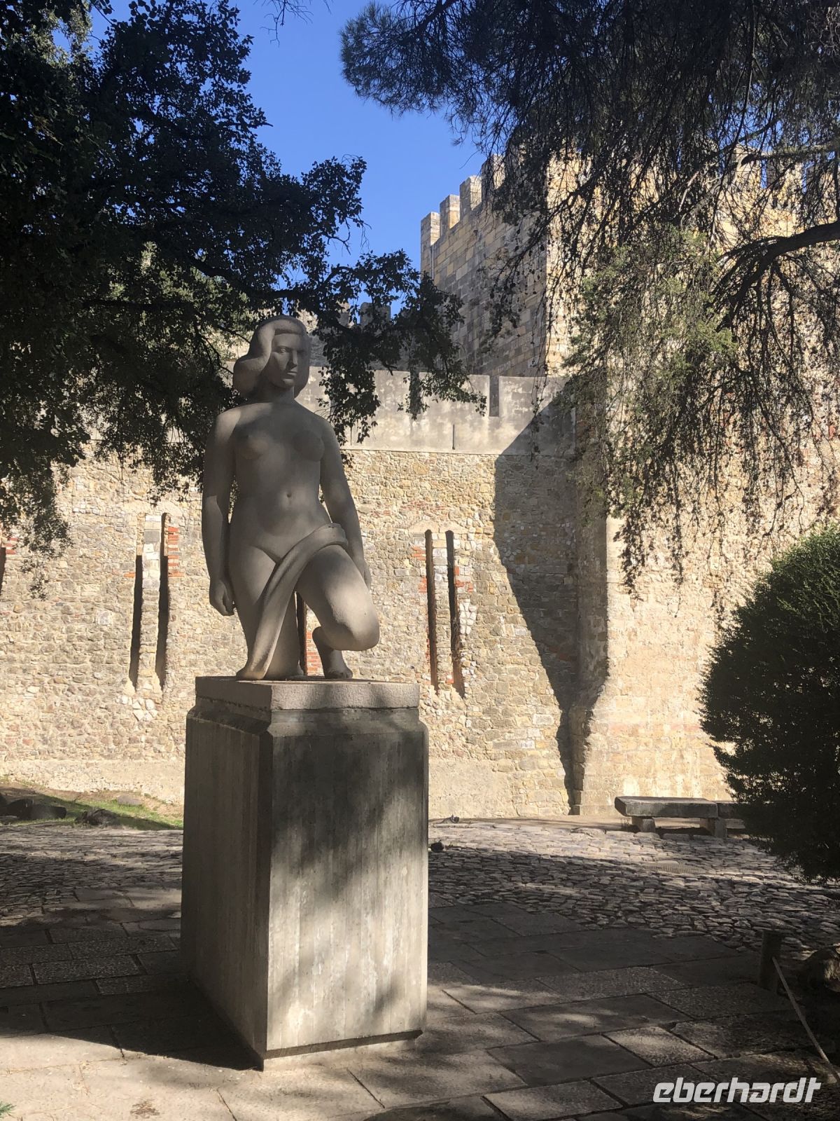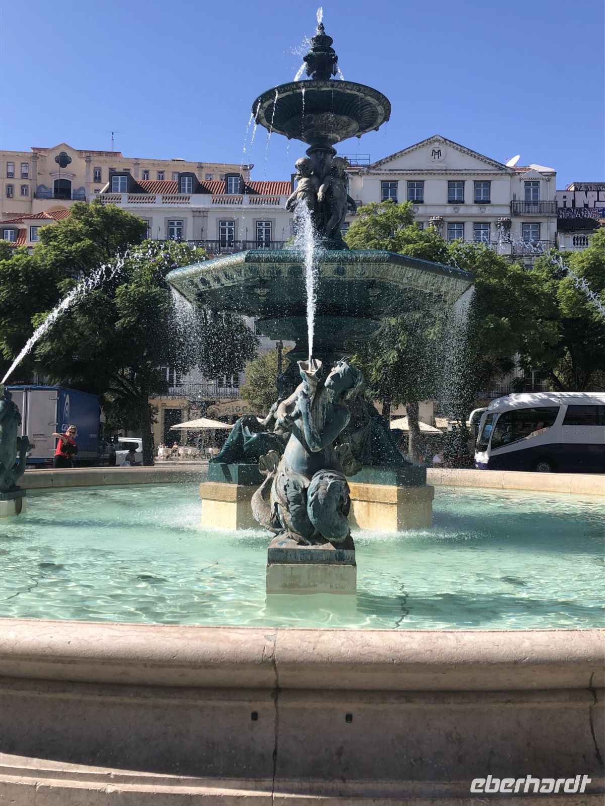 Unweit des Rossio-Bahnhofs ausgestiegen erklimmen wir zu Fuß unter Zuhilfenahme zweier Aufzüge die Steigung hinauf zum Castelo Sao Jorge, wo wir die lange Touristenwarteschlange einfach negierend gleich Einlass bekommen. So genießen wir die phantastischen Ausblicke auf die Stadt und schlendern durch die engen und verwinkelten Gassen der Alfama und mit vielen Informationen über diesen ältesten Stadtteil hinunter zunächst zum Miradouro de Santa Luzia. Weiter abwärts in die vom Erdbeben 1755 zerstörte und im Rechtecksgrundriss wiederaufgebaute geschäftige Baixa an der Kathedrale vorbei zur Praca de Comercio und die überfüllte Rua Augusta zurück zum Ausgangspunkt an der Praca dos Restauradores wird der Spaziergang bei 30 Grad dann eher zu einer anstrengenden Wanderung. Die einstündige Mittagspause haben wir uns so jedenfalls redlich verdient.