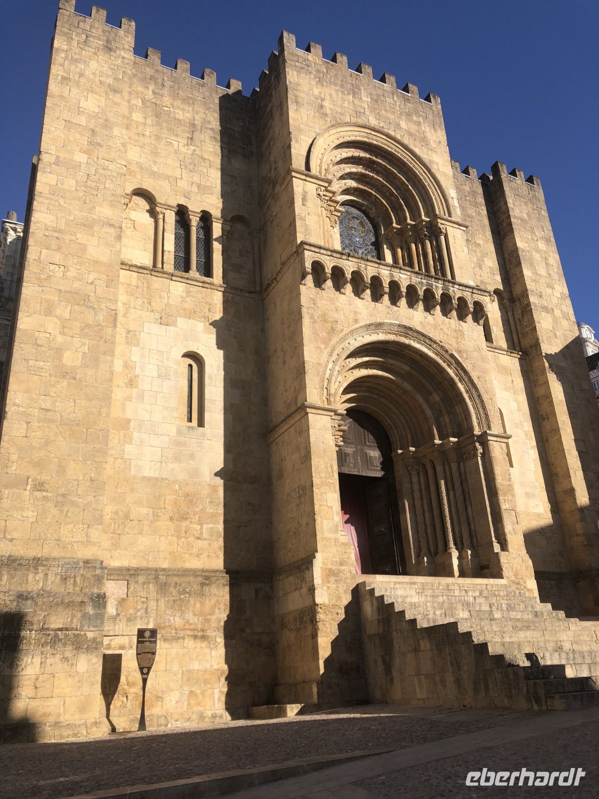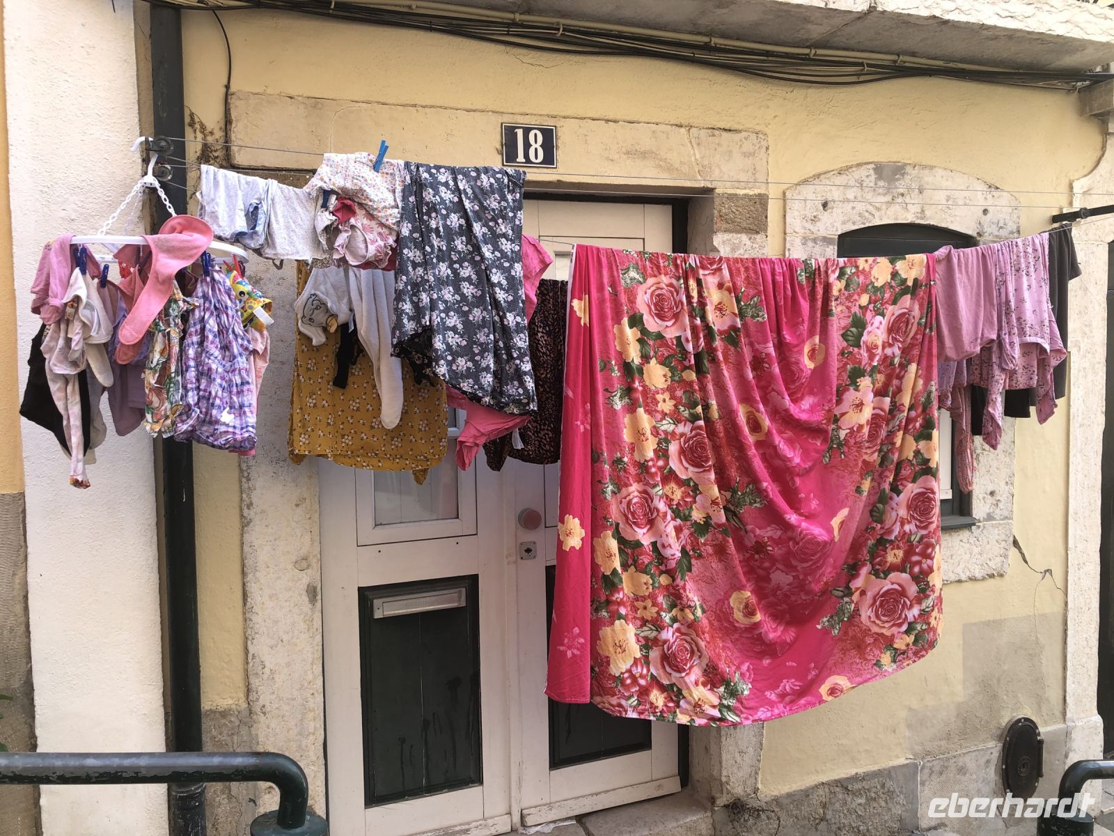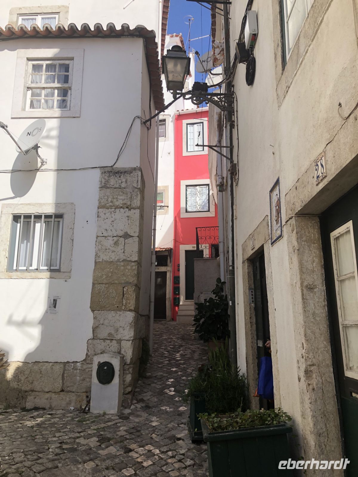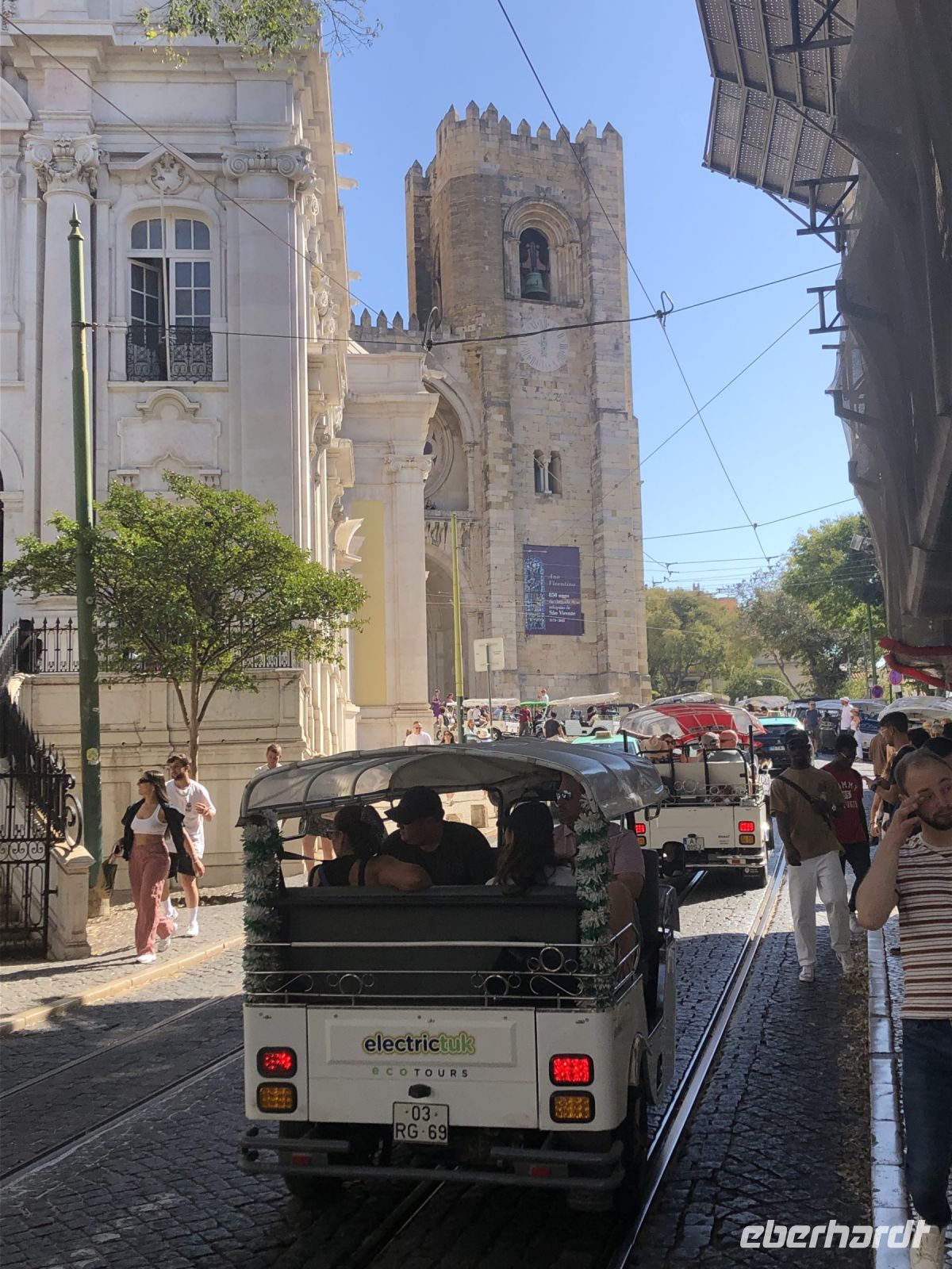 Unweit des Rossio-Bahnhofs ausgestiegen erklimmen wir zu Fuß unter Zuhilfenahme zweier Aufzüge die Steigung hinauf zum Castelo Sao Jorge, wo wir die lange Touristenwarteschlange einfach negierend gleich Einlass bekommen. So genießen wir die phantastischen Ausblicke auf die Stadt und schlendern durch die engen und verwinkelten Gassen der Alfama und mit vielen Informationen über diesen ältesten Stadtteil hinunter zunächst zum Miradouro de Santa Luzia. Weiter abwärts in die vom Erdbeben 1755 zerstörte und im Rechtecksgrundriss wiederaufgebaute geschäftige Baixa an der Kathedrale vorbei zur Praca de Comercio und die überfüllte Rua Augusta zurück zum Ausgangspunkt an der Praca dos Restauradores wird der Spaziergang bei 30 Grad dann eher zu einer anstrengenden Wanderung. Die einstündige Mittagspause haben wir uns so jedenfalls redlich verdient.