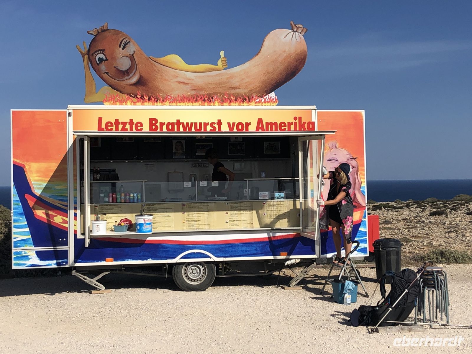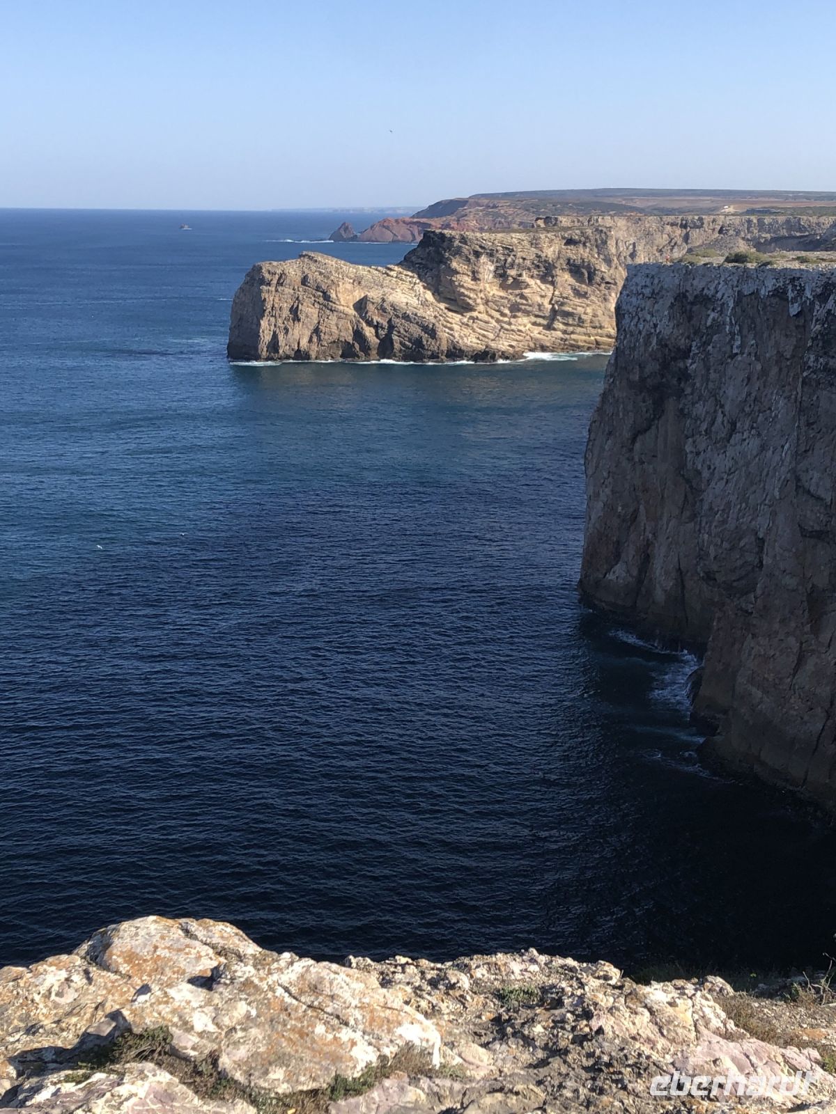 Unser fakultativer Ausflug, an dem zwei Drittel von uns teilnehmen und an dem wir ein letztes Mal unsere Fatima erleben dürfen, führt uns unter weiterhin strahlend blauem Himmel ans südwestliche Ende Europas, dem Cabo de Sao Vicente. Wir genießen den Blick in dieser windumtosten kargen Landschaft auf den Leuchtturm und die steil abfallende Felsenküste. Für Erheiterung sorgt der Wurststand mit dem Titel "Letzte Bratwurst vor Amerika".